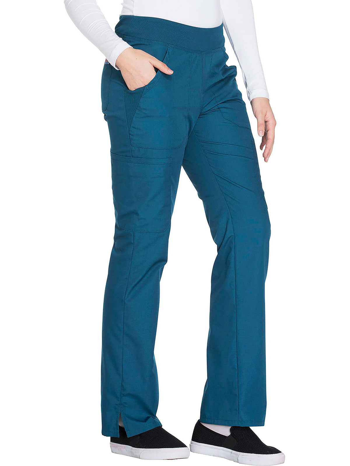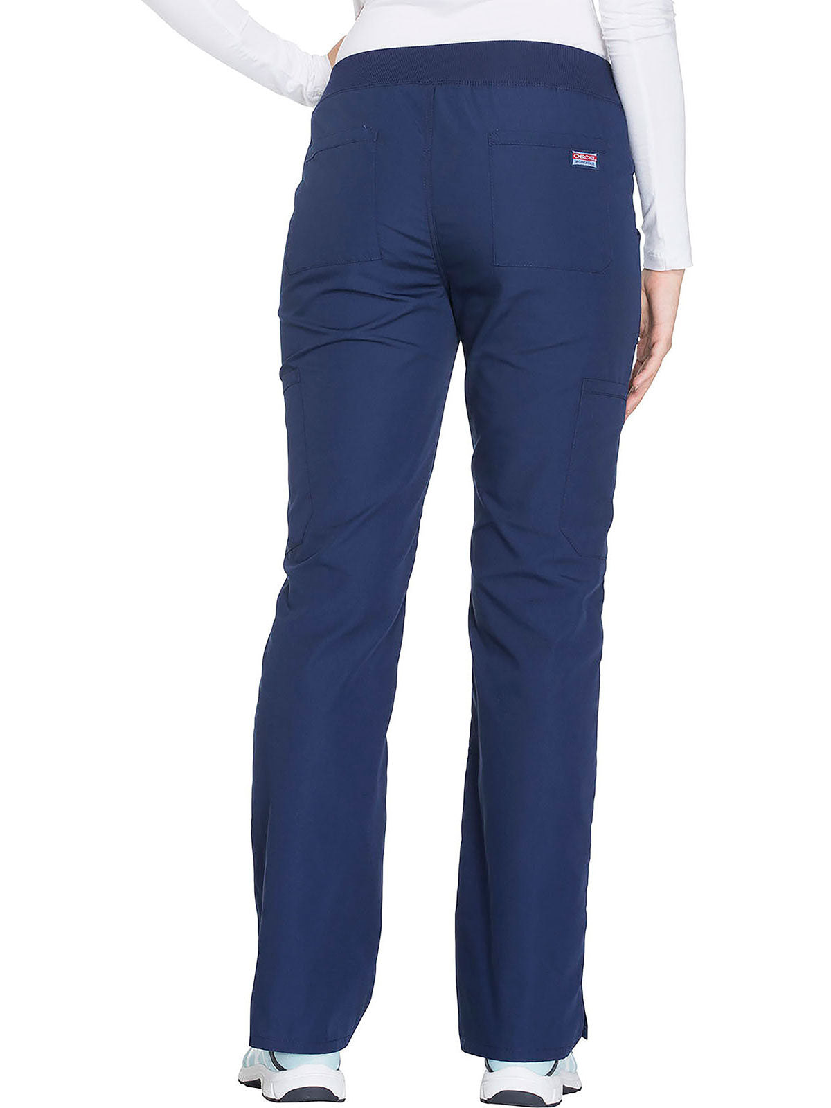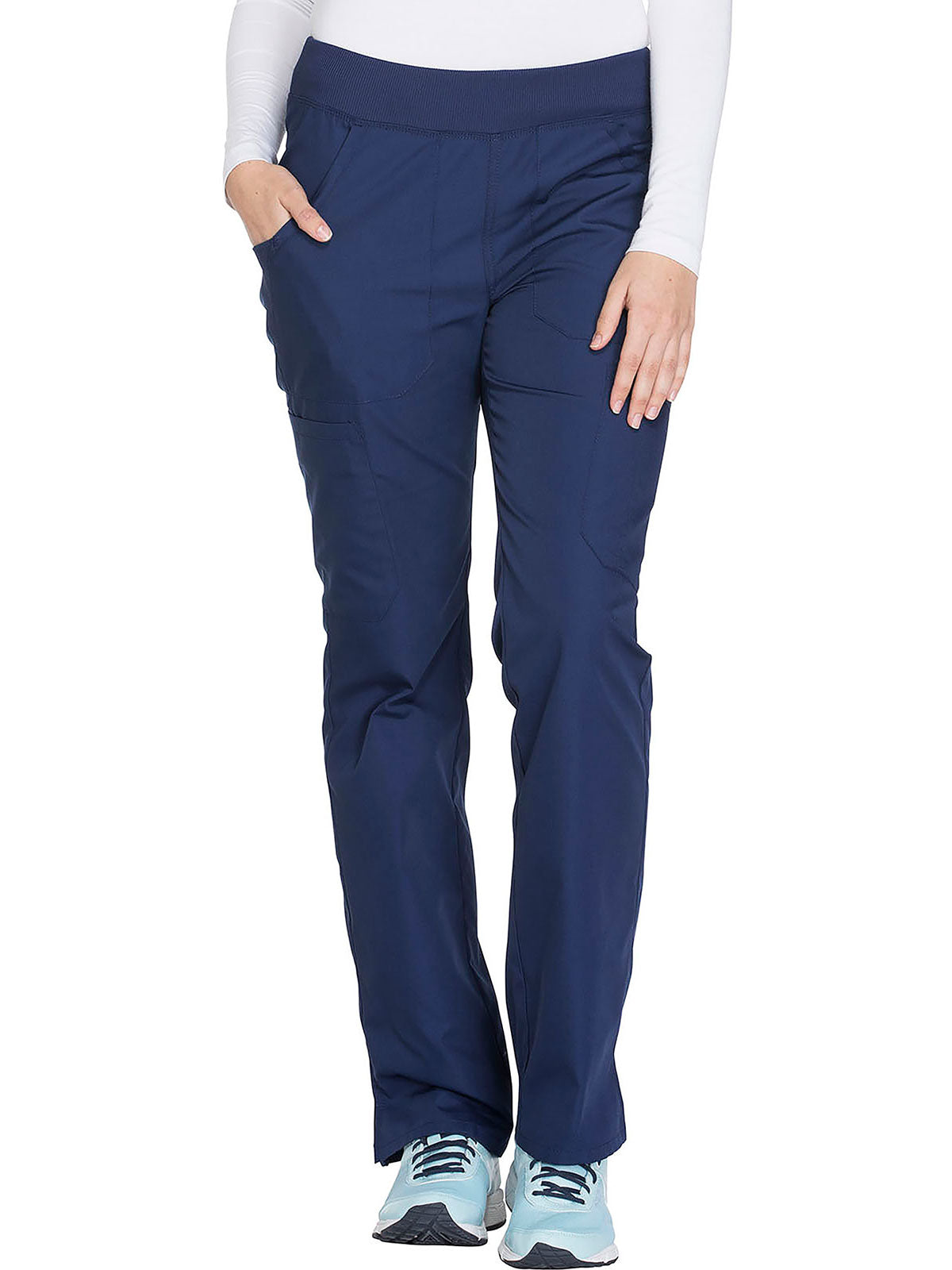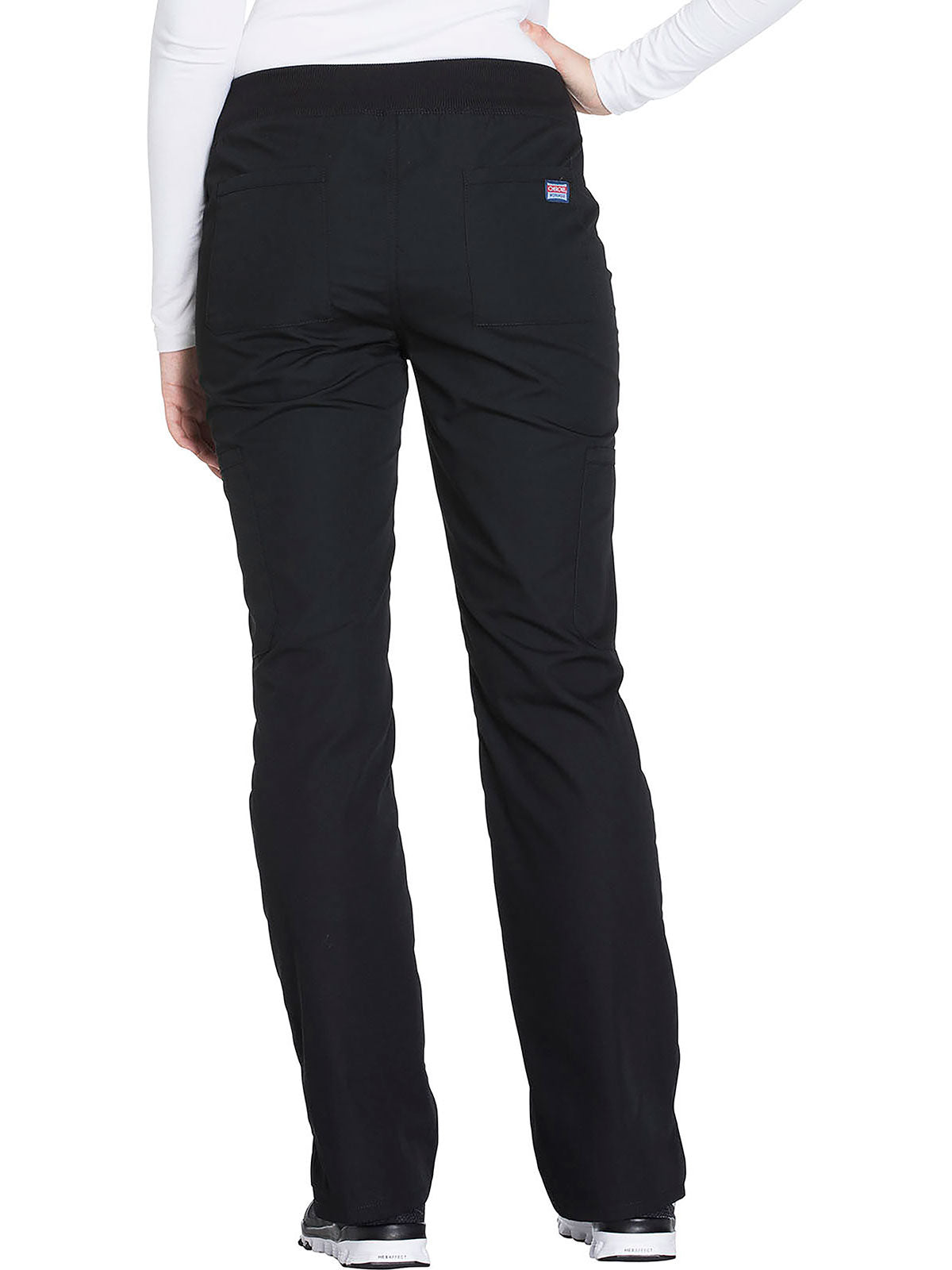 A Contemporary fit, mid rise, straight leg pant features a comfort-fit rib-knit waistband reinforced with inside elastic for extra support, and front patch pockets with rib-knit insets for expandability without sagging. Also featured are two cargo pockets, a pen slot, hidden instrument loop, back pockets and side vents. Inseam: 31”