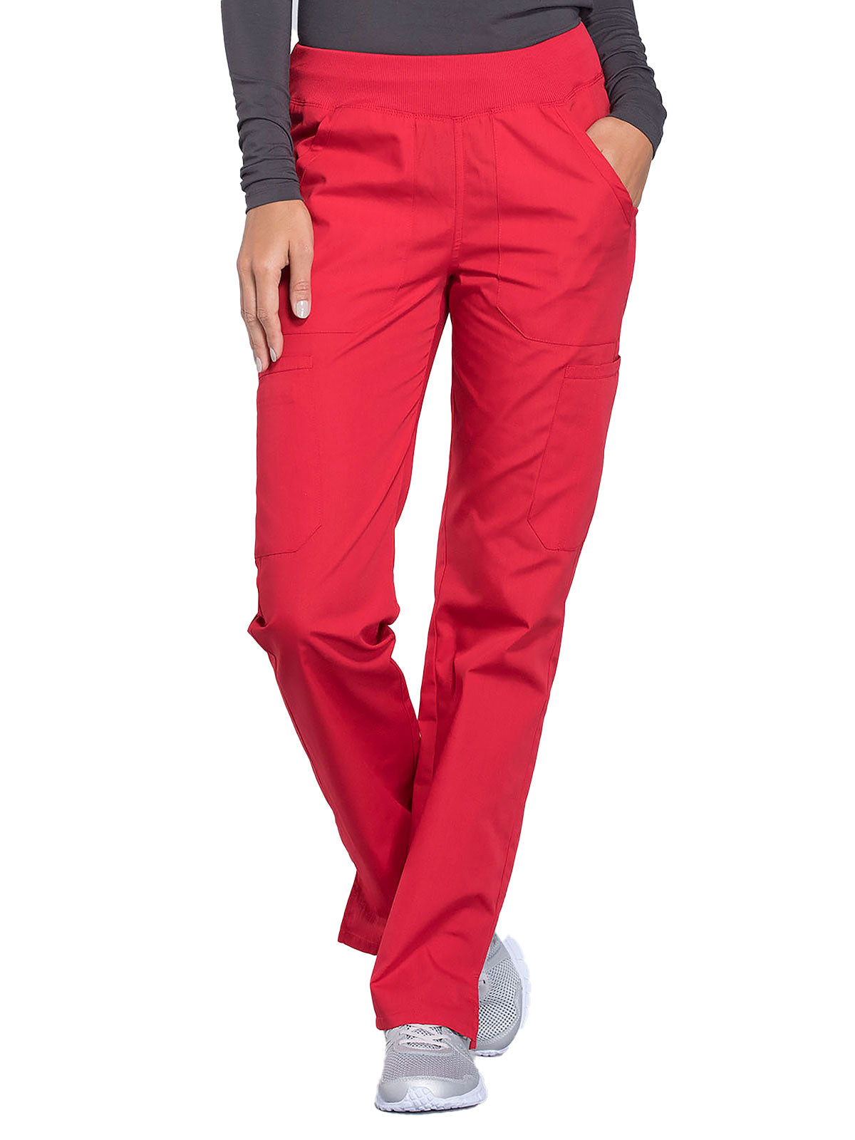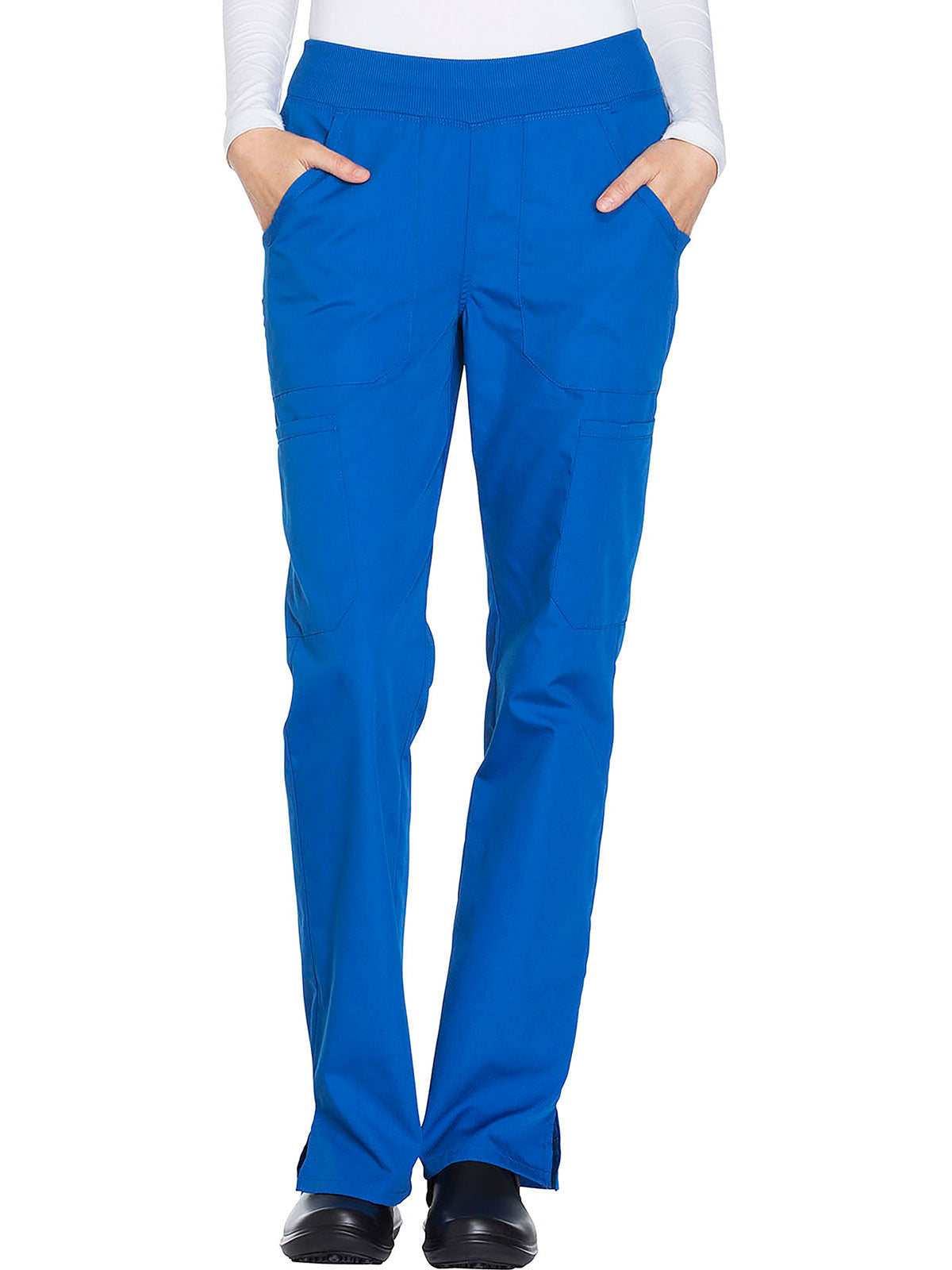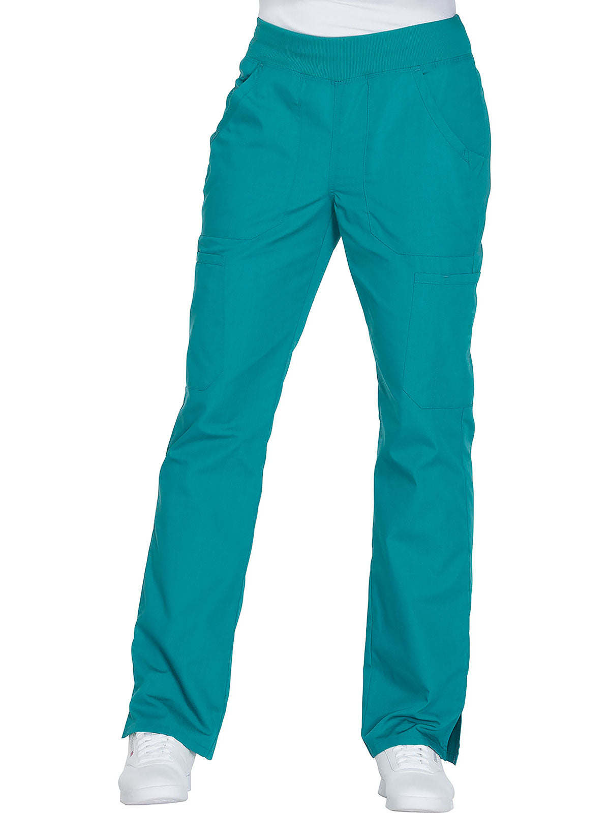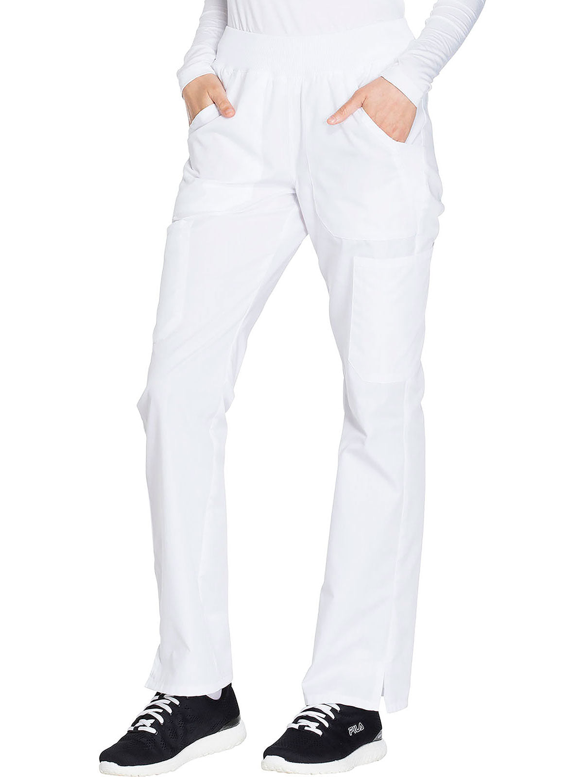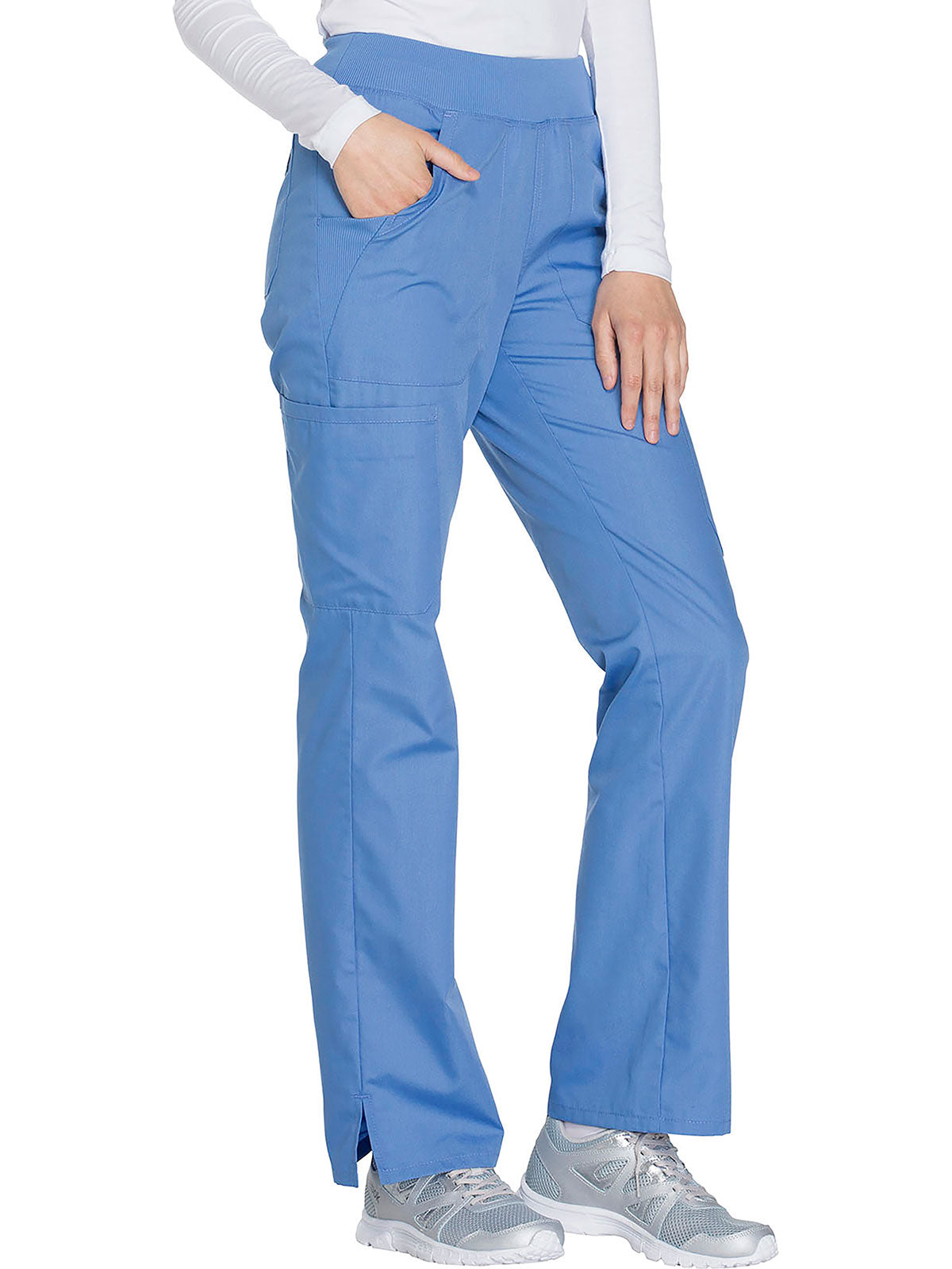 A Contemporary fit, mid rise, straight leg pant features a comfort-fit rib-knit waistband reinforced with inside elastic for extra support, and front patch pockets with rib-knit insets for expandability without sagging. Also featured are two cargo pockets, a pen slot, hidden instrument loop, back pockets and side vents. Inseam: 31”