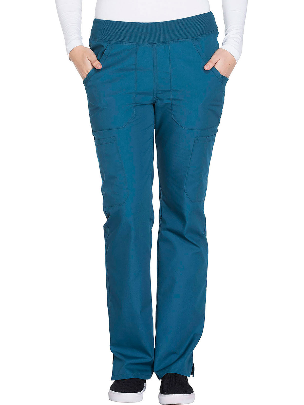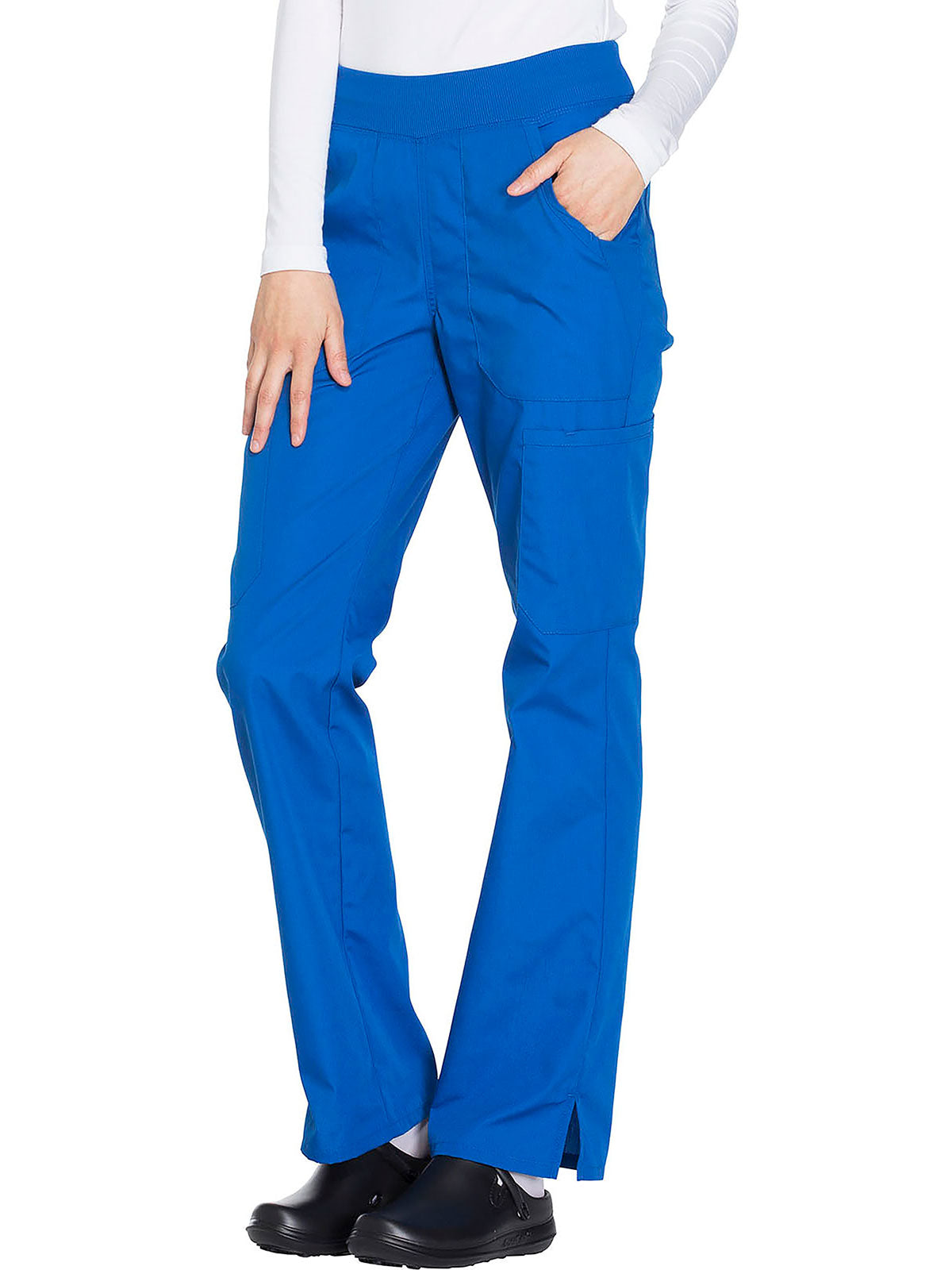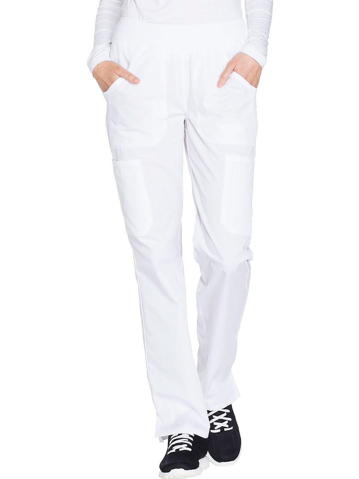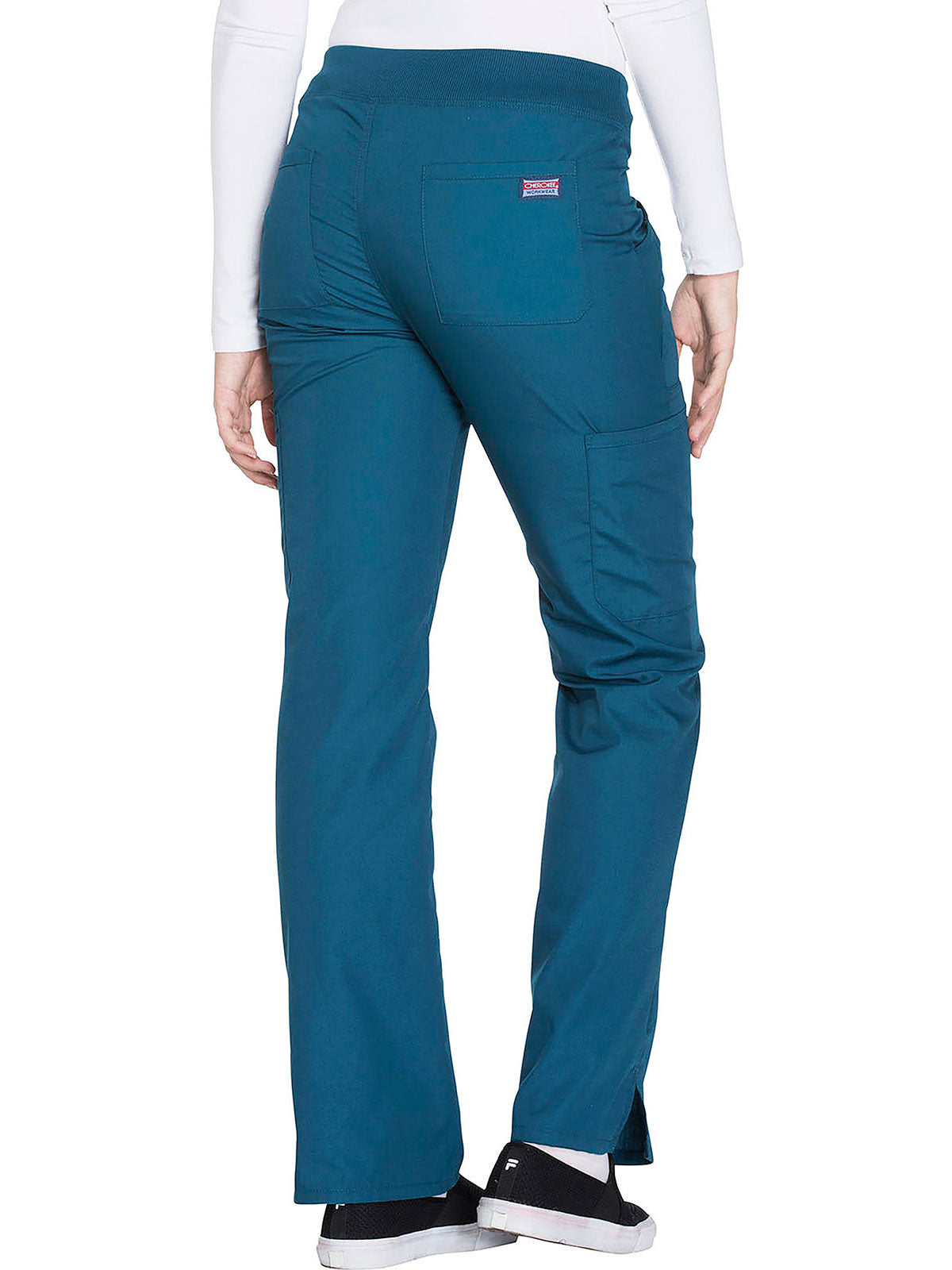 A Contemporary fit, mid rise, straight leg pant features a comfort-fit rib-knit waistband reinforced with inside elastic for extra support, and front patch pockets with rib-knit insets for expandability without sagging. Also featured are two cargo pockets, a pen slot, hidden instrument loop, back pockets and side vents. Inseam: 31”