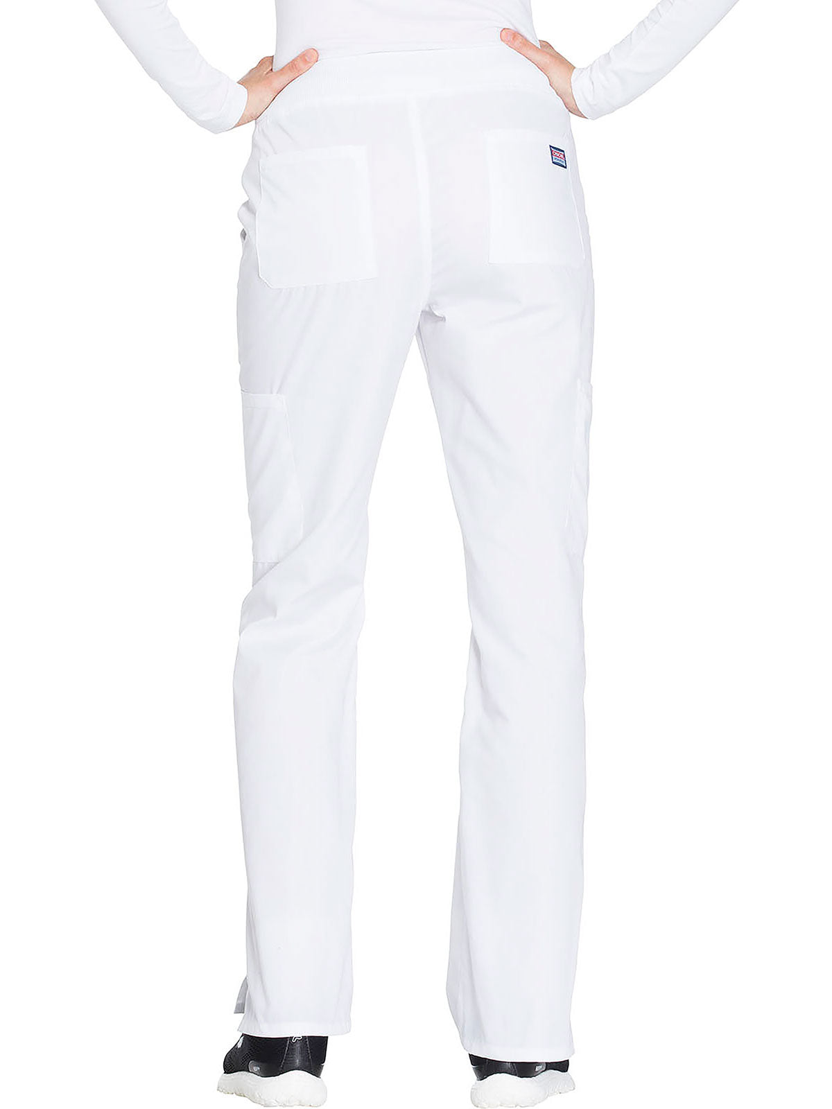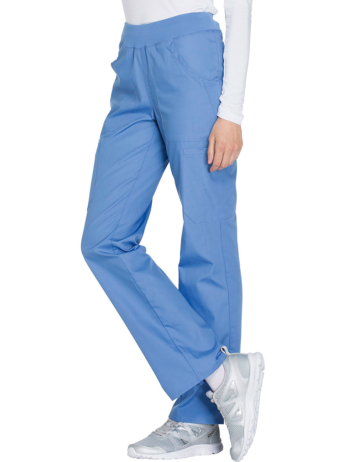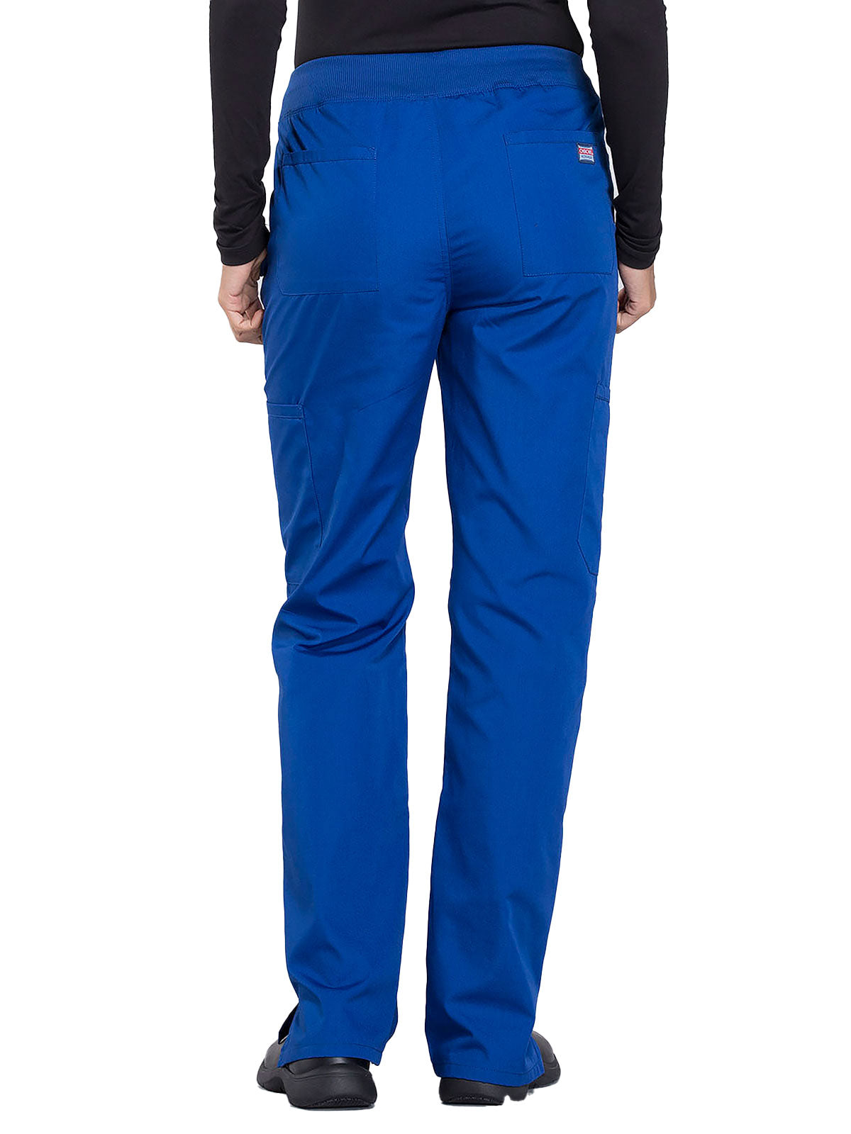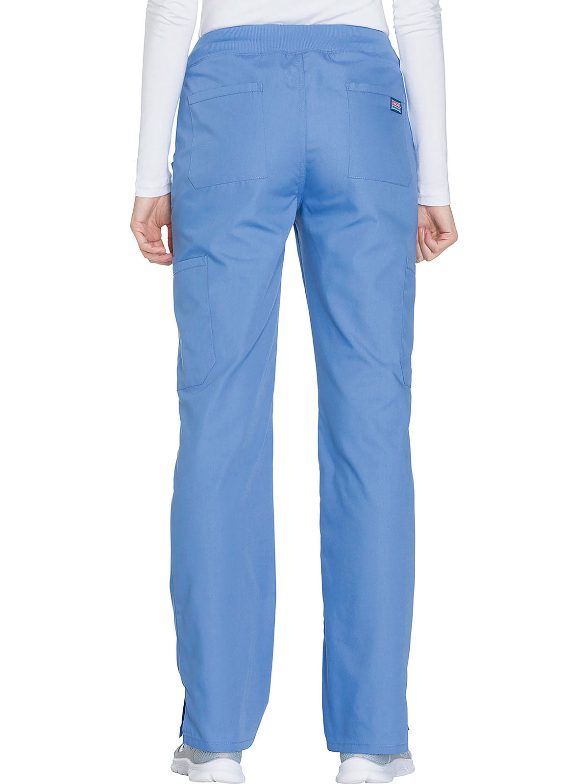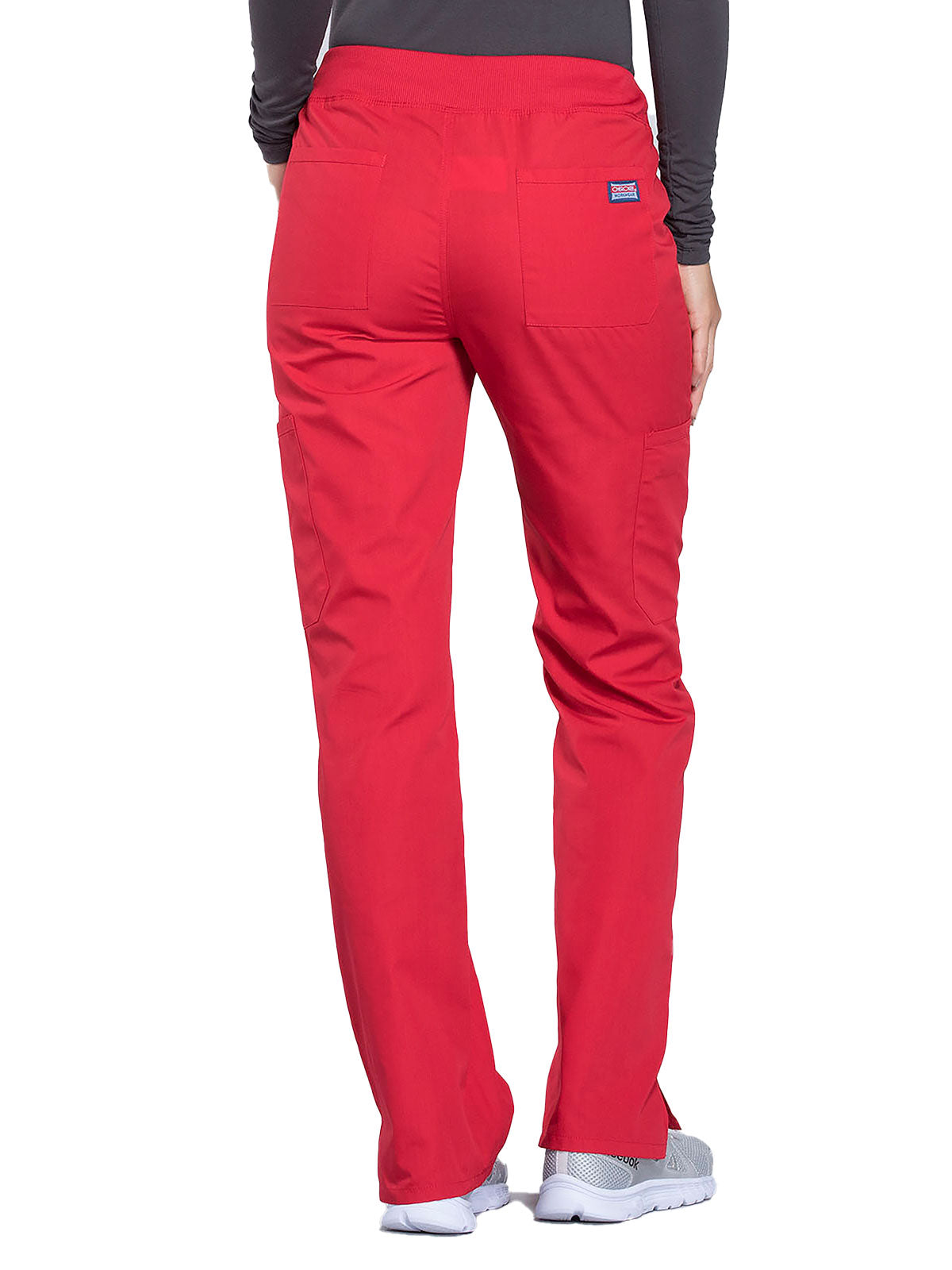 A Contemporary fit, mid rise, straight leg pant features a comfort-fit rib-knit waistband reinforced with inside elastic for extra support, and front patch pockets with rib-knit insets for expandability without sagging. Also featured are two cargo pockets, a pen slot, hidden instrument loop, back pockets and side vents. Inseam: 31”