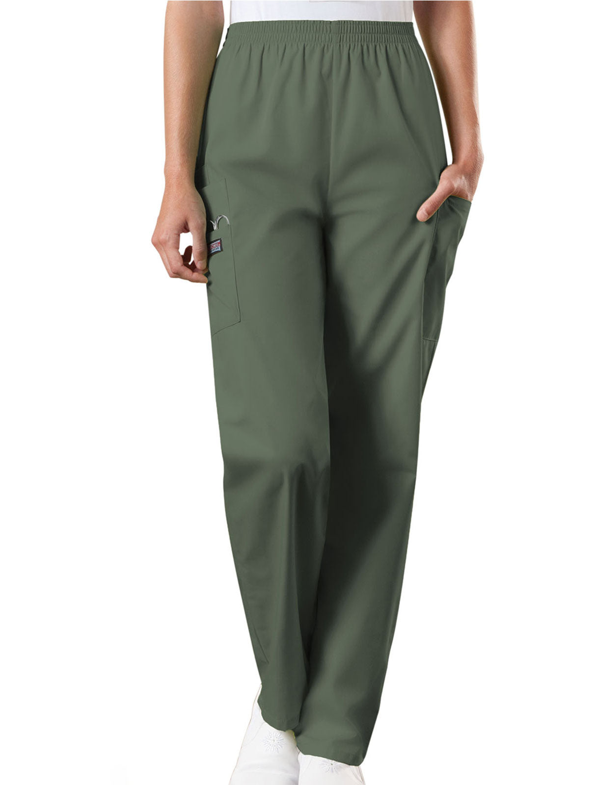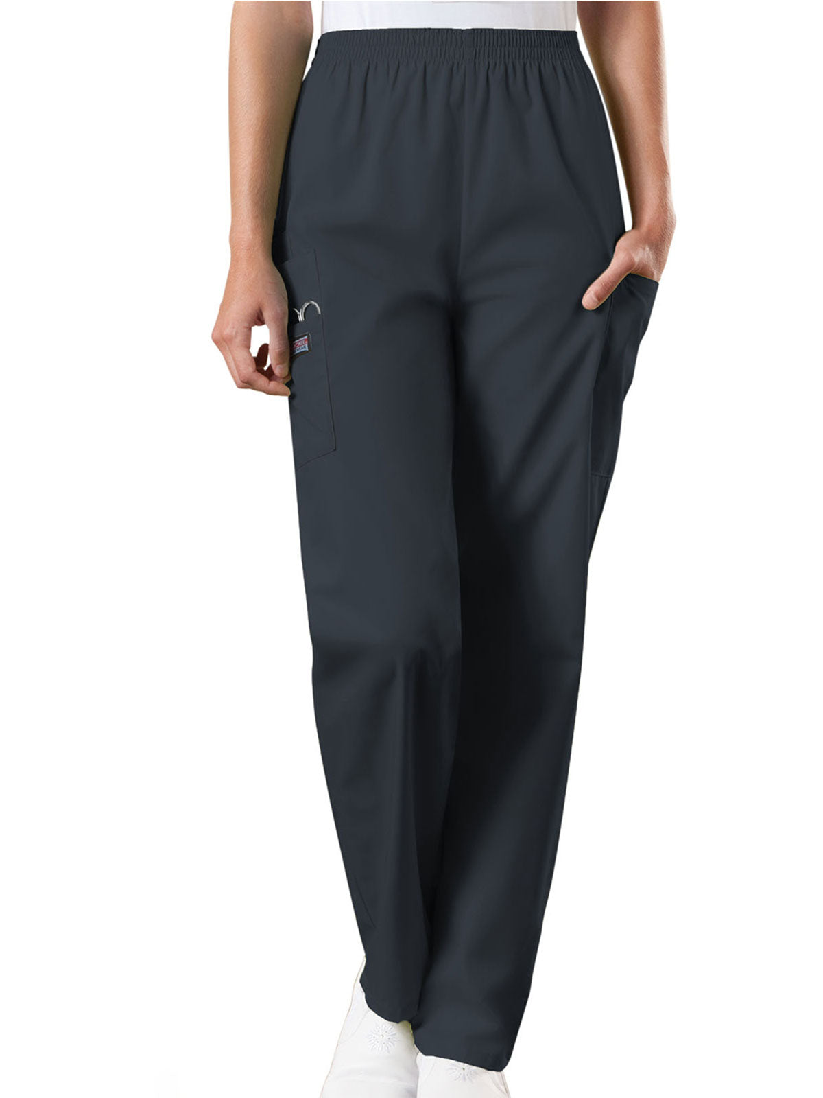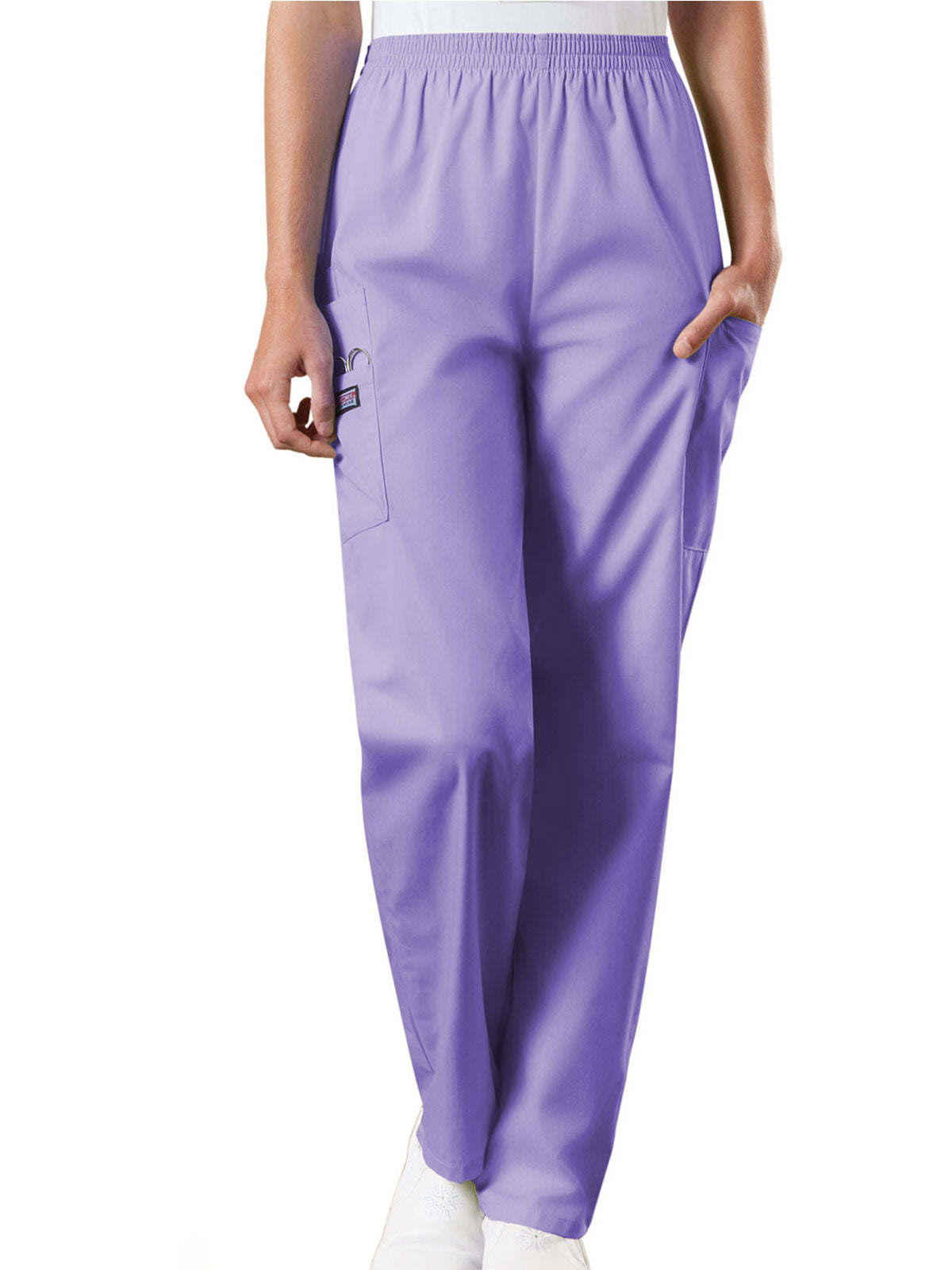 This Traditional fit, elastic waist utility pant features a natural rise and tapered leg, two cargo pockets, a cell phone pocket and an outside scissor pocket. Inseam: 33"