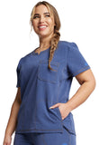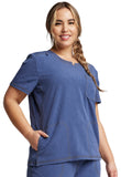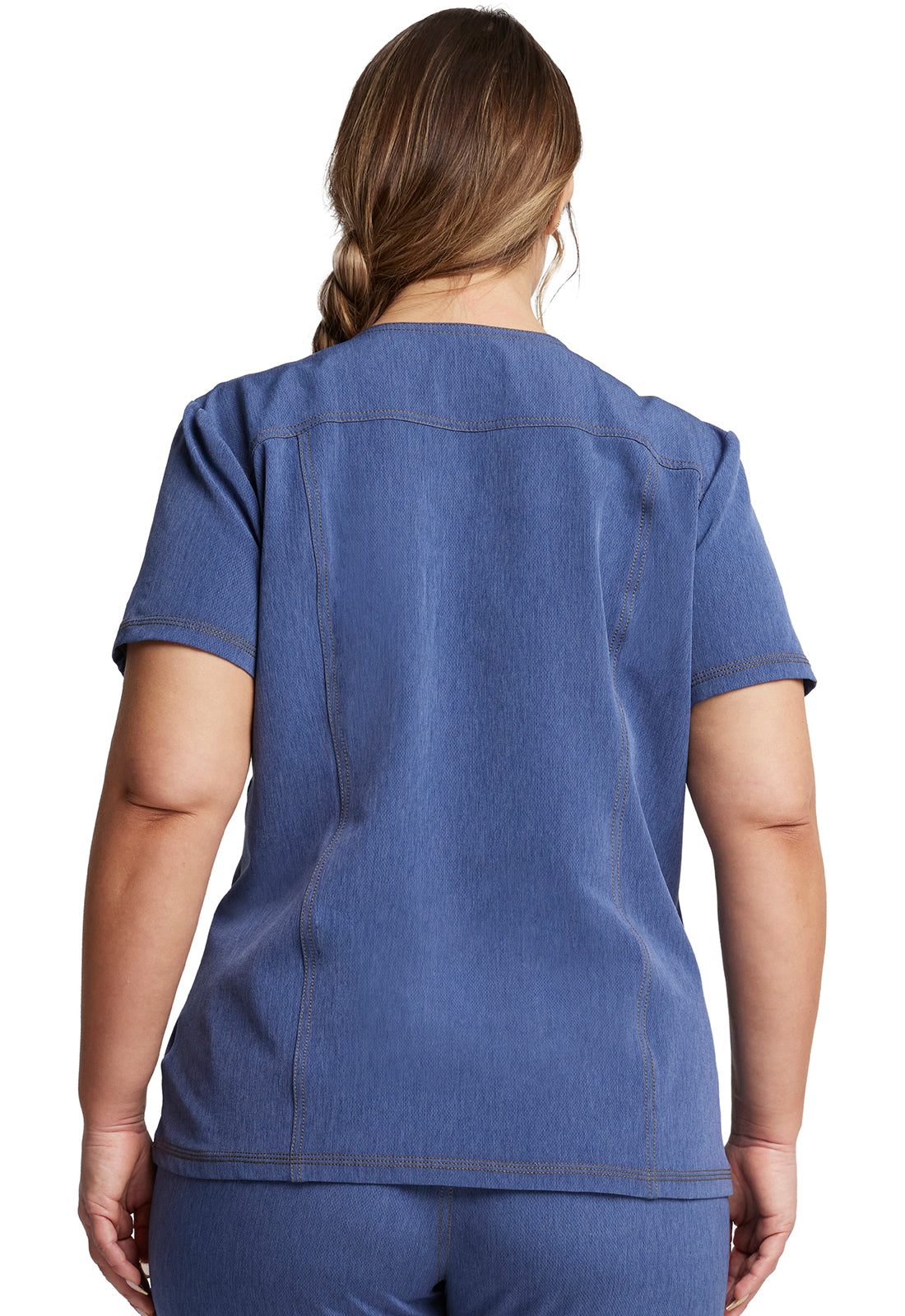 This Contemporary fit notched round neck top has contrast decorative multi-needle stitching throughout. Other features include front yoke seams, a bungee ID badge loop, front and back princess seams, and back yoke seam. There are four pockets: a double chest pocket and two side seam pockets. Front vents complete the look. Center back length: 26".
