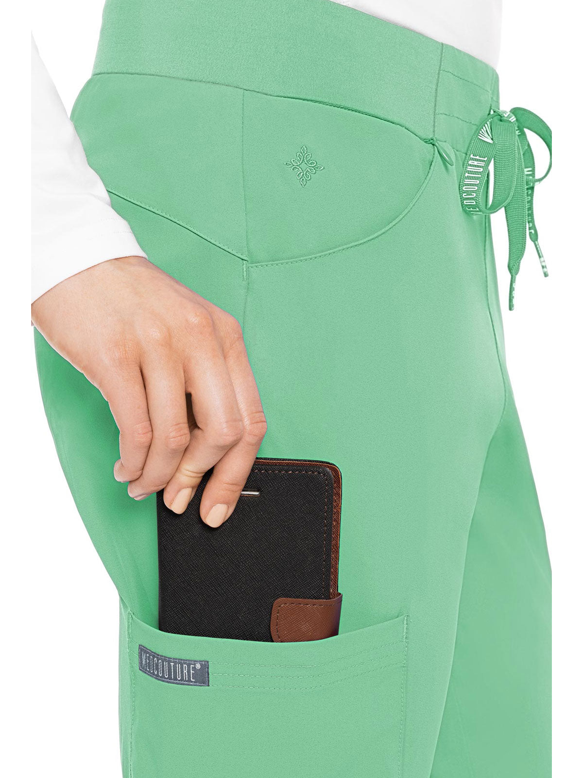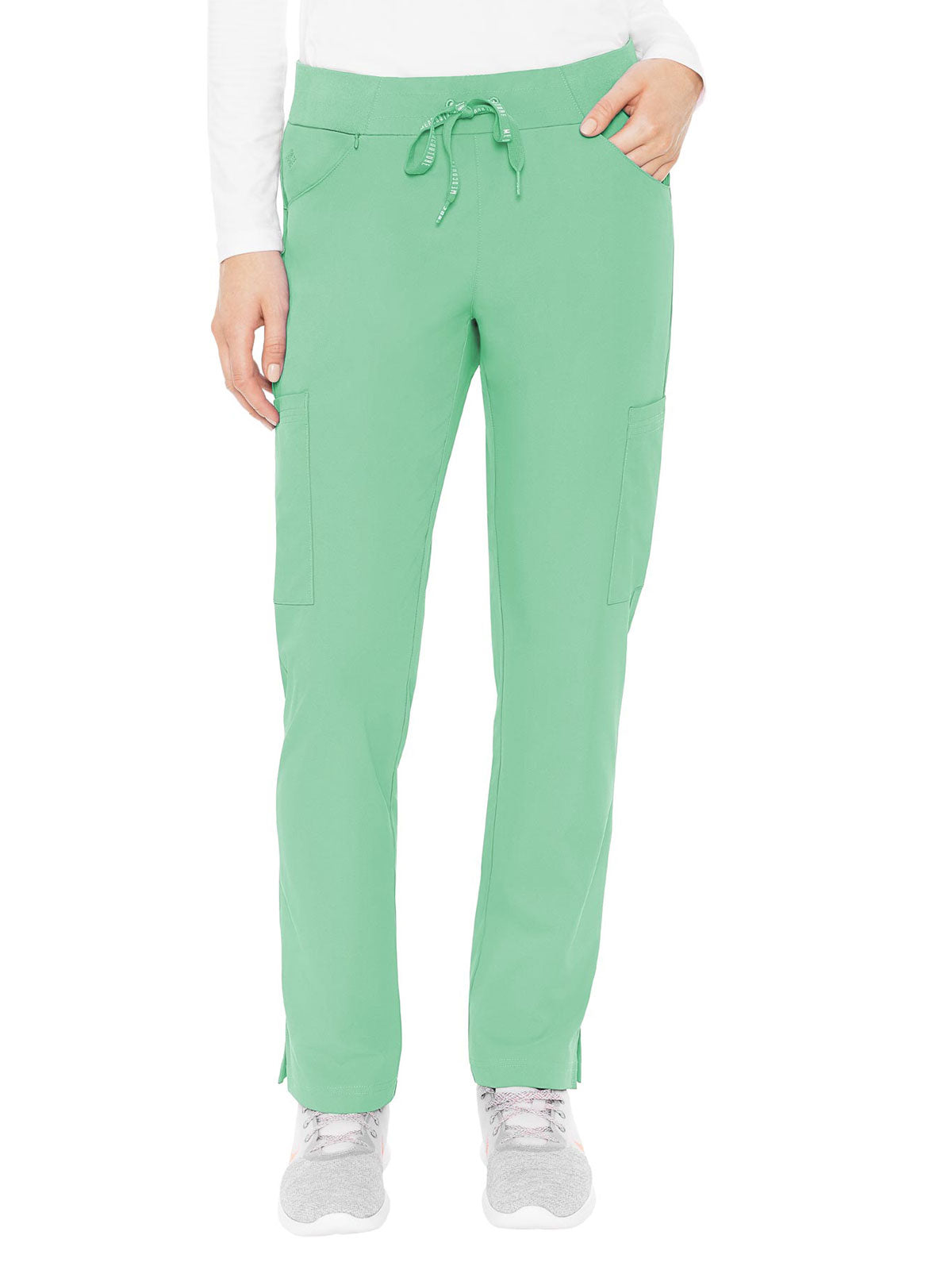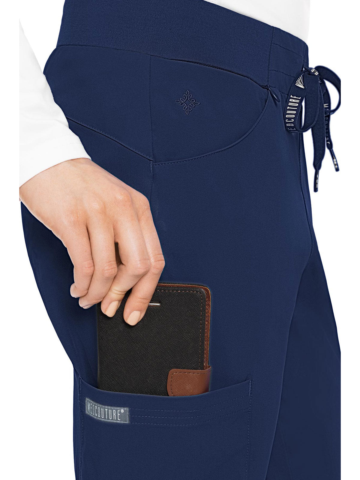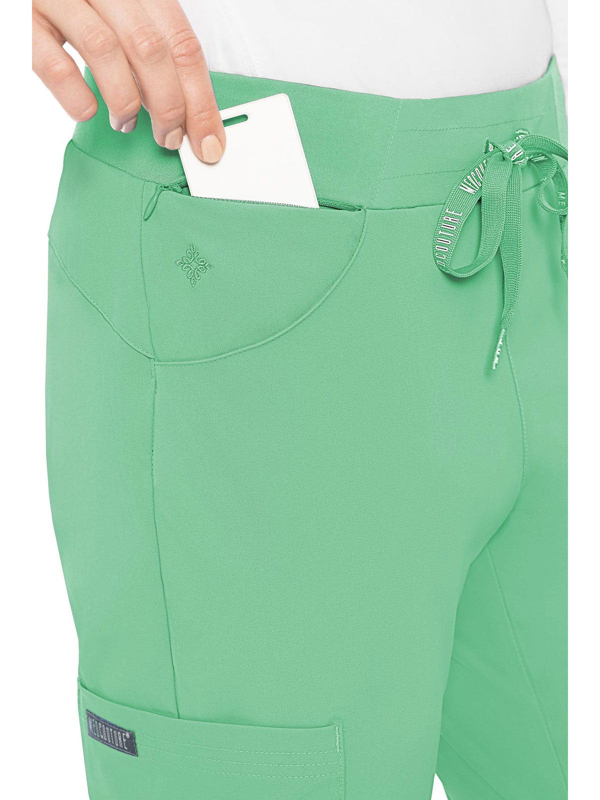 Stay organized and ready to take on your day in the super-comfortable Peaches by Med Couture Women's Scoop Cargo Pocket Scrub Pant. Ultra soft stretch fabric and a streamlined, contoured fit make for a great start to your day.