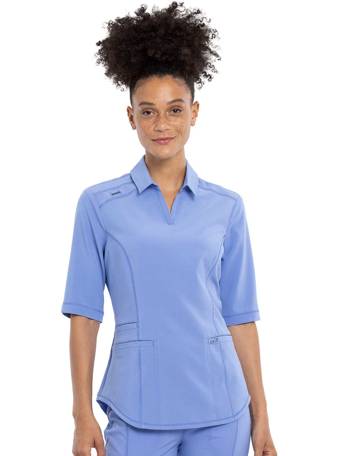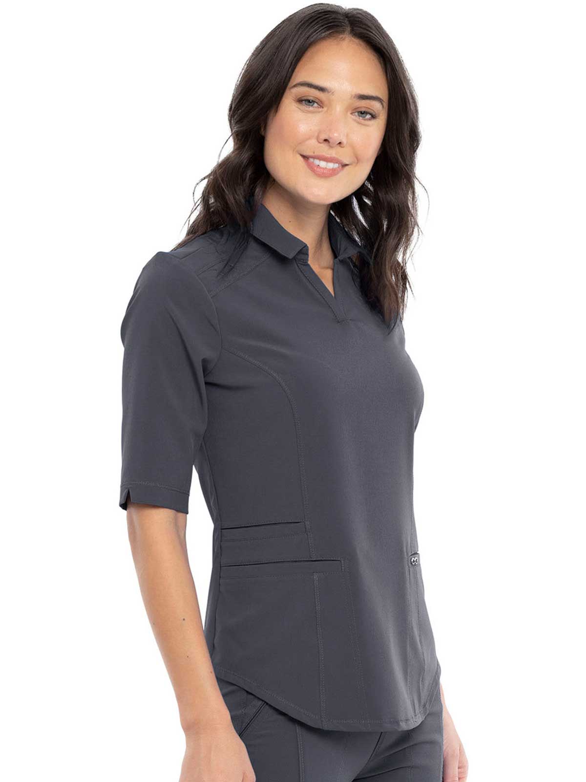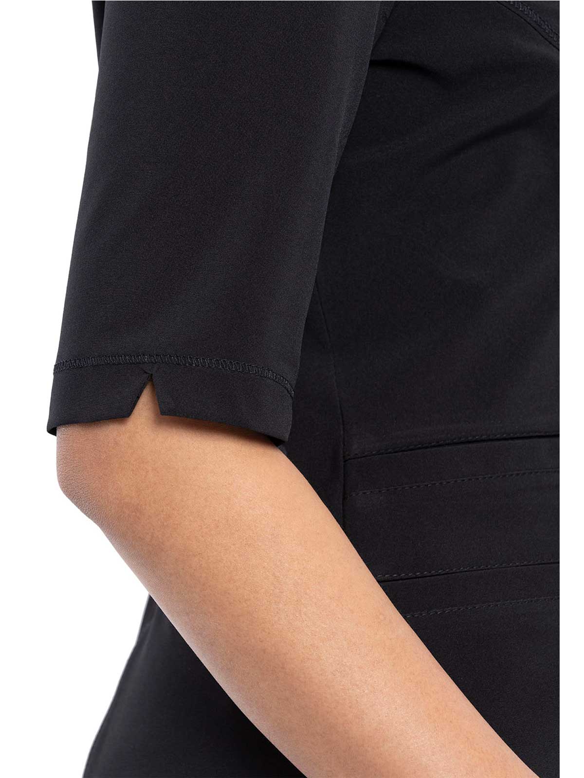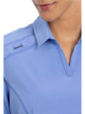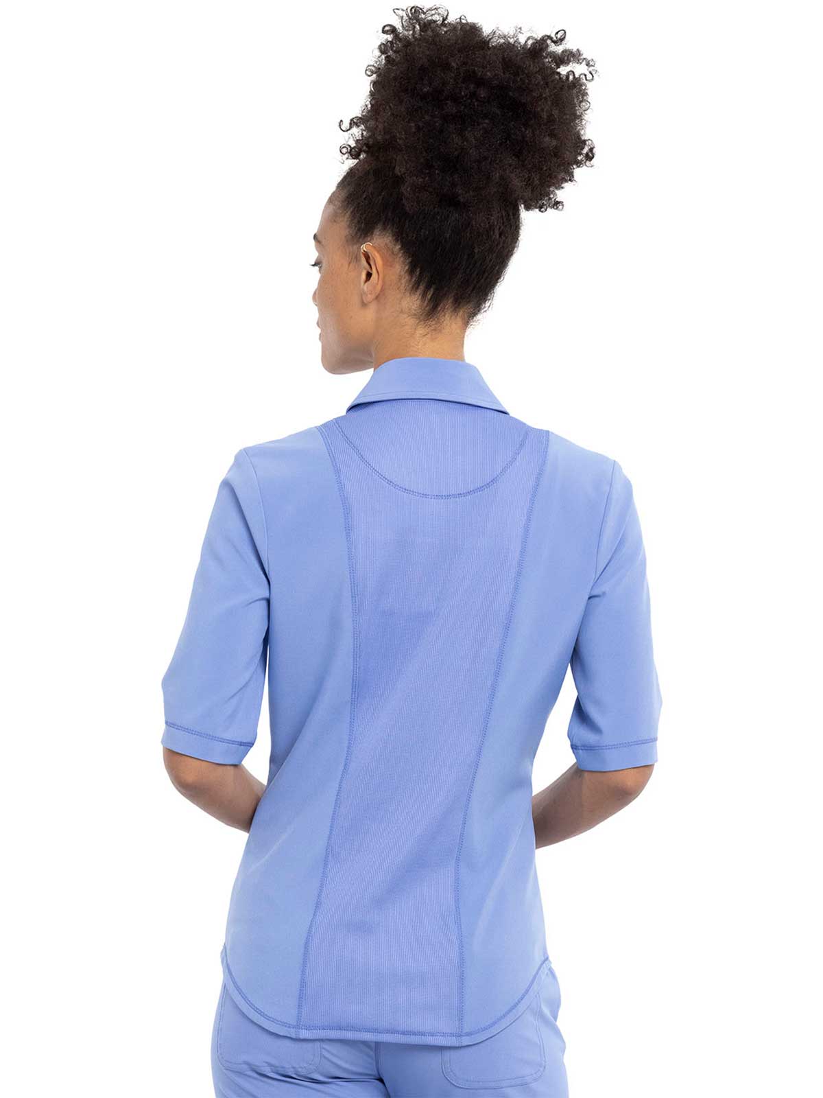 This Contemporary fit polo shirt features an open placket and front yoke seams with a bungee badge ID loop on the wearer's right. There are also front and back princess seams for fit and shaping. Elbow-length sleeves with vents can be turned up for versatile styling. There are three pockets: two front half-welt pockets and one half-welt utility pocket on the wearer's right. A shirttail hem completes the look. Center back length: 26".