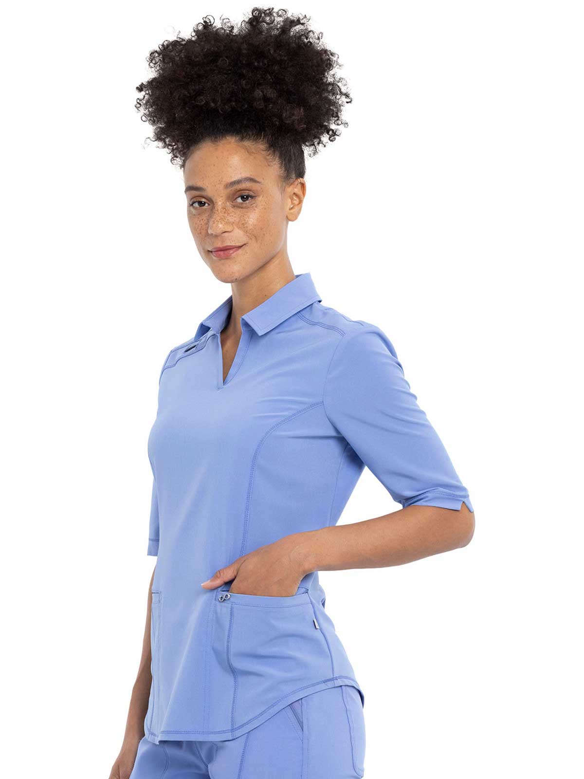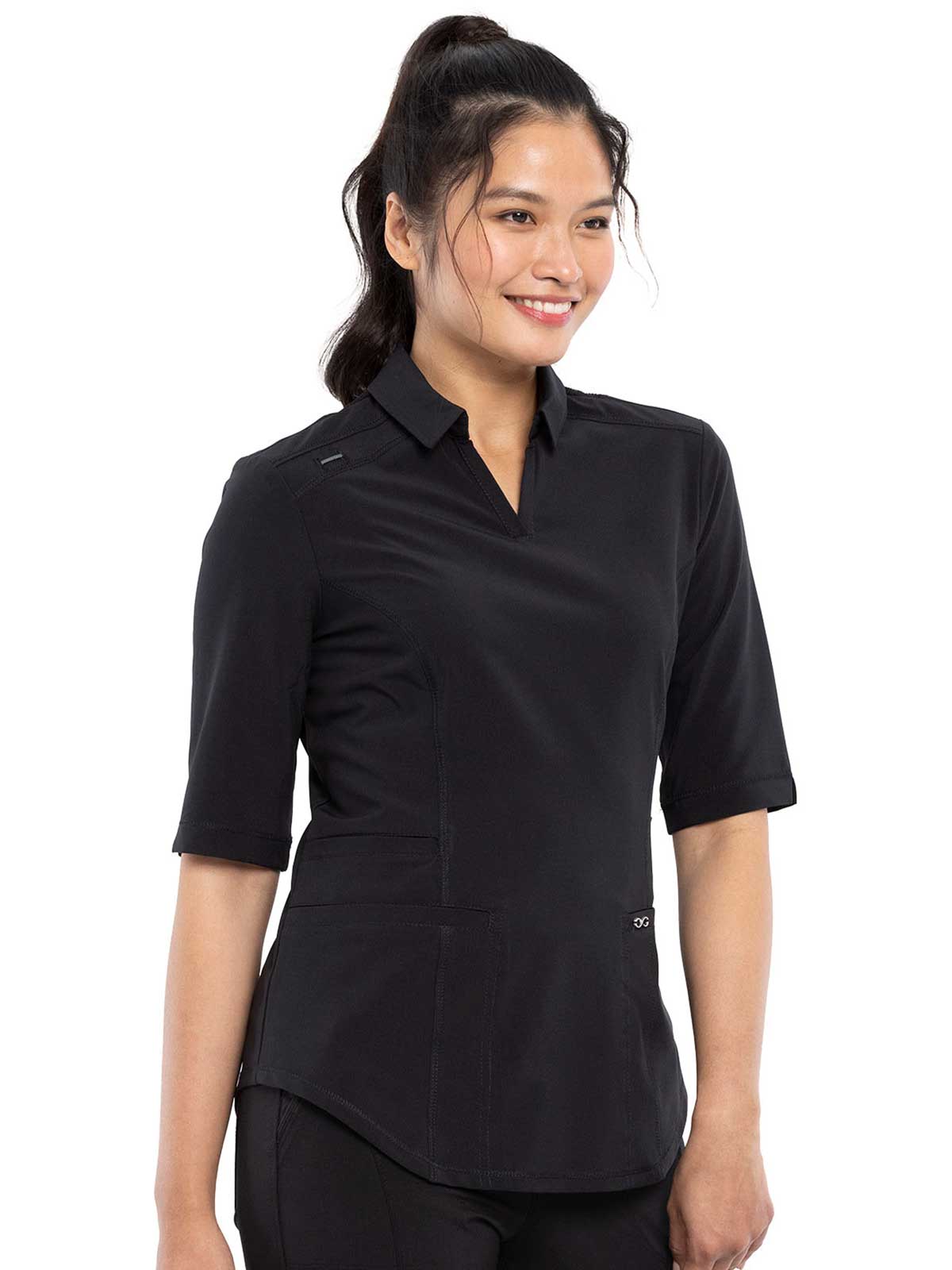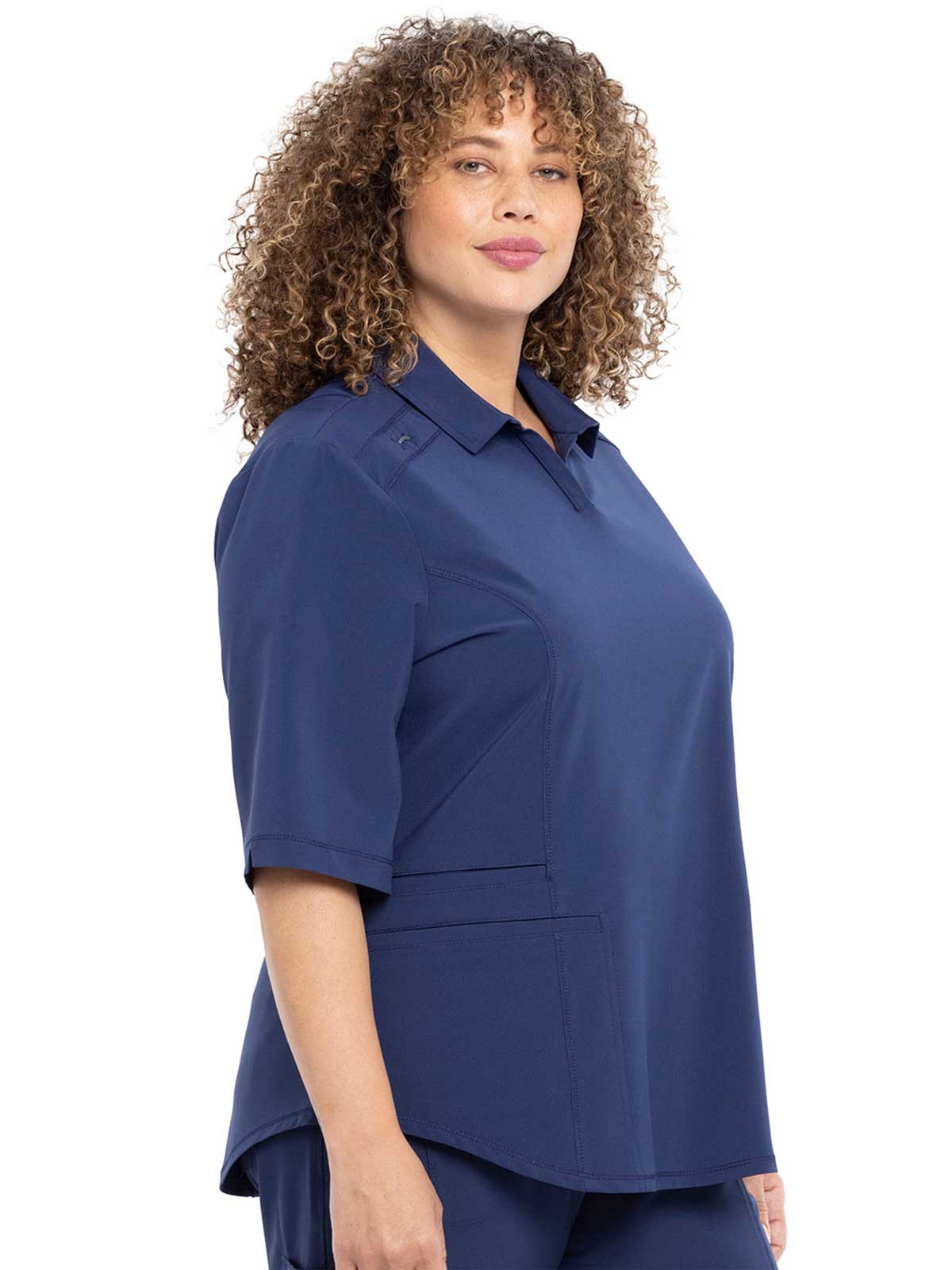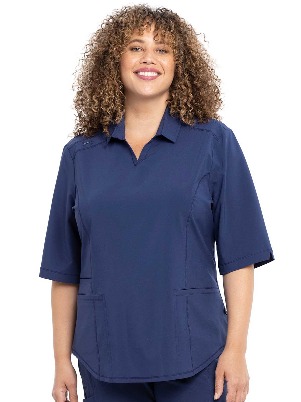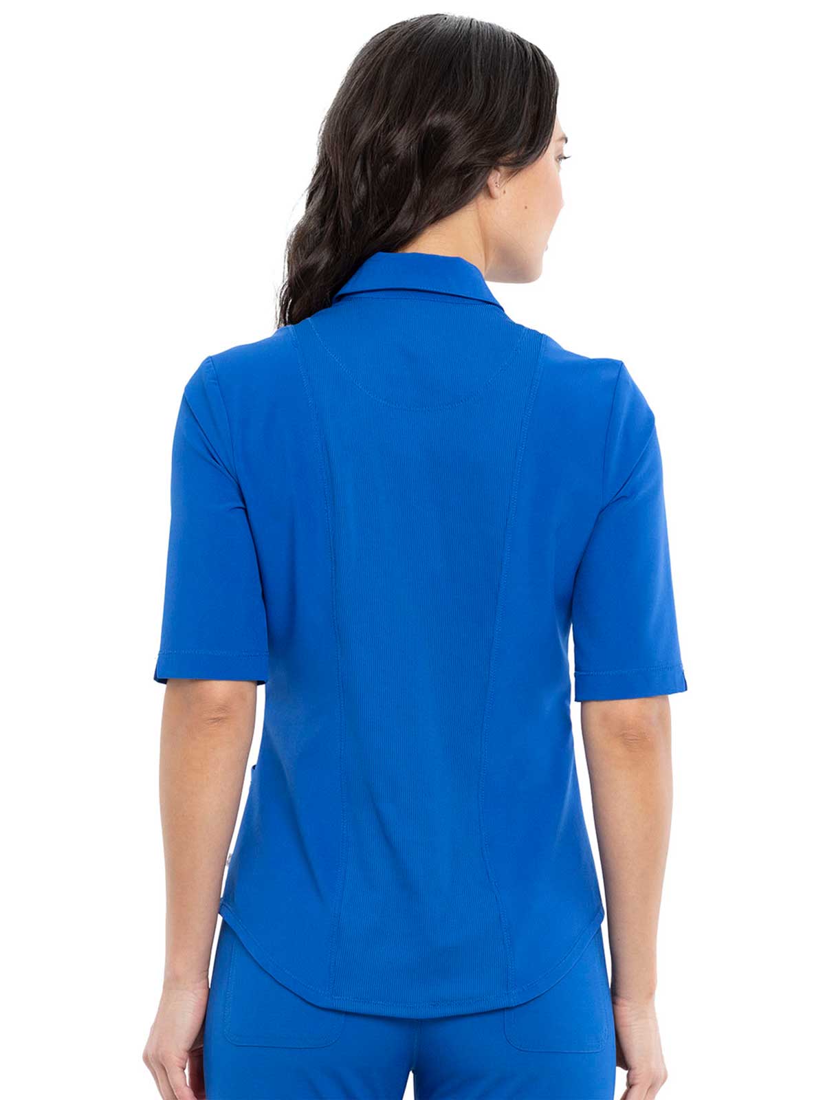 This Contemporary fit polo shirt features an open placket and front yoke seams with a bungee badge ID loop on the wearer's right. There are also front and back princess seams for fit and shaping. Elbow-length sleeves with vents can be turned up for versatile styling. There are three pockets: two front half-welt pockets and one half-welt utility pocket on the wearer's right. A shirttail hem completes the look. Center back length: 26".