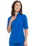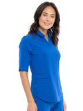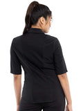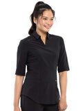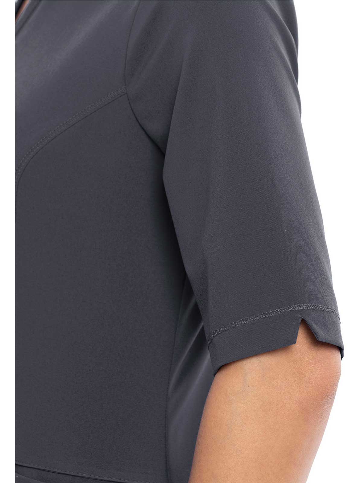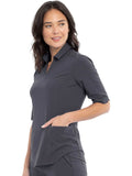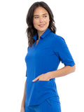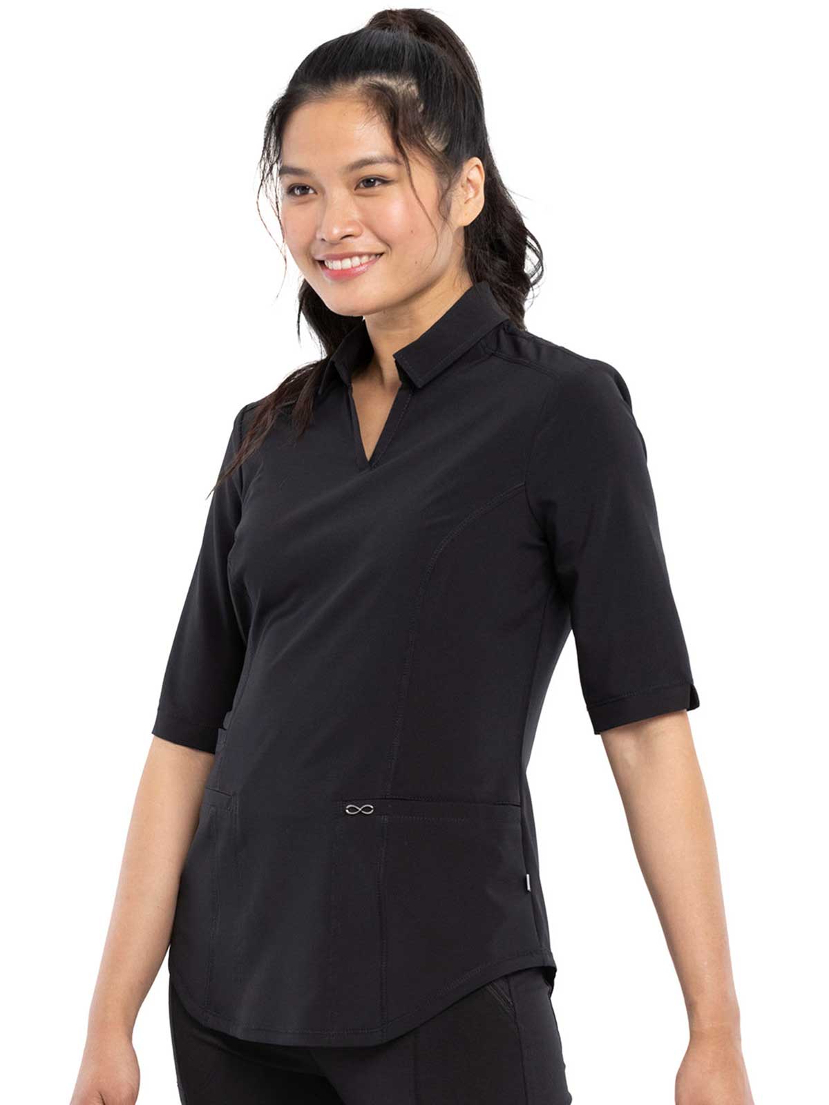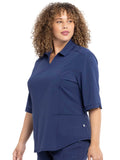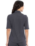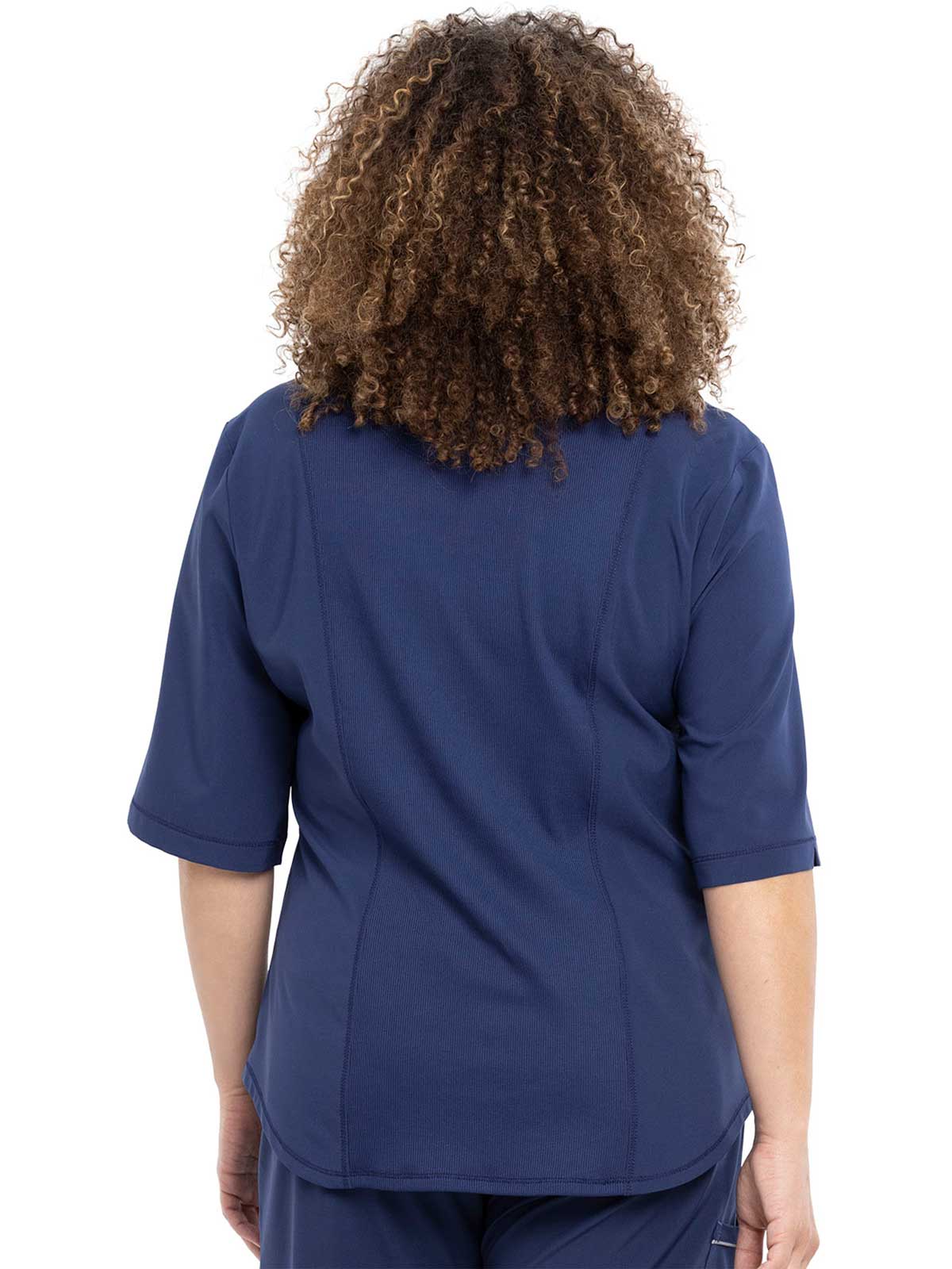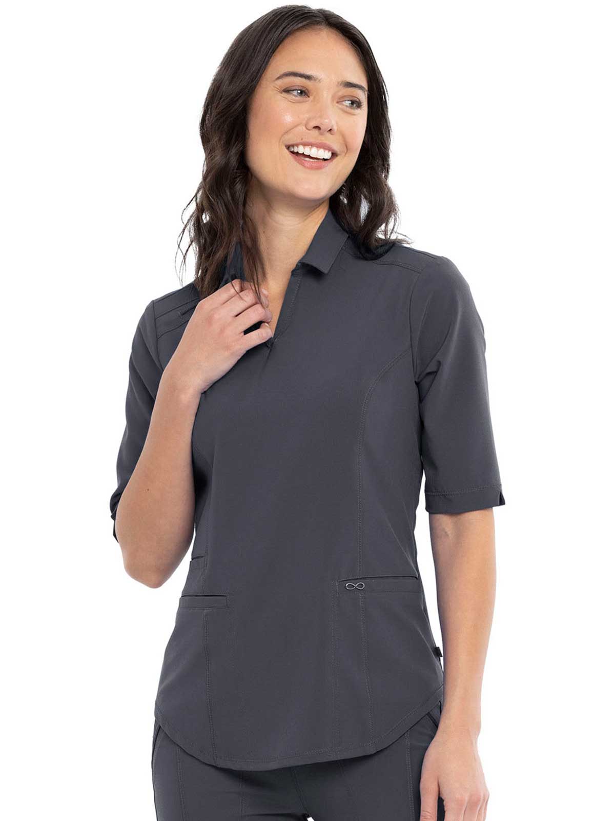 This Contemporary fit polo shirt features an open placket and front yoke seams with a bungee badge ID loop on the wearer's right. There are also front and back princess seams for fit and shaping. Elbow-length sleeves with vents can be turned up for versatile styling. There are three pockets: two front half-welt pockets and one half-welt utility pocket on the wearer's right. A shirttail hem completes the look. Center back length: 26".