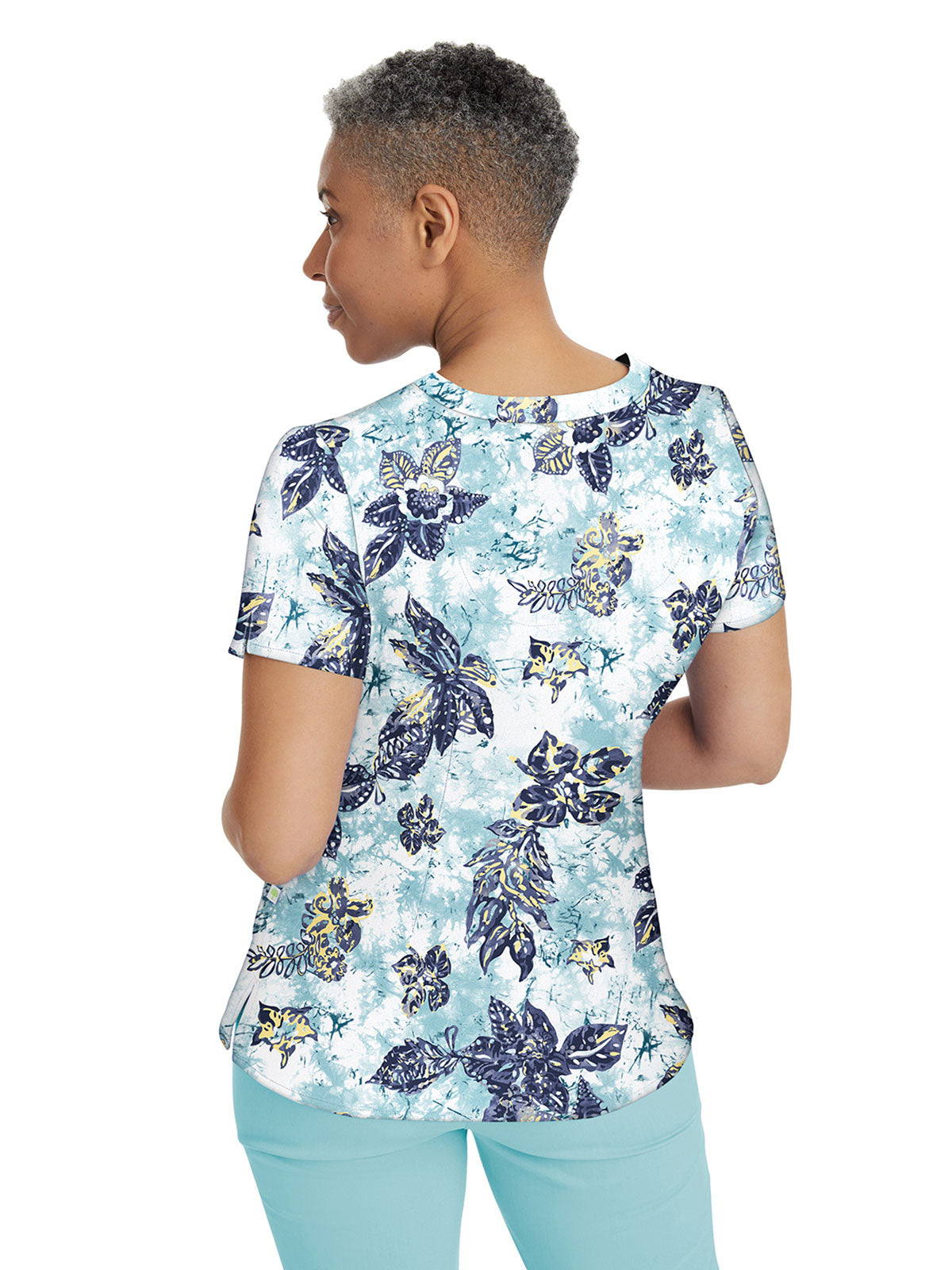 Embrace the season's darker florals in the Purple Label by Healing Hands Women's Amanda Tropical Tide Print Scrub Top. Grosgrain ribbon details add feminine style, while three pockets give you the utility you need.