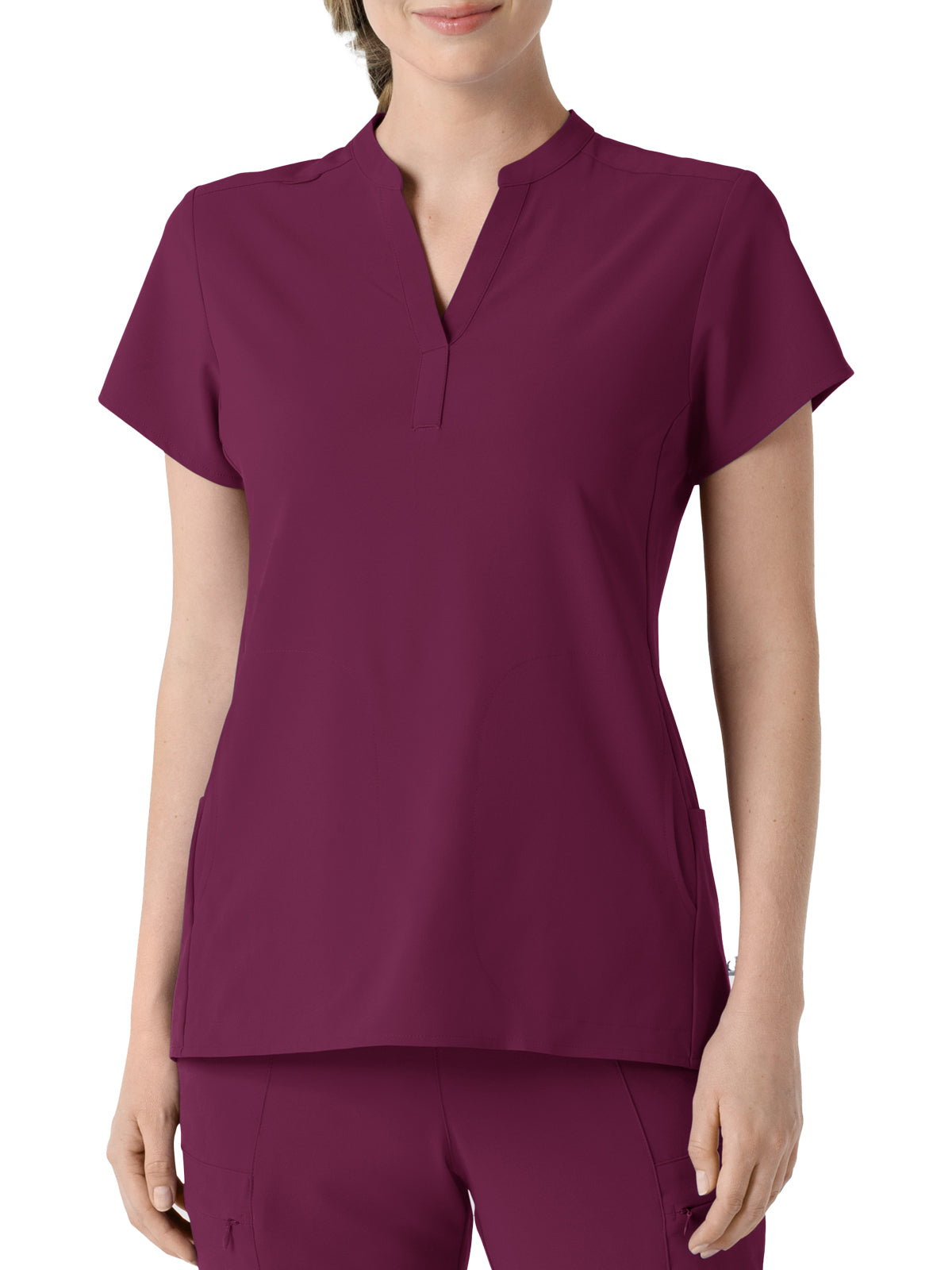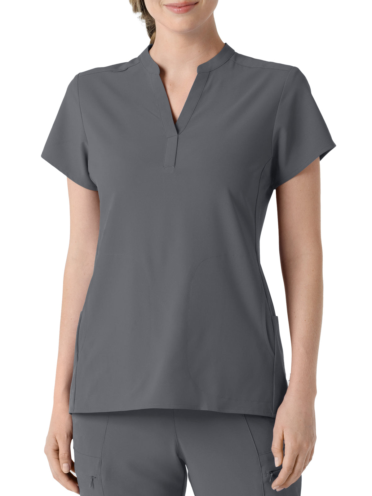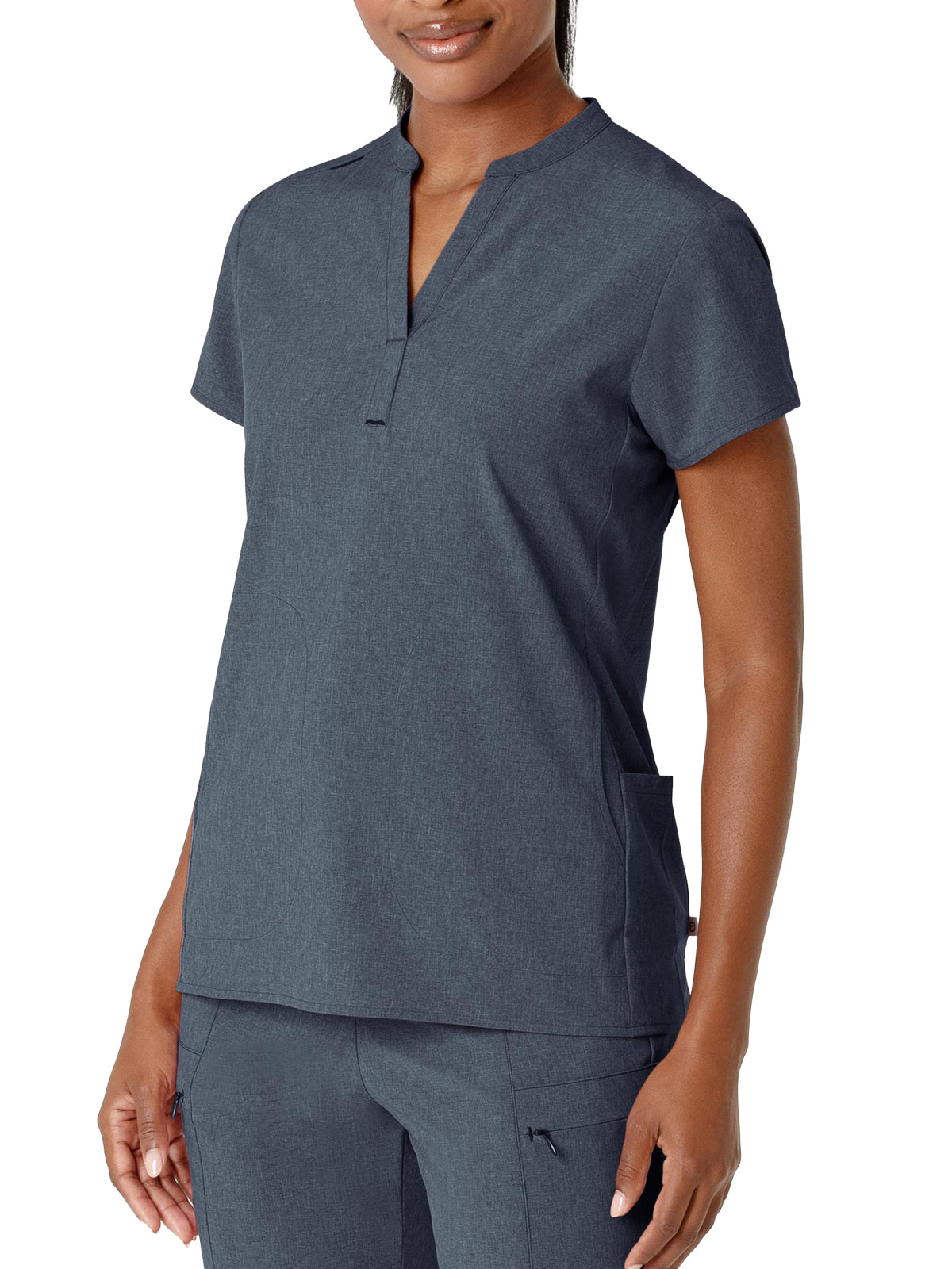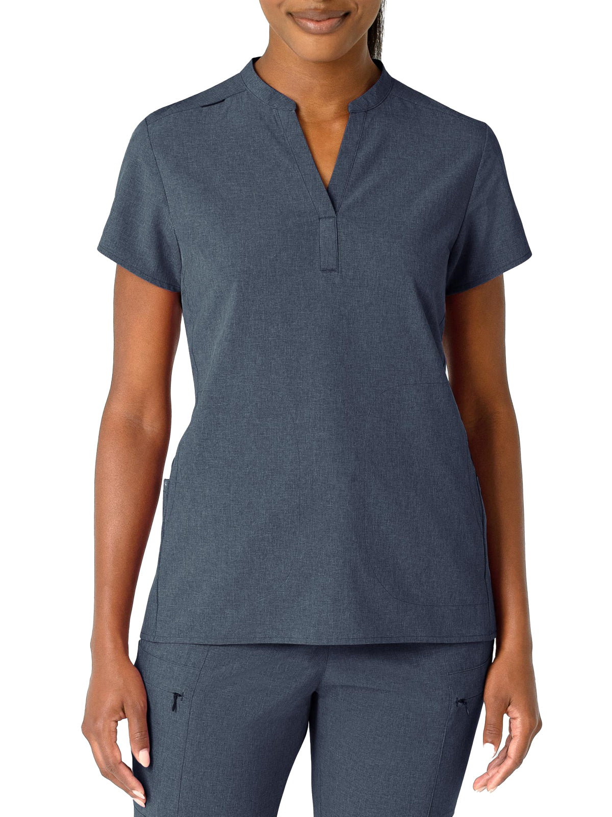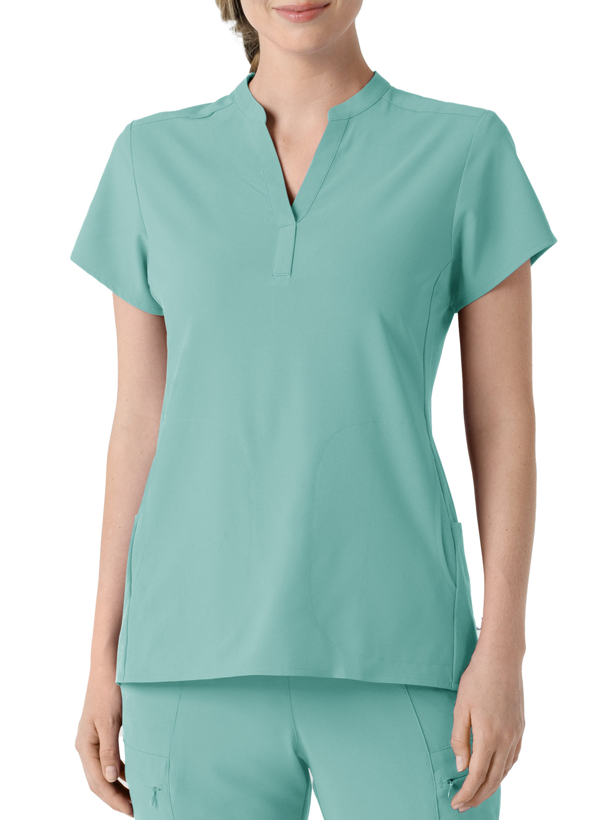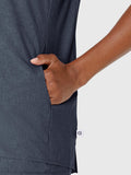As a care provider, you know that details matter. This women's scrub top is designed with thoughtful touches that make all the difference in simplifying your day. The mandarin collar puts a polished spin on everyday practicality, giving you a professional, stylish look that lasts through long shifts and busy days. Keep your glasses or your badge on a loop on the lower neckline or on another loop right at the shoulder. Tote tools and essentials from room to room with side-entry pockets on the front and top-entry pockets on the side panels. The back yoke with pleats helps give the silhouette shape, and the shirttail with vents makes moving around feel easy and restriction-free. The stretchy fabric moves with you in all the ways you stretch, bend and reach from task to task. It's eco-friendly too, so you're caring for the planet as you're caring for your patients.
