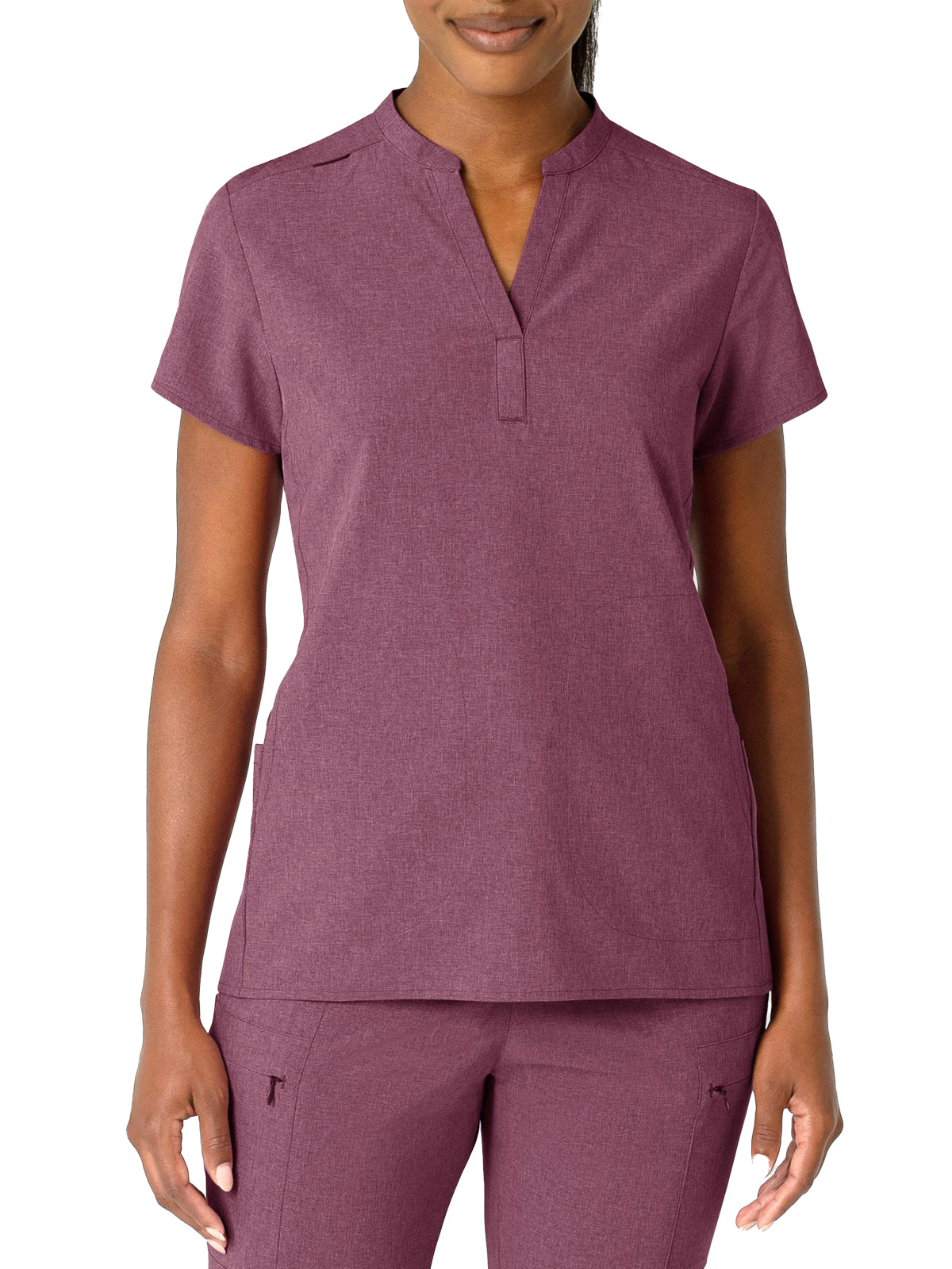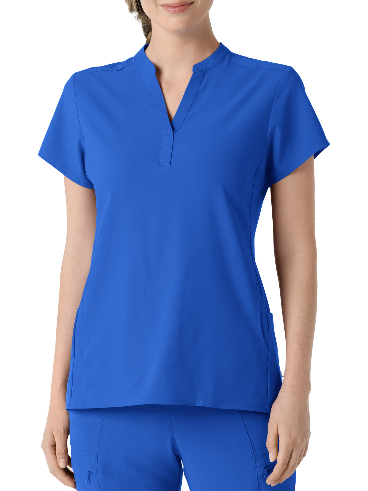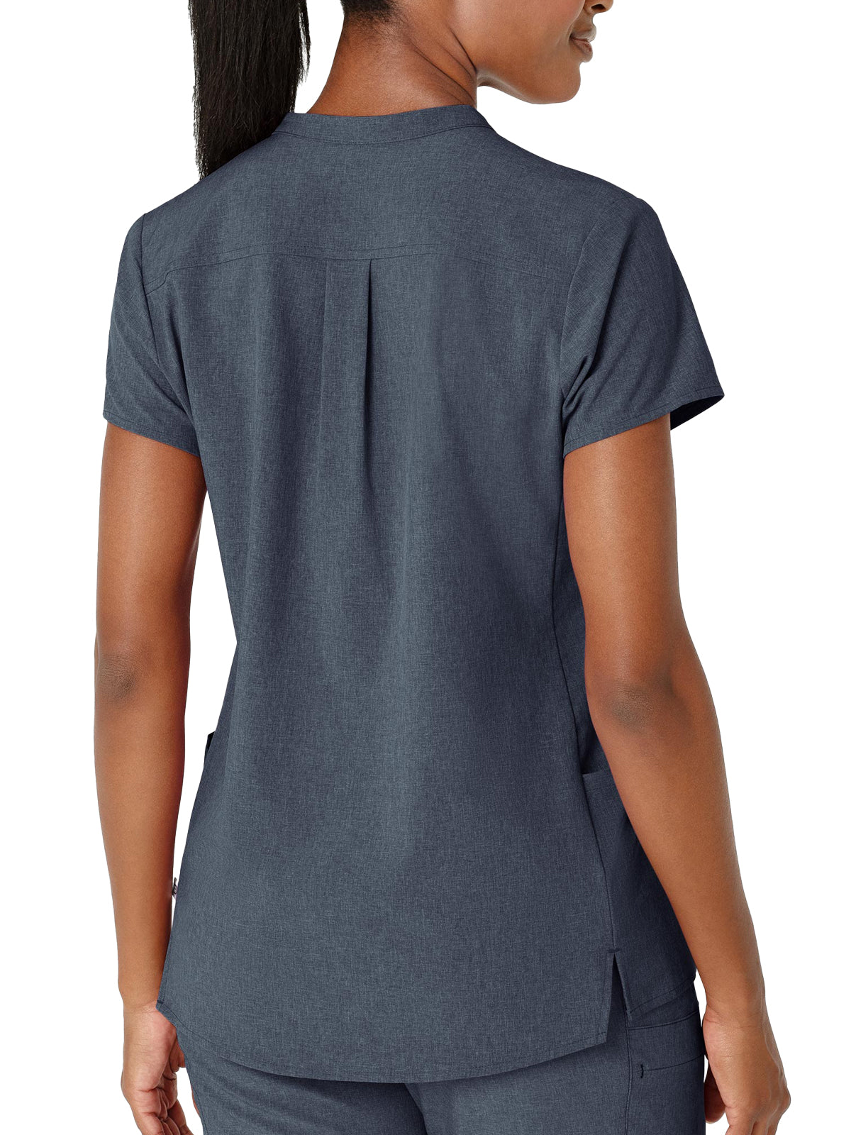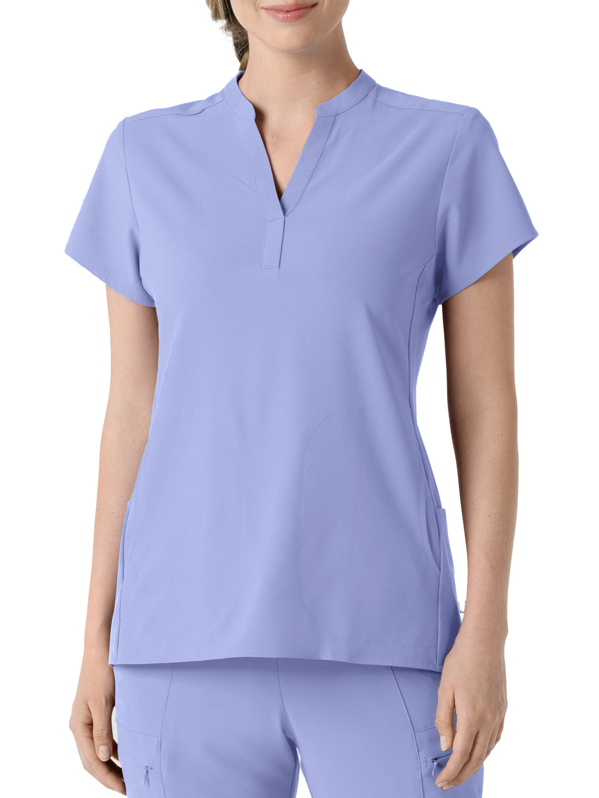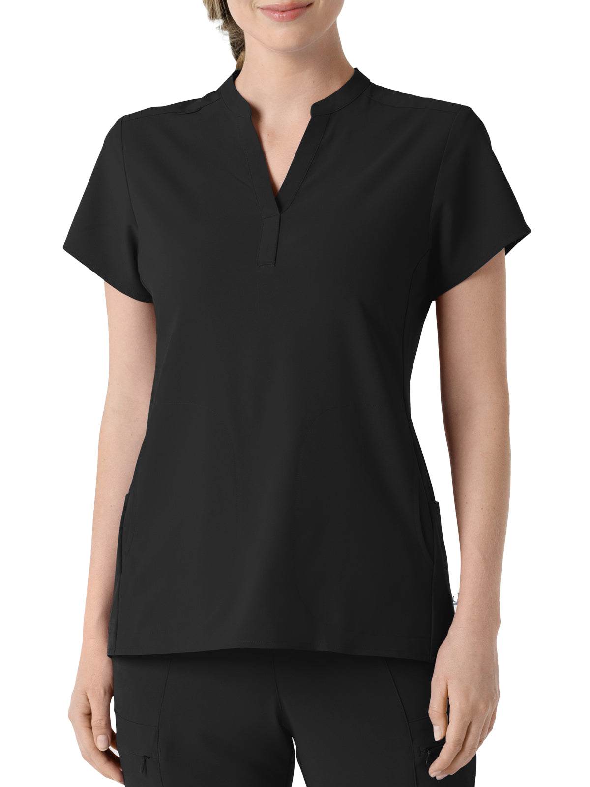 As a care provider, you know that details matter. This women's scrub top is designed with thoughtful touches that make all the difference in simplifying your day. The mandarin collar puts a polished spin on everyday practicality, giving you a professional, stylish look that lasts through long shifts and busy days. Keep your glasses or your badge on a loop on the lower neckline or on another loop right at the shoulder. Tote tools and essentials from room to room with side-entry pockets on the front and top-entry pockets on the side panels. The back yoke with pleats helps give the silhouette shape, and the shirttail with vents makes moving around feel easy and restriction-free. The stretchy fabric moves with you in all the ways you stretch, bend and reach from task to task. It's eco-friendly too, so you're caring for the planet as you're caring for your patients.