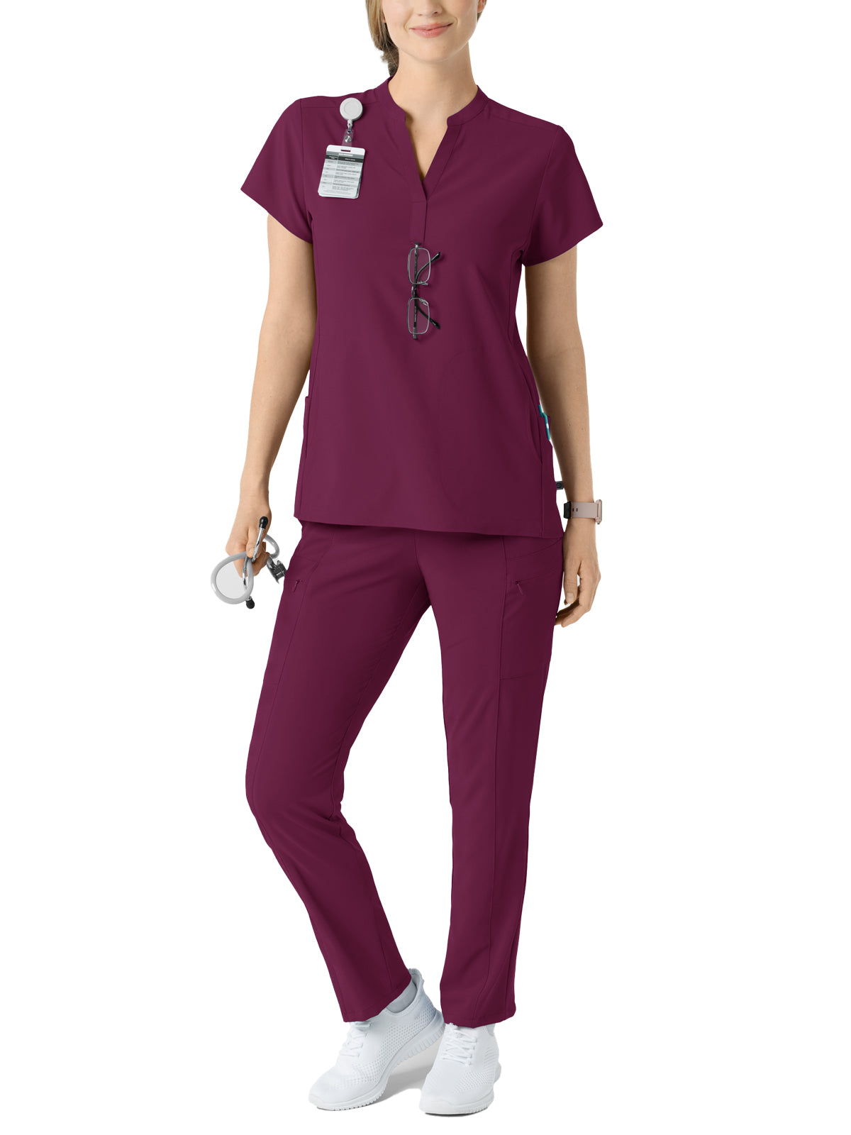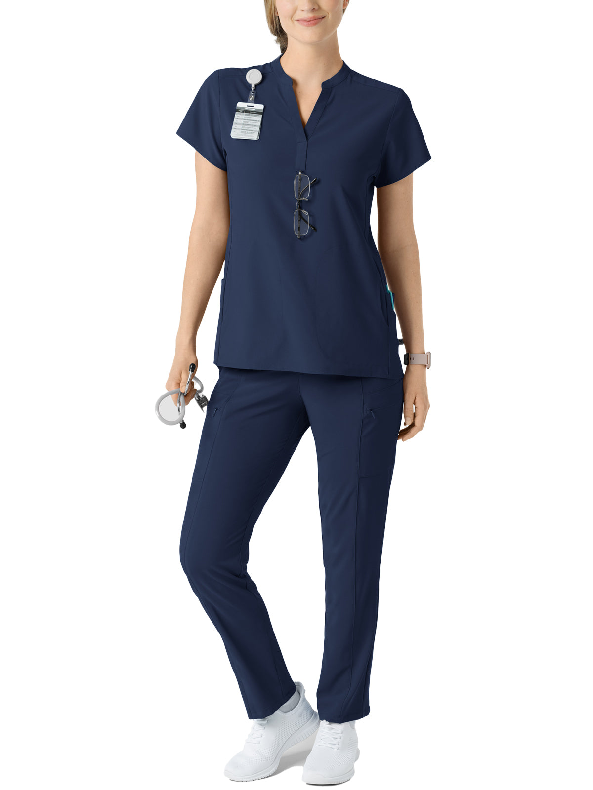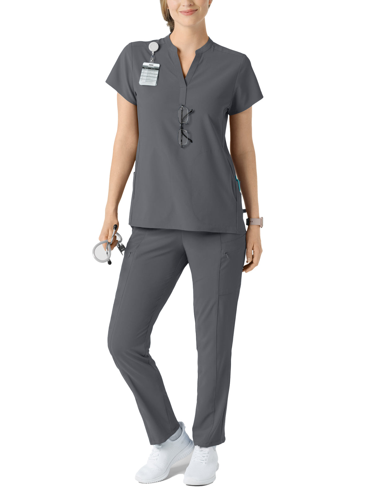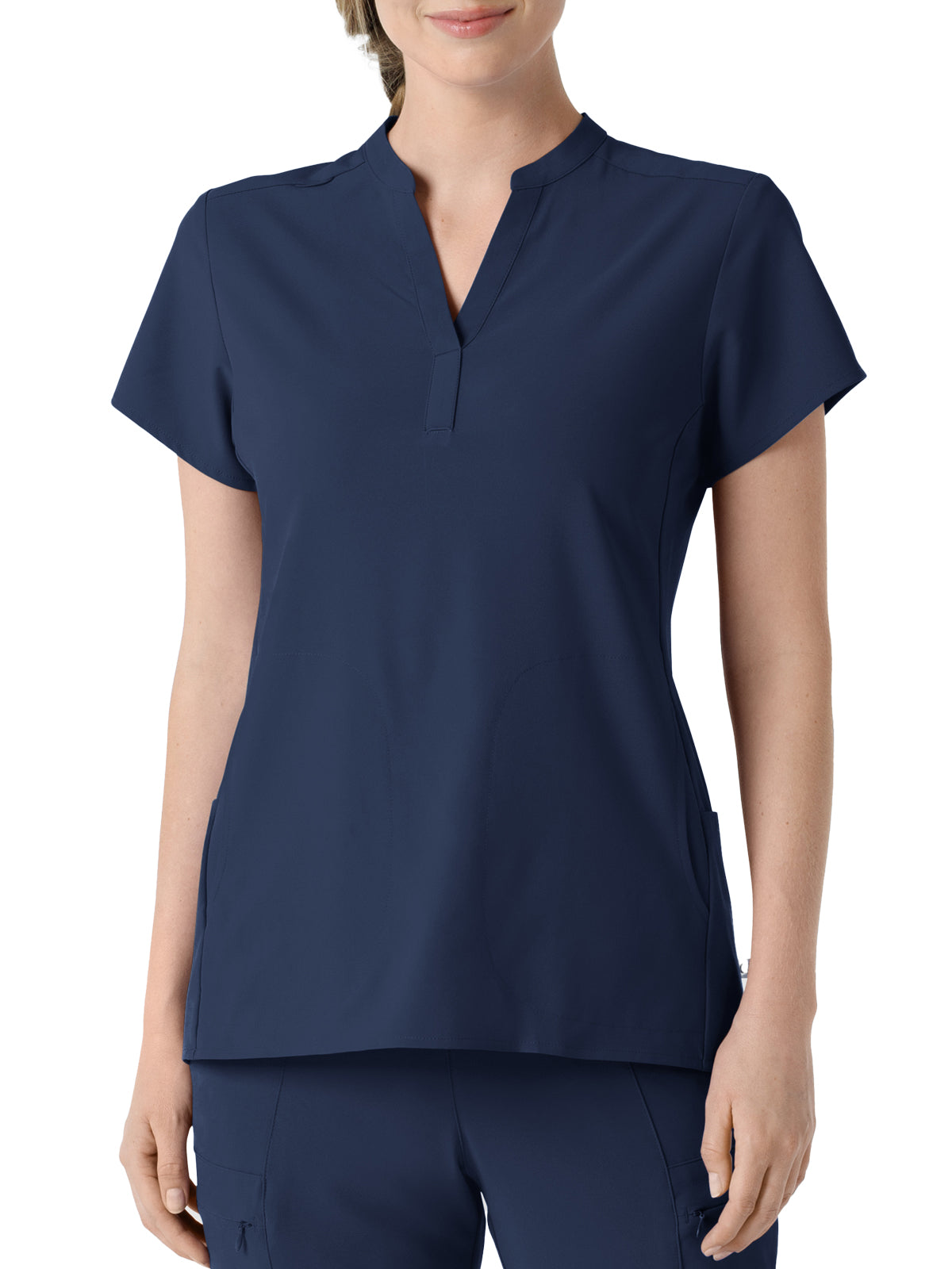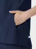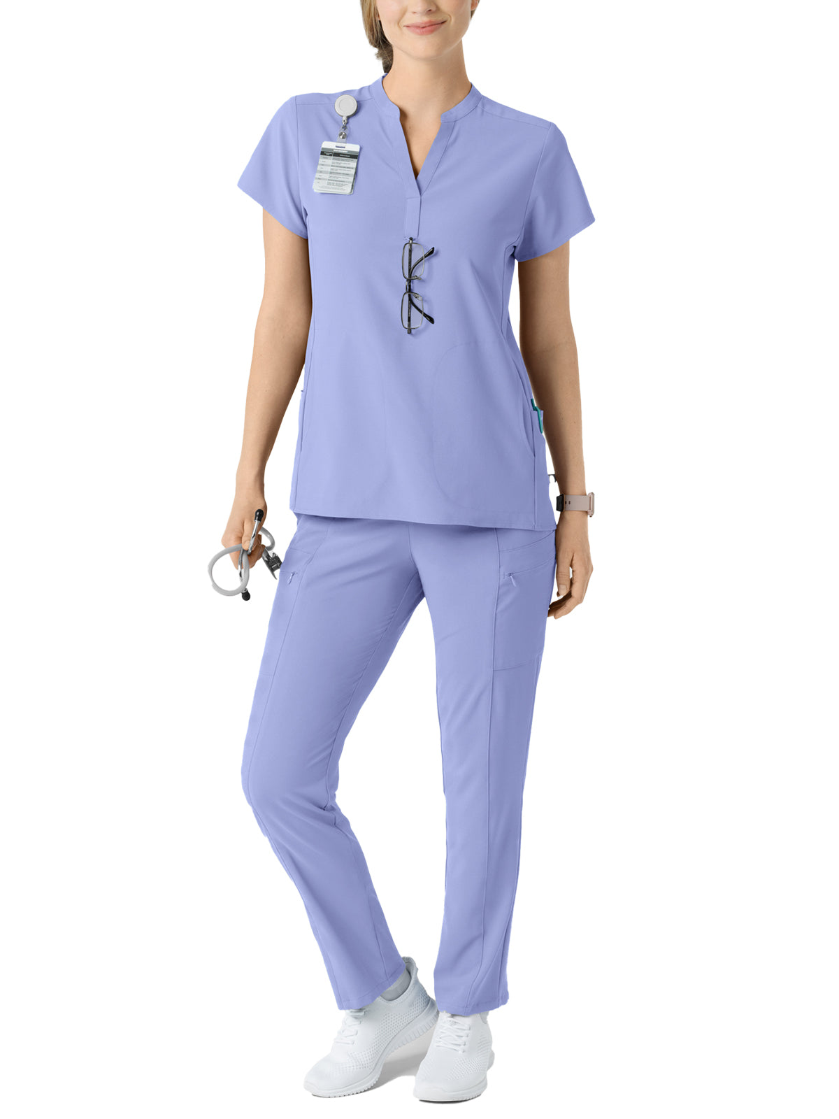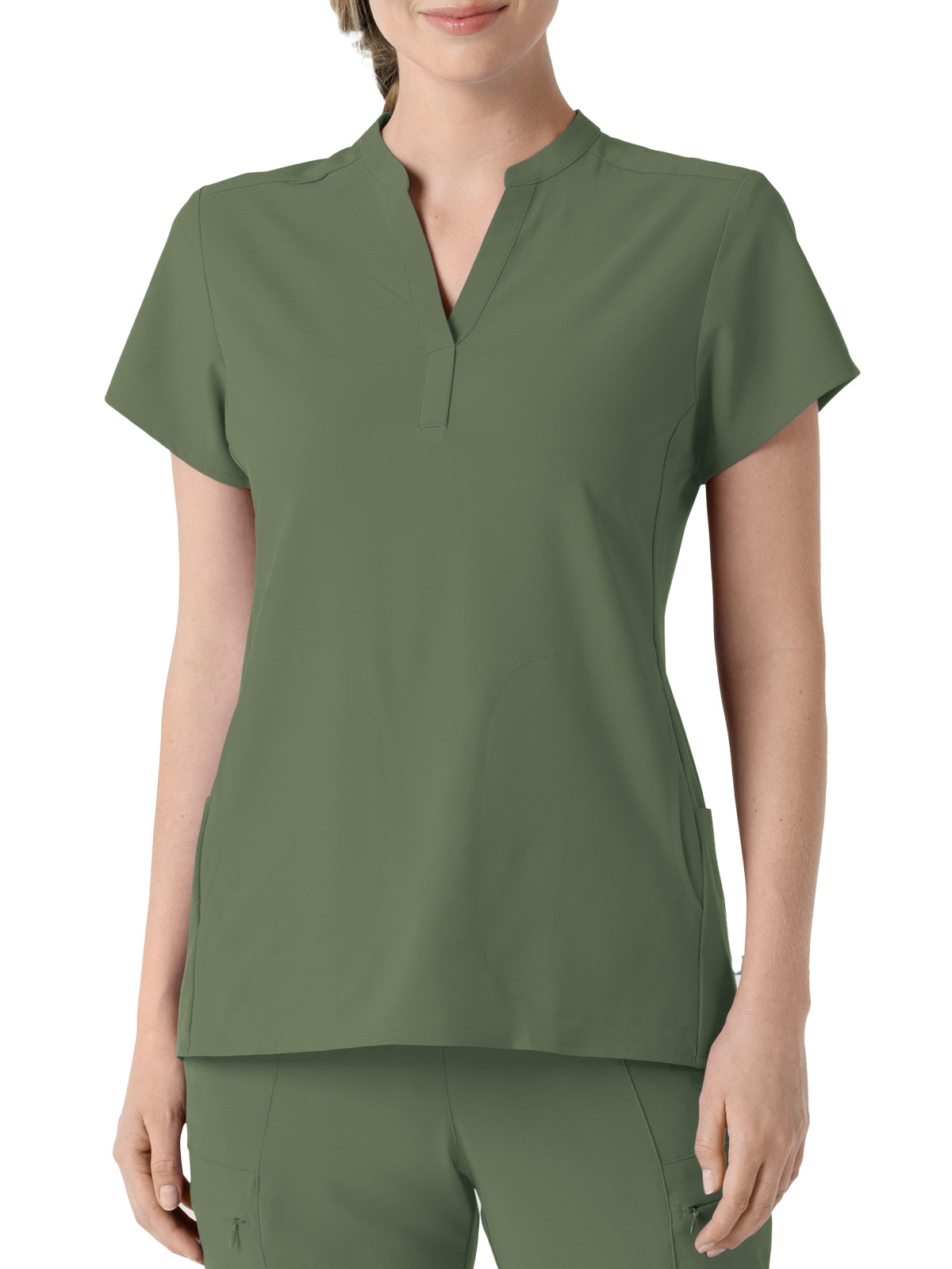As a care provider, you know that details matter. This women's scrub top is designed with thoughtful touches that make all the difference in simplifying your day. The mandarin collar puts a polished spin on everyday practicality, giving you a professional, stylish look that lasts through long shifts and busy days. Keep your glasses or your badge on a loop on the lower neckline or on another loop right at the shoulder. Tote tools and essentials from room to room with side-entry pockets on the front and top-entry pockets on the side panels. The back yoke with pleats helps give the silhouette shape, and the shirttail with vents makes moving around feel easy and restriction-free. The stretchy fabric moves with you in all the ways you stretch, bend and reach from task to task. It's eco-friendly too, so you're caring for the planet as you're caring for your patients.