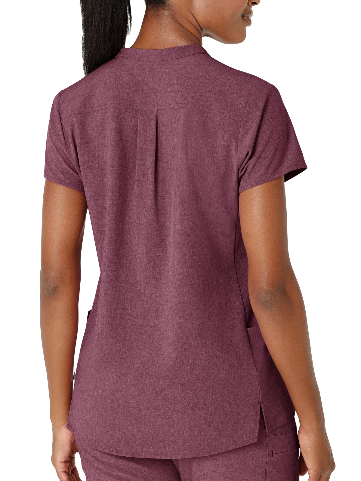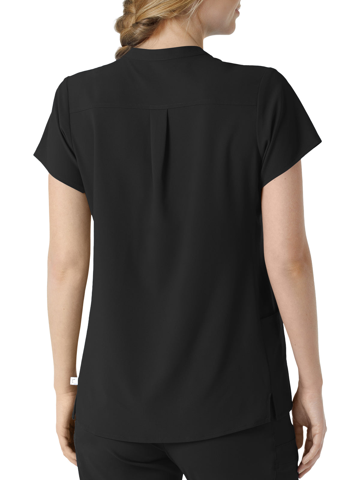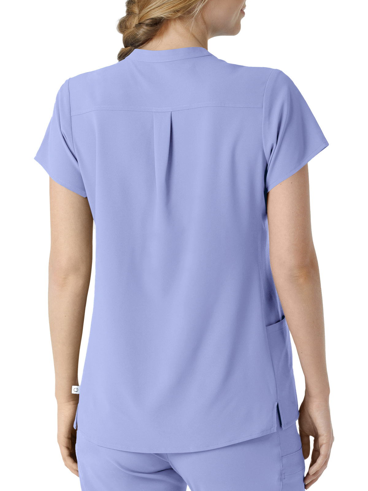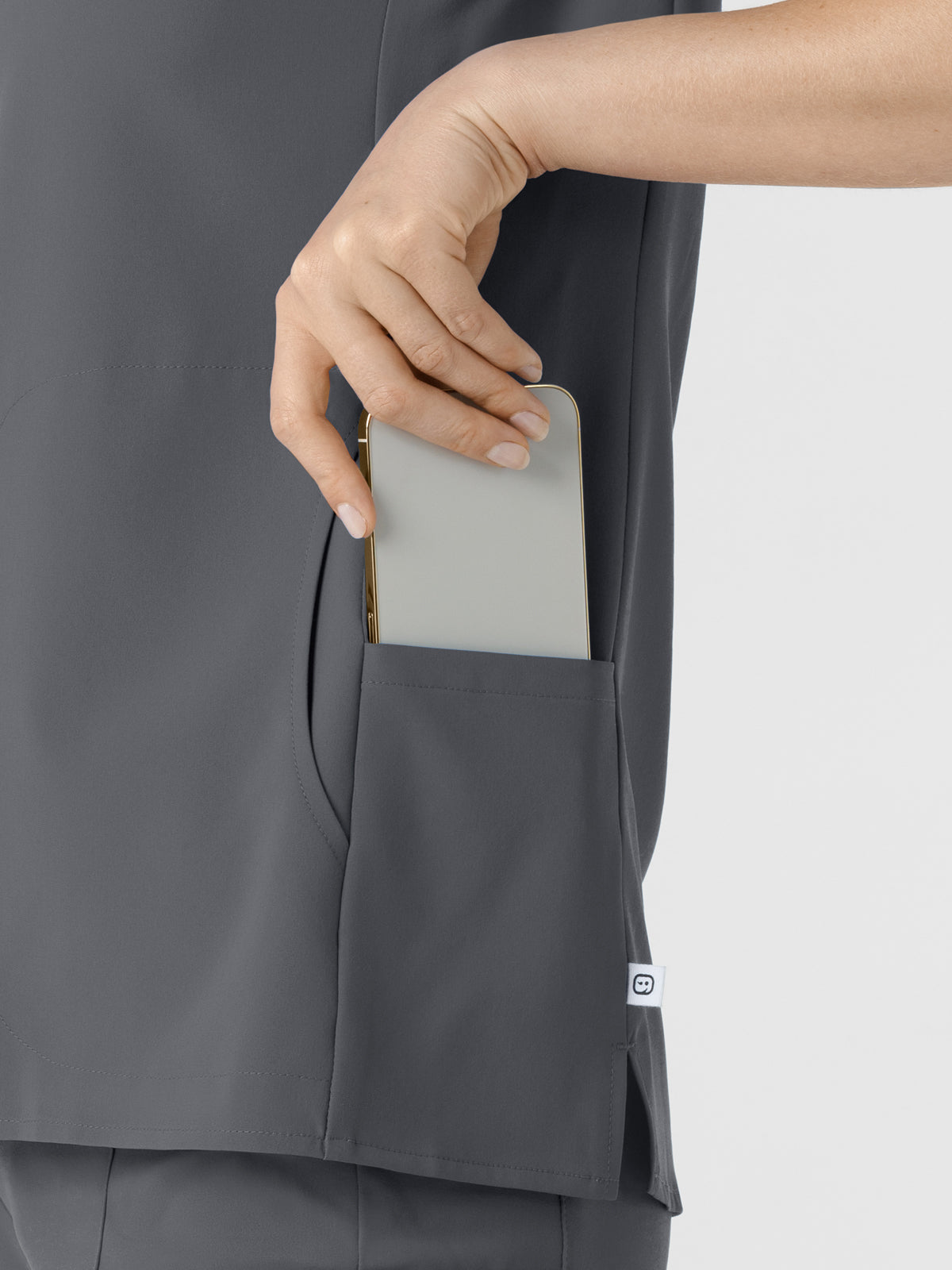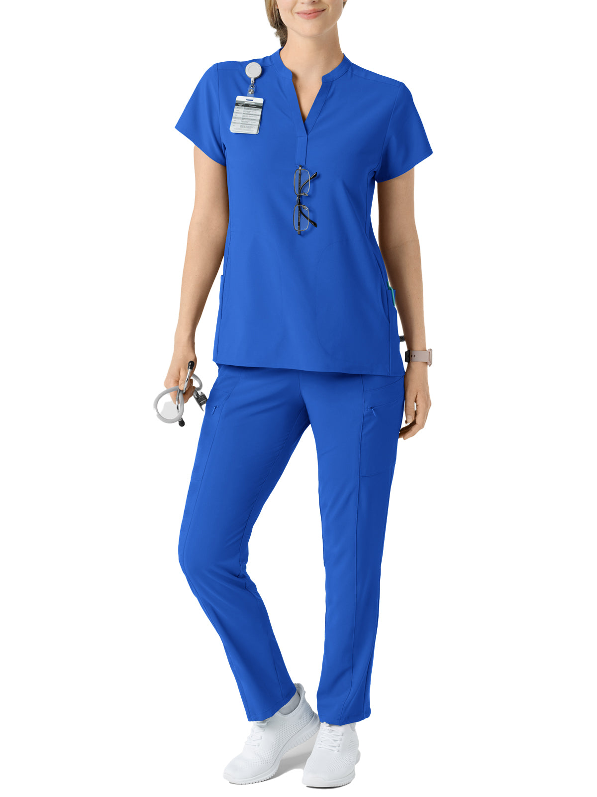 As a care provider, you know that details matter. This women's scrub top is designed with thoughtful touches that make all the difference in simplifying your day. The mandarin collar puts a polished spin on everyday practicality, giving you a professional, stylish look that lasts through long shifts and busy days. Keep your glasses or your badge on a loop on the lower neckline or on another loop right at the shoulder. Tote tools and essentials from room to room with side-entry pockets on the front and top-entry pockets on the side panels. The back yoke with pleats helps give the silhouette shape, and the shirttail with vents makes moving around feel easy and restriction-free. The stretchy fabric moves with you in all the ways you stretch, bend and reach from task to task. It's eco-friendly too, so you're caring for the planet as you're caring for your patients.