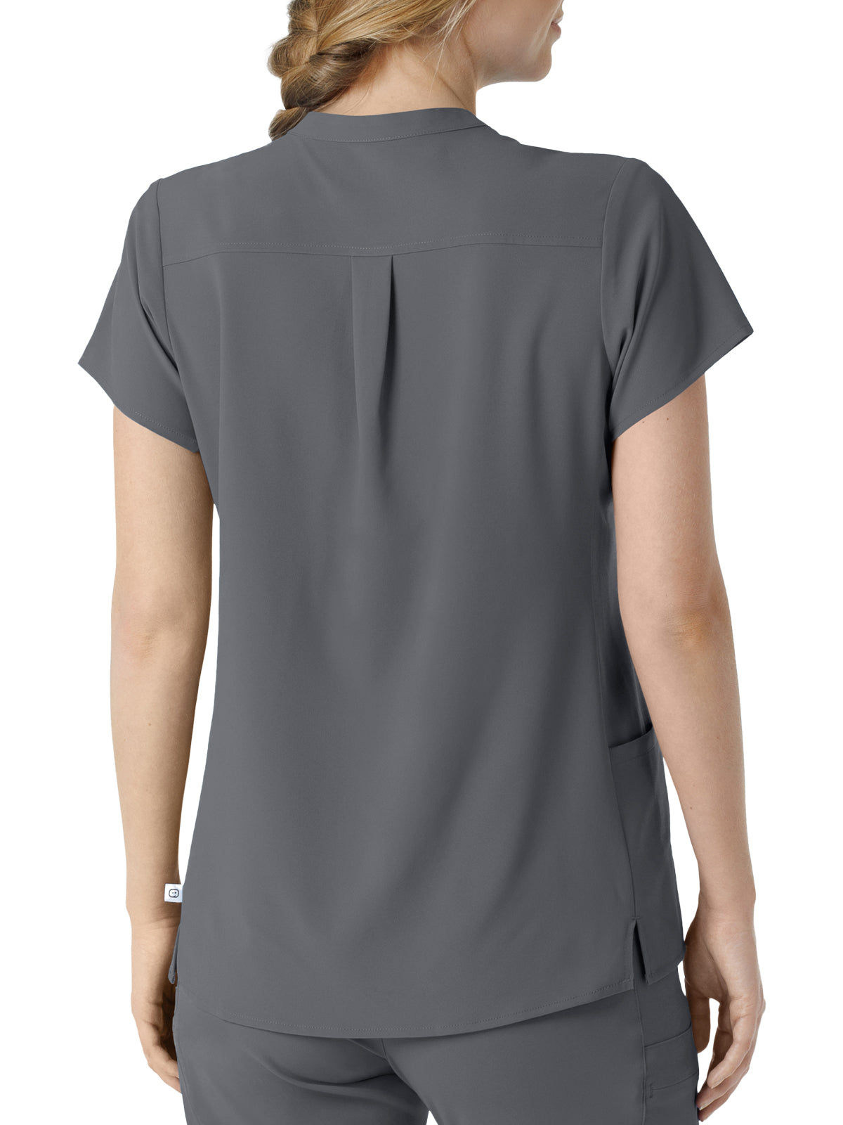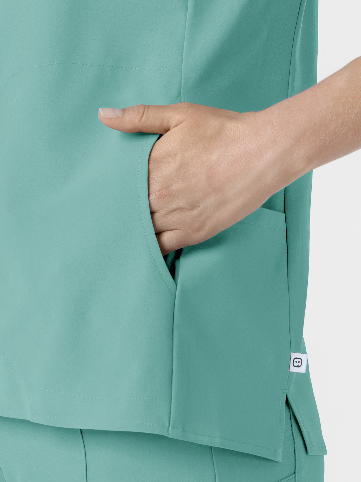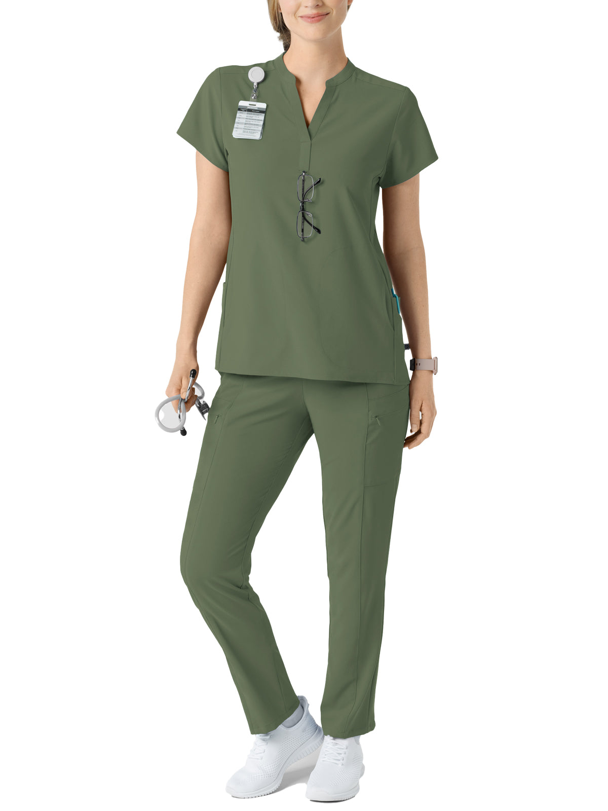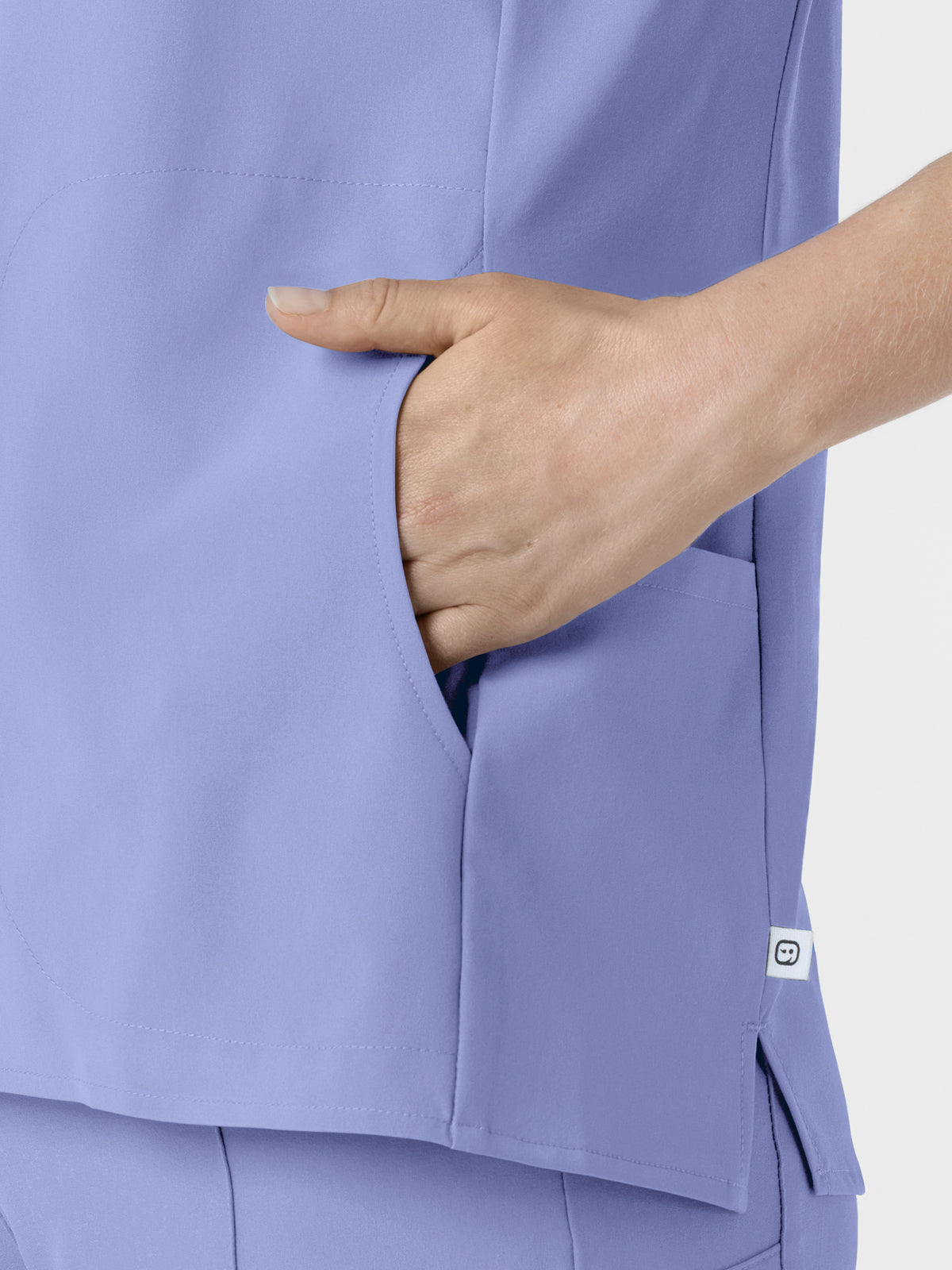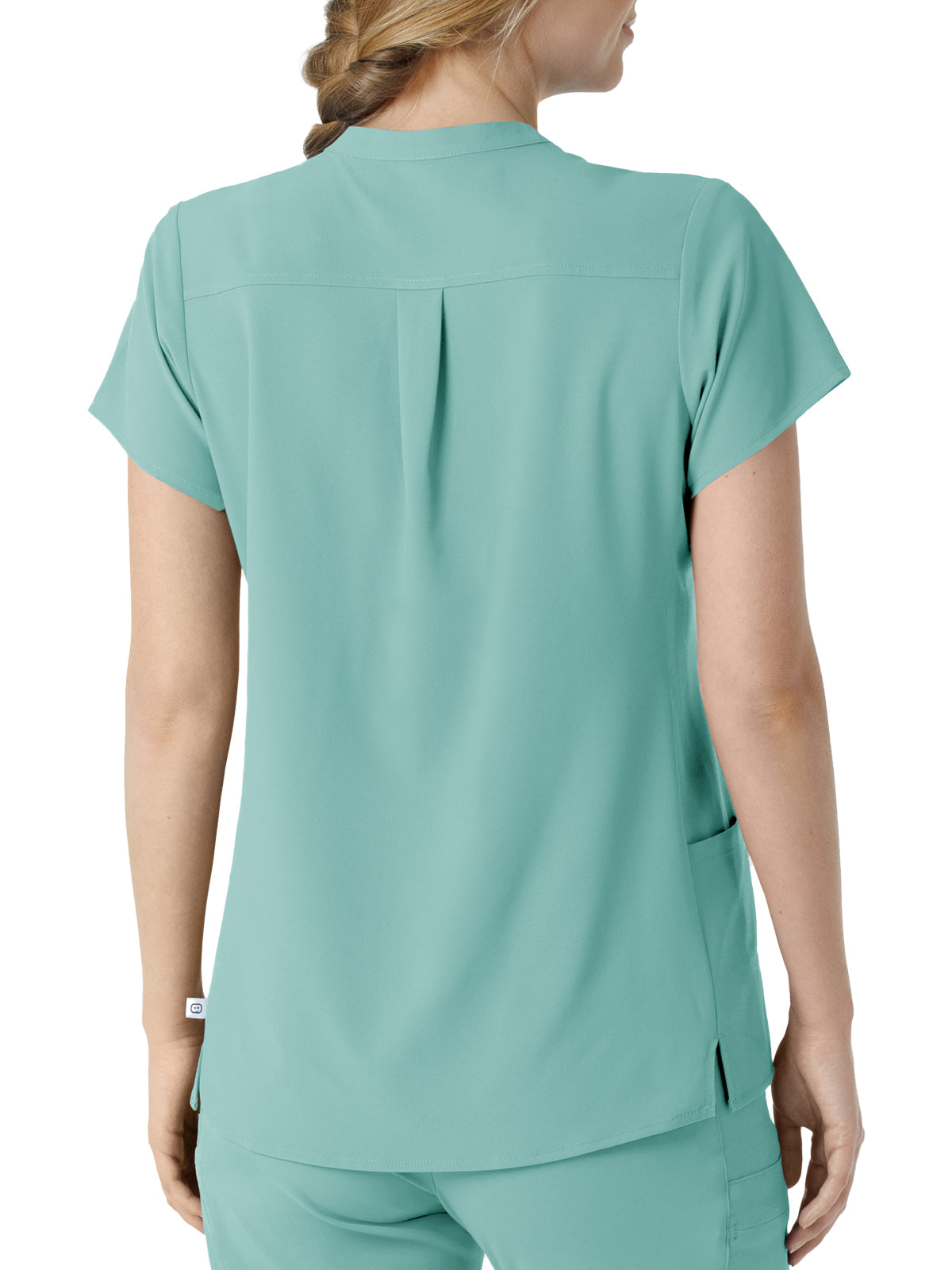 As a care provider, you know that details matter. This women's scrub top is designed with thoughtful touches that make all the difference in simplifying your day. The mandarin collar puts a polished spin on everyday practicality, giving you a professional, stylish look that lasts through long shifts and busy days. Keep your glasses or your badge on a loop on the lower neckline or on another loop right at the shoulder. Tote tools and essentials from room to room with side-entry pockets on the front and top-entry pockets on the side panels. The back yoke with pleats helps give the silhouette shape, and the shirttail with vents makes moving around feel easy and restriction-free. The stretchy fabric moves with you in all the ways you stretch, bend and reach from task to task. It's eco-friendly too, so you're caring for the planet as you're caring for your patients.