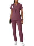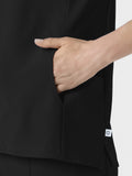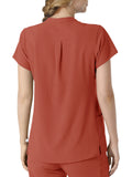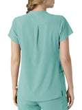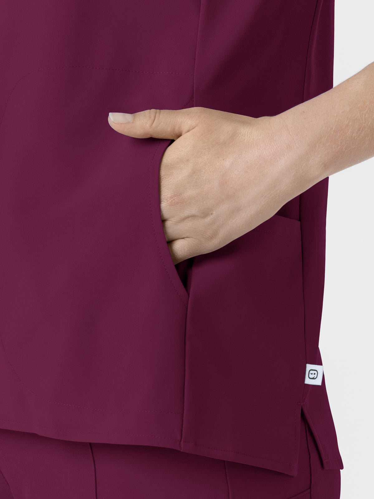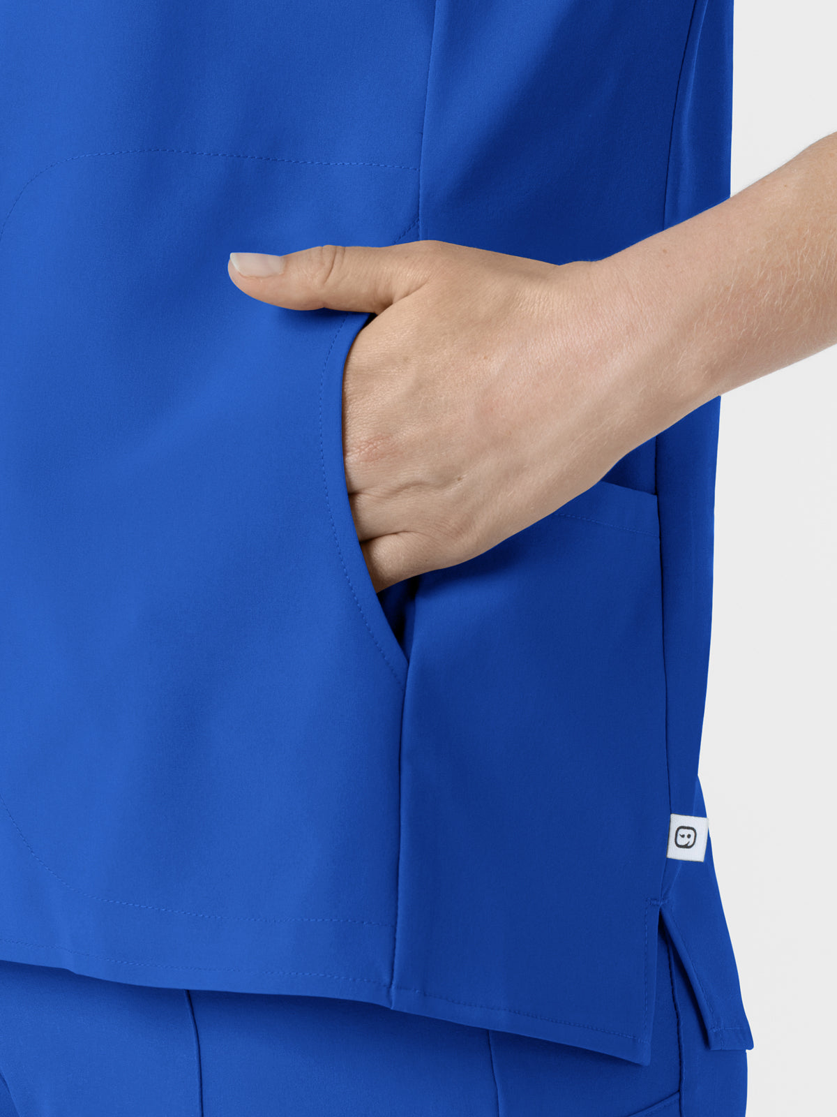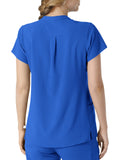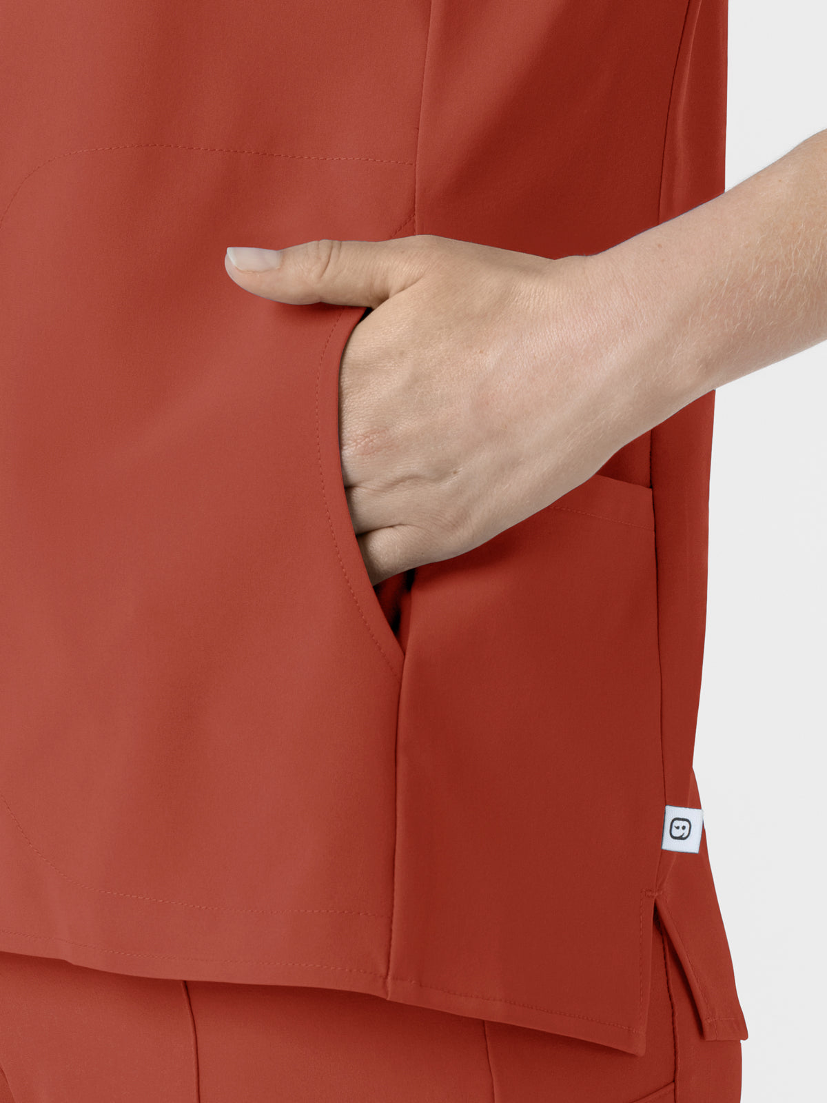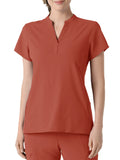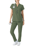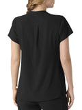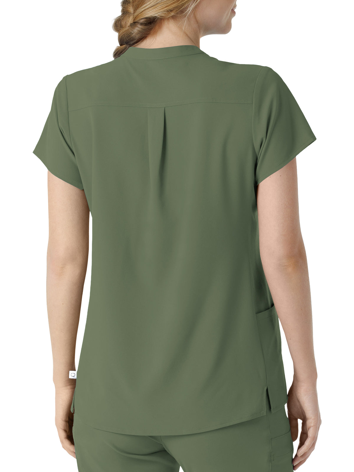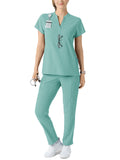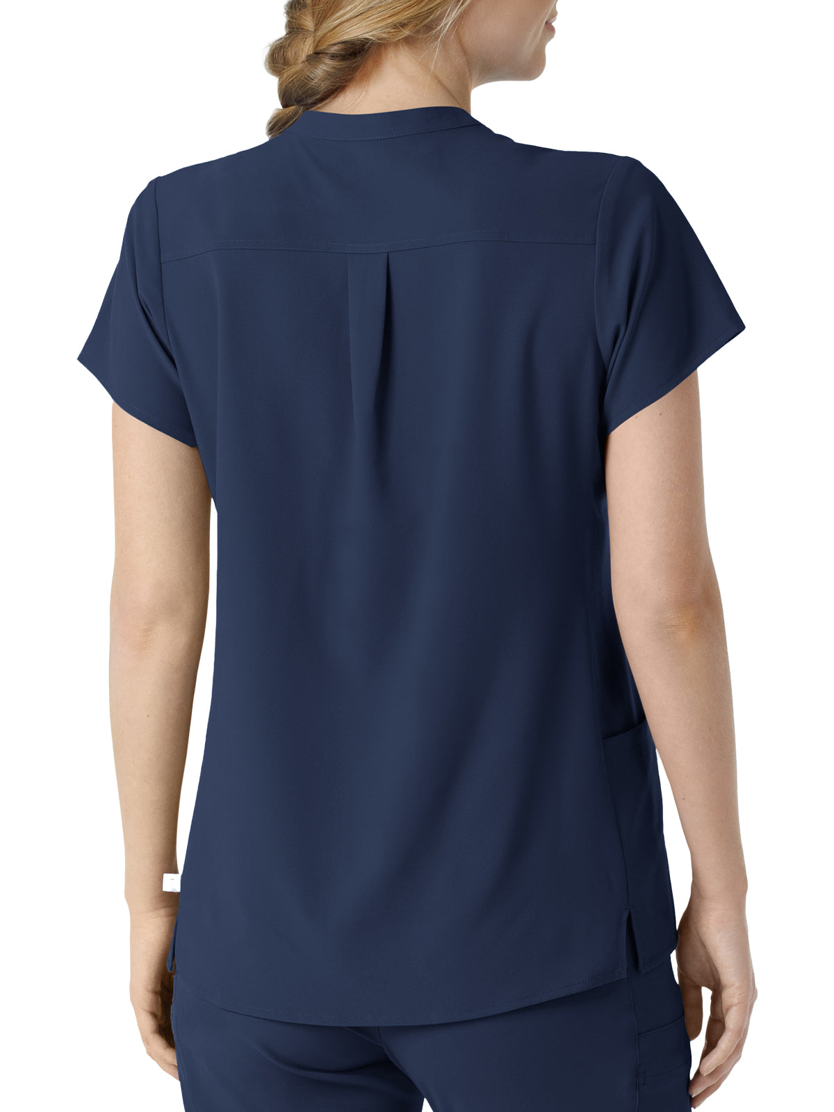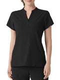 As a care provider, you know that details matter. This women's scrub top is designed with thoughtful touches that make all the difference in simplifying your day. The mandarin collar puts a polished spin on everyday practicality, giving you a professional, stylish look that lasts through long shifts and busy days. Keep your glasses or your badge on a loop on the lower neckline or on another loop right at the shoulder. Tote tools and essentials from room to room with side-entry pockets on the front and top-entry pockets on the side panels. The back yoke with pleats helps give the silhouette shape, and the shirttail with vents makes moving around feel easy and restriction-free. The stretchy fabric moves with you in all the ways you stretch, bend and reach from task to task. It's eco-friendly too, so you're caring for the planet as you're caring for your patients.