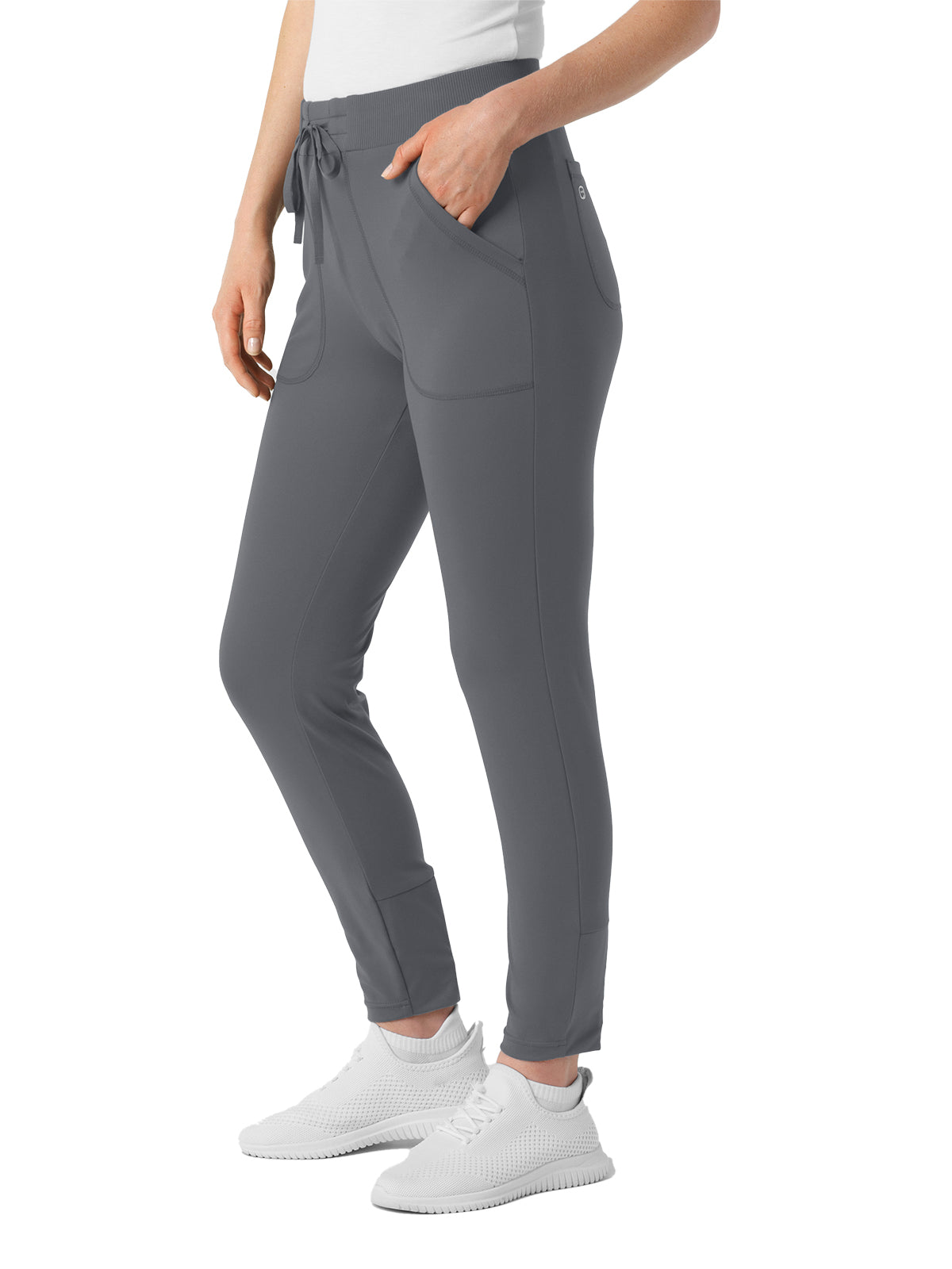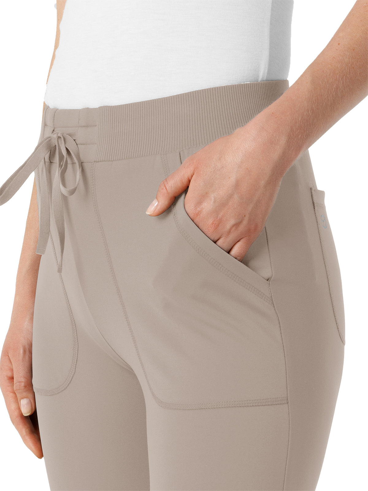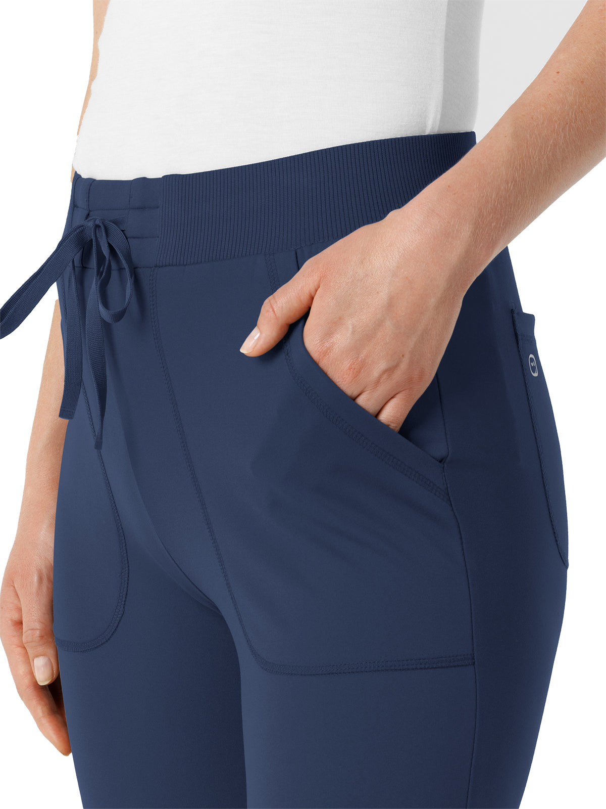 Bring sport-inspired style to your hard-working shifts with these women's knit track scrub pants. They're designed with thoughtful details so you can get just the right fit, like the drawstring-adjustable waist and adjustable back legs that give you more freedom of movement with every stride. Two front pockets and two back pockets take care of must-have tools and supplies as you make your way through busy appointments. One more pocket on the side zips shut for a secure place to store smaller essentials you'd prefer to keep close. These scrubs are built from a soft and stretchy material that's sustainably made, letting you feel good about what you wear to work every day. The modern athletic fit stays close to you with a fresh silhouette that invites versatility in style. The partially ribbed waist is soft and forgiving, and it never digs in whether you're bending down or leaning over.