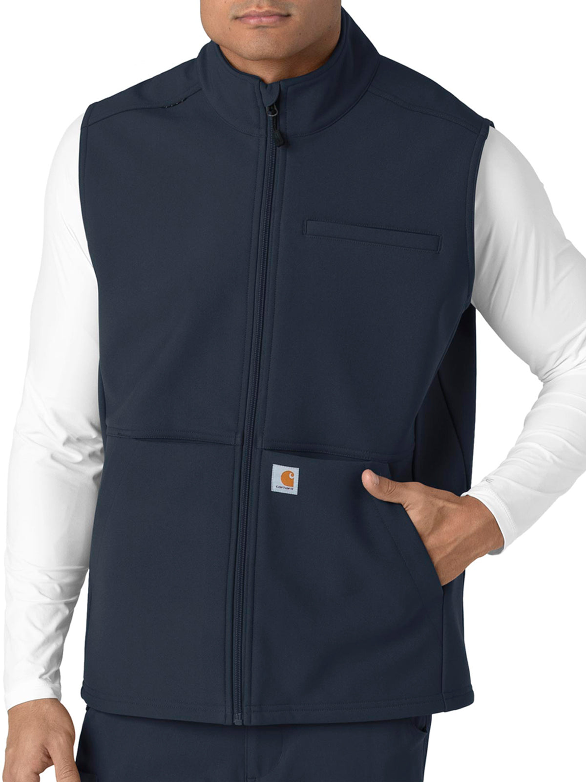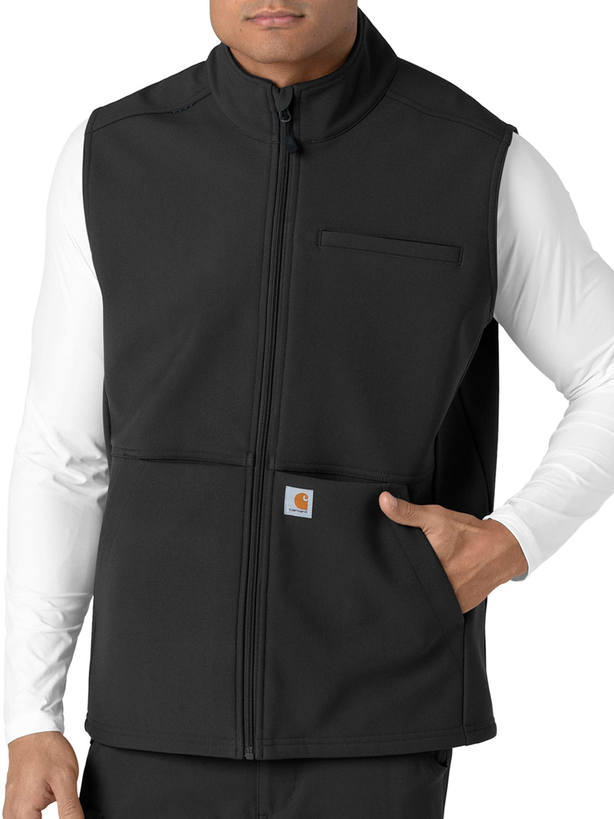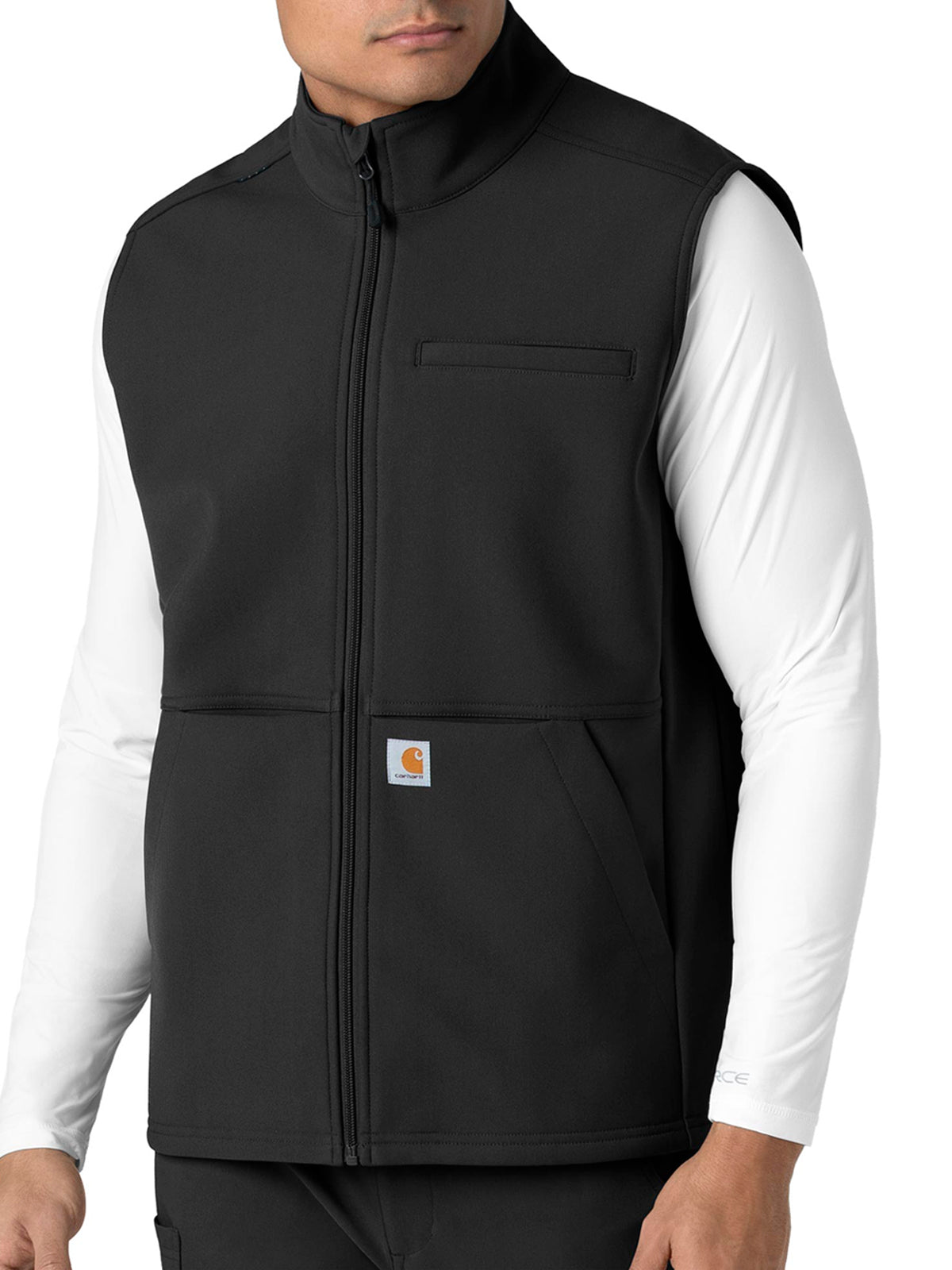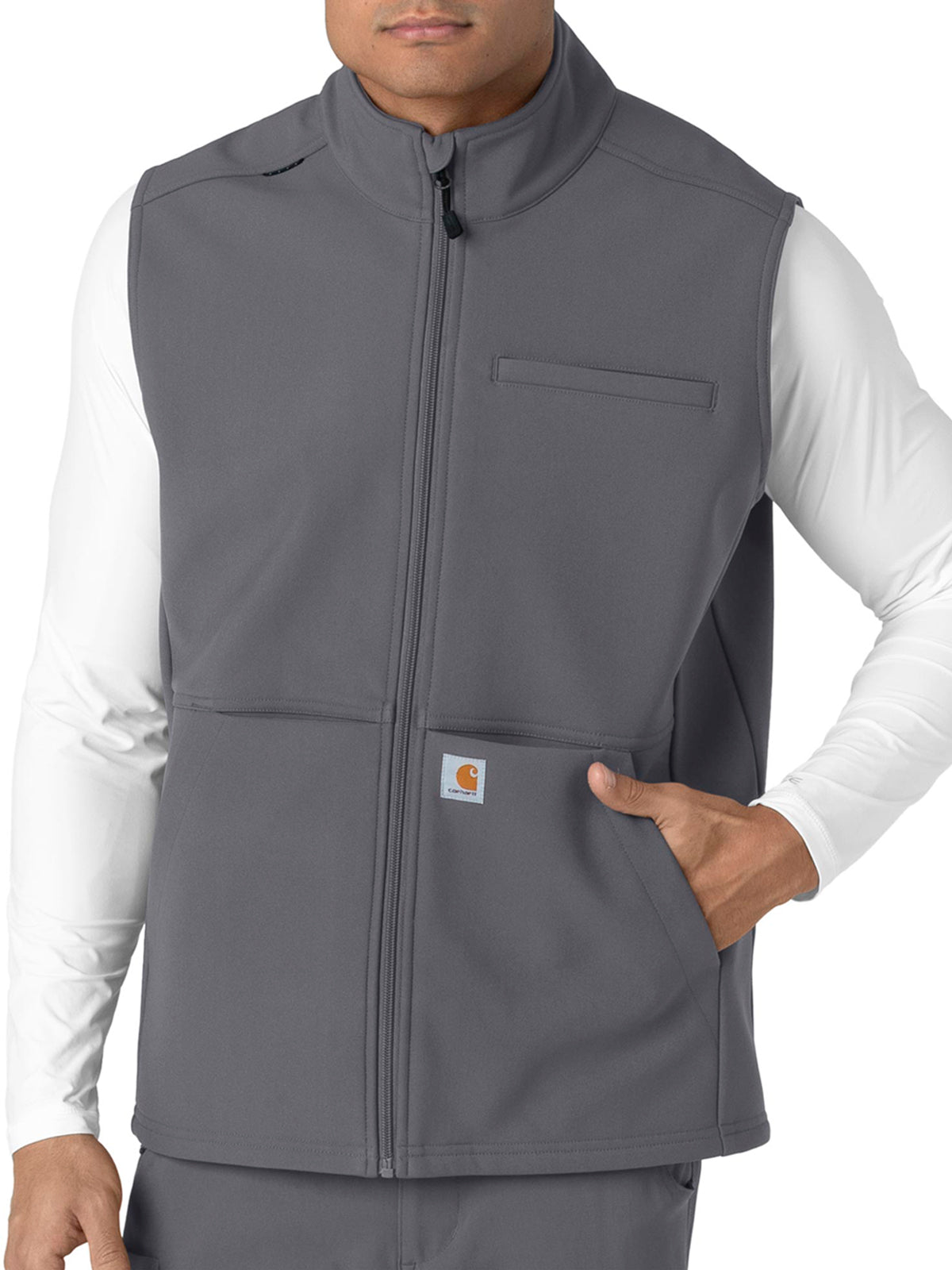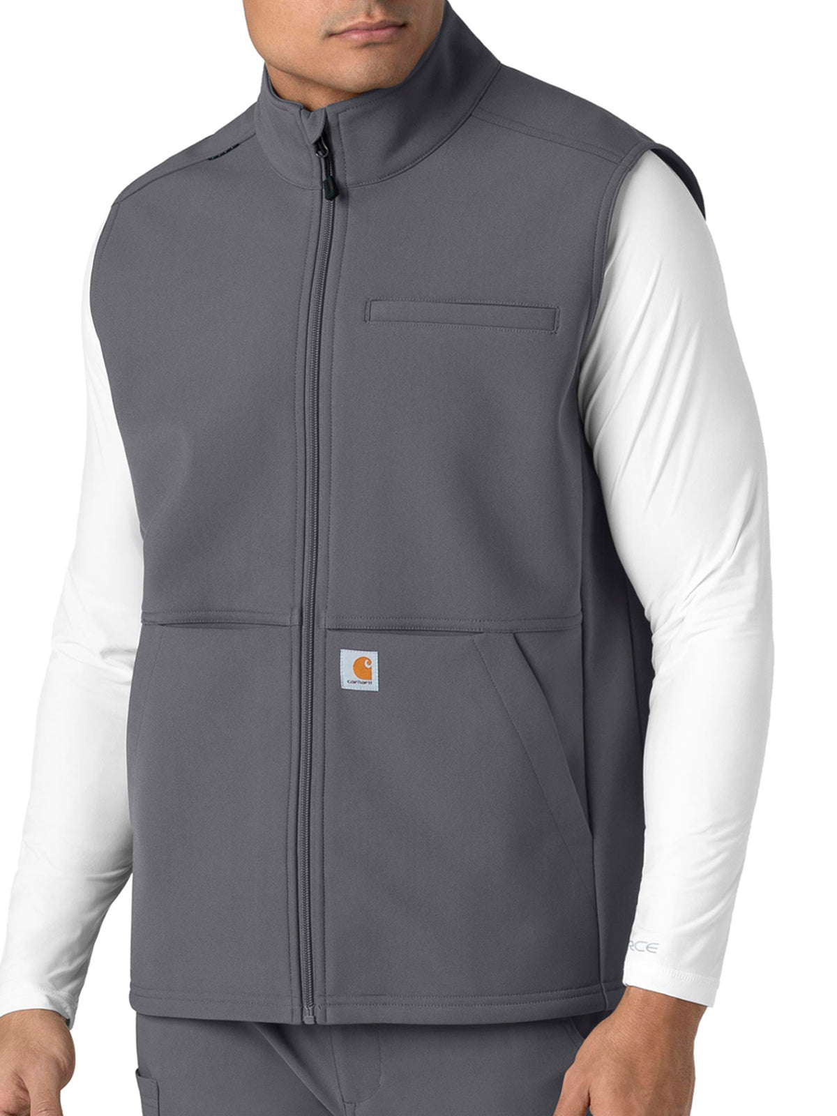 Introducing your go-to essential for in-between seasons and chilly weather. Capitalizing on versatility, this men's vest is the perfect layer that surrounds you with cozy comfort in a durable bonded fleece material. The full-zip front lets you add breathability when you want it and more warmth when you don't. Your badge will stay on full display thanks to a loop at the shoulder. A zip-shut chest pocket makes sure smaller items stay in place, while deep patch pockets on the front offer a spacious place to hold essentials. An internal pocket is perfect for things you want to keep out of the way, like your phone or your glasses. The silhouette is finished with a curve in the back, extending the hem slightly for confident coverage. Durable yet lightweight, this vest wicks away moisture to keep you dry and releases soil for a fresh look and feel, shift after shift. It's made with Rugged Flex™ stretch technology that moves with you in any situation. Snag and spill-resistant, it has a soft, broken-in feel that handles your day with ease.