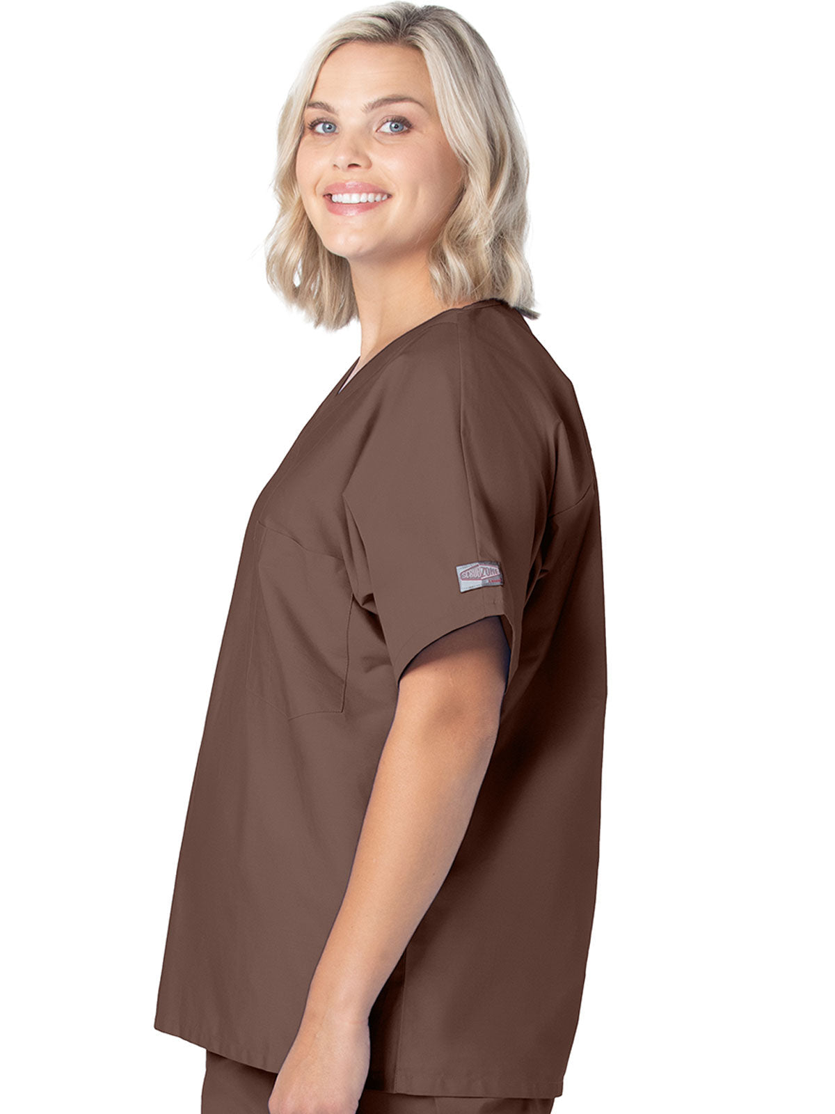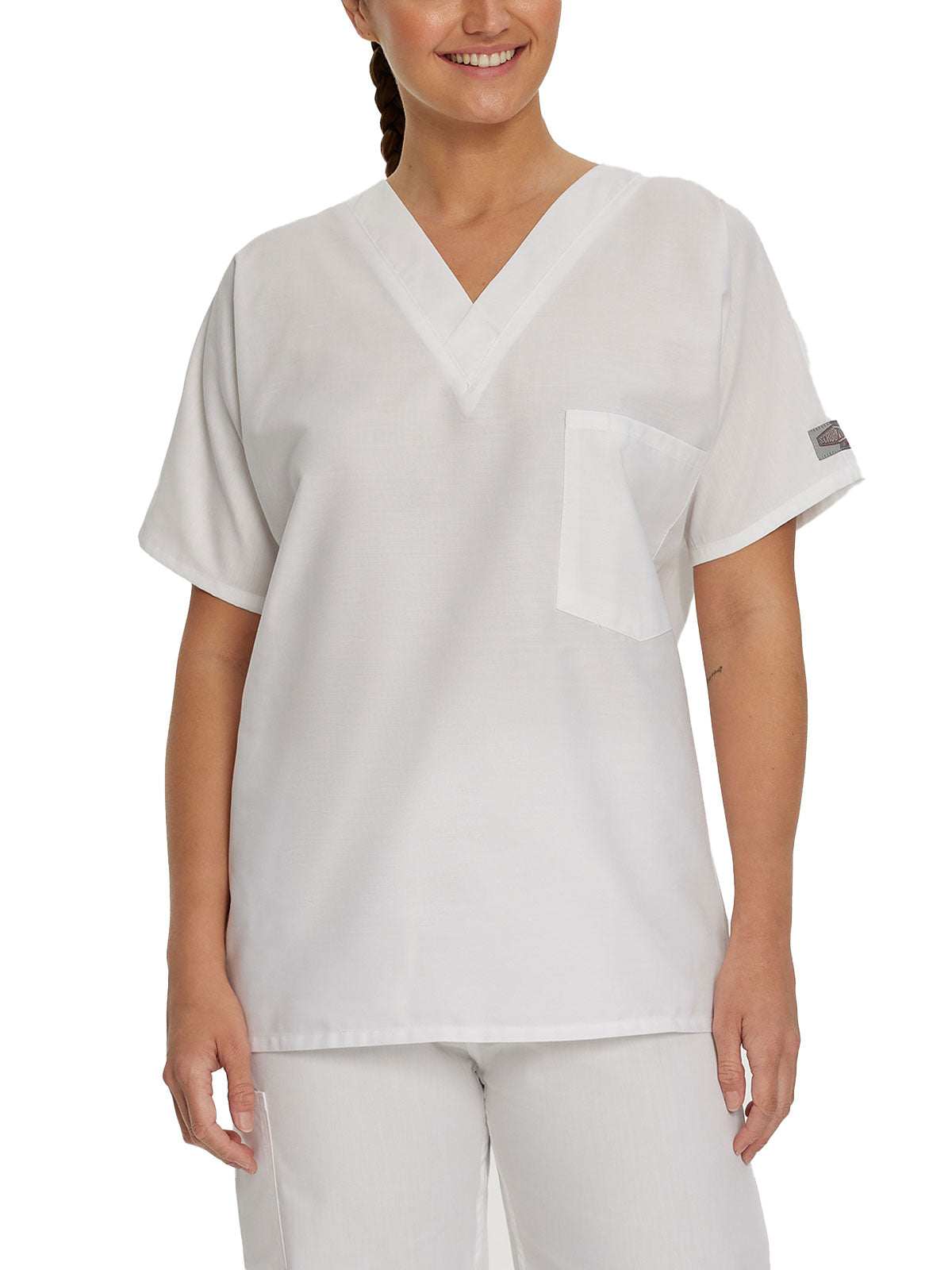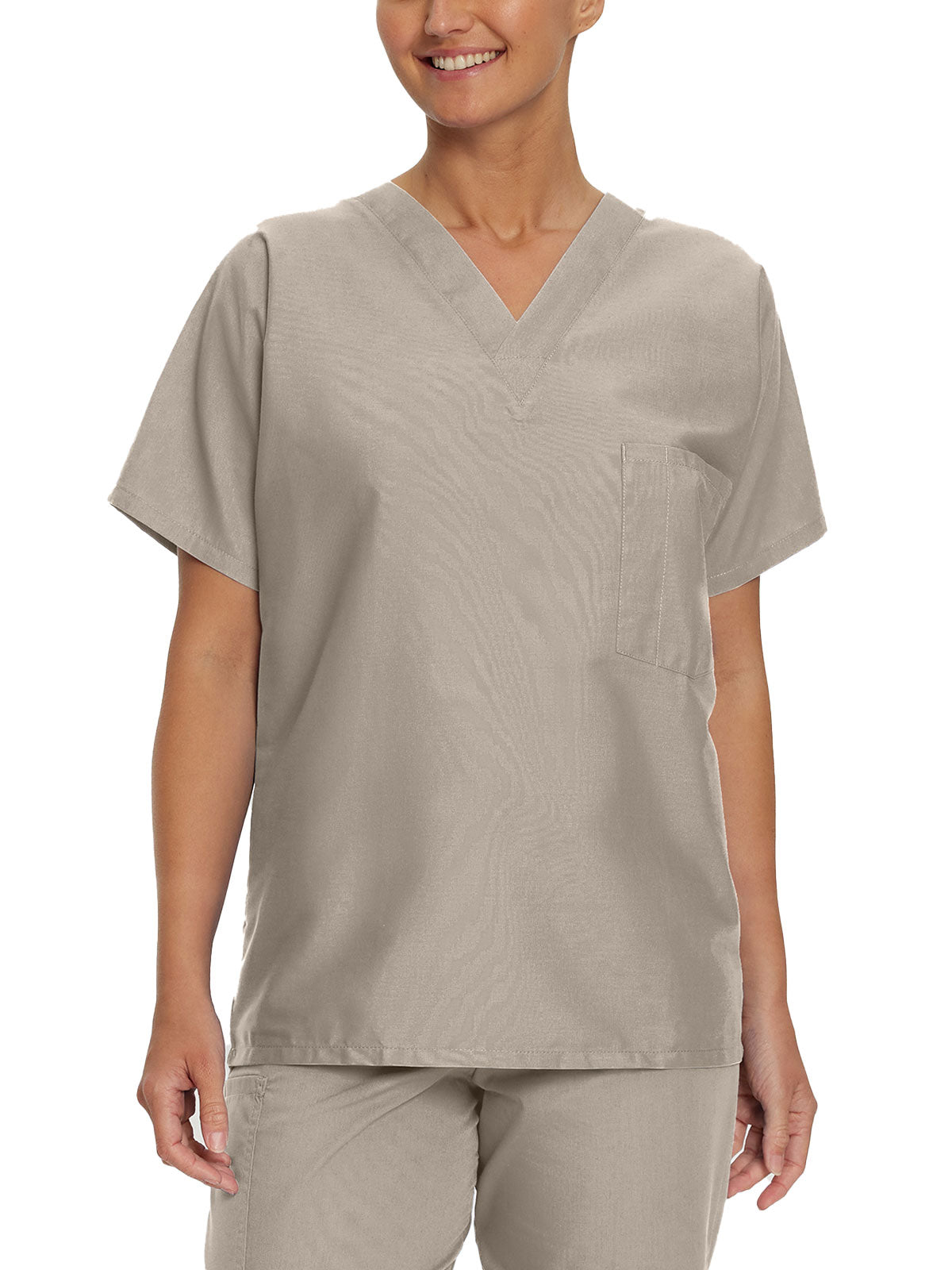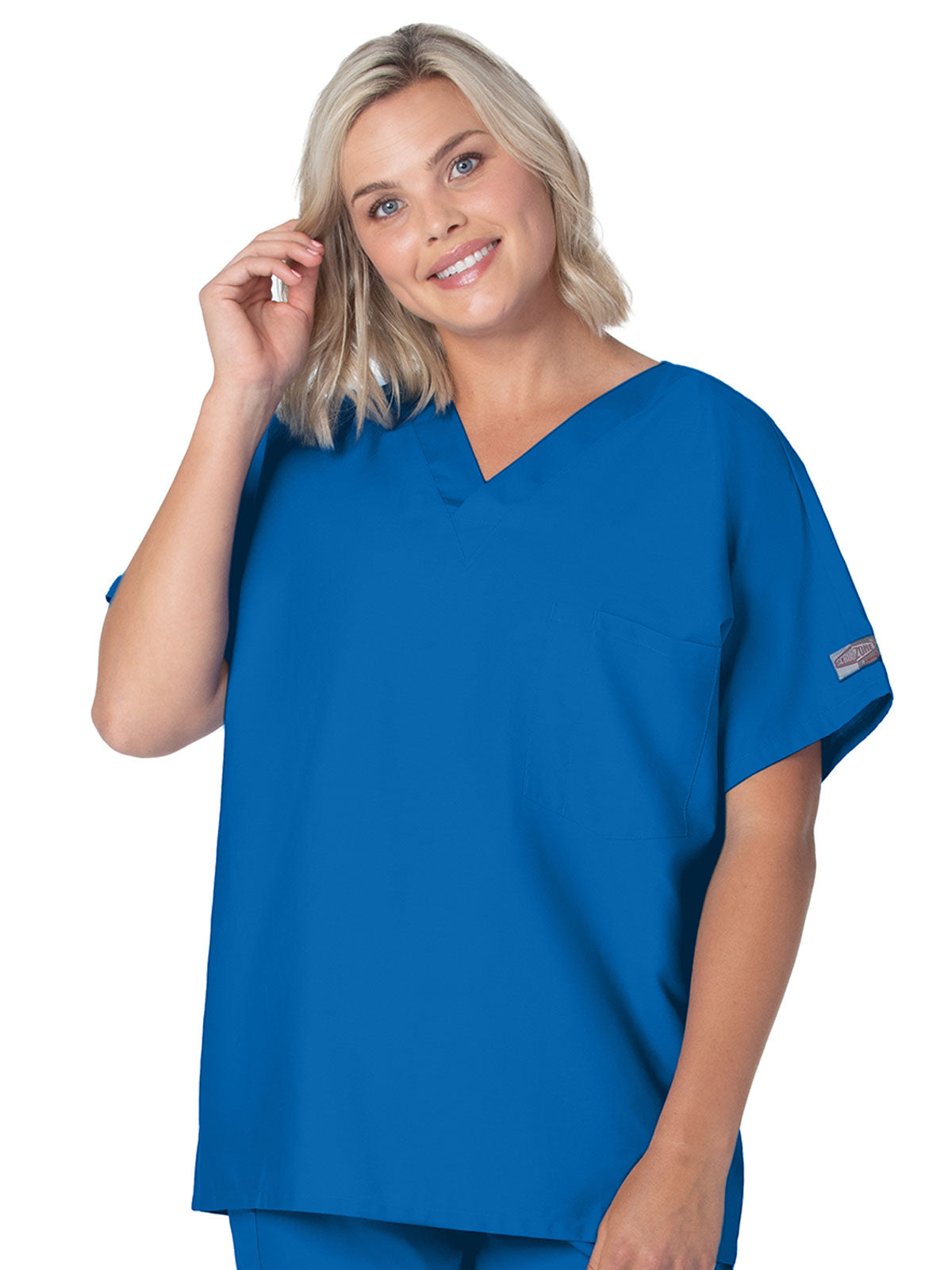 Scrub Zone scrubs work tough, fit comfortably and offer extraordinary value. This V-neck unisex scrub top has dolman sleeves, back yoke and chest pocket with pencil division.