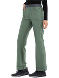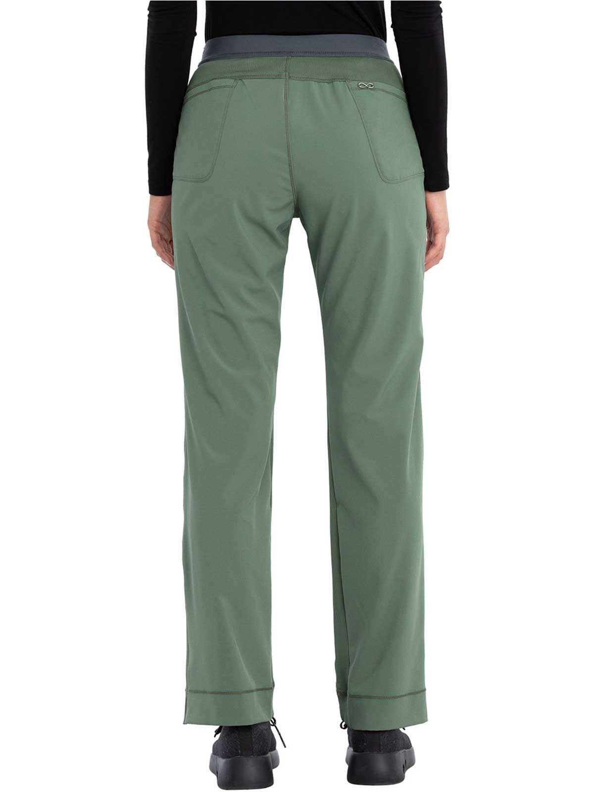 A Contemporary fit, low rise, slim pant features a soft elastic waistband, front patch pockets and a mock fly. Also featured is a back yoke and inseam inset in stretch rib knit for added comfort, two back pockets and side vents. Cover-stitch detail throughout. Inseam length: 28 1/2". The comfortable stretch poplin fabric and super stretchy rib knit is the perfect combo for healthcare professionals.