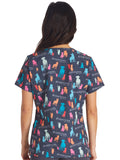 This V-neck printed top boasts front neck piping, bust darts, two front patch pockets, and an additional interior pocket on the wearer's right. Additionally, it includes side vents for enhanced comfort and mobility. Center back length: 26".
