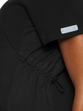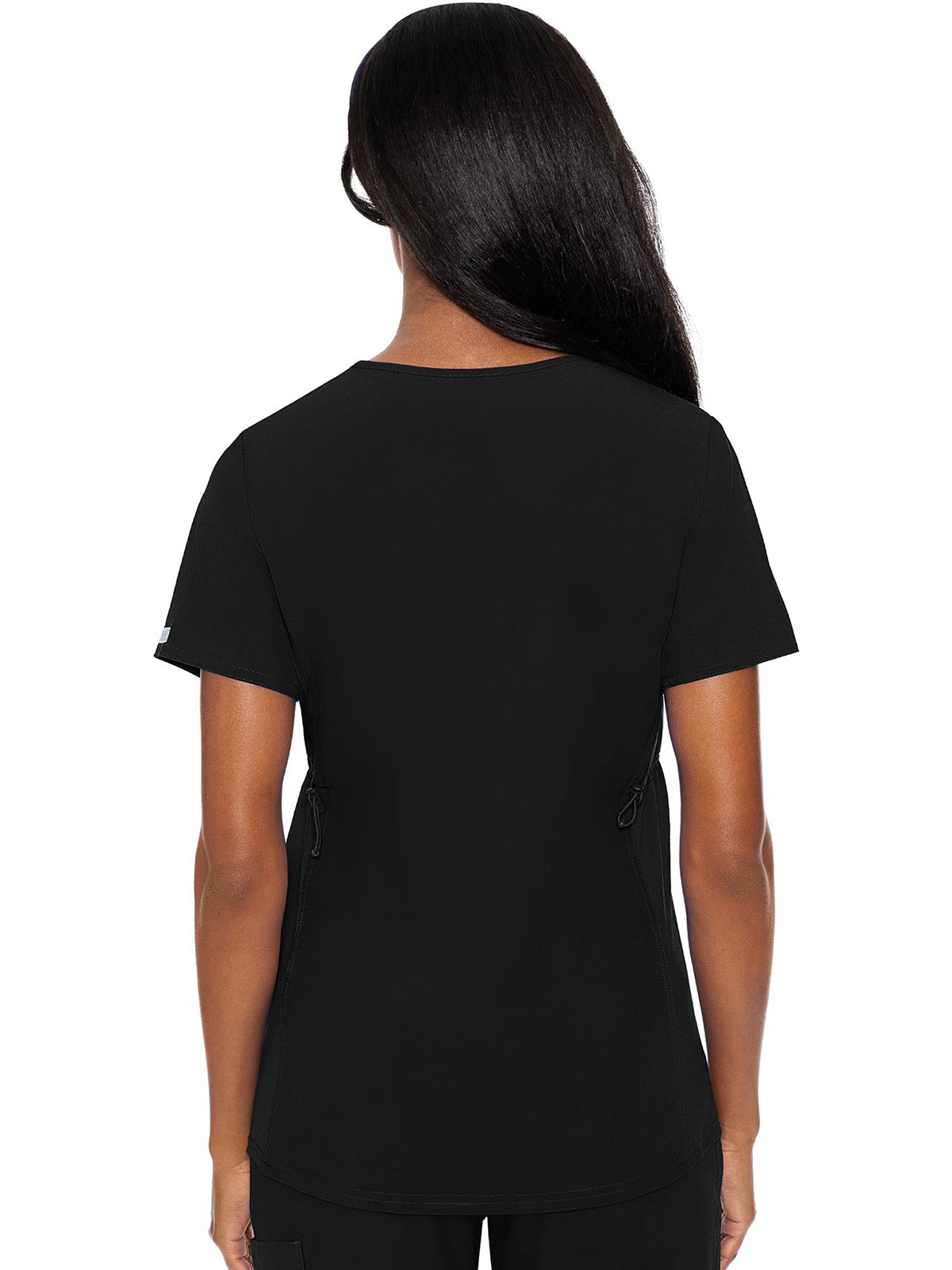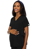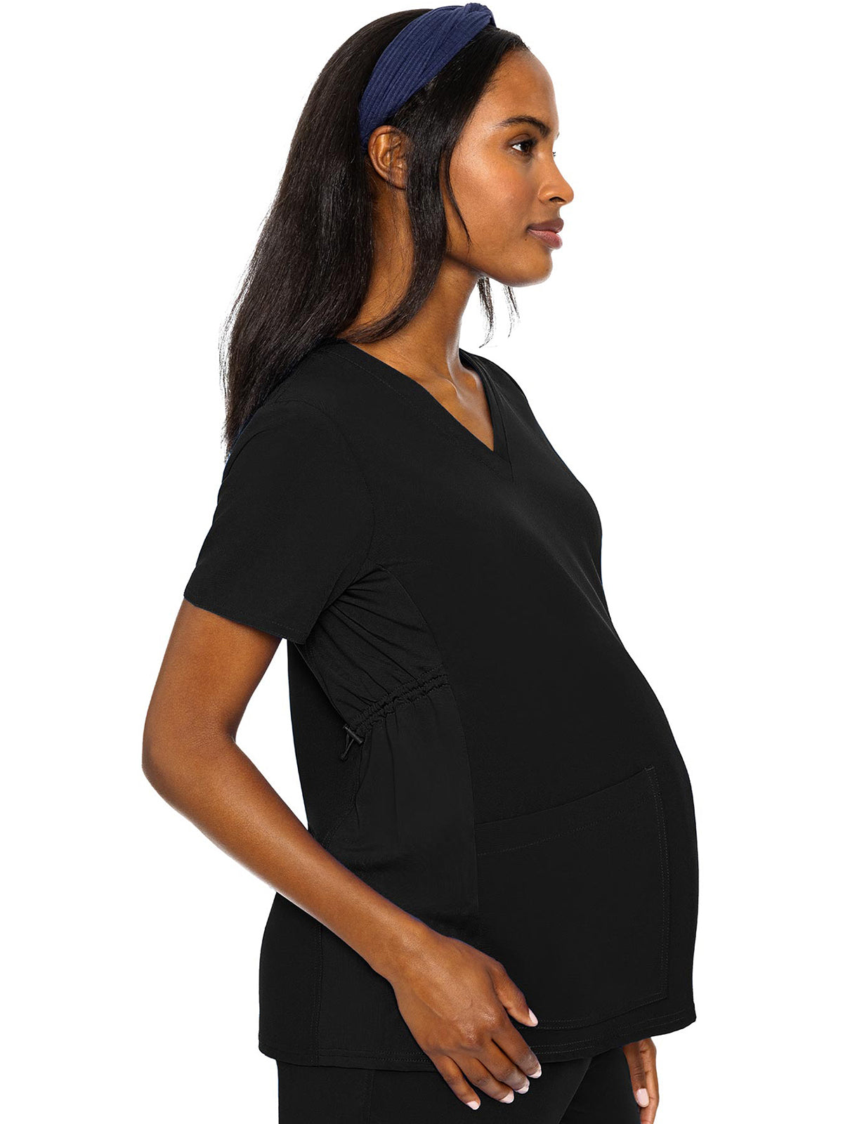 This Maternity fit v-neck top features two patch pockets for storage, comfortable and stretchy dyed-to-match jersey knit side panels, and a curved hem. The sides feature encased elastic with a toggle for adjustability. Center back length: 26"