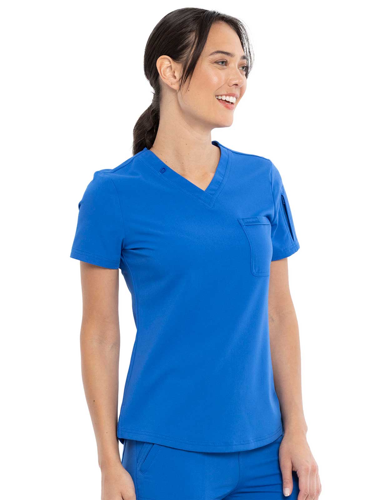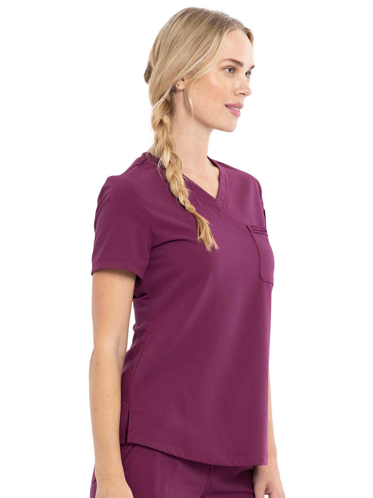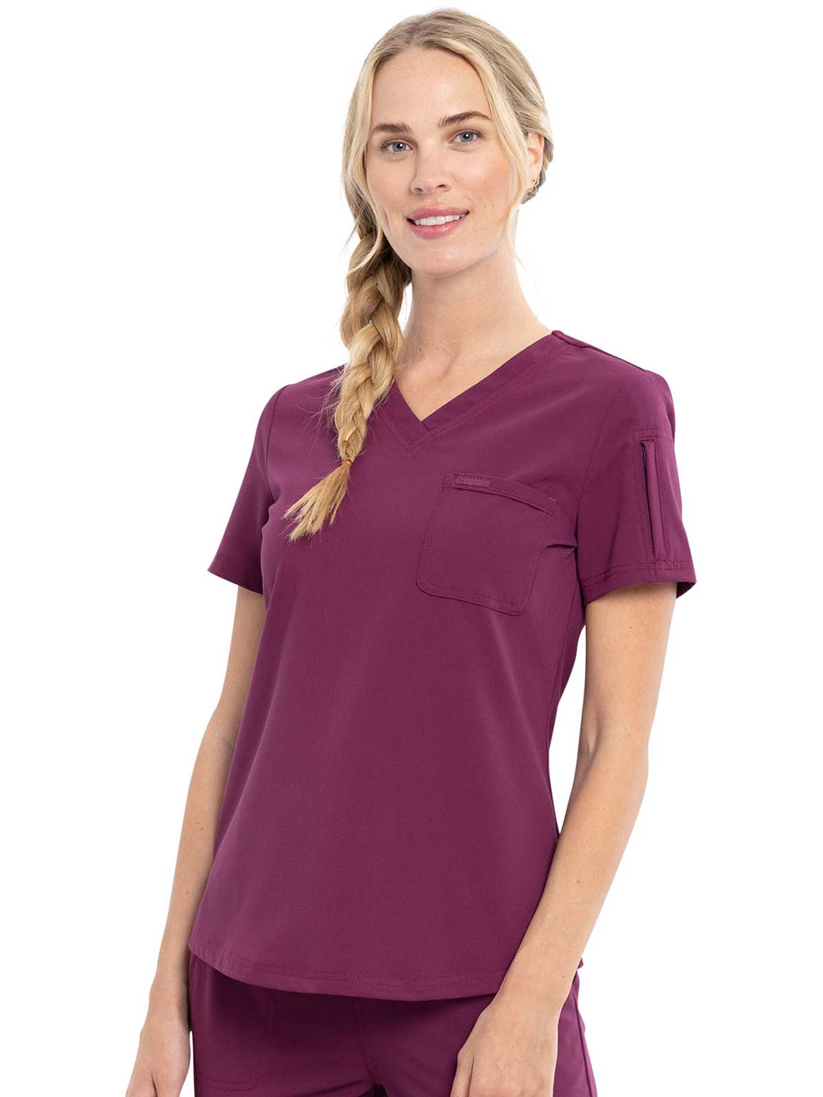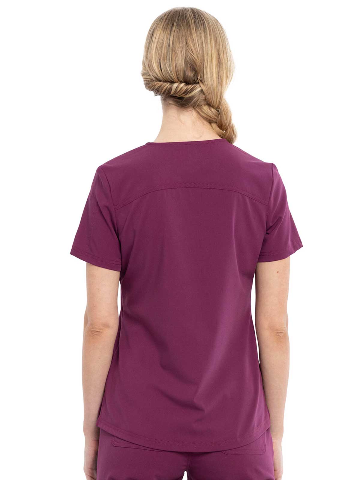 This Contemporary fit V-neck top can be worn out or tucked in. It has a bungee ID badge loop at the neck plus a curved back yoke seam. There are two pockets: one chest patch pocket and one zip security pocket on the wearer's left sleeve. Side vents and a rounded hem complete the look. Center back length: 26"