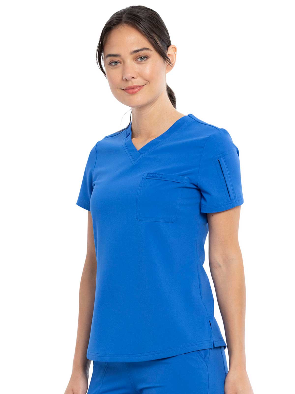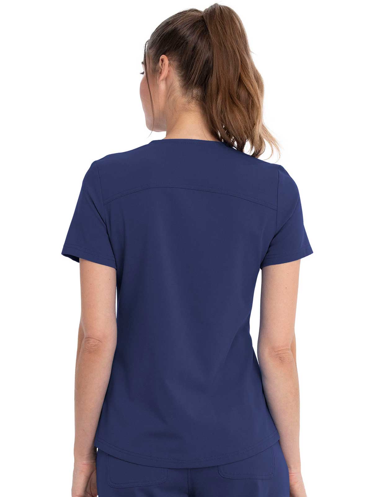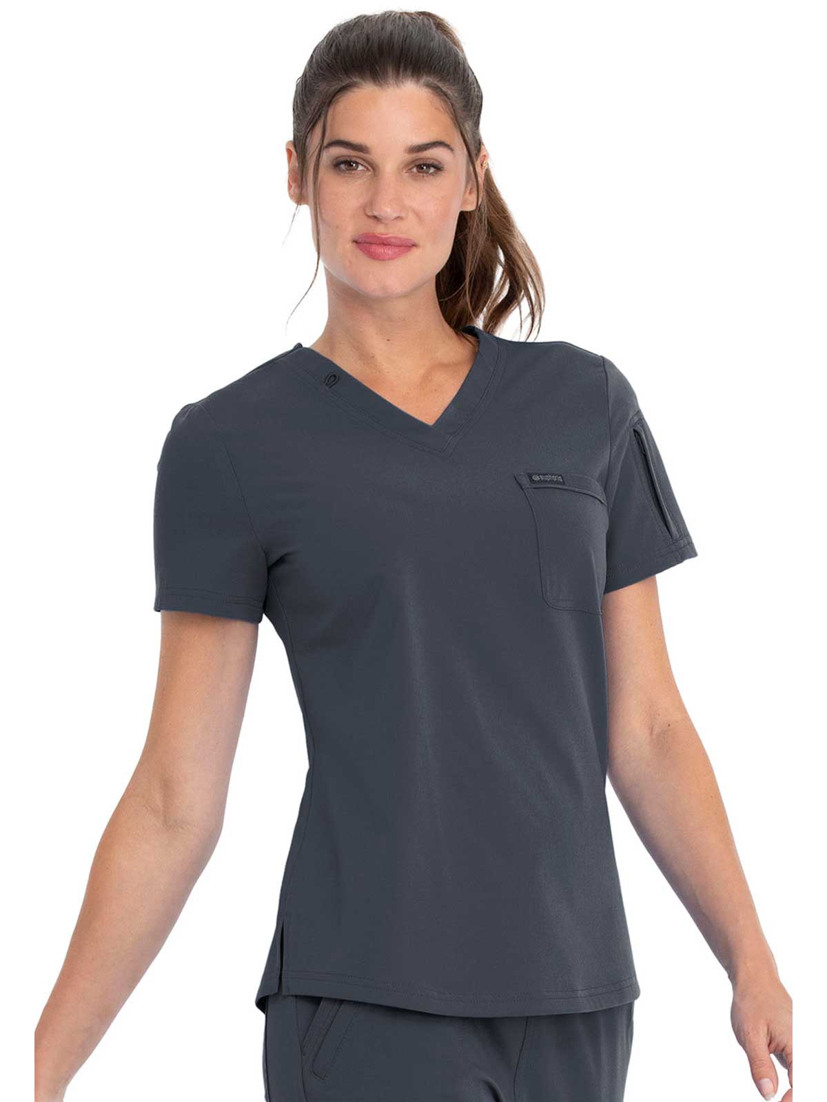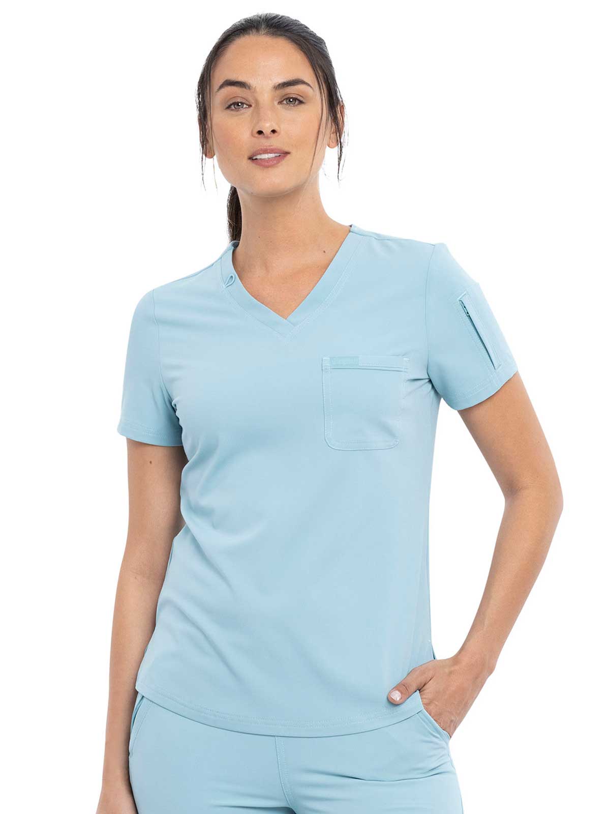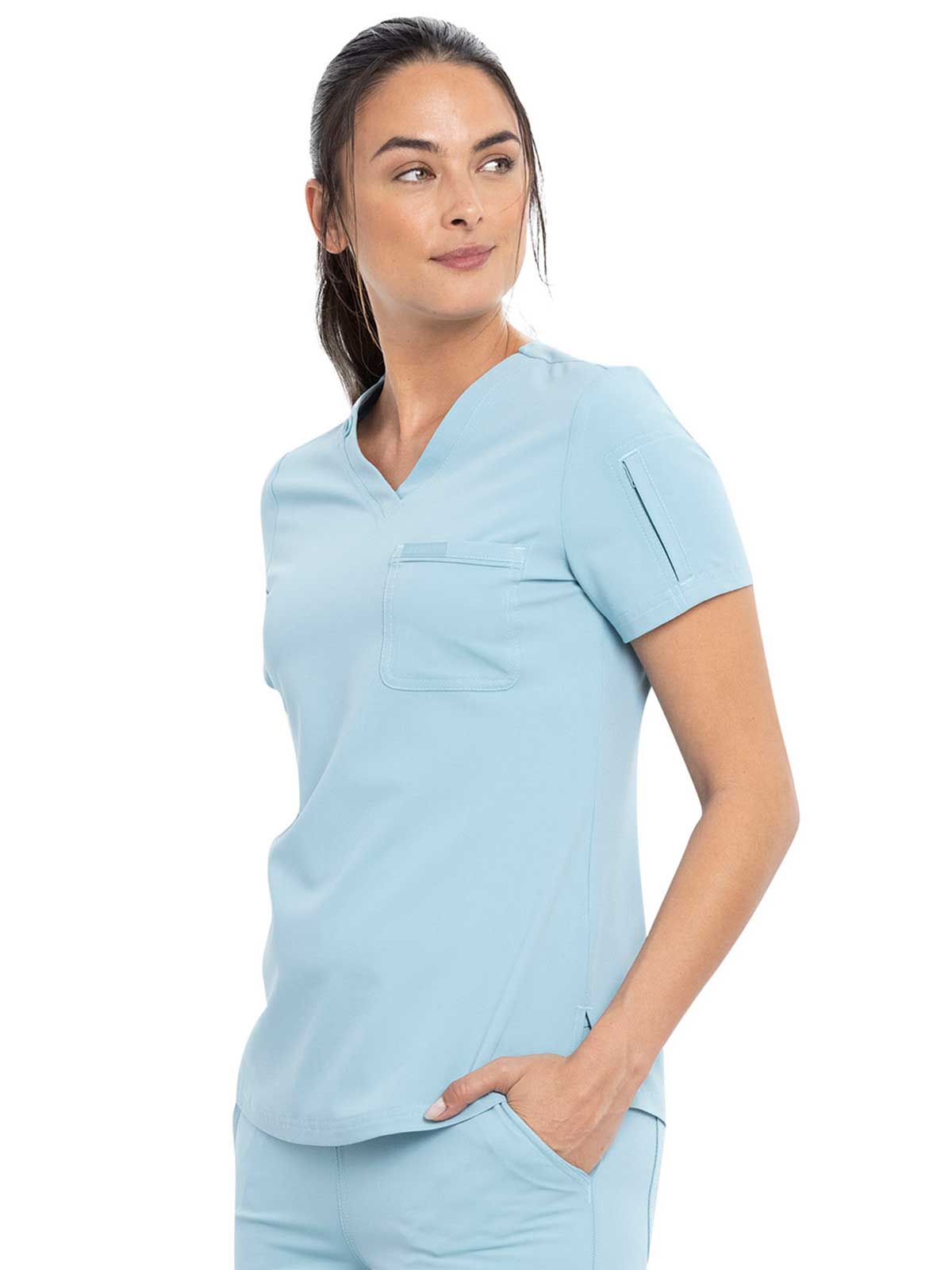 This Contemporary fit V-neck top can be worn out or tucked in. It has a bungee ID badge loop at the neck plus a curved back yoke seam. There are two pockets: one chest patch pocket and one zip security pocket on the wearer's left sleeve. Side vents and a rounded hem complete the look. Center back length: 26"
