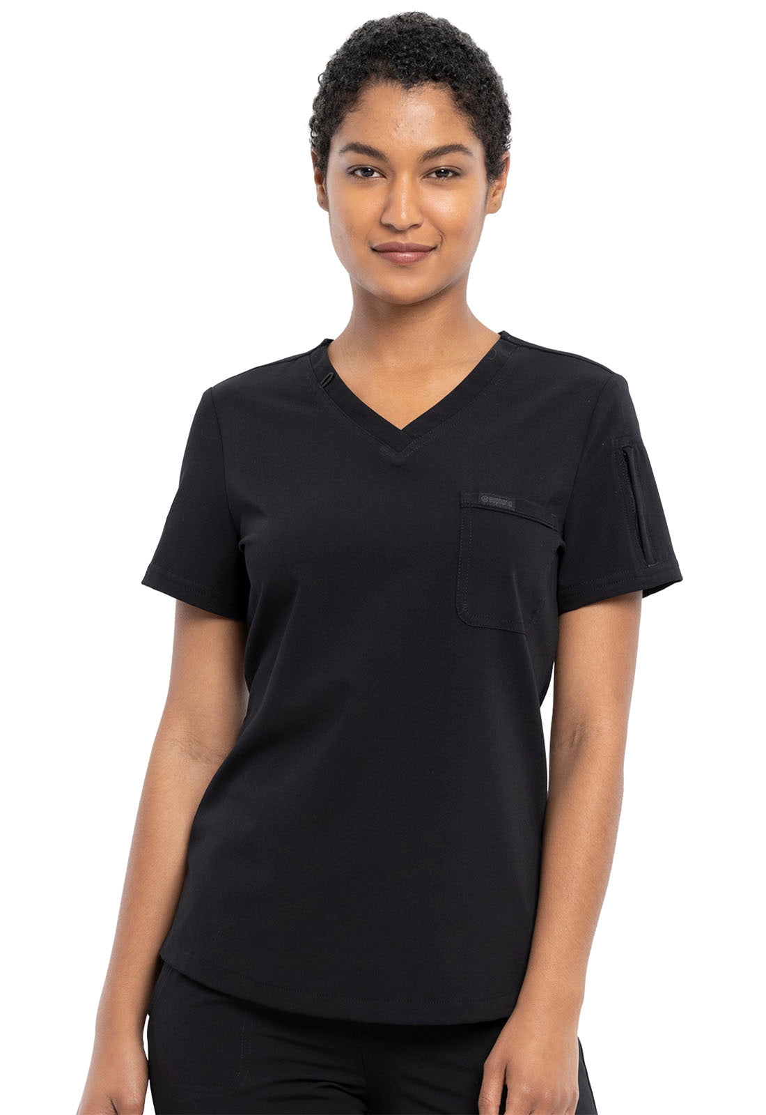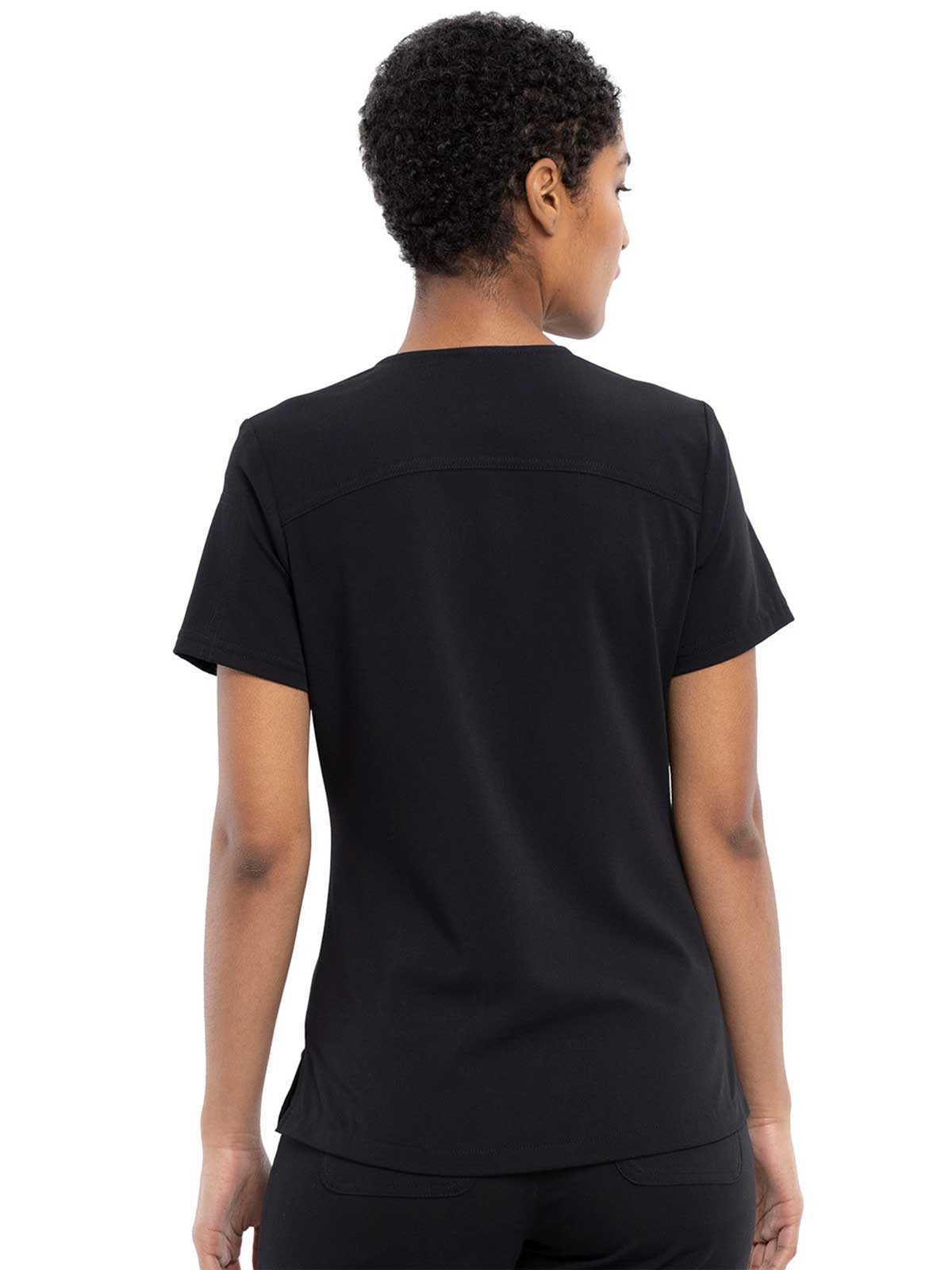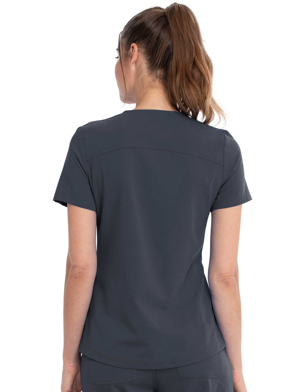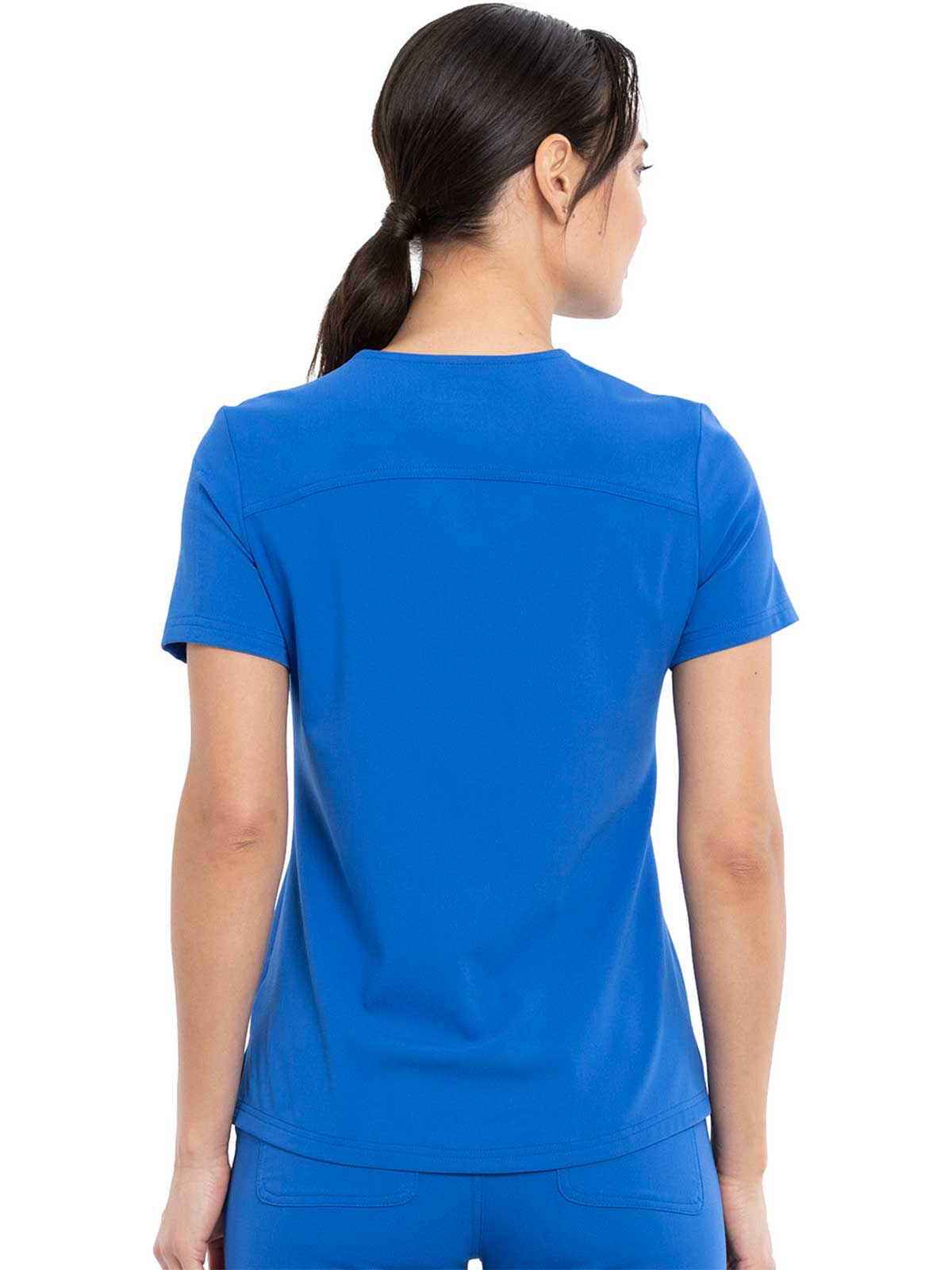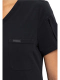 This Contemporary fit V-neck top can be worn out or tucked in. It has a bungee ID badge loop at the neck plus a curved back yoke seam. There are two pockets: one chest patch pocket and one zip security pocket on the wearer's left sleeve. Side vents and a rounded hem complete the look. Center back length: 26"