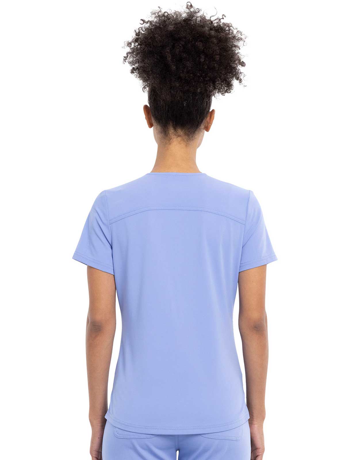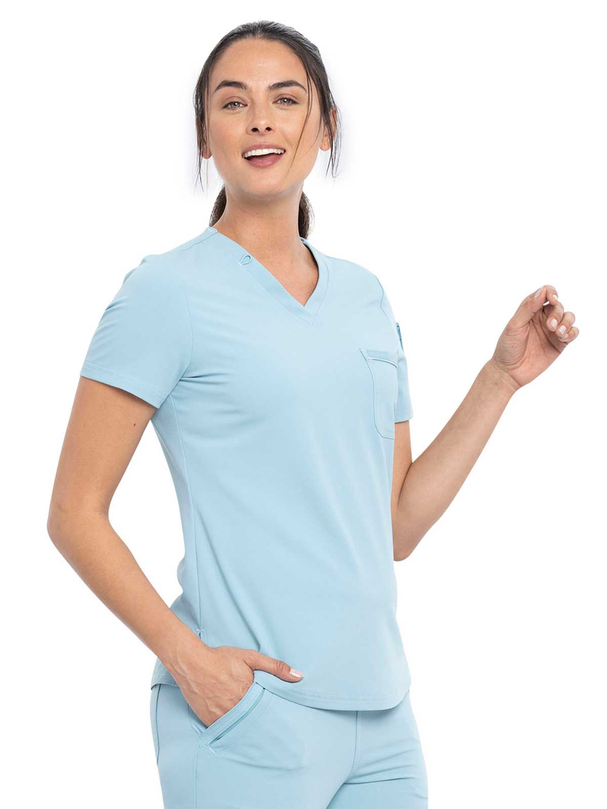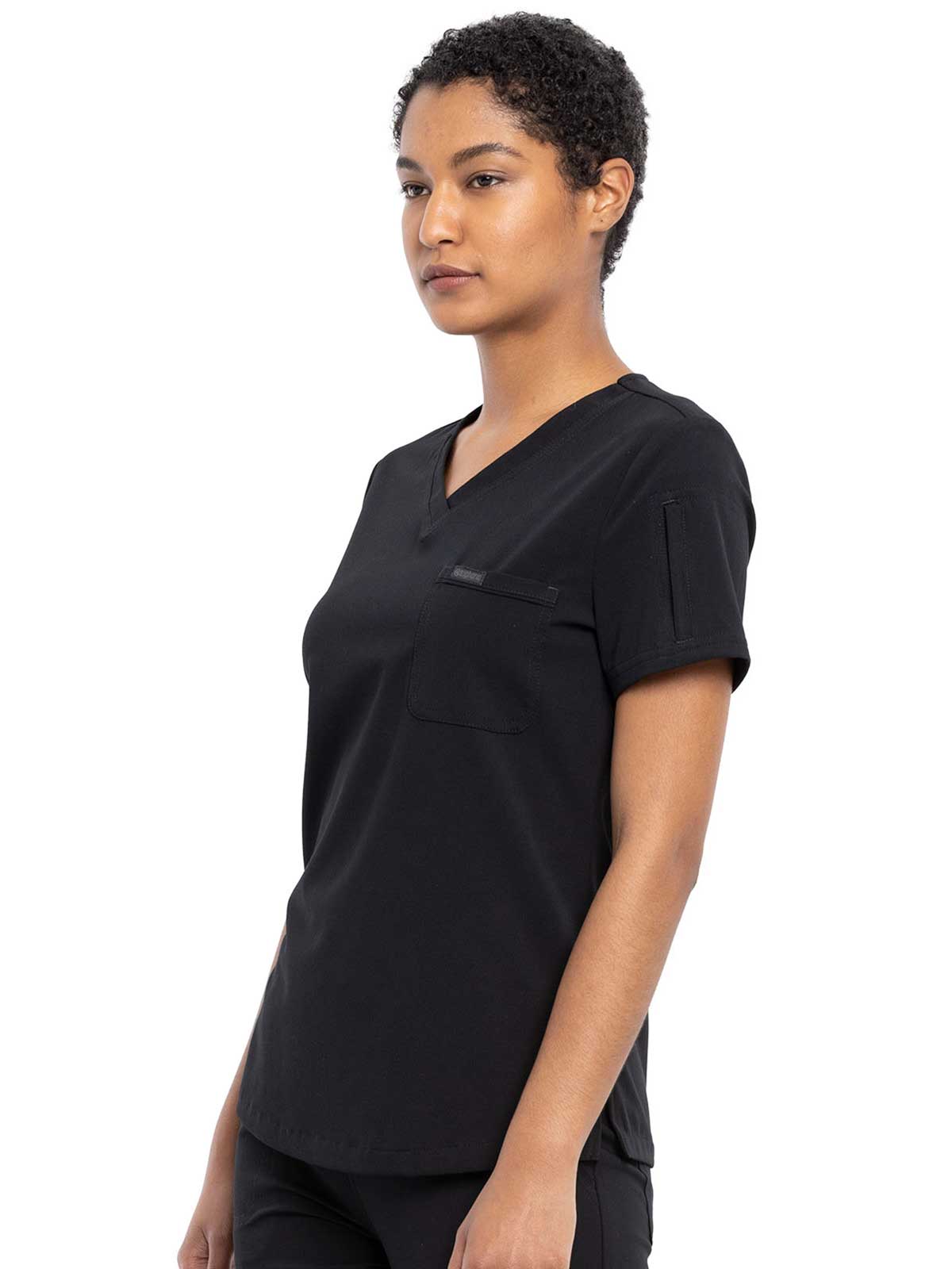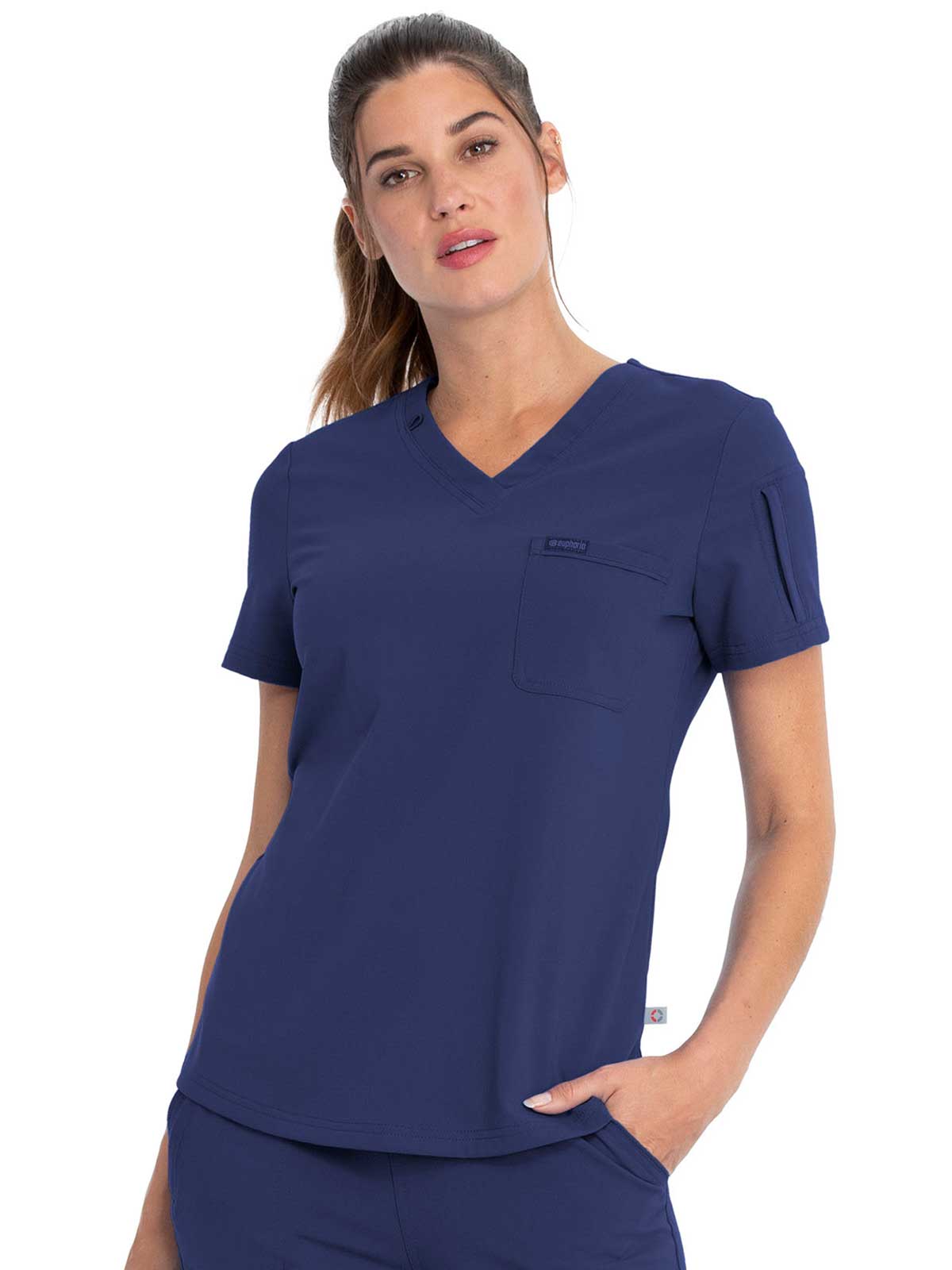 This Contemporary fit V-neck top can be worn out or tucked in. It has a bungee ID badge loop at the neck plus a curved back yoke seam. There are two pockets: one chest patch pocket and one zip security pocket on the wearer's left sleeve. Side vents and a rounded hem complete the look. Center back length: 26"
