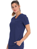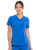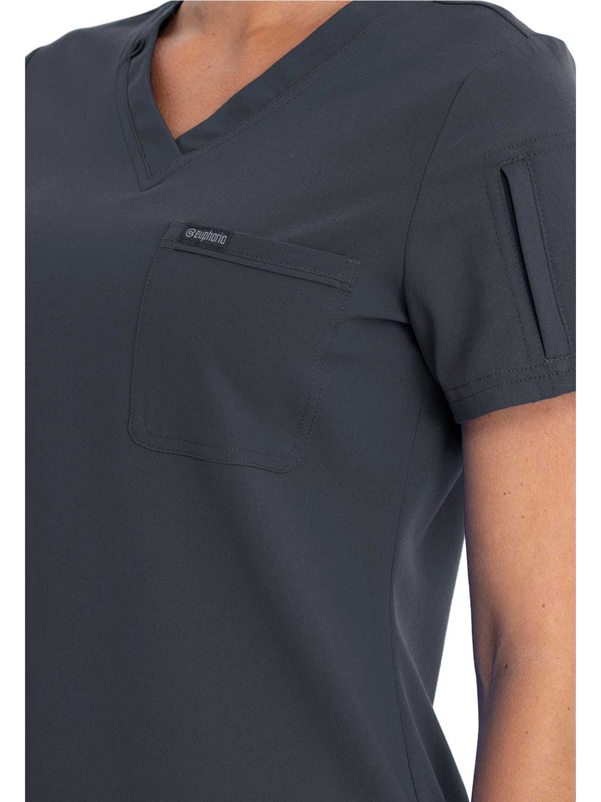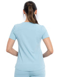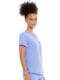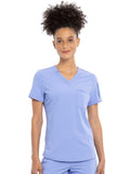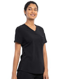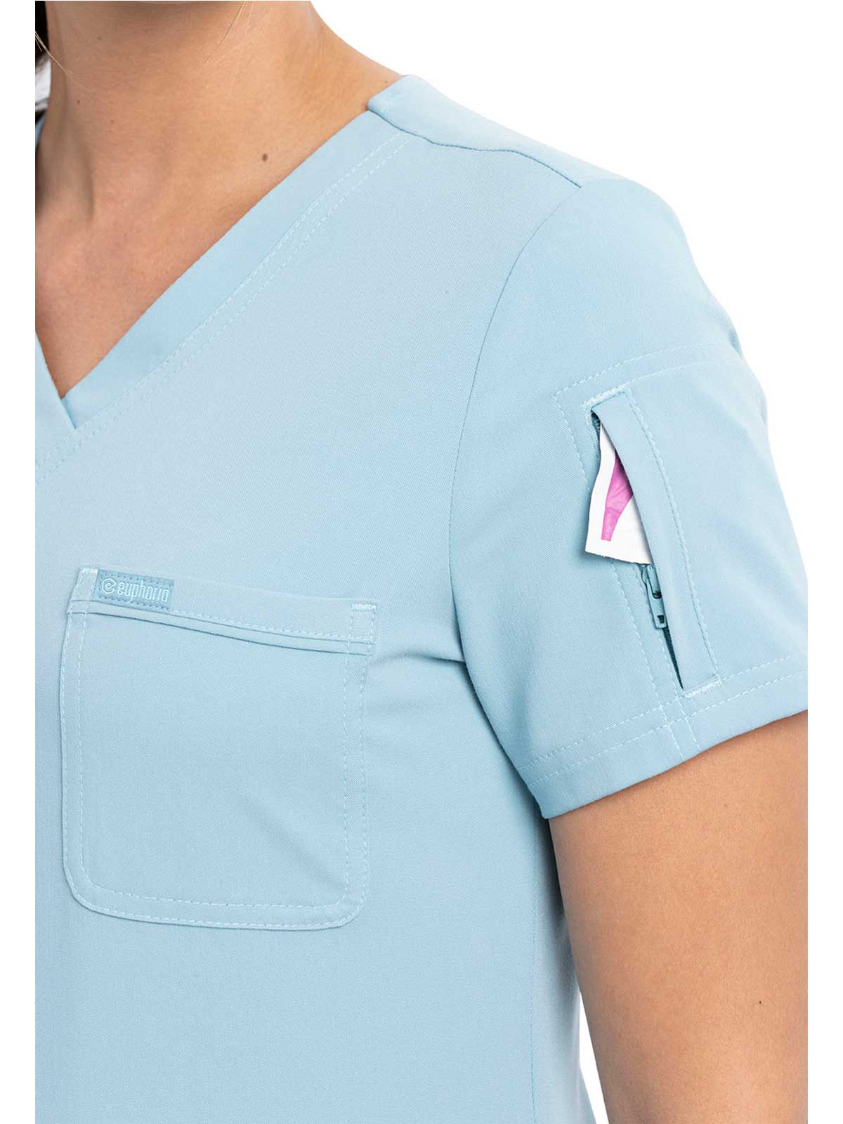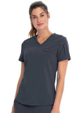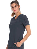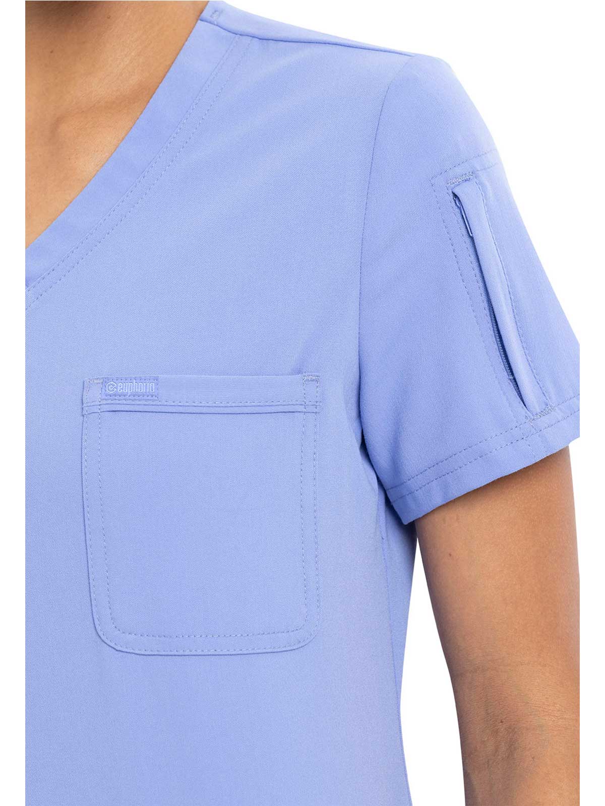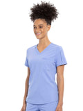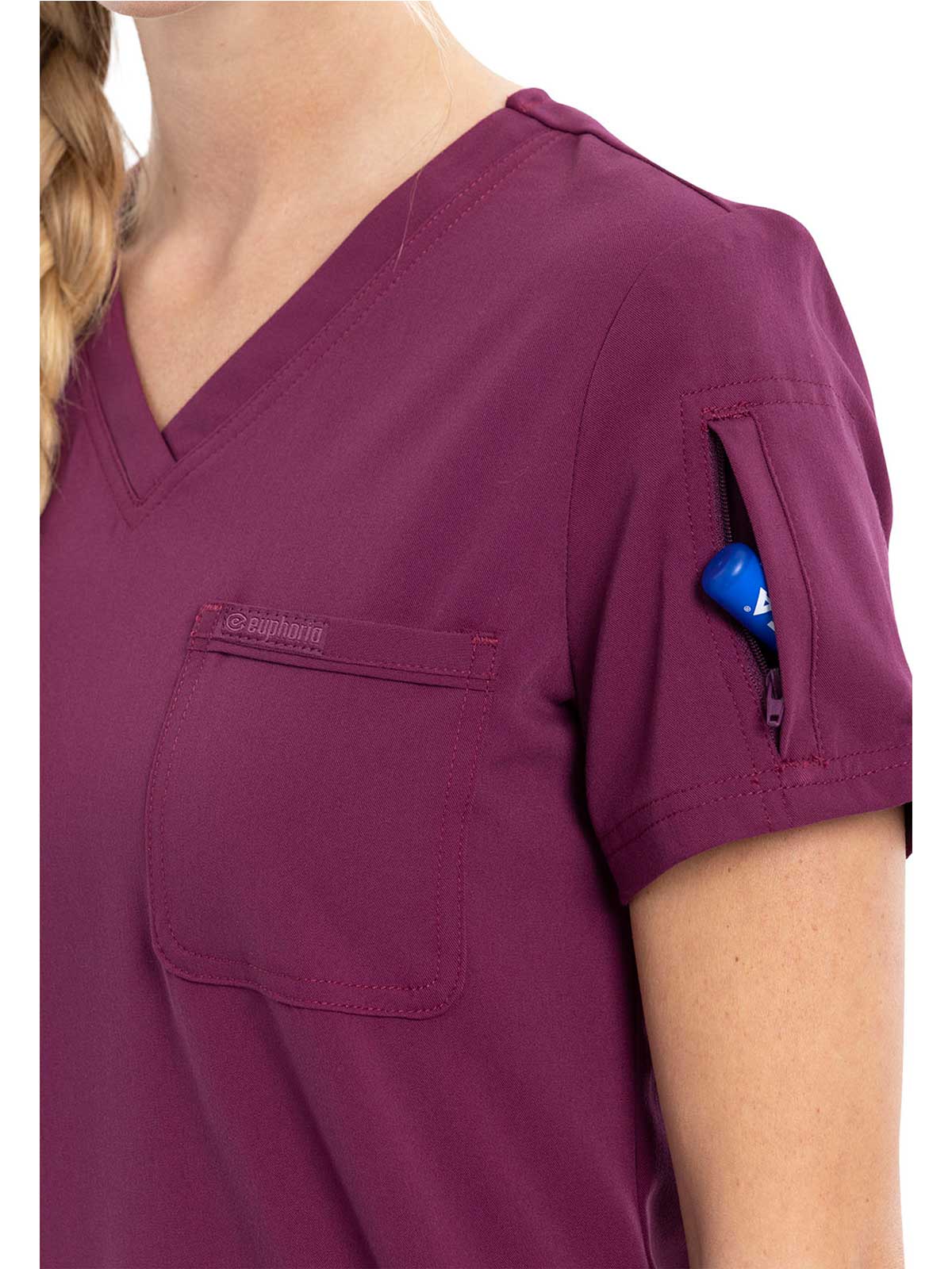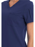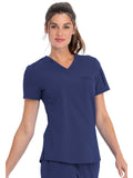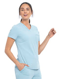 This Contemporary fit V-neck top can be worn out or tucked in. It has a bungee ID badge loop at the neck plus a curved back yoke seam. There are two pockets: one chest patch pocket and one zip security pocket on the wearer's left sleeve. Side vents and a rounded hem complete the look. Center back length: 26"