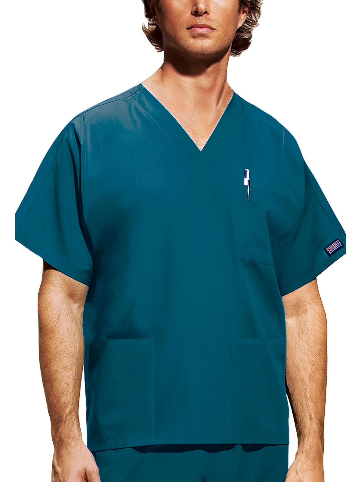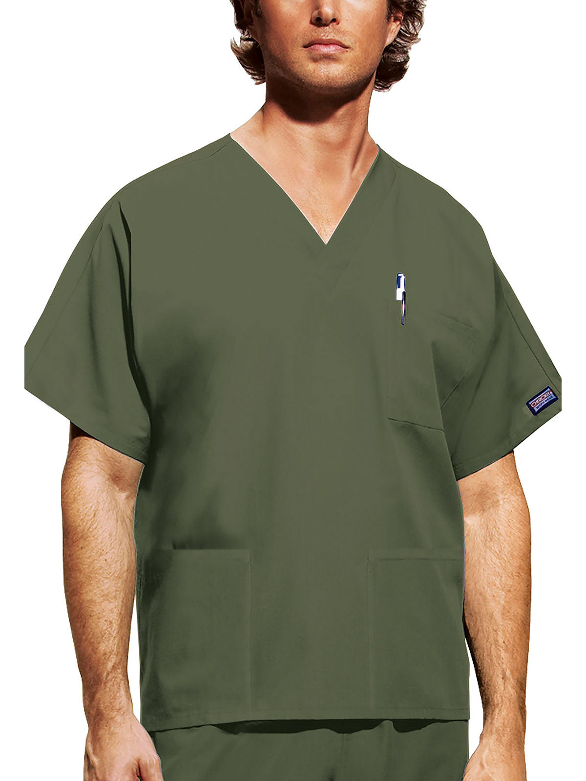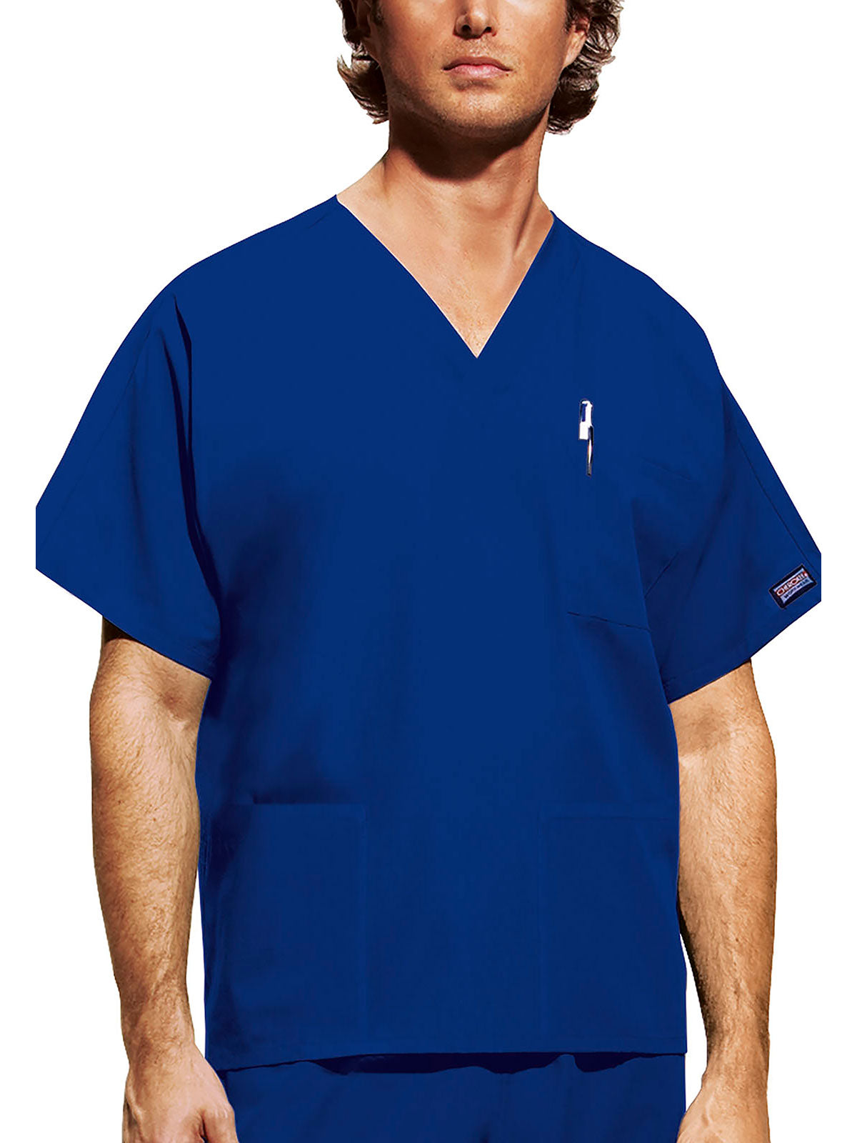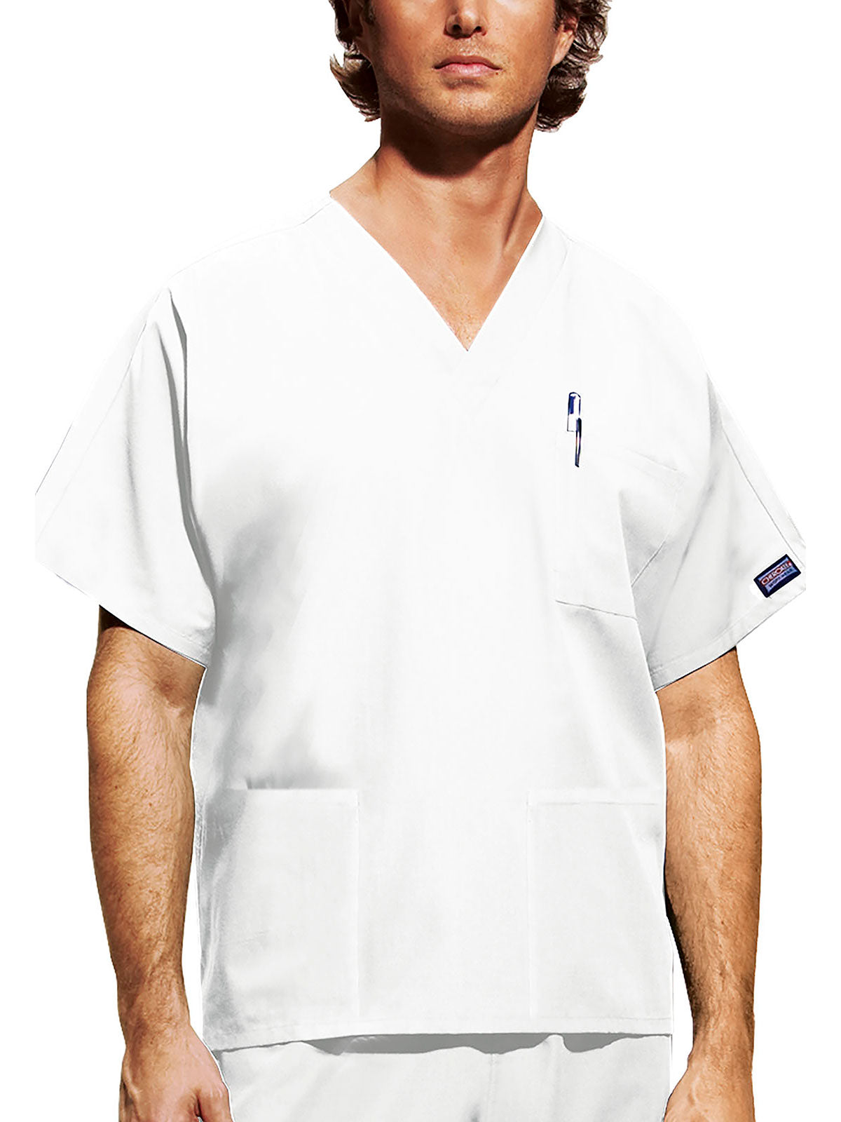 This Unisex Traditional fit V-neck top has one chest pocket and two patch pockets. Side vents. Center back length 32".