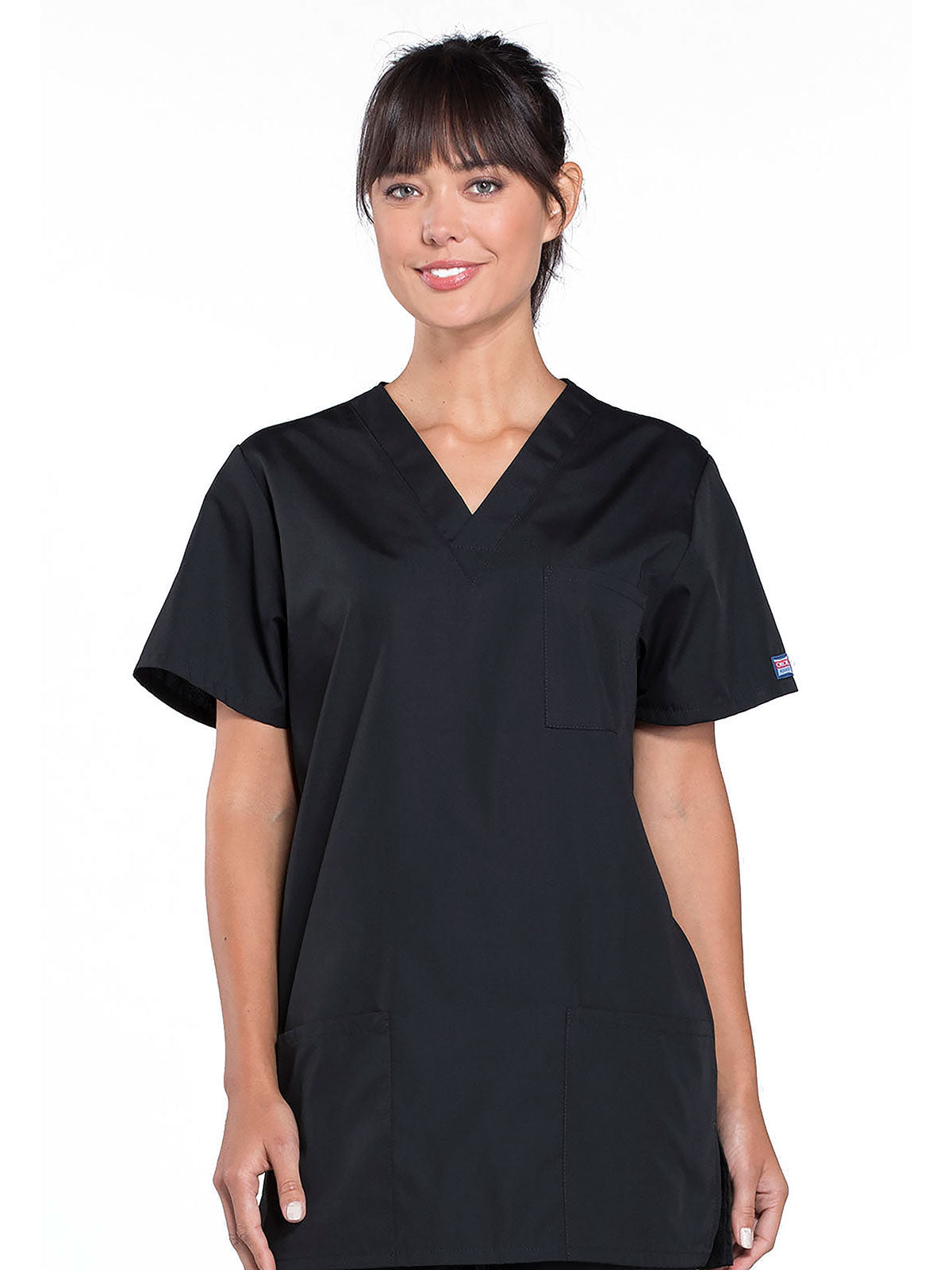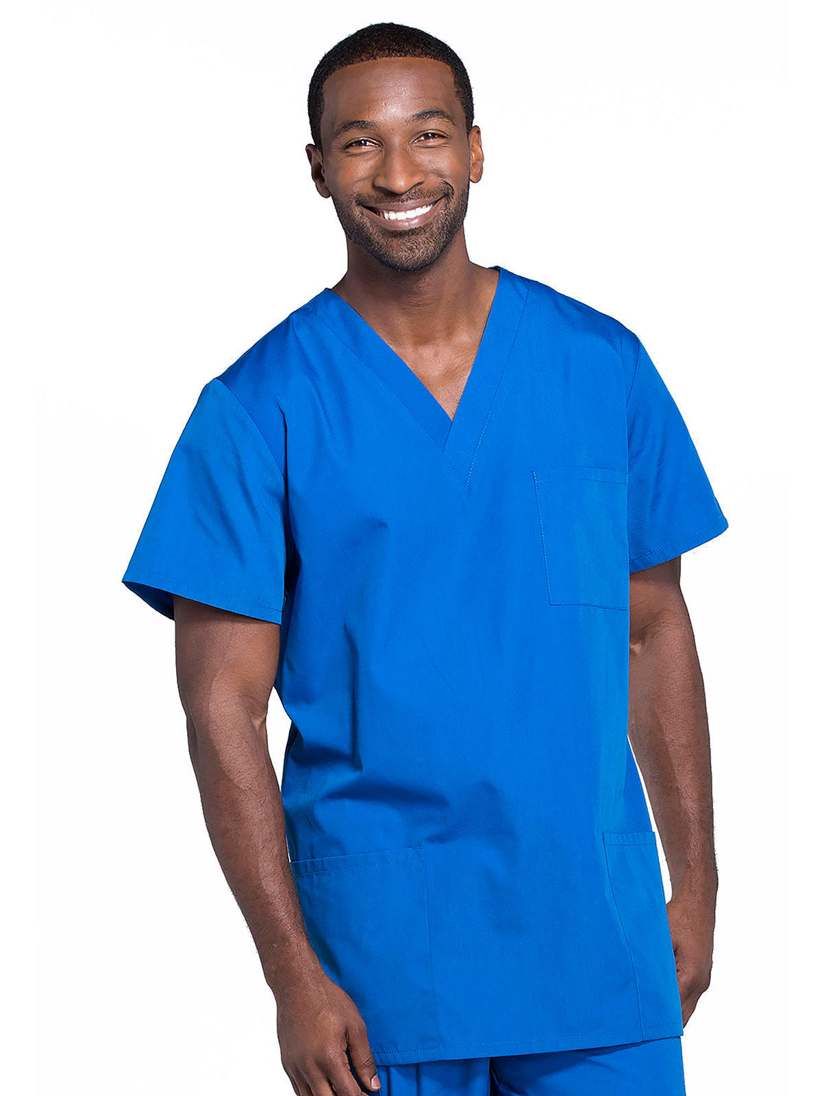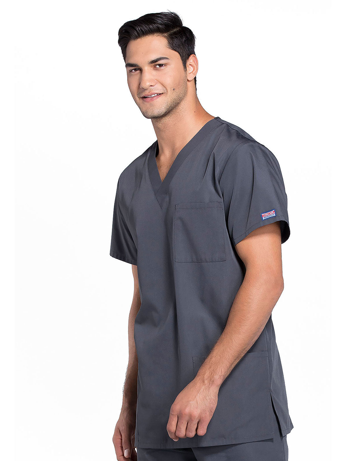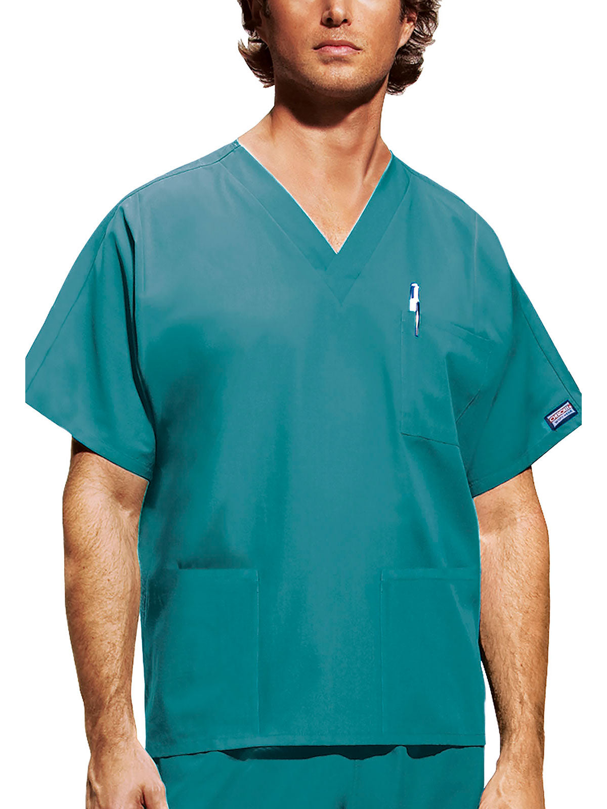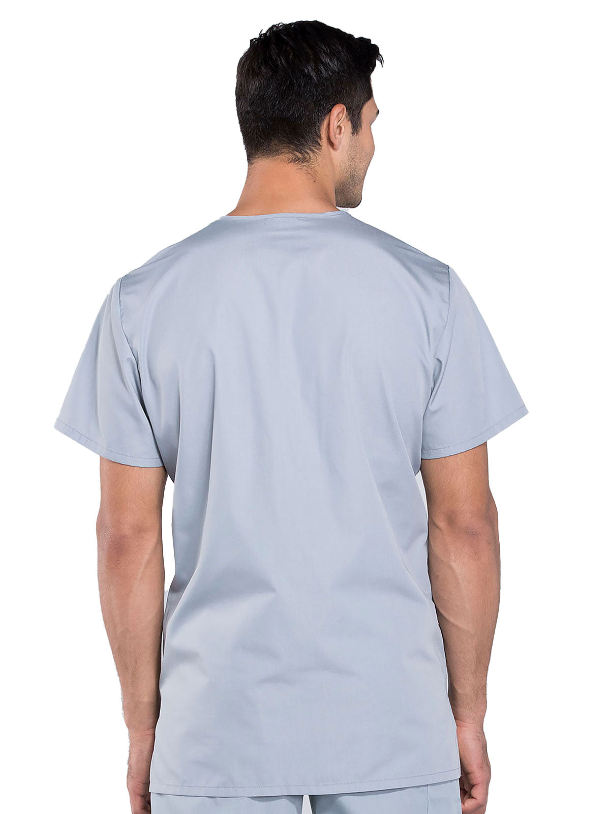 This Unisex Traditional fit V-neck top has one chest pocket and two patch pockets. Side vents. Center back length 32".