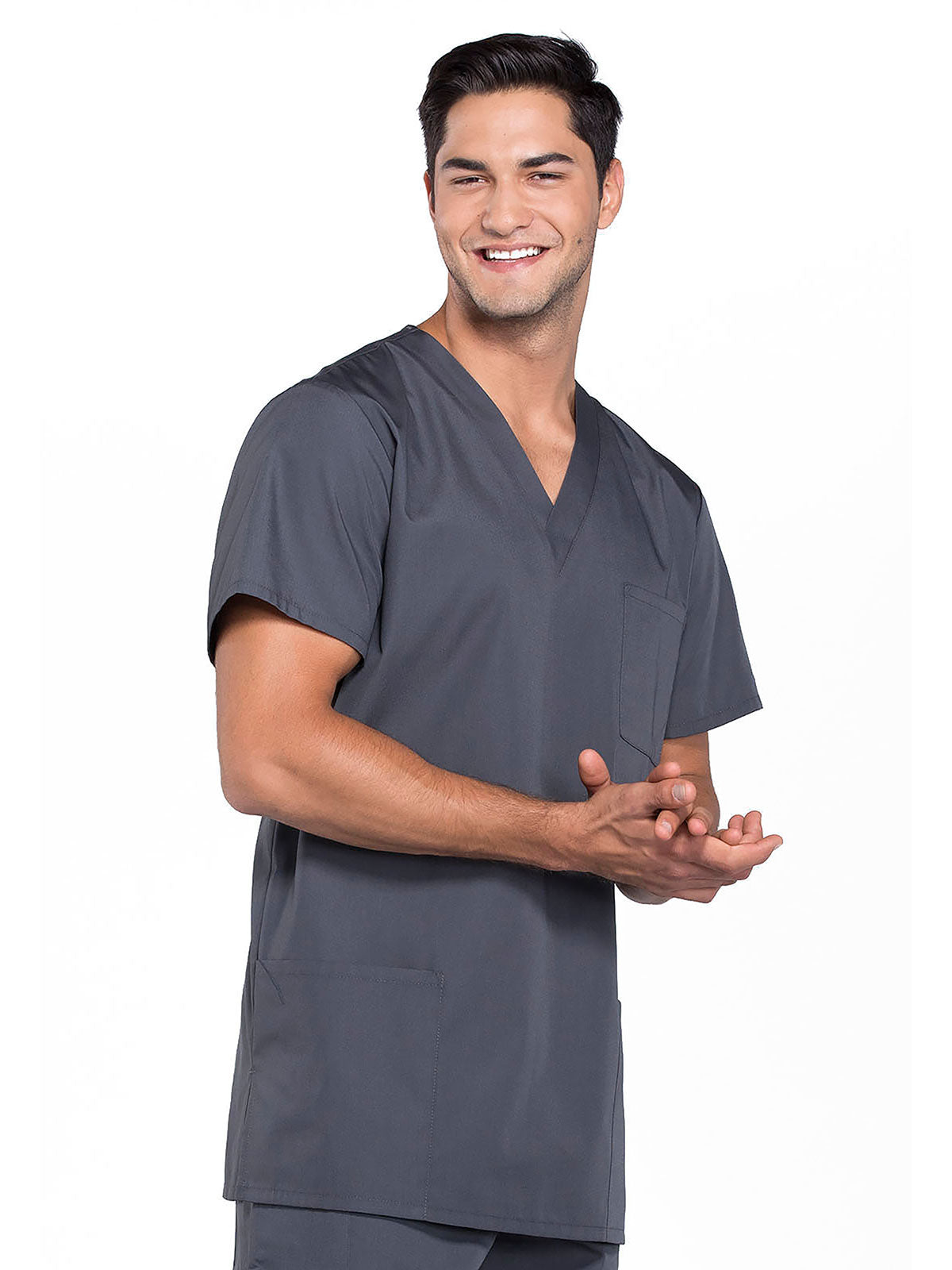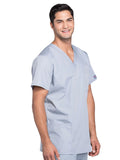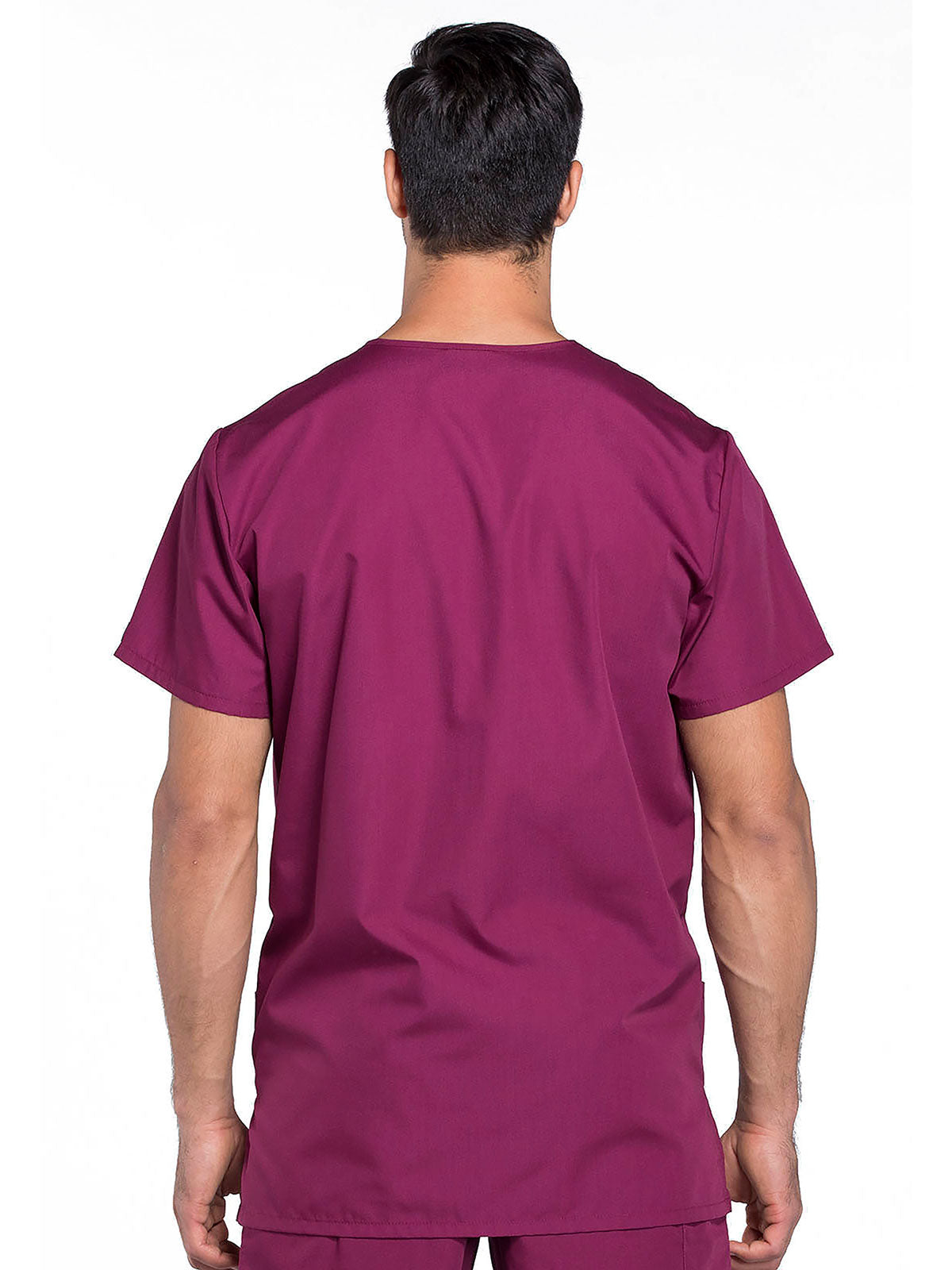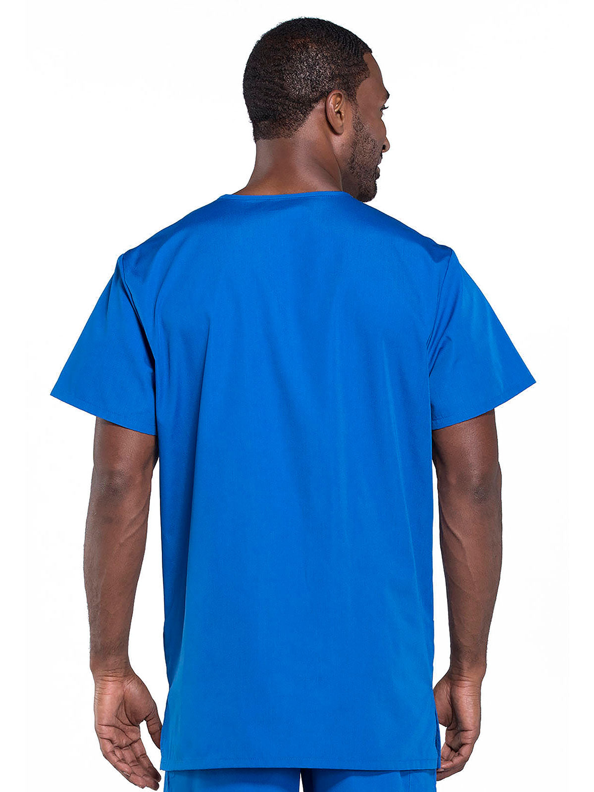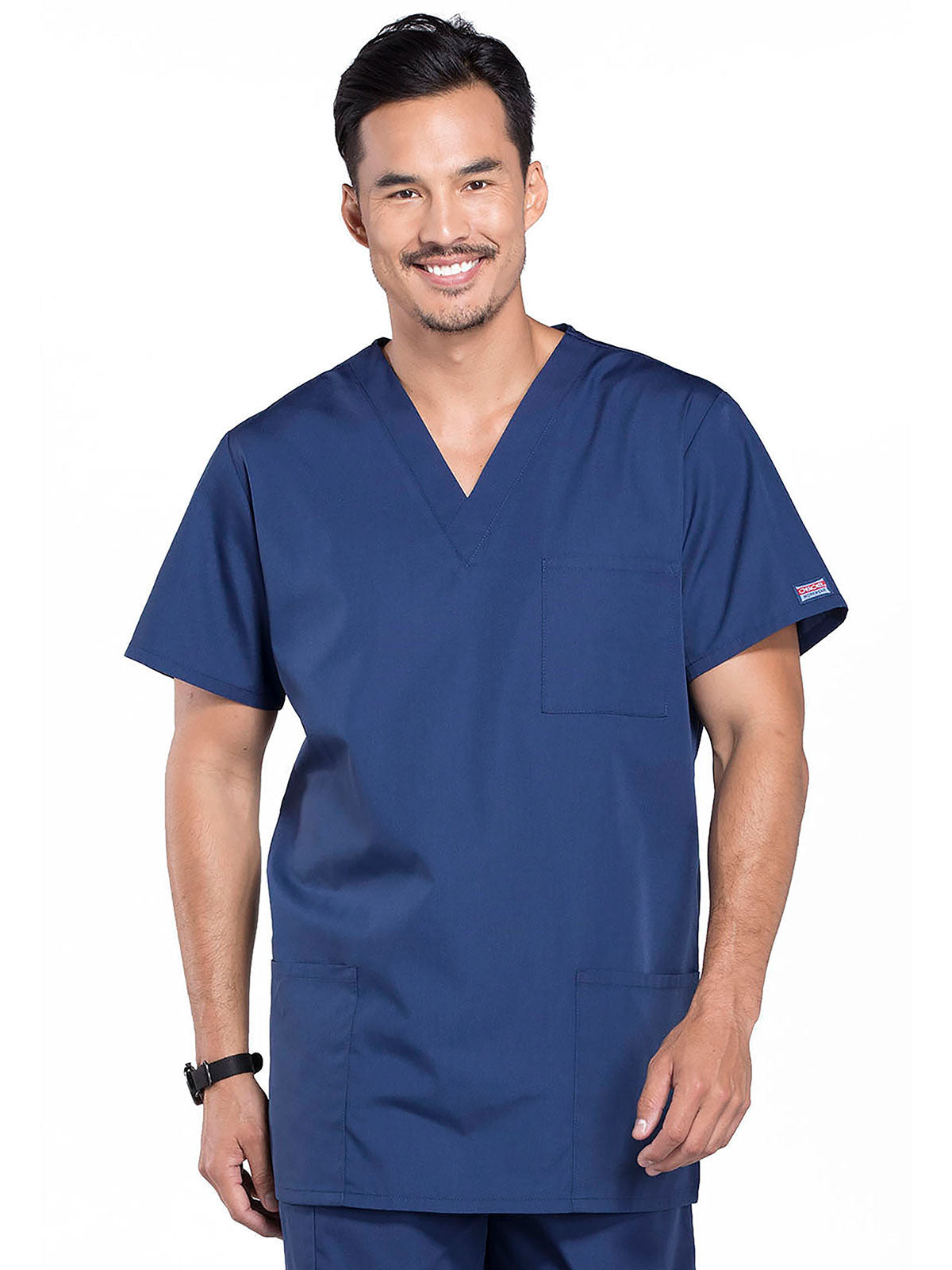 This Unisex Traditional fit V-neck top has one chest pocket and two patch pockets. Side vents. Center back length 32".