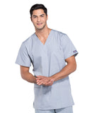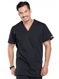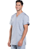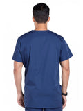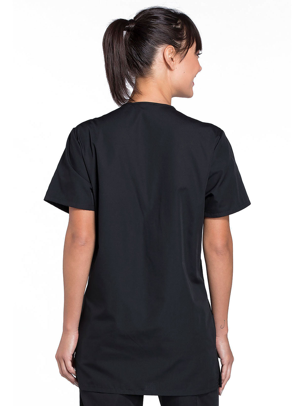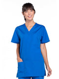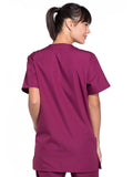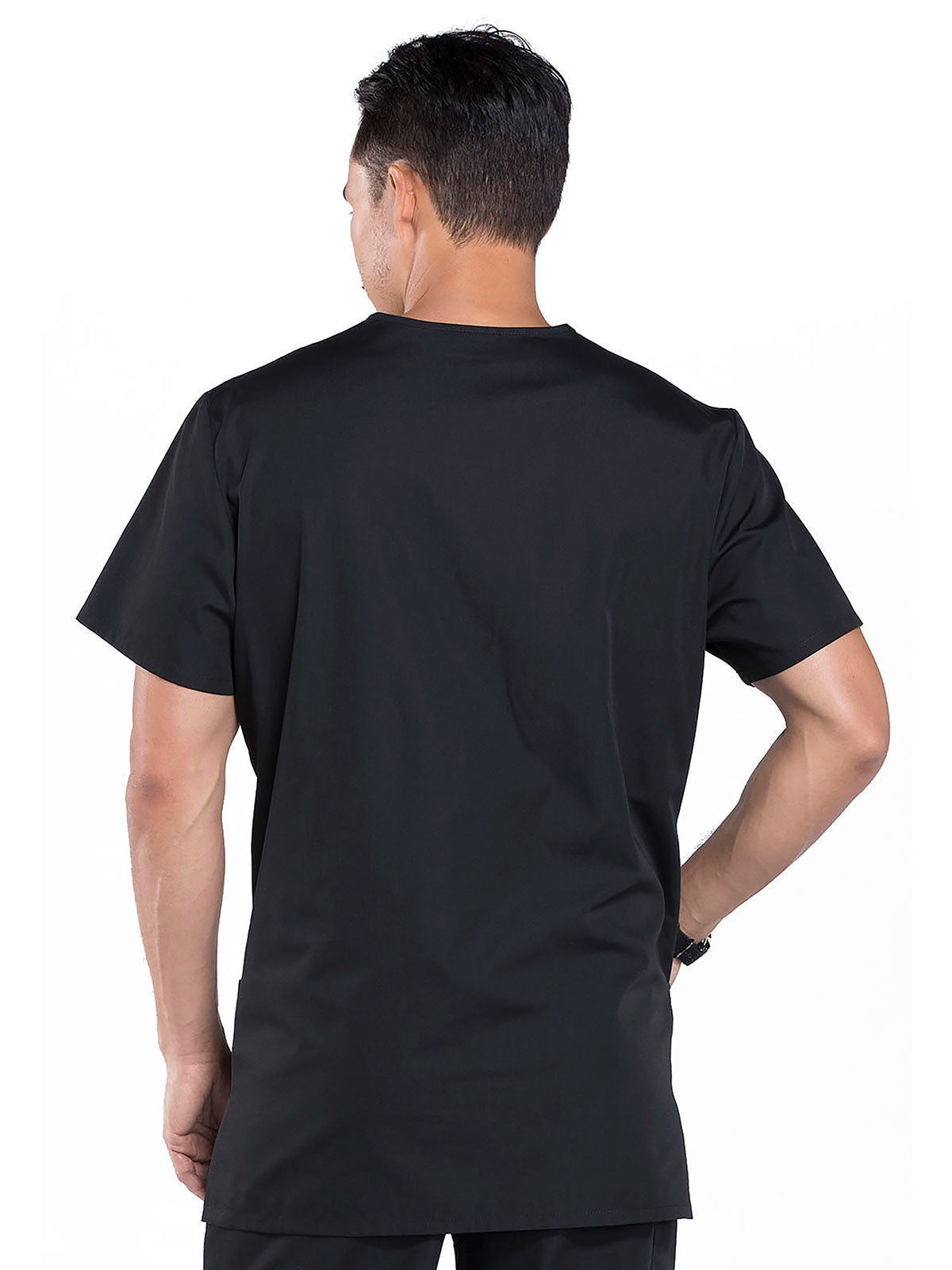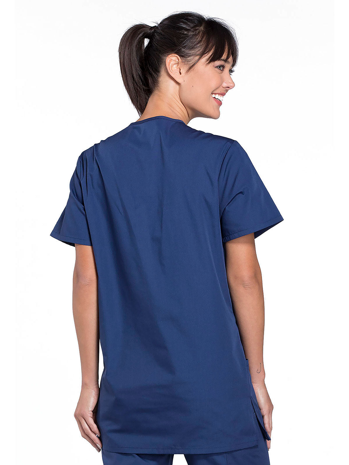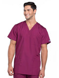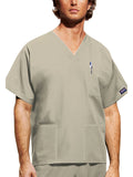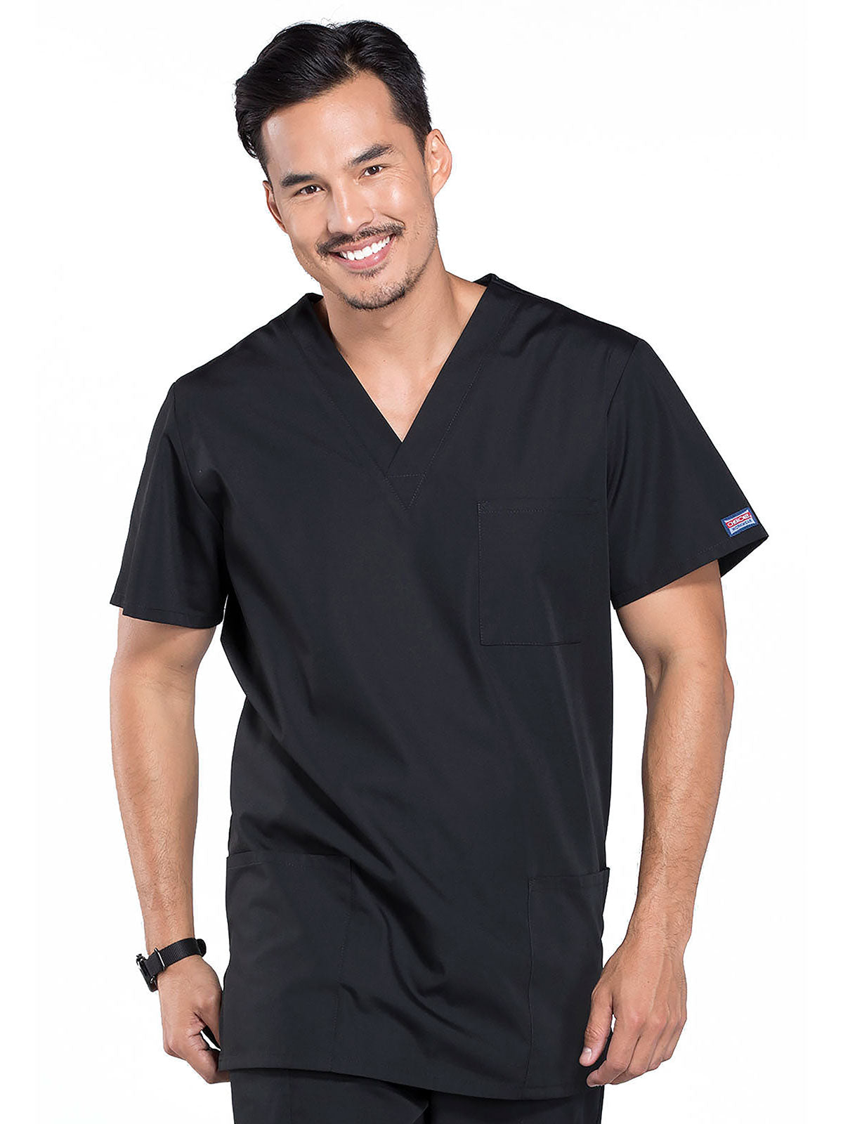 This Unisex Traditional fit V-neck top has one chest pocket and two patch pockets. Side vents. Center back length 32".