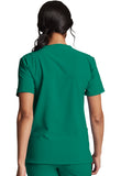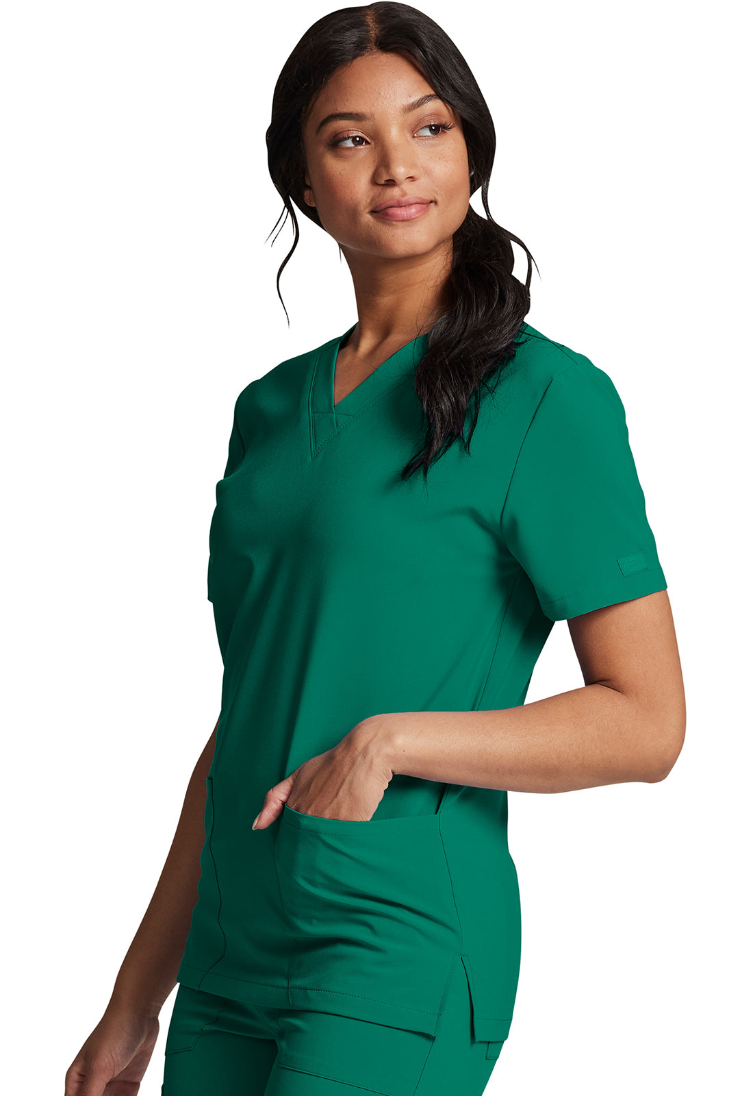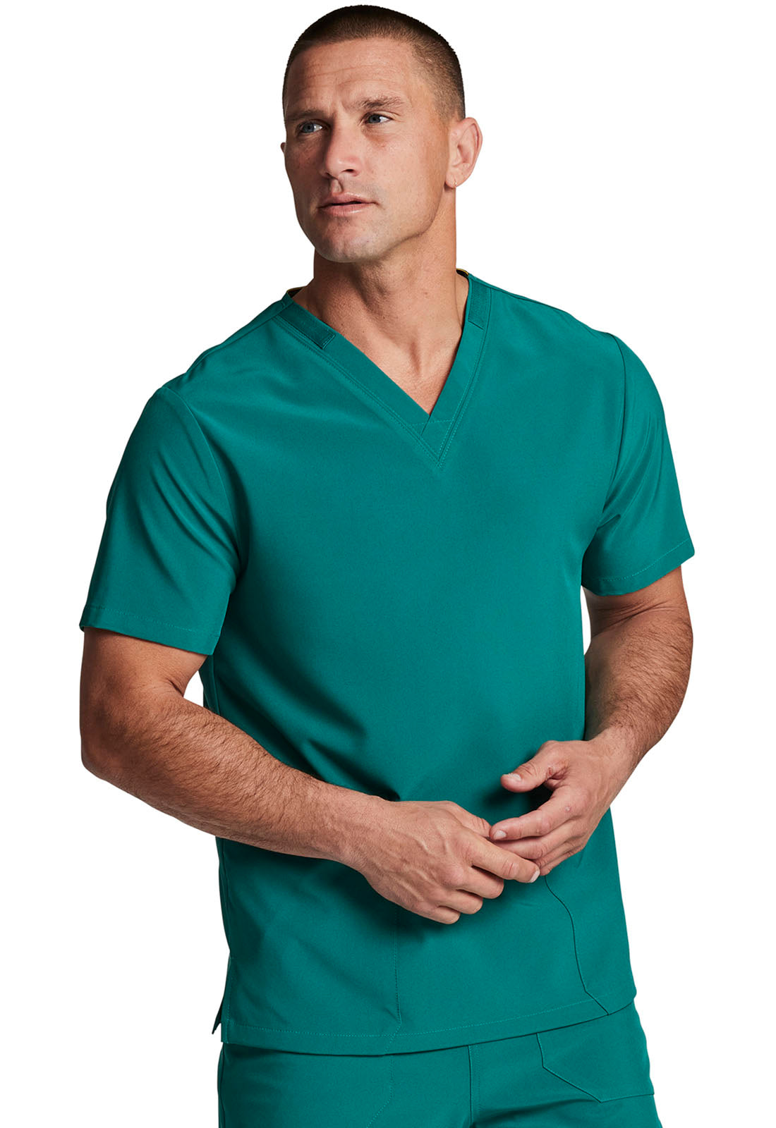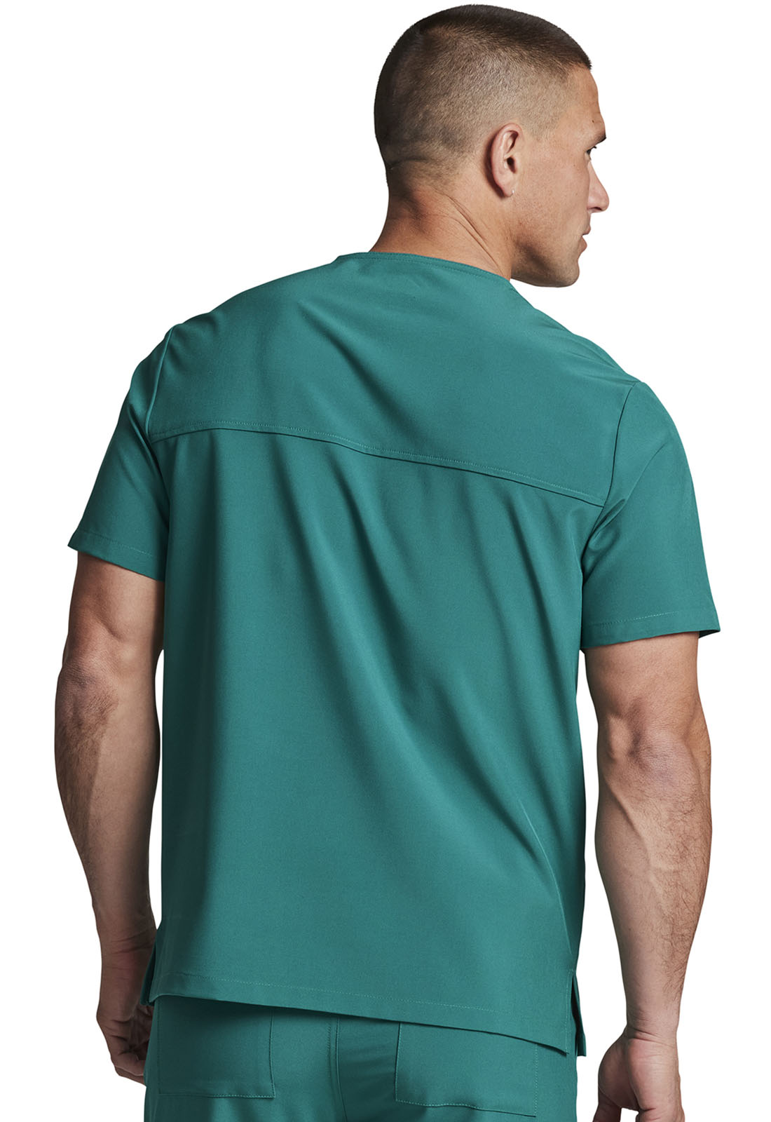 This unisex V-neck top features twill tape detail at the neckline, two front patch pockets, a back yoke seam, and side vents. It has a center back length of 28".
