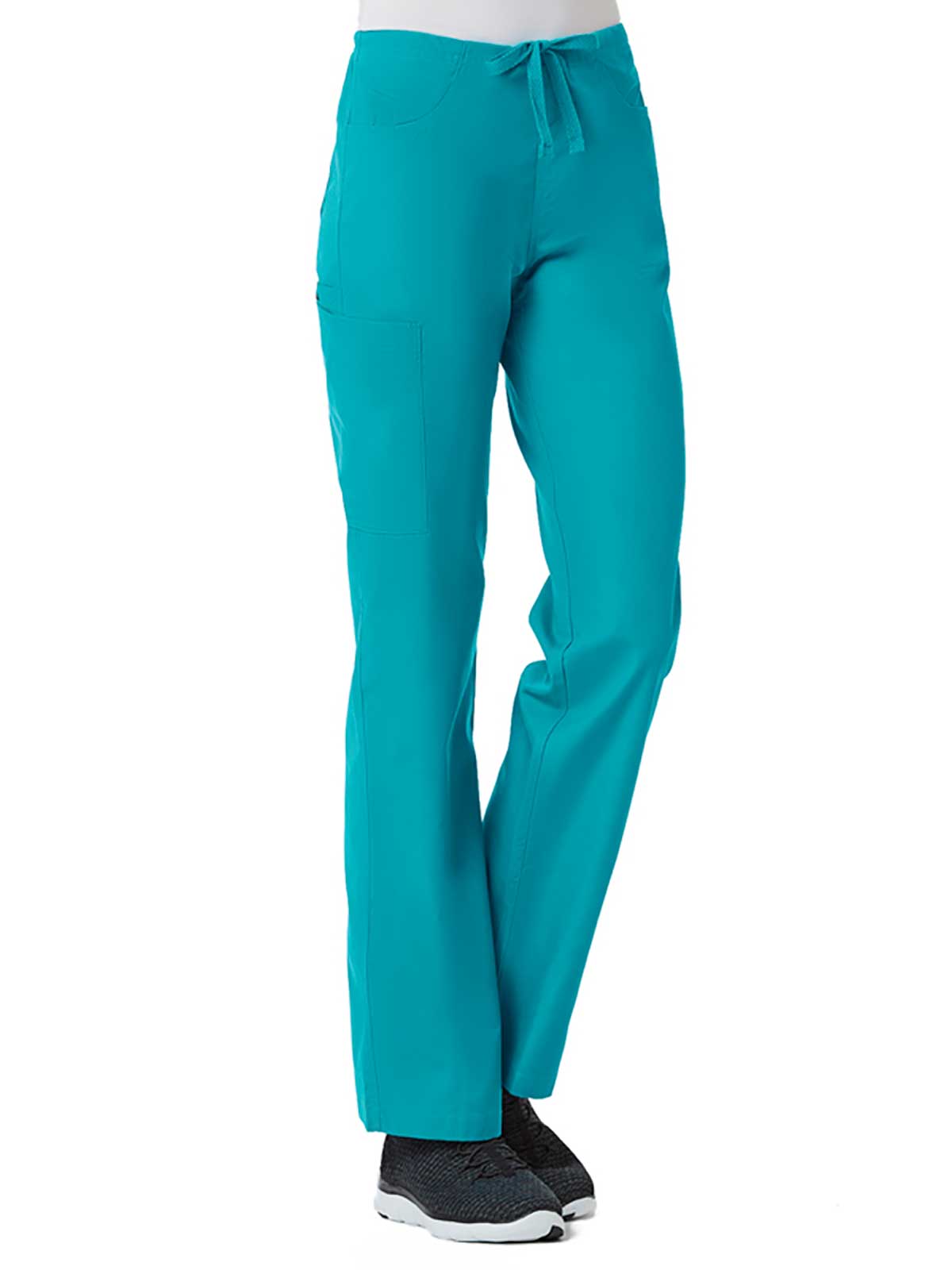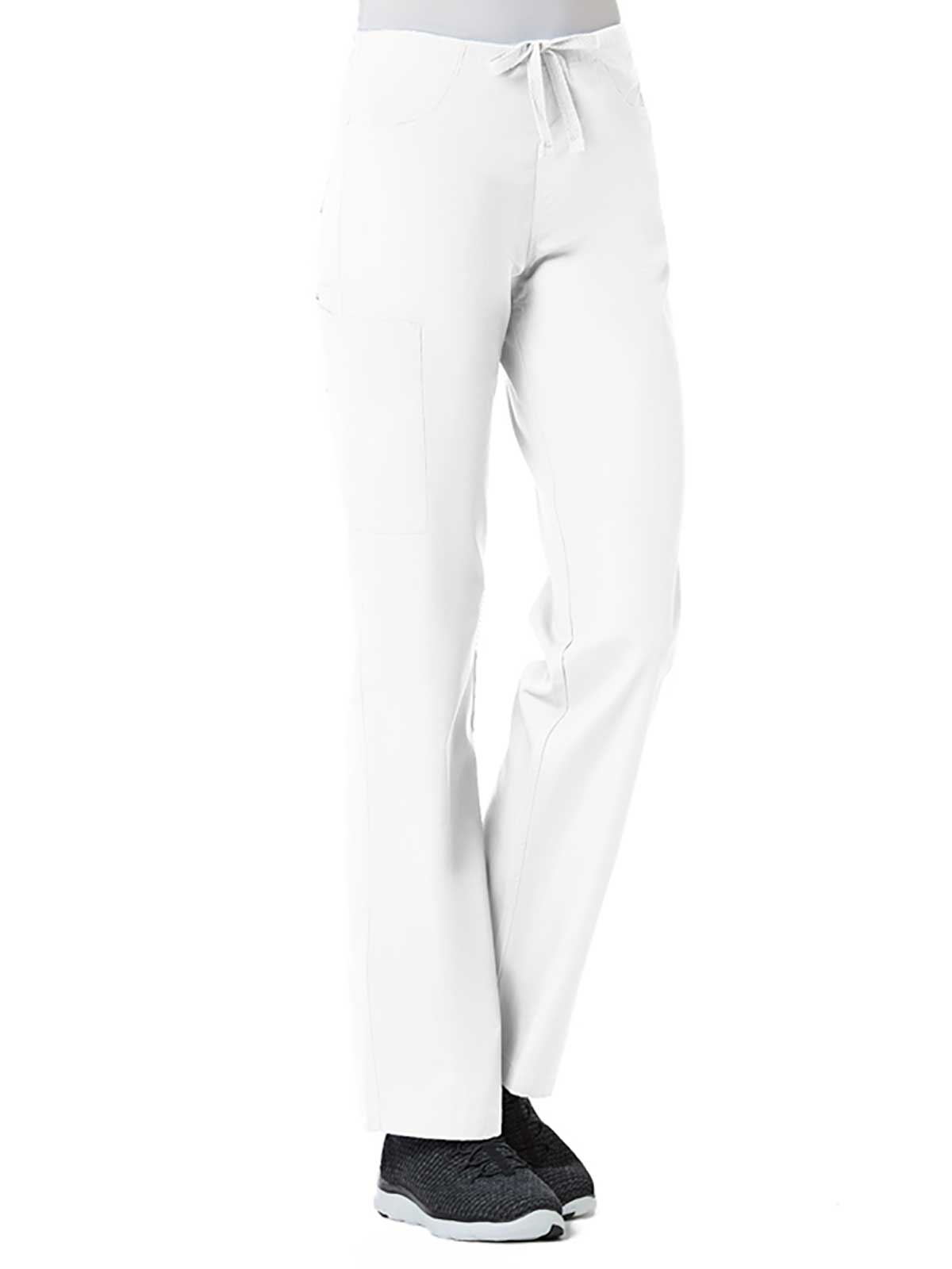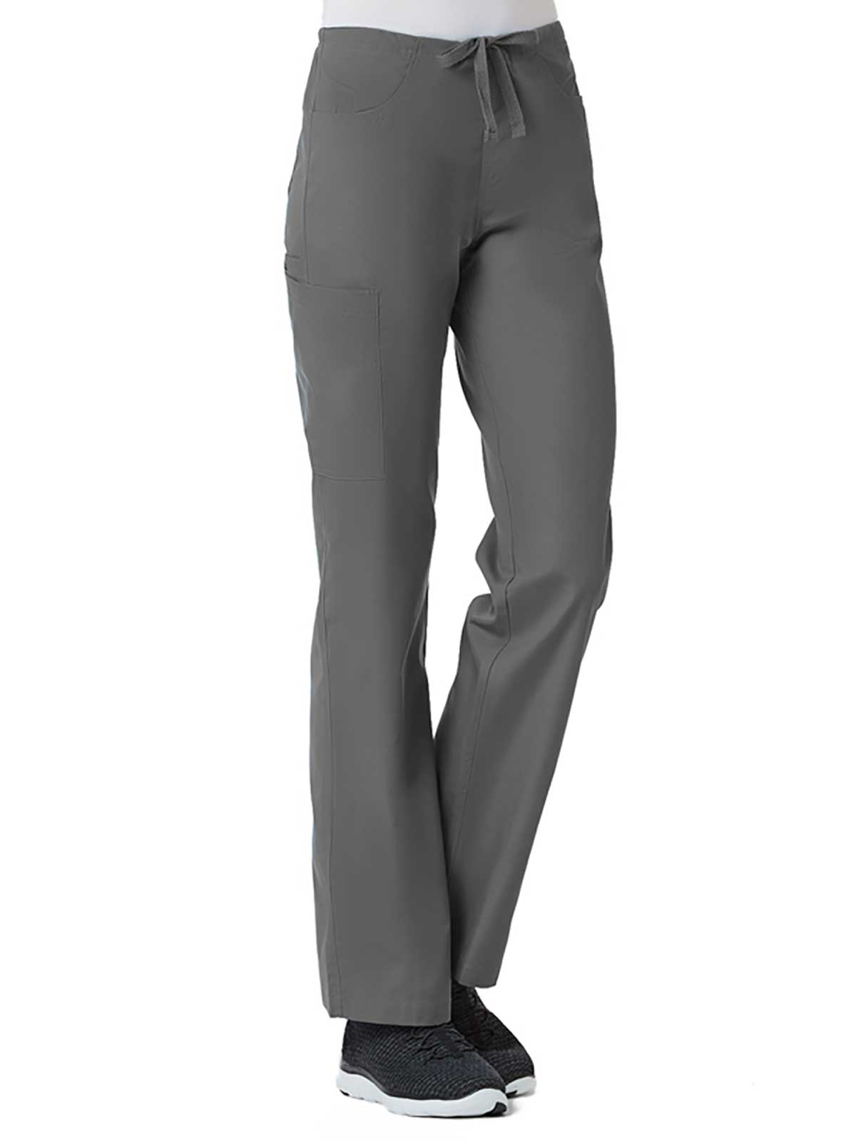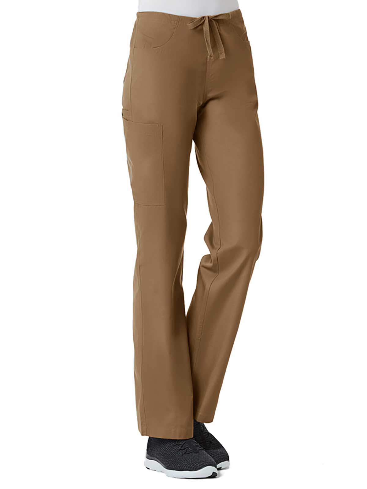 "*Ladies straight leg with flat front and elastic back waist *Two front slash pockets and two back patch pockets *One cargo pocket and inner cell pocket *Dyed-to-match drawstring *Side vents"