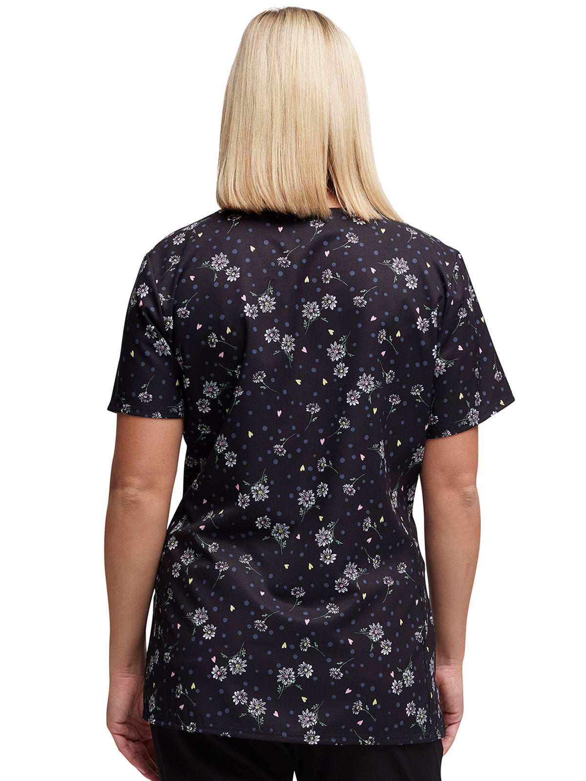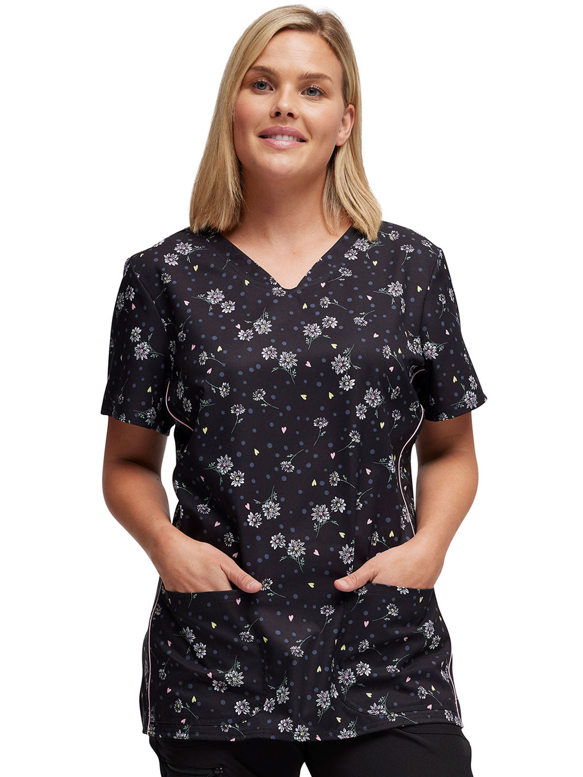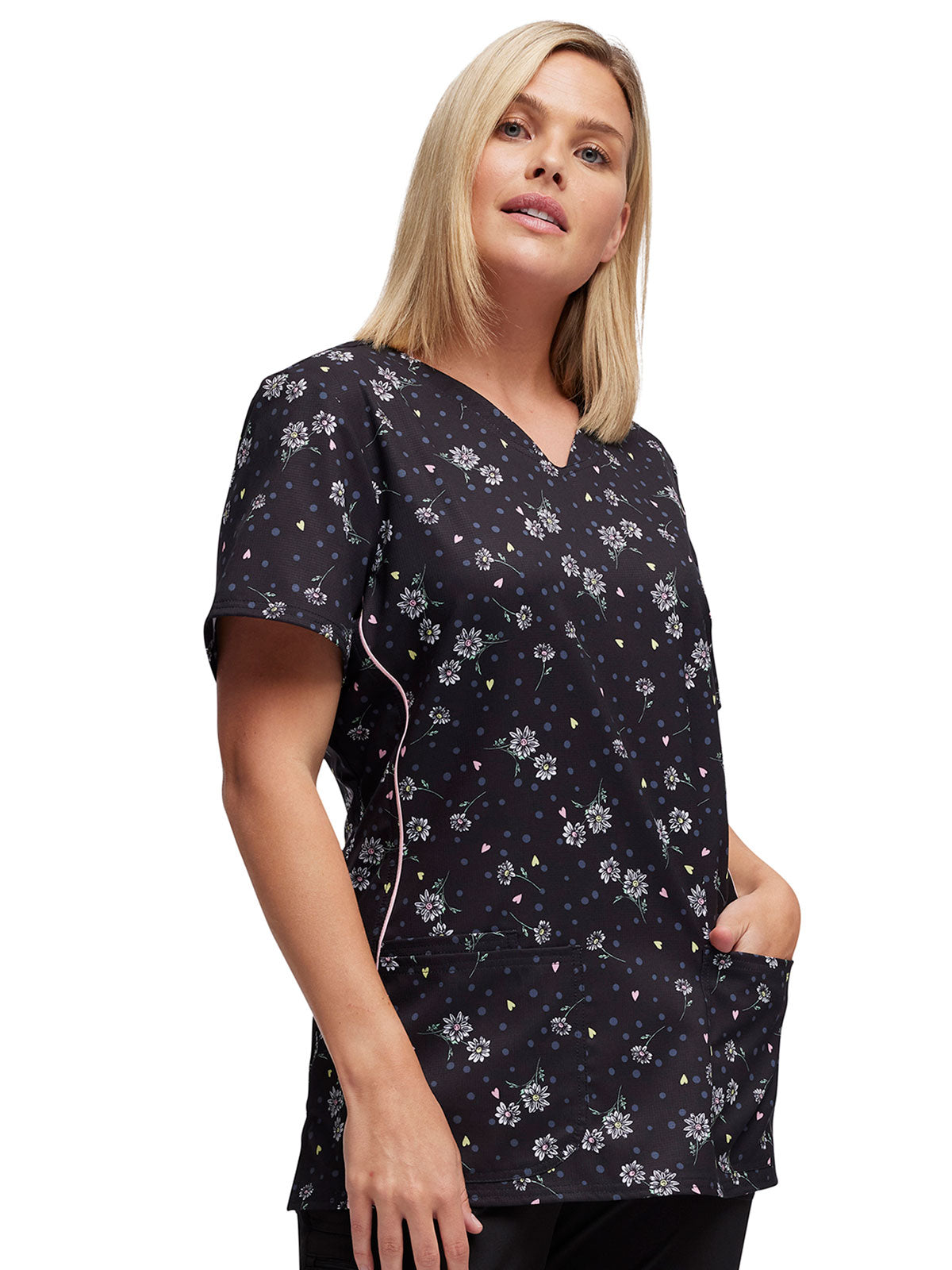 This v-neck print top features a shaped neckband, two rounded patch pockets, a small interior pocket on the wearer's right, and Heartsoul signature woven tape along the back neckline. There are front and back princess seams for a more flattering shape plus contrast piping along front princess seams for a pop of color. Side vents for added comfort and mobility and double-needle topstitching complete the loook. Contemporary fit. Center back length: 26".