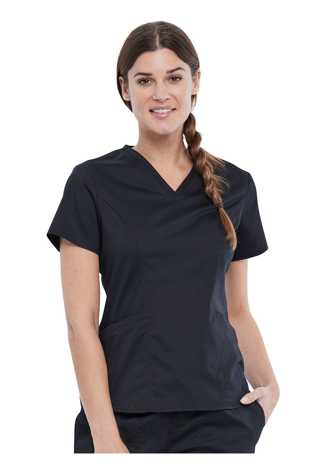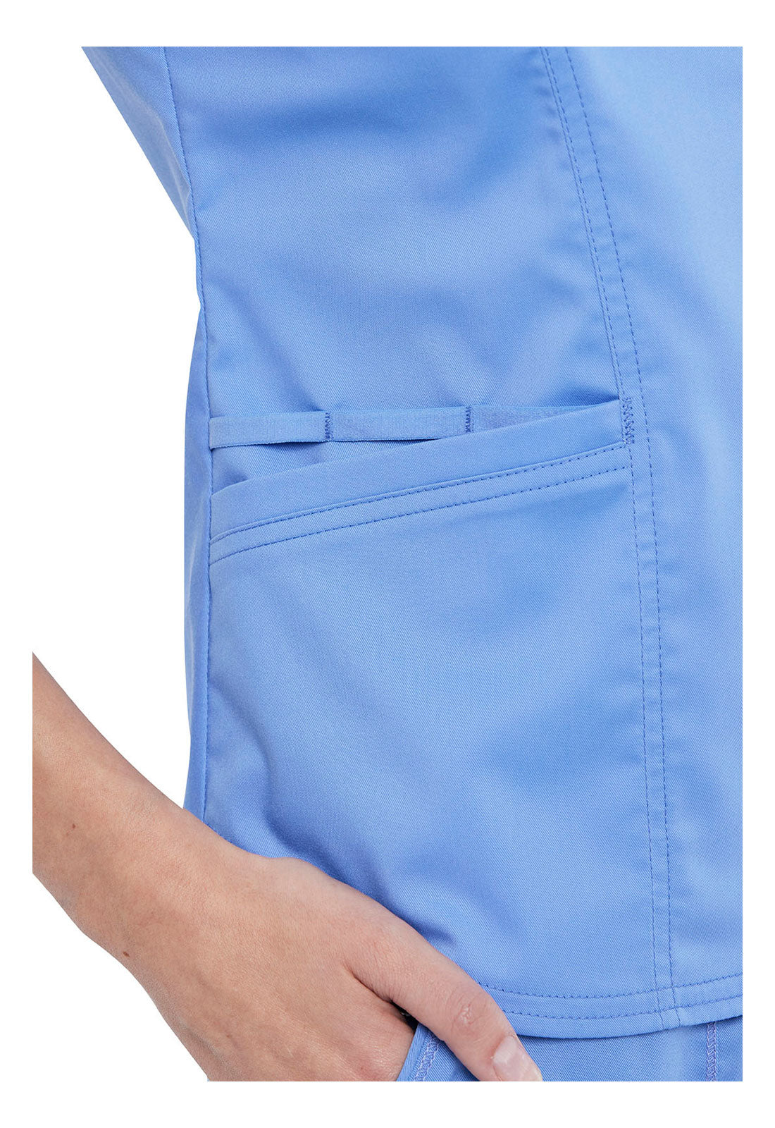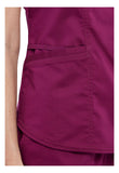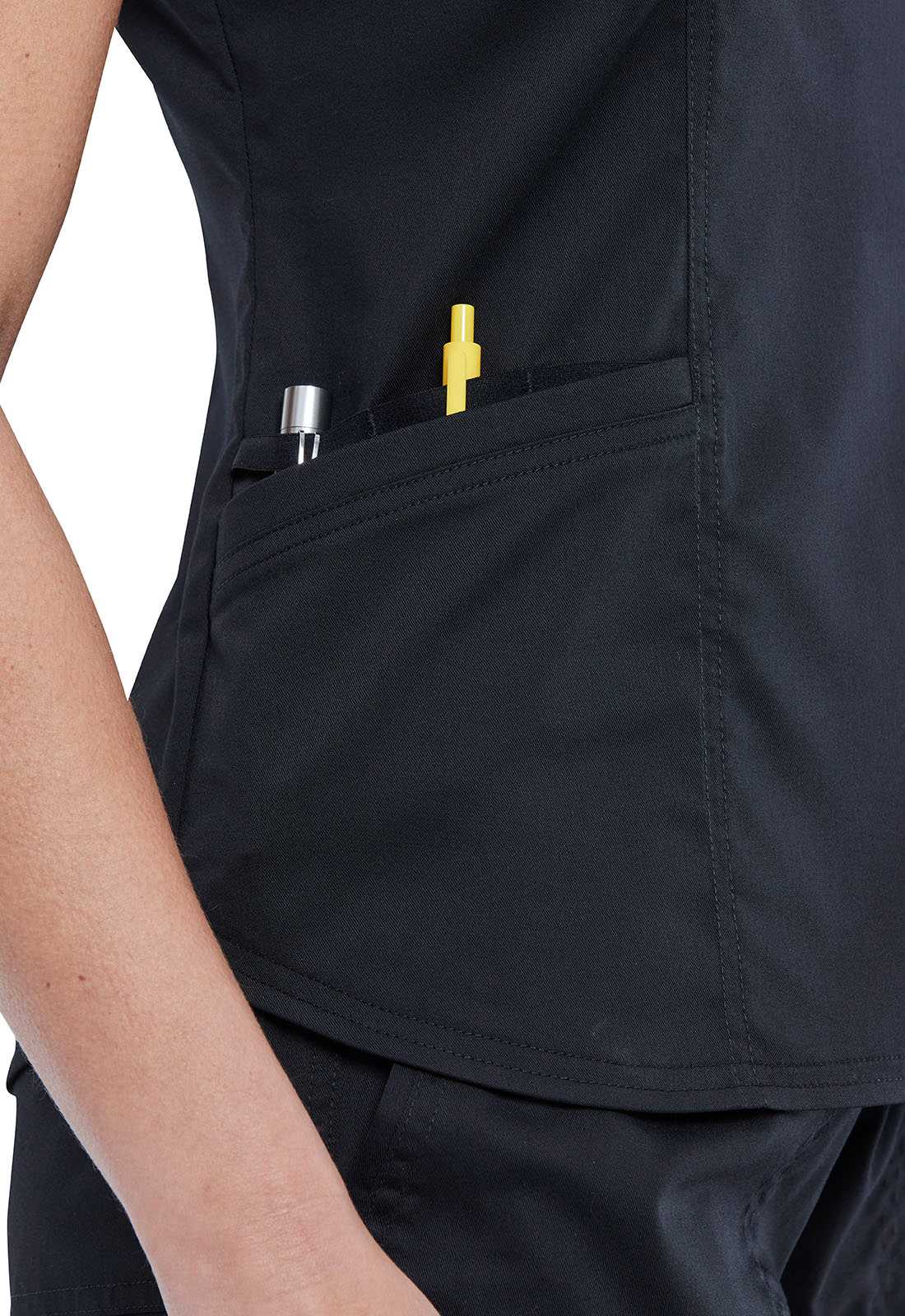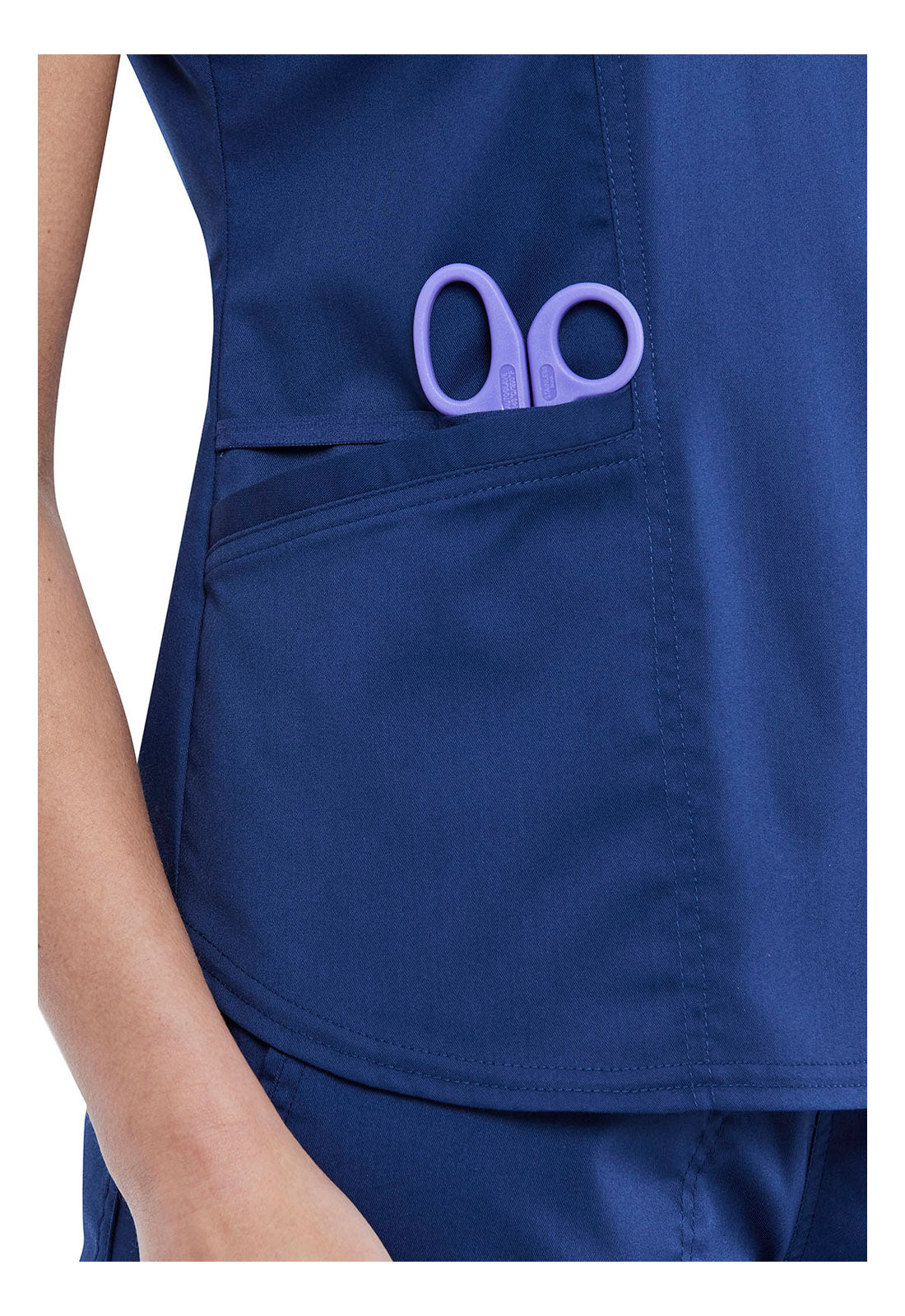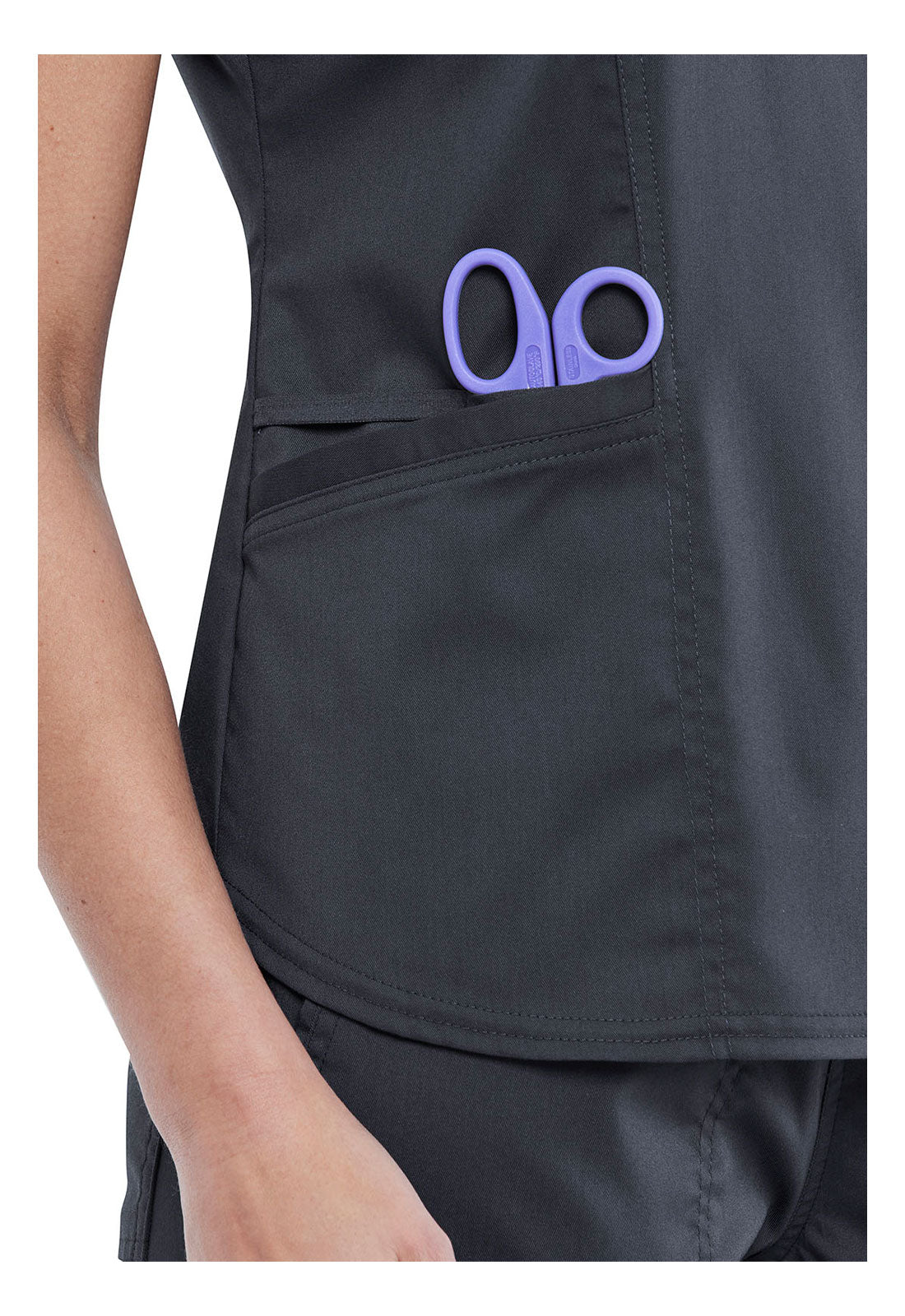 This petite length V-neck top features front and back princess seams, elastic instrument loops on the wearers right and a shirttail hem. The top also includes two roomy front inset pockets. Modern Classic fit. Center back length: 24"