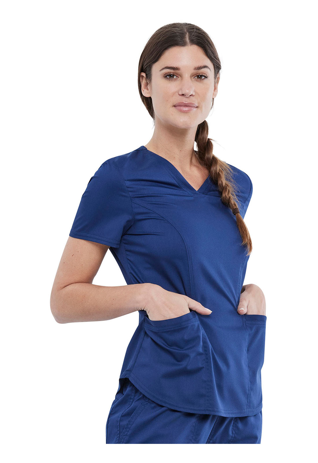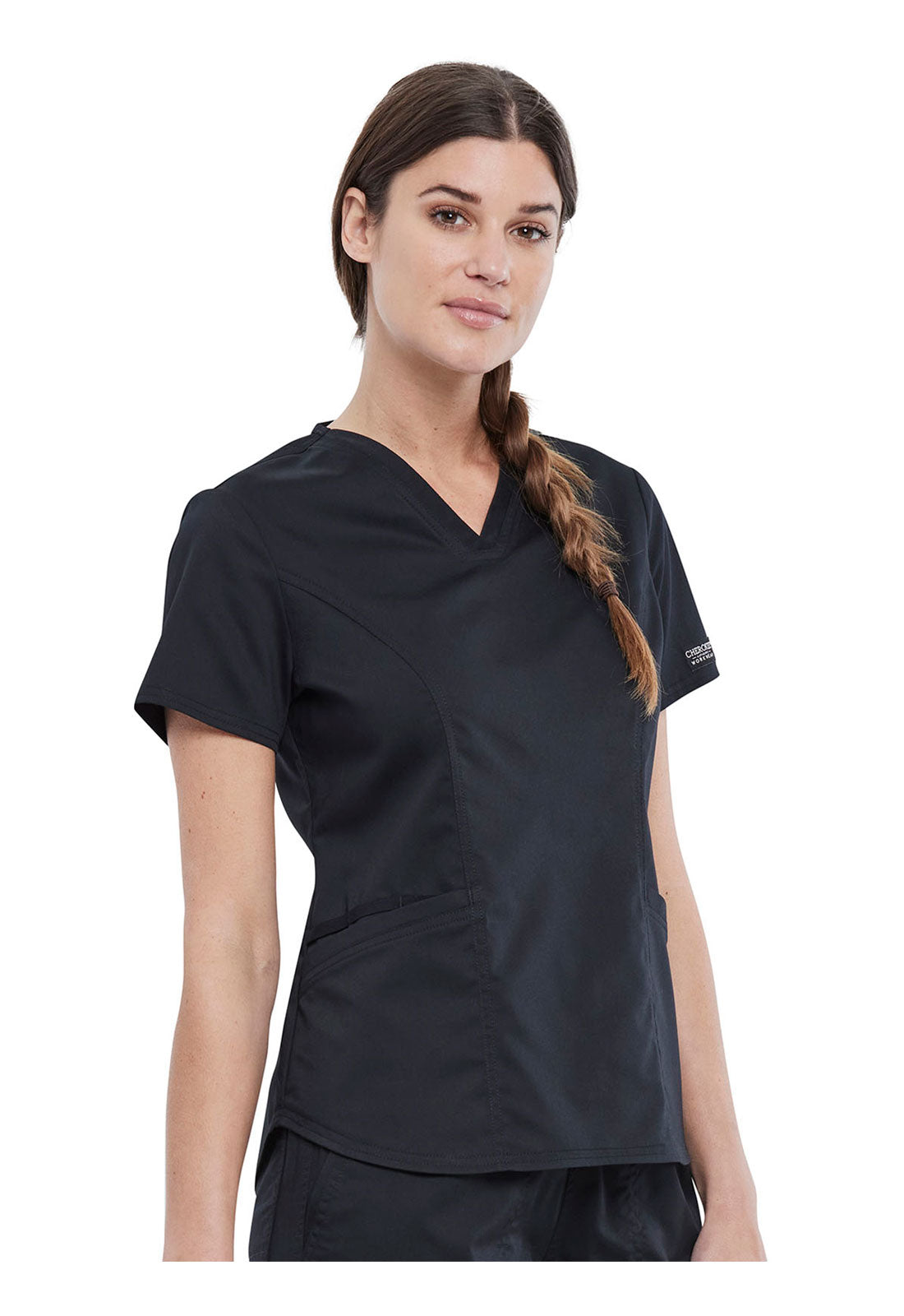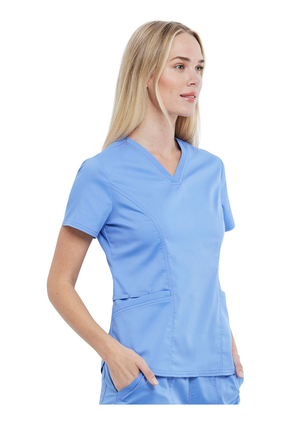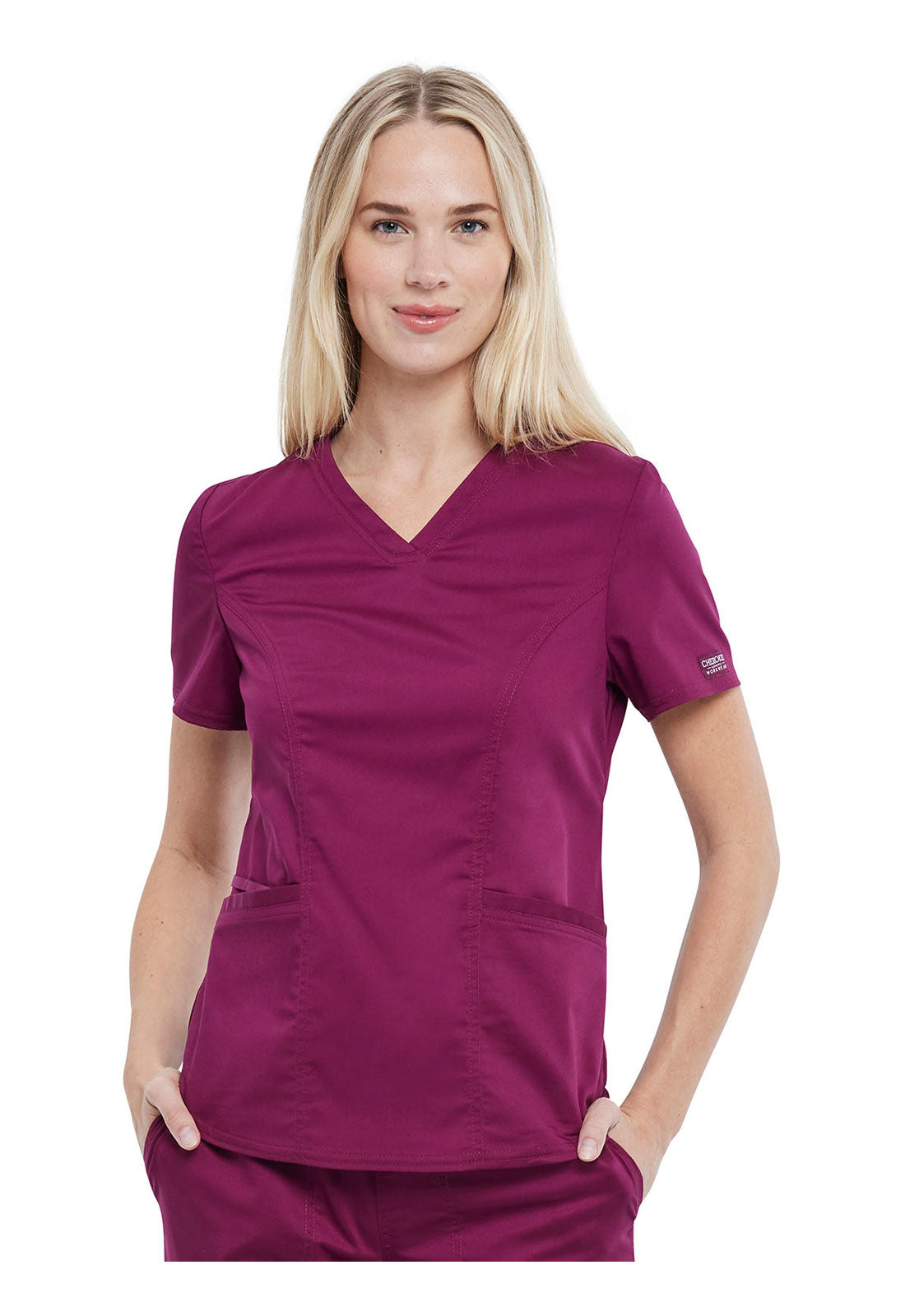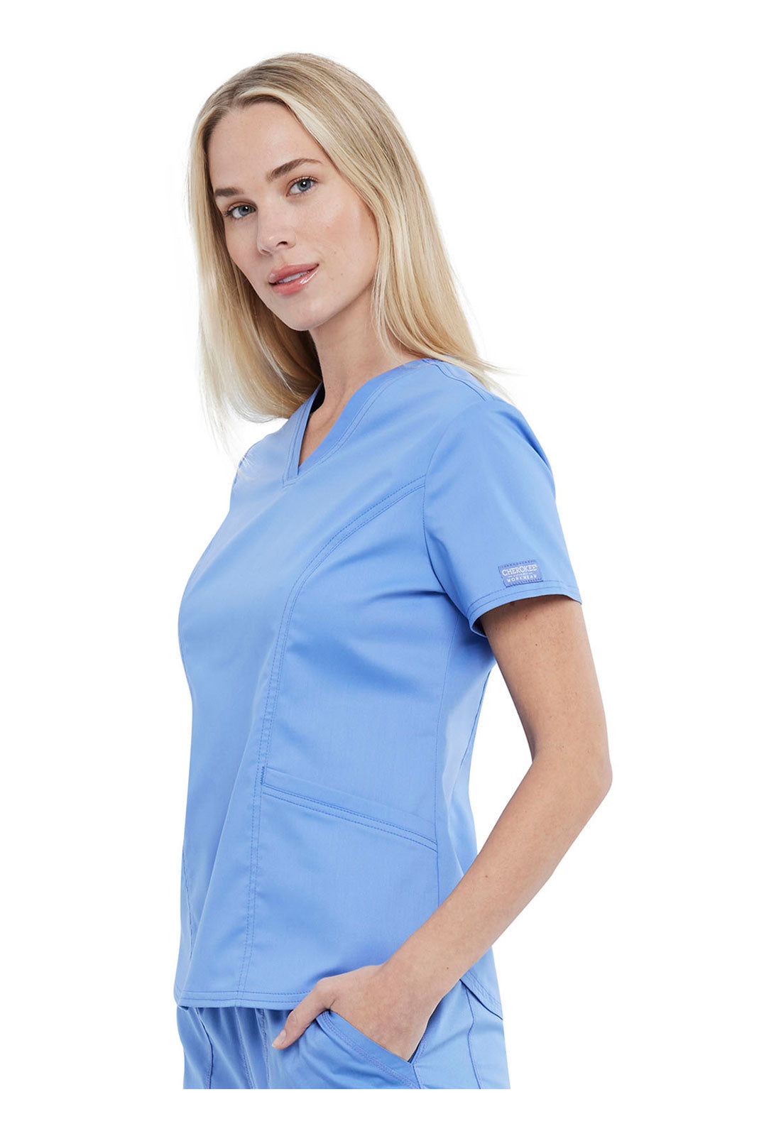 This petite length V-neck top features front and back princess seams, elastic instrument loops on the wearers right and a shirttail hem. The top also includes two roomy front inset pockets. Modern Classic fit. Center back length: 24"