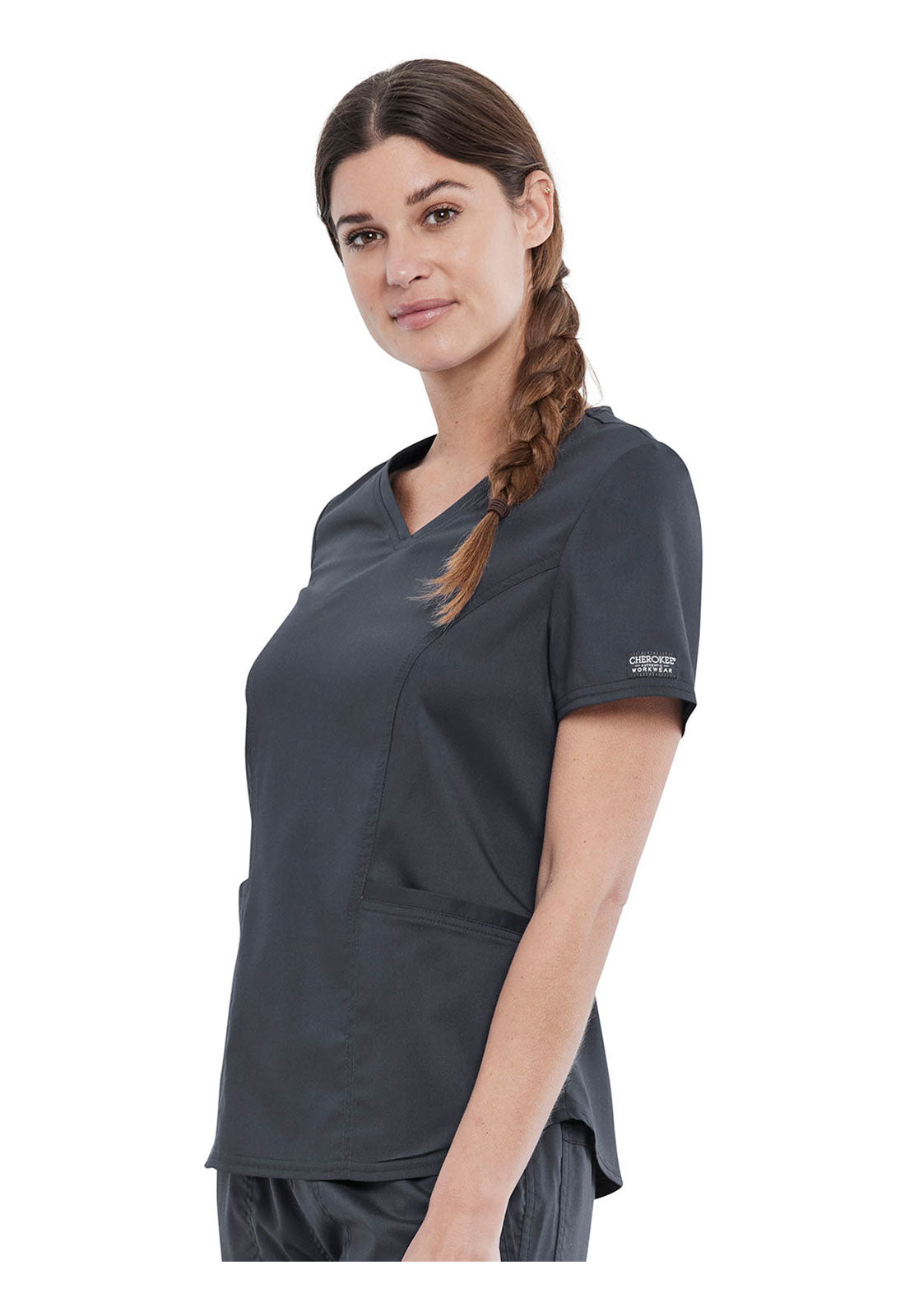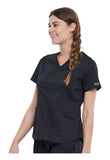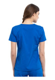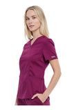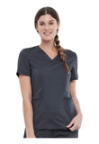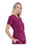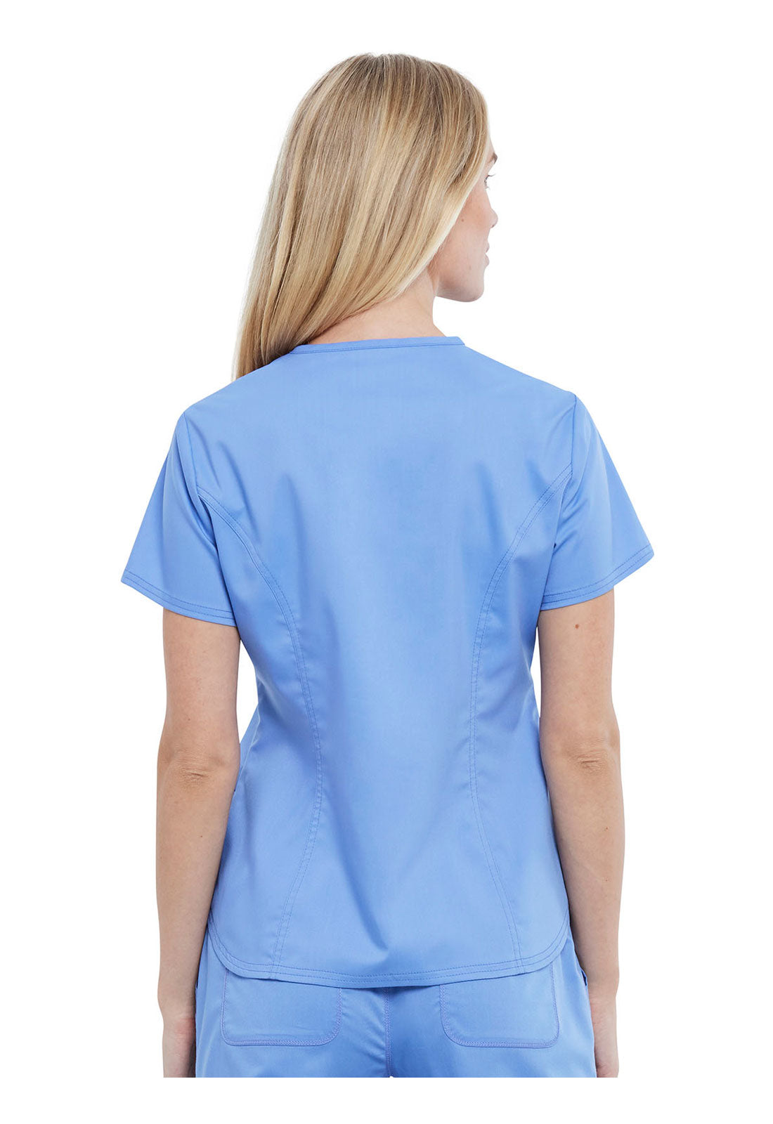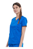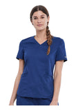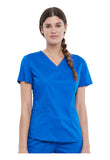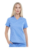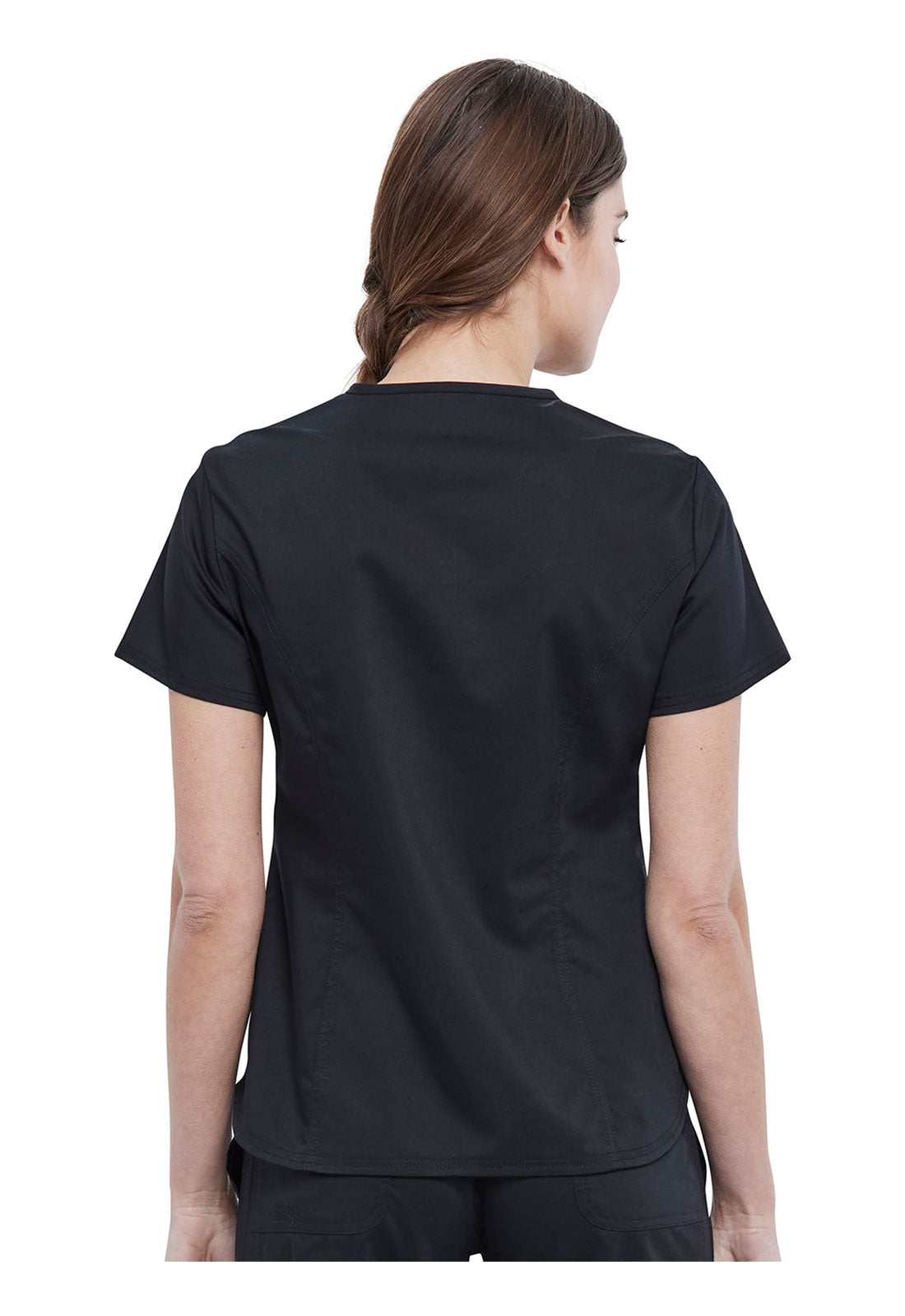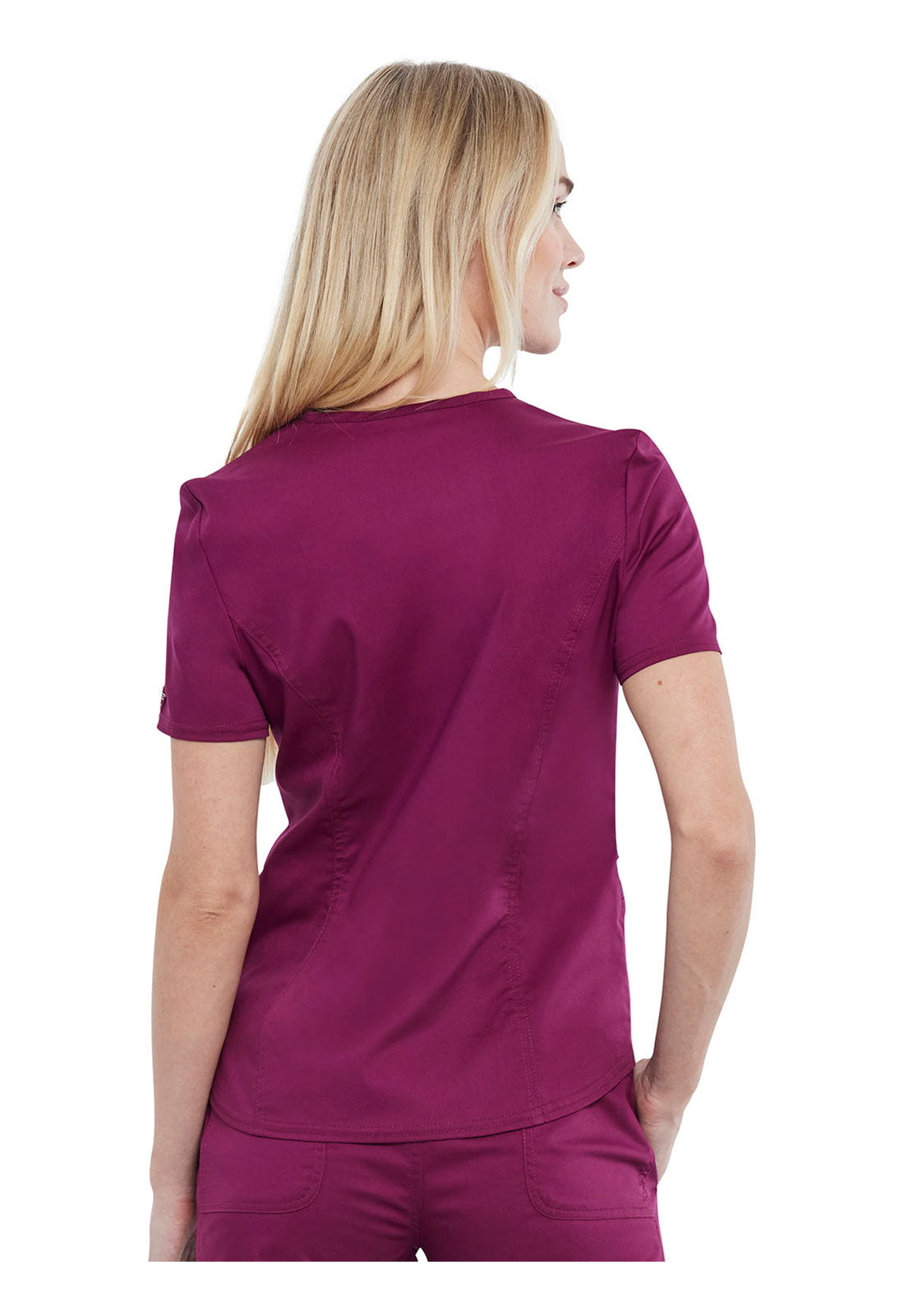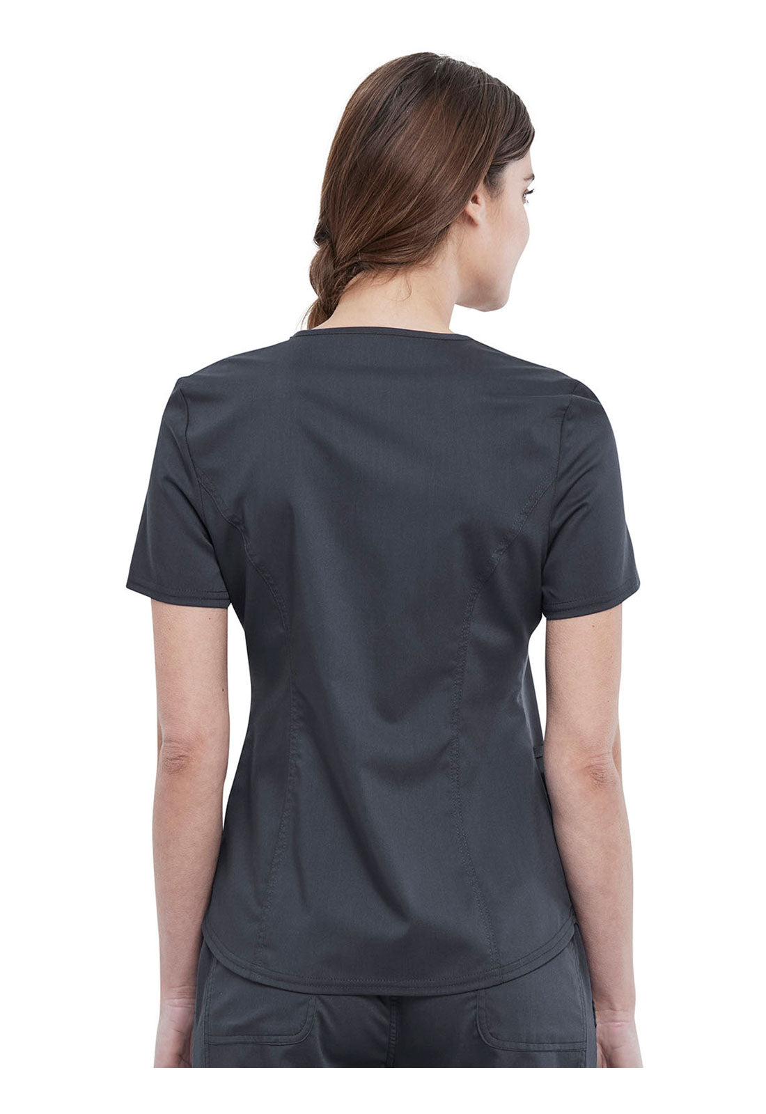 This petite length V-neck top features front and back princess seams, elastic instrument loops on the wearers right and a shirttail hem. The top also includes two roomy front inset pockets. Modern Classic fit. Center back length: 24"