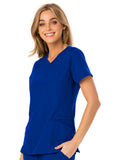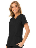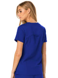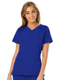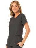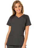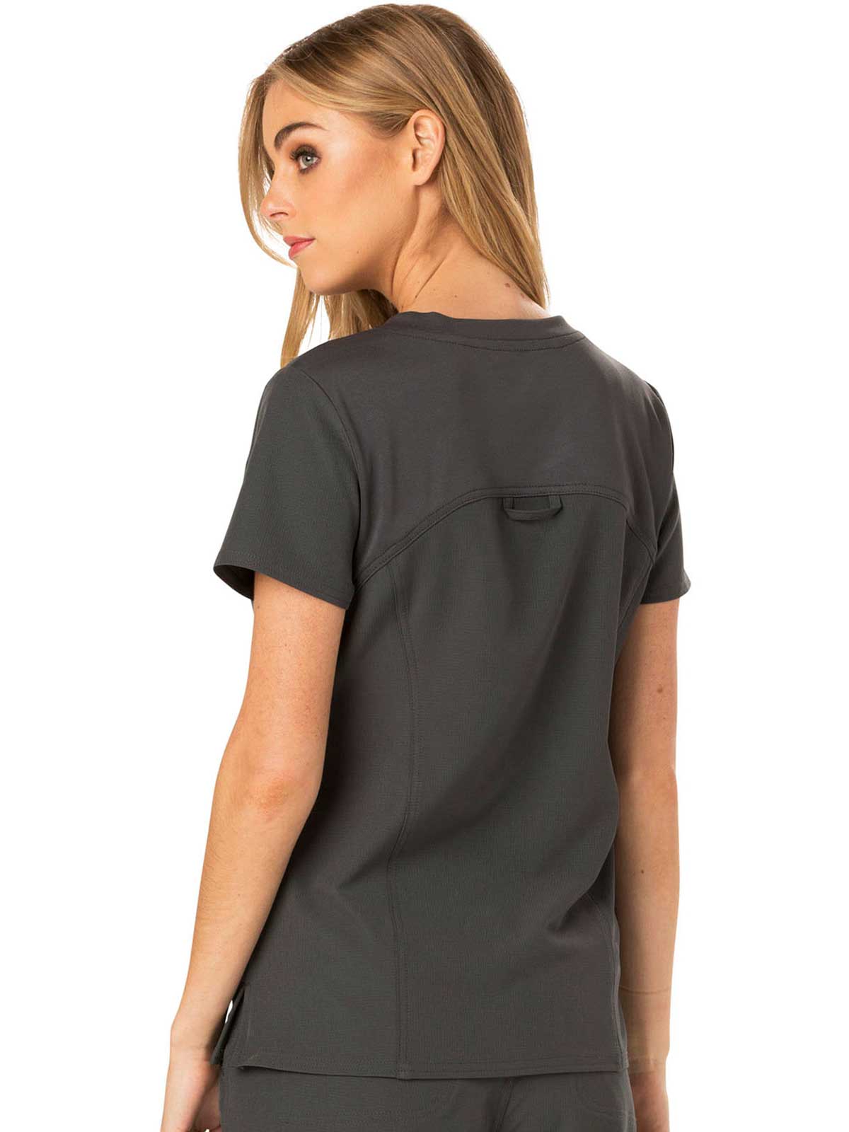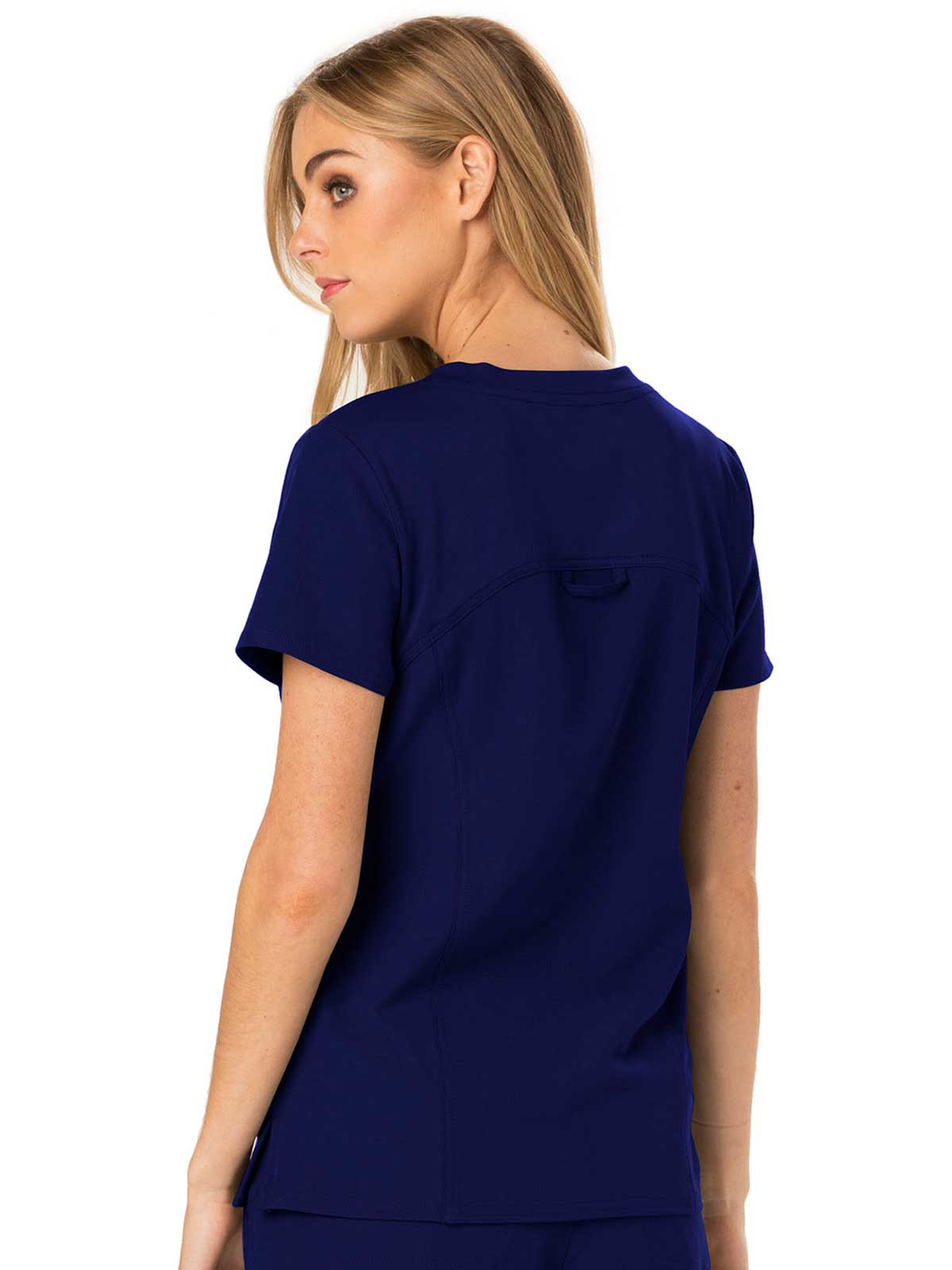 A Contemporary fit V-neck top features a rib-knit neckband and yokes, a signature triple-heart heat transfer and side vents with heart grommet detail. Also featured are rounded patch pockets (the left with instrument loops), a hidden side pocket with an invisible zipper, front and back princess seams, signature woven tape along the back neckline and double-needle topstitching. Center back length: 26 1/2?