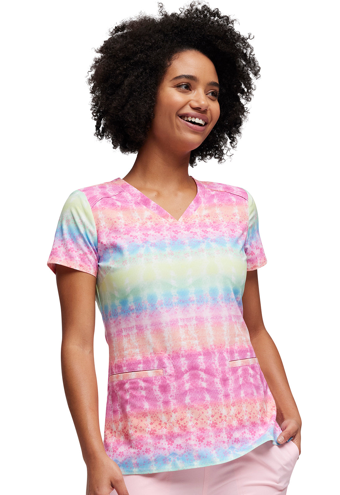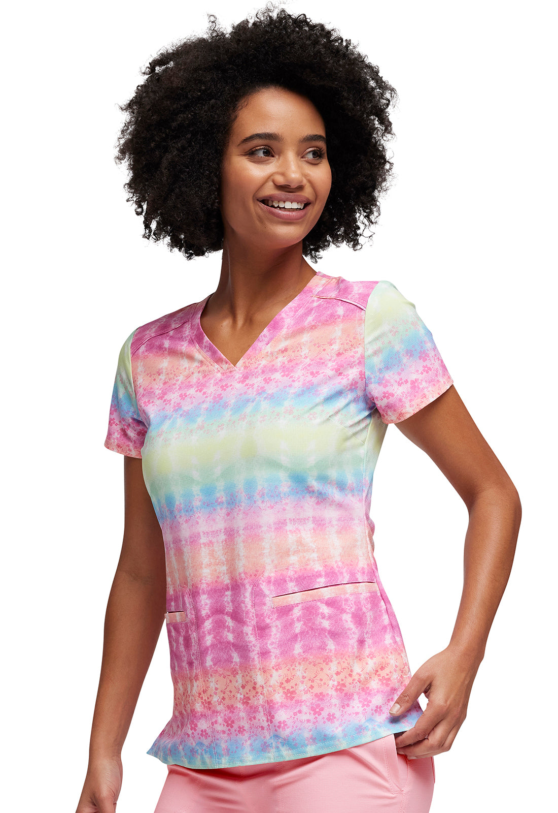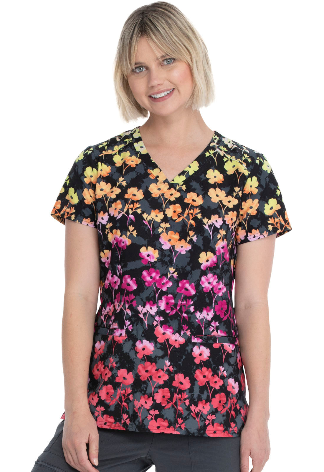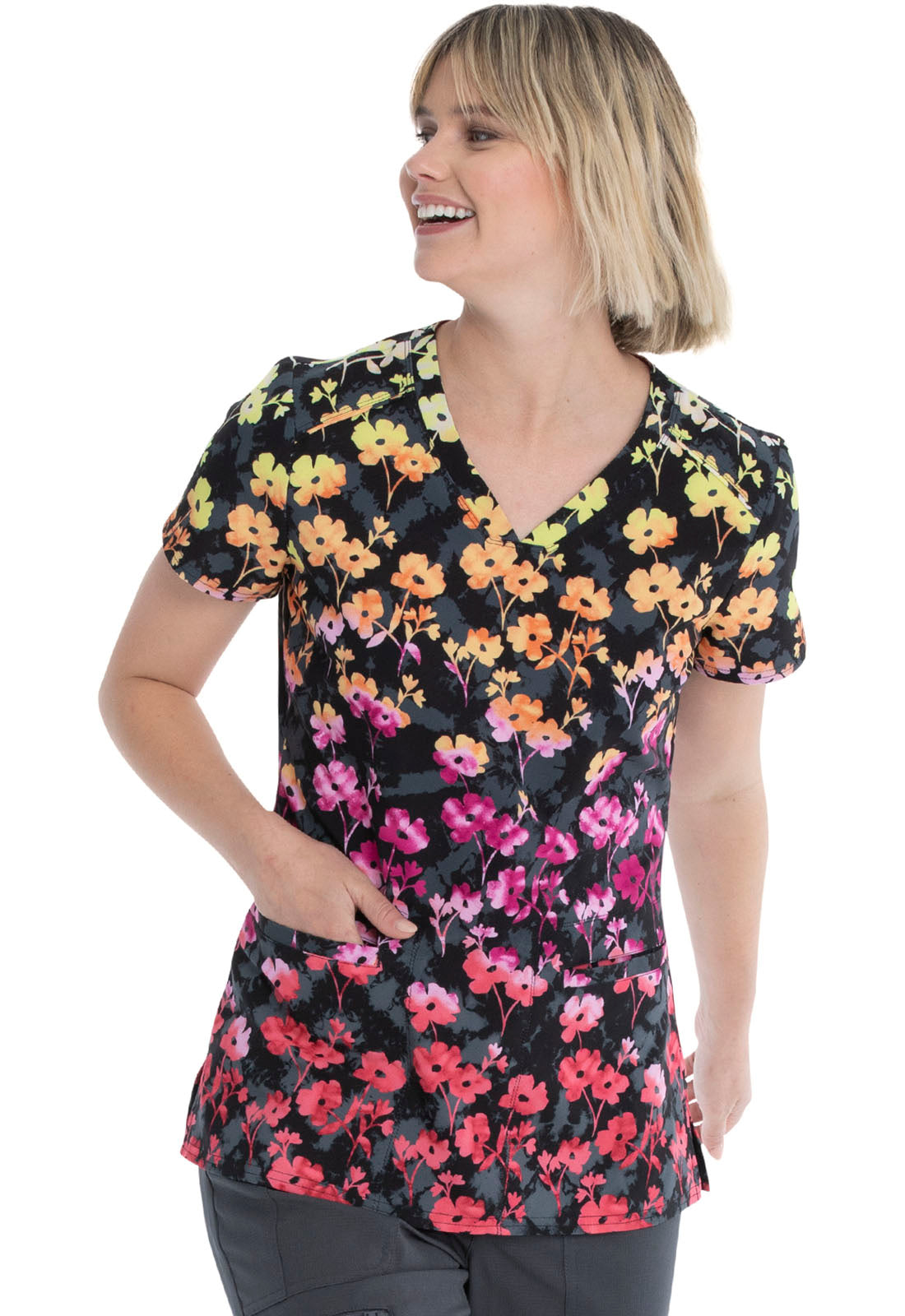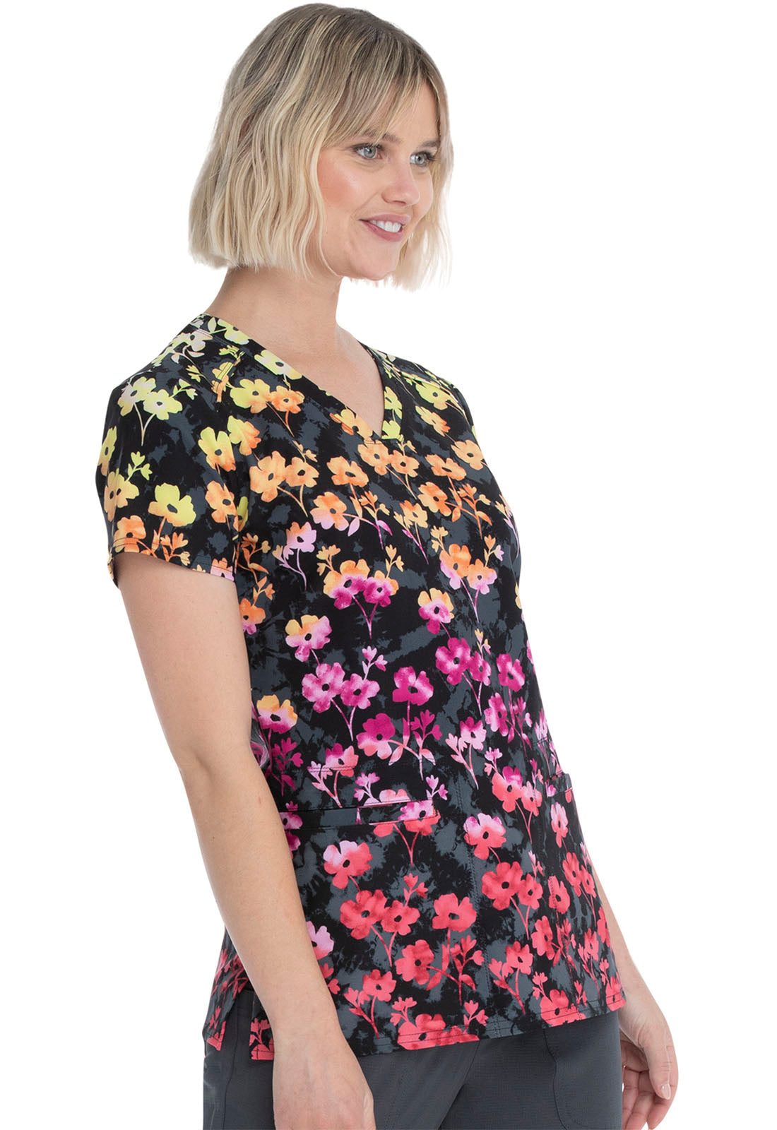 This V-neck print top features front and back yoke seams with piping, bust darts for shaping, side vents for ease of movement plus two front half welt pockets. Double needle topstitching and rounded hem complete the look. Contemporary fit. Center back len