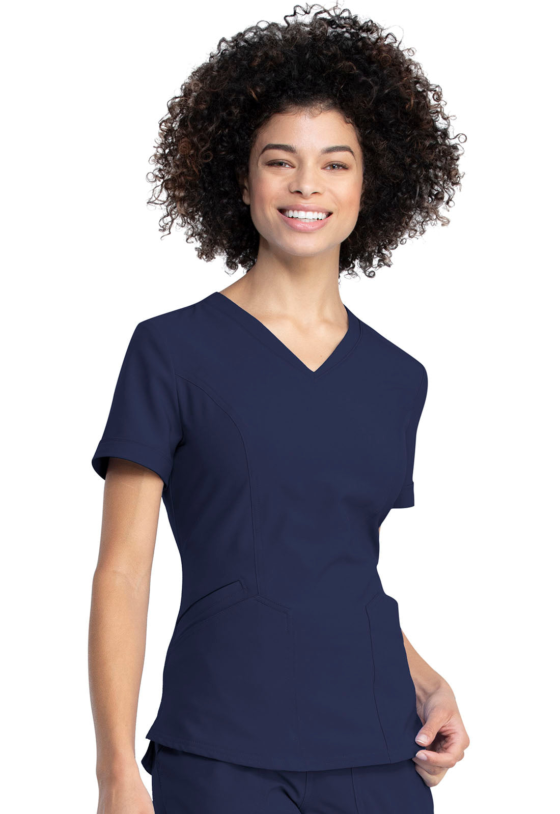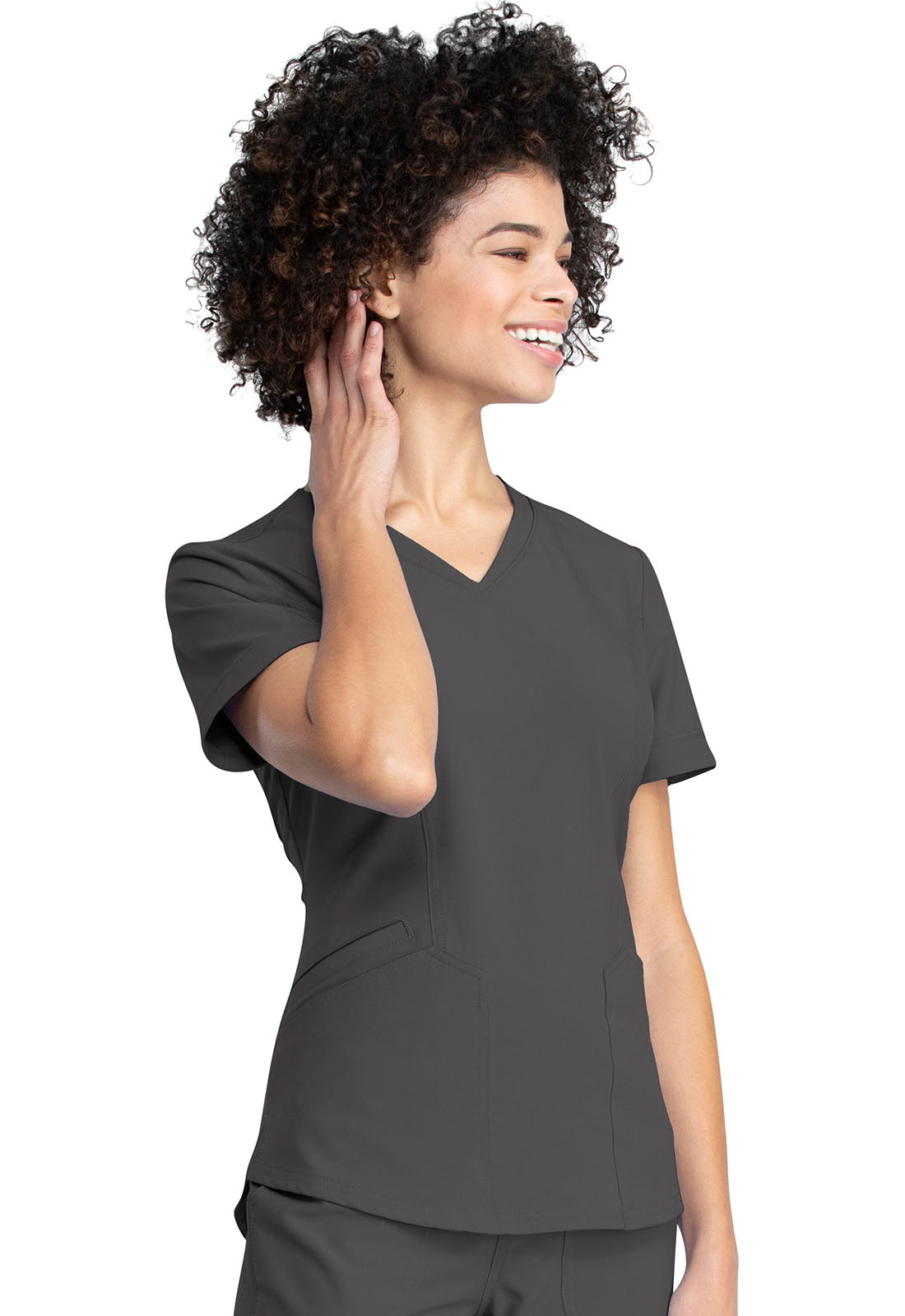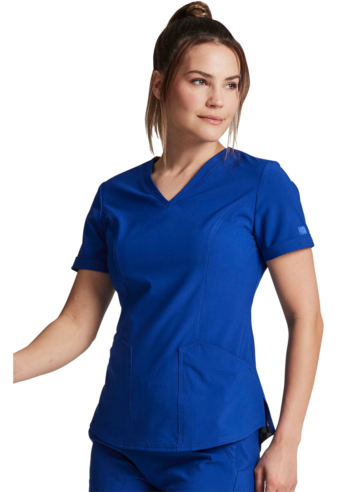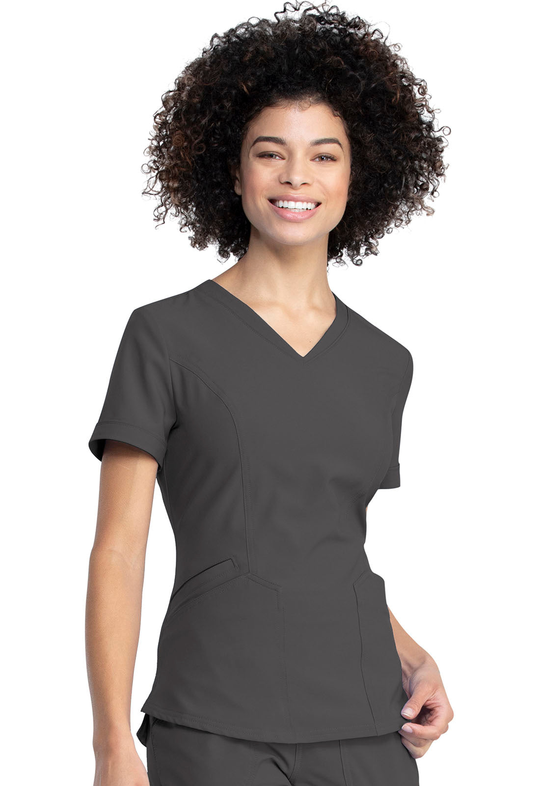 This Contemporary fit, short sleeve, V-neck top is adorned with piping at neck and sleeve bands with flattering princess seams, two roomy stylized patch pockets, one cell phone welt pocket and a shirttail hem complete this beauty. Center back length: 26"