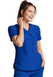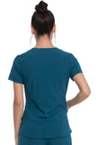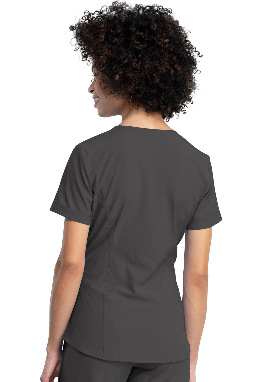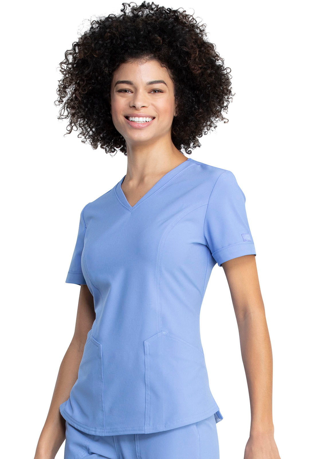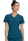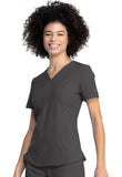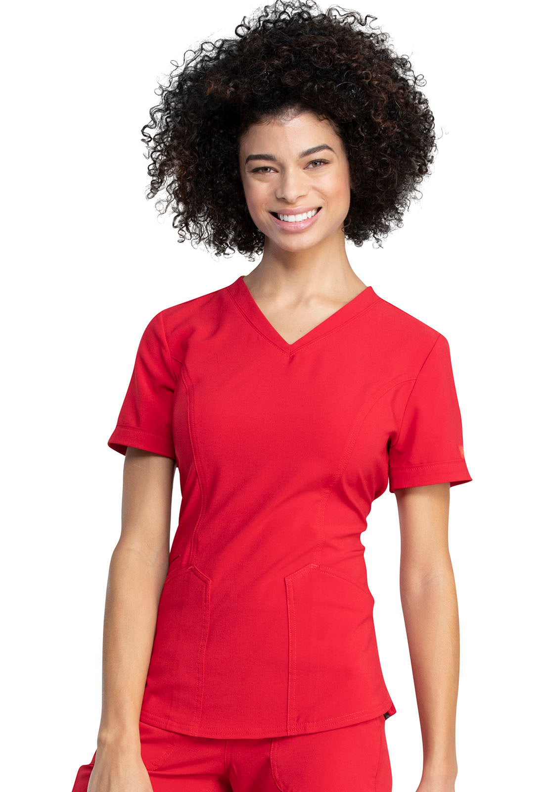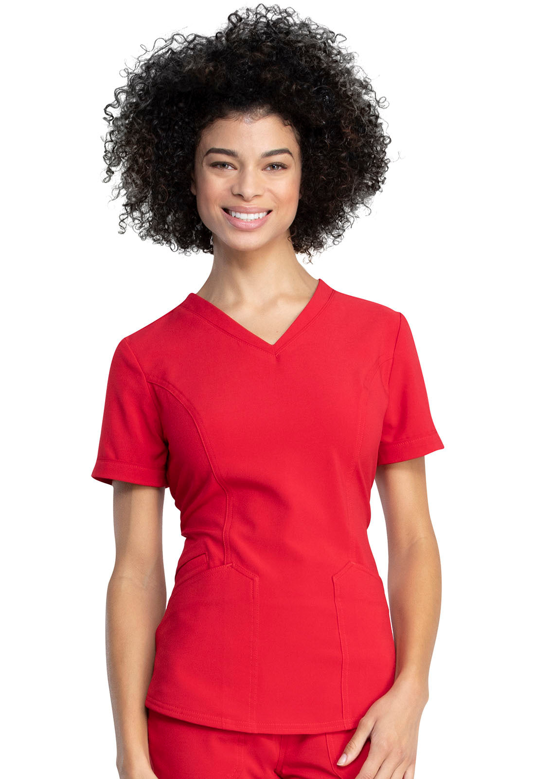 This Contemporary fit, short sleeve, V-neck top is adorned with piping at neck and sleeve bands with flattering princess seams, two roomy stylized patch pockets, one cell phone welt pocket and a shirttail hem complete this beauty. Center back length: 26"