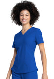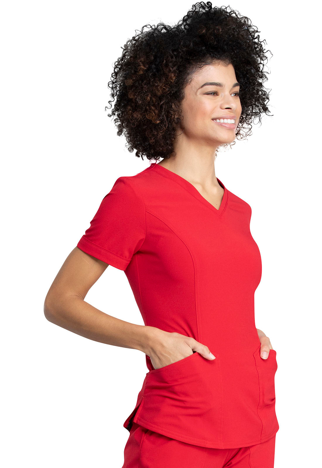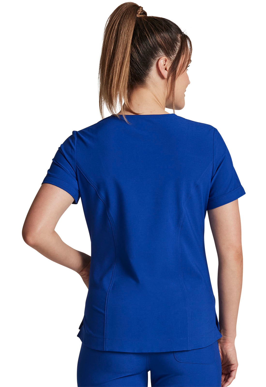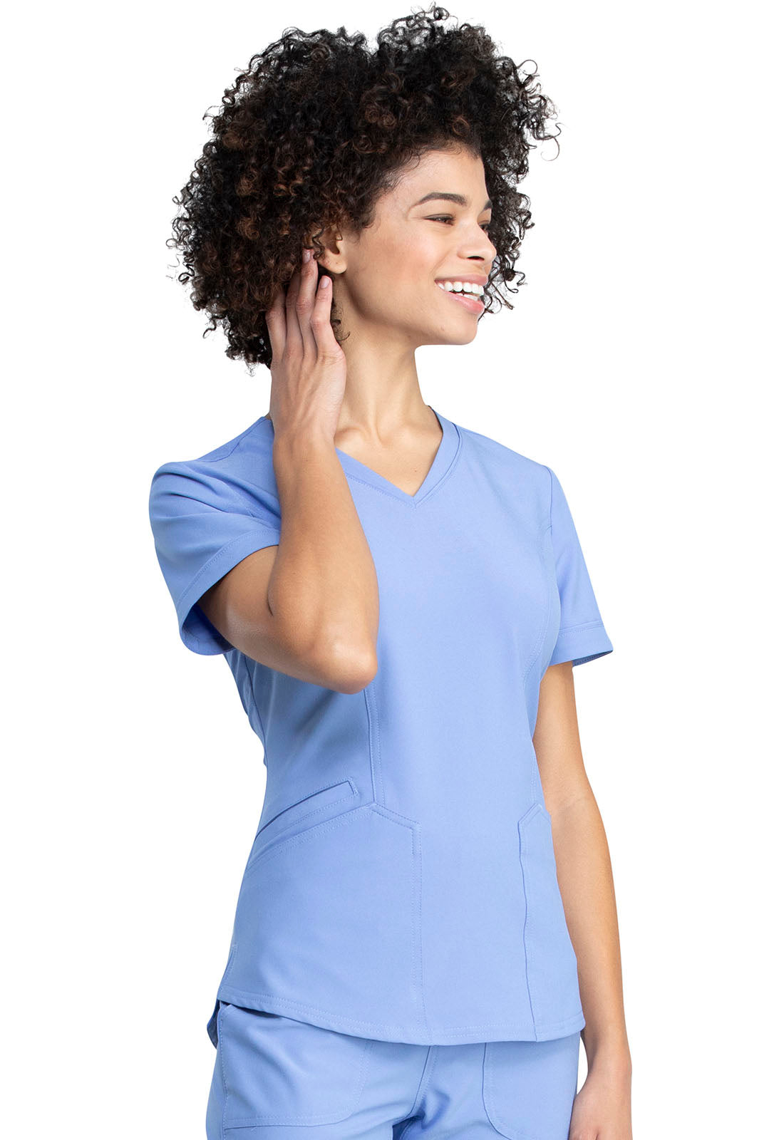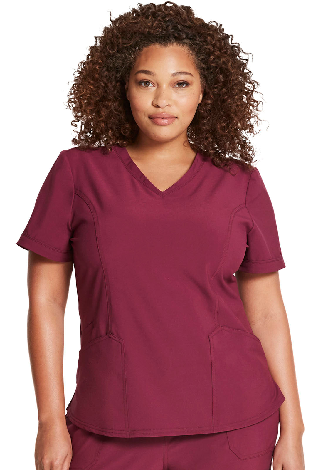This Contemporary fit, short sleeve, V-neck top is adorned with piping at neck and sleeve bands with flattering princess seams, two roomy stylized patch pockets, one cell phone welt pocket and a shirttail hem complete this beauty. Center back length: 26"