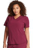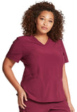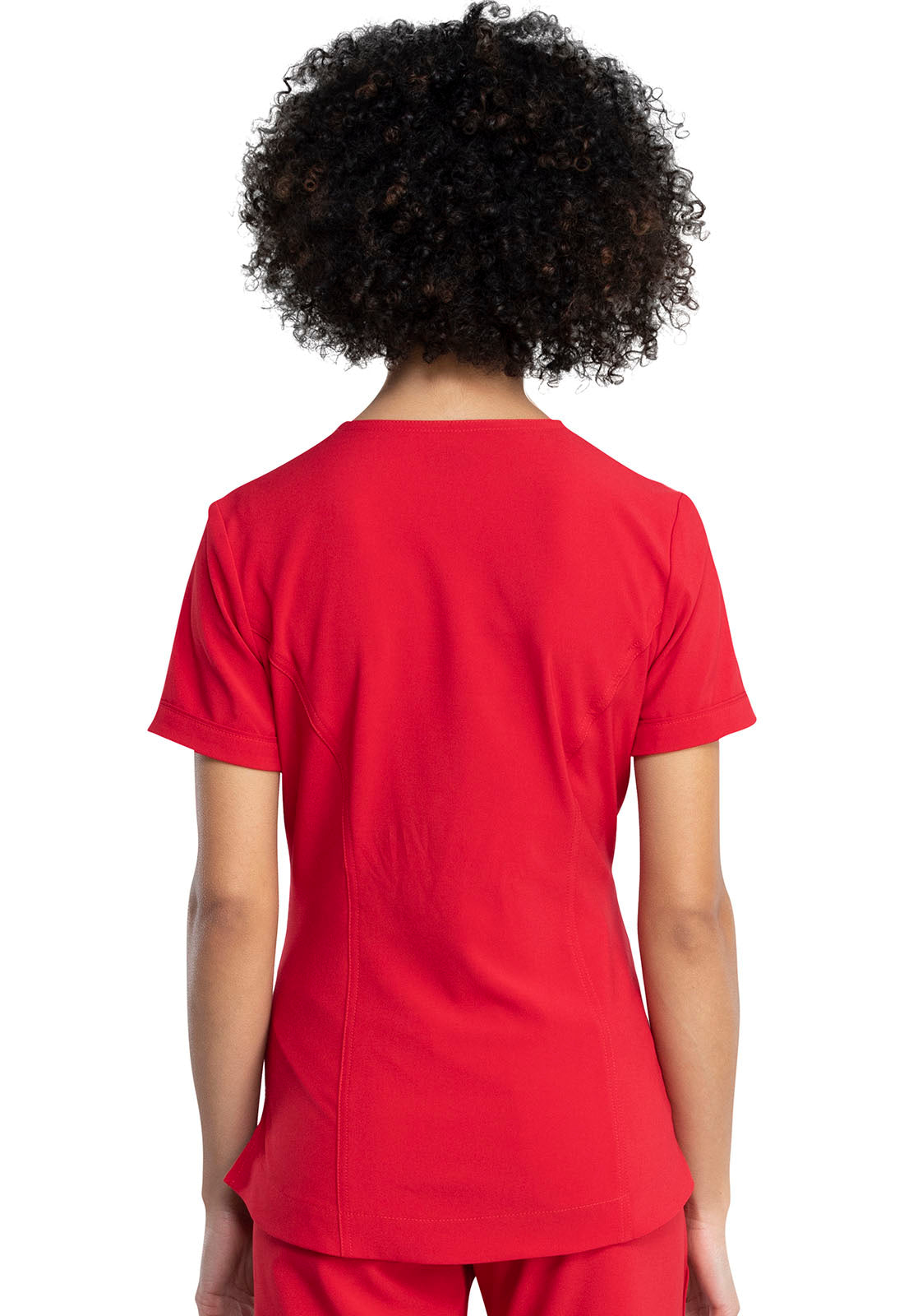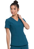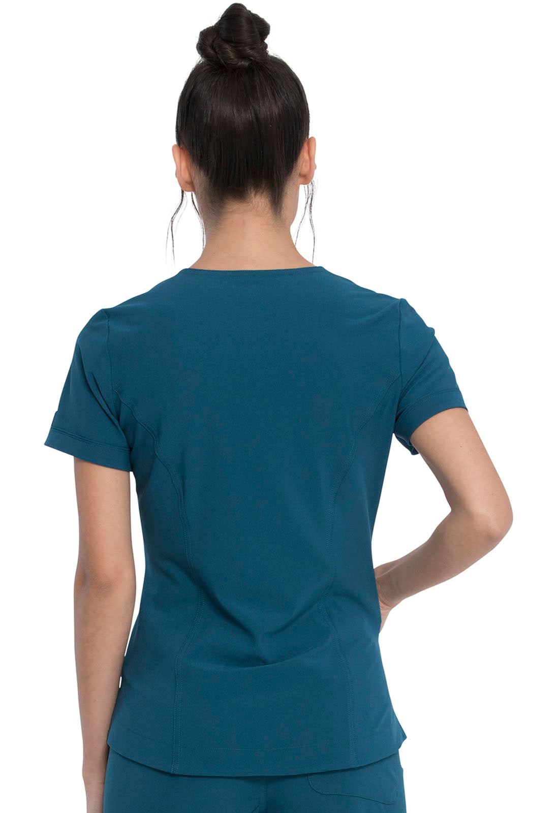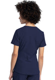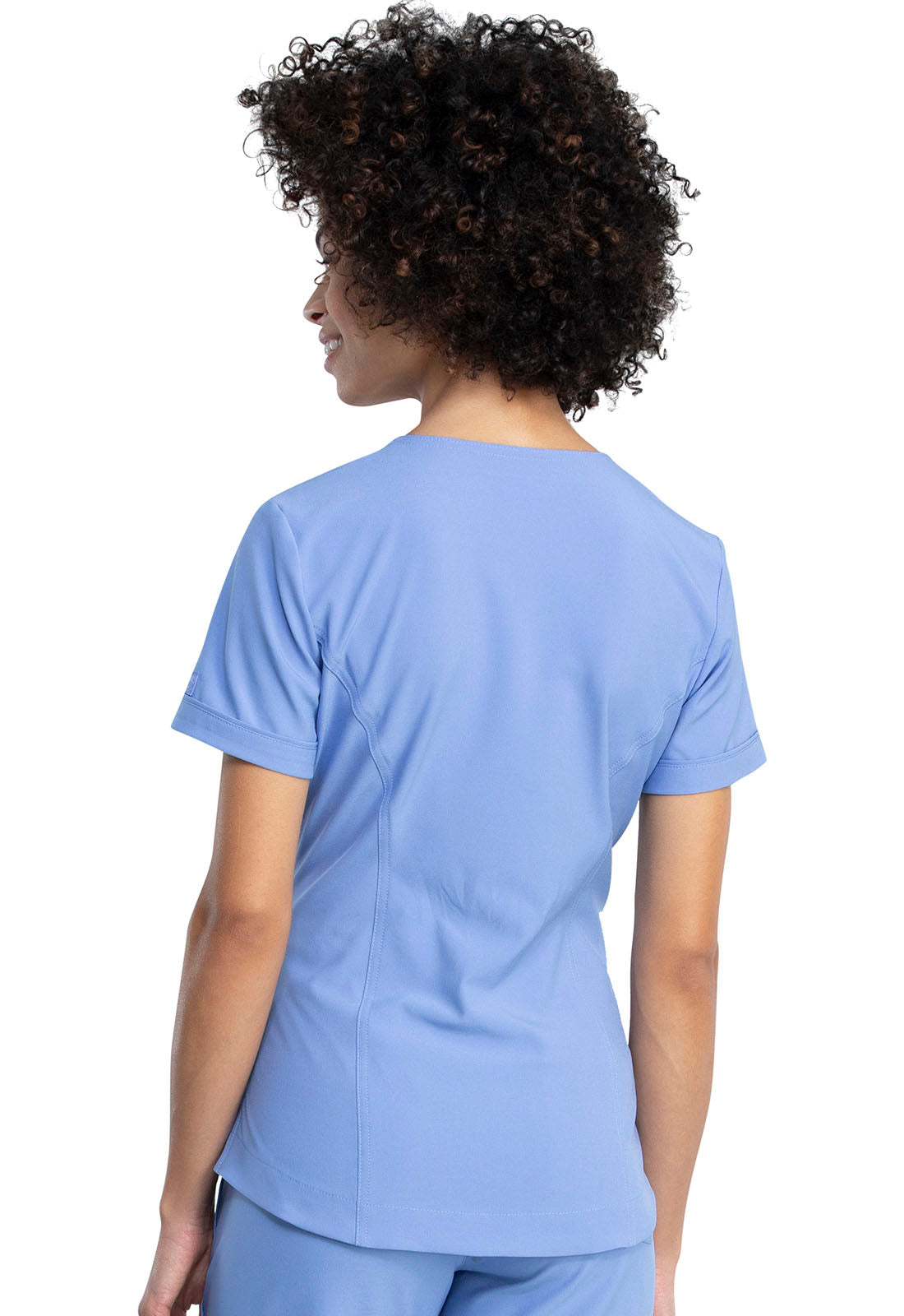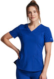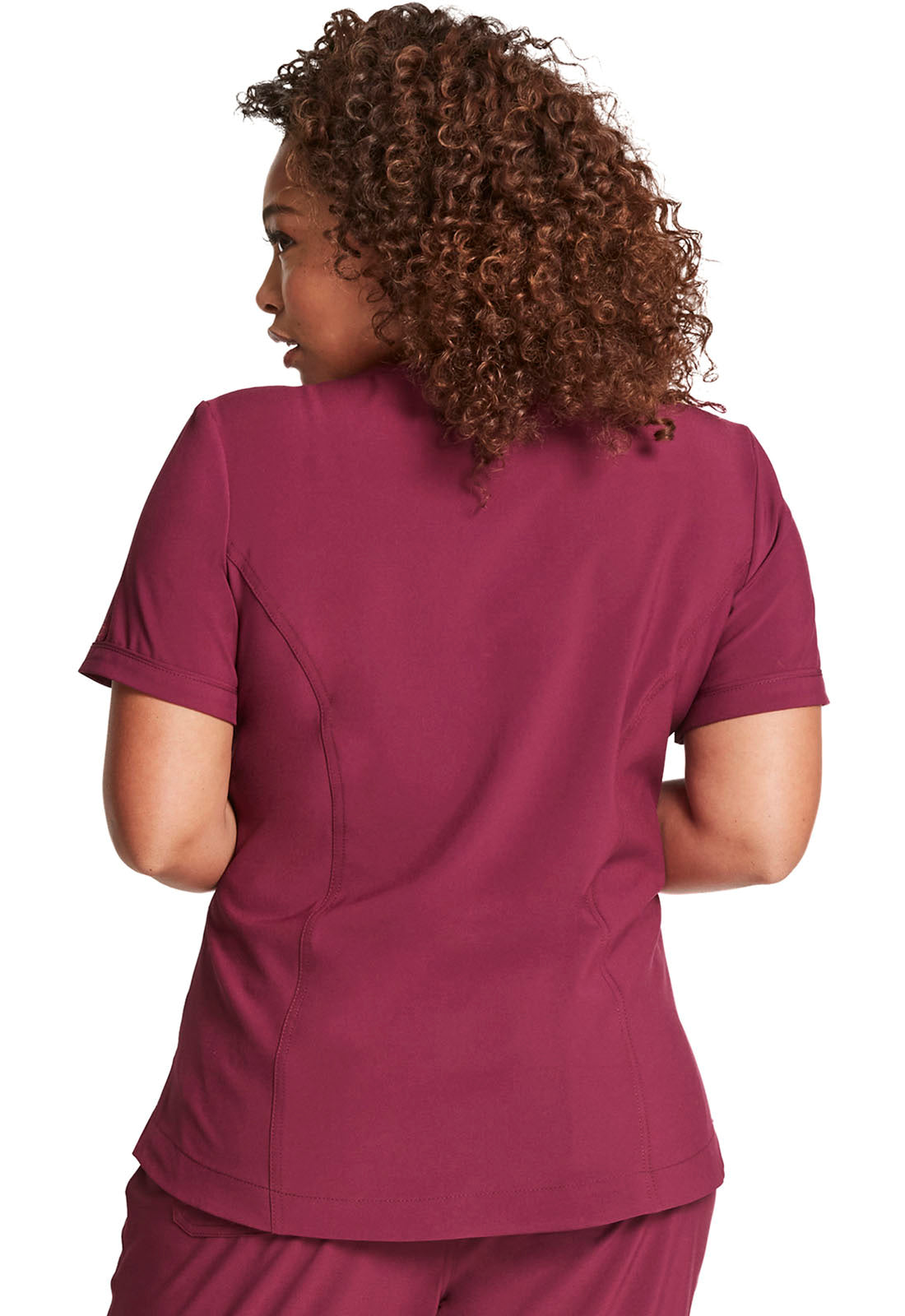 This Contemporary fit, short sleeve, V-neck top is adorned with piping at neck and sleeve bands with flattering princess seams, two roomy stylized patch pockets, one cell phone welt pocket and a shirttail hem complete this beauty. Center back length: 26"