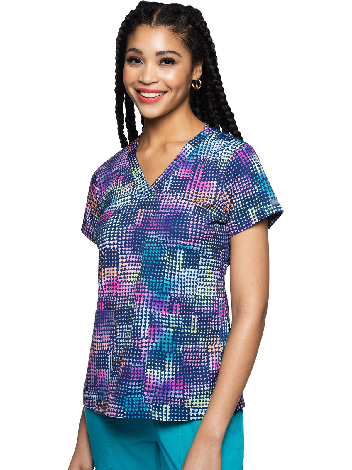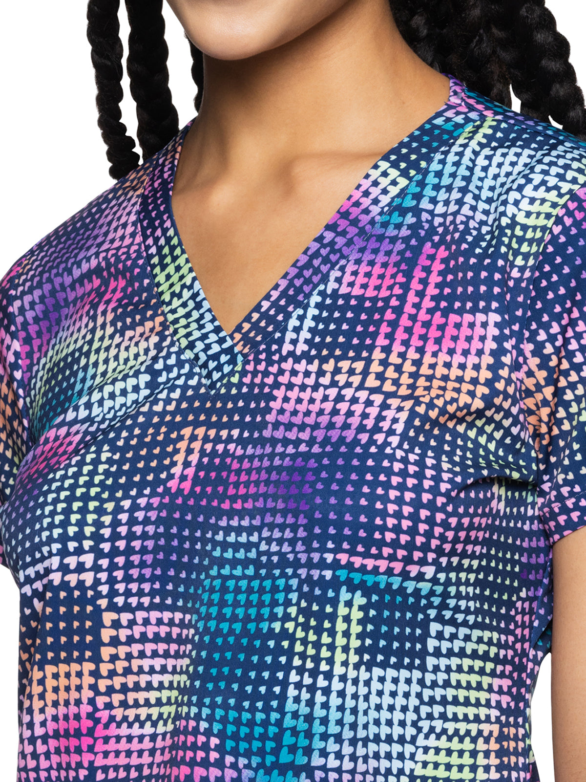 V-neck all-over print top with 2 large patch pockets and a contrast back neck band. Back Length: 26"