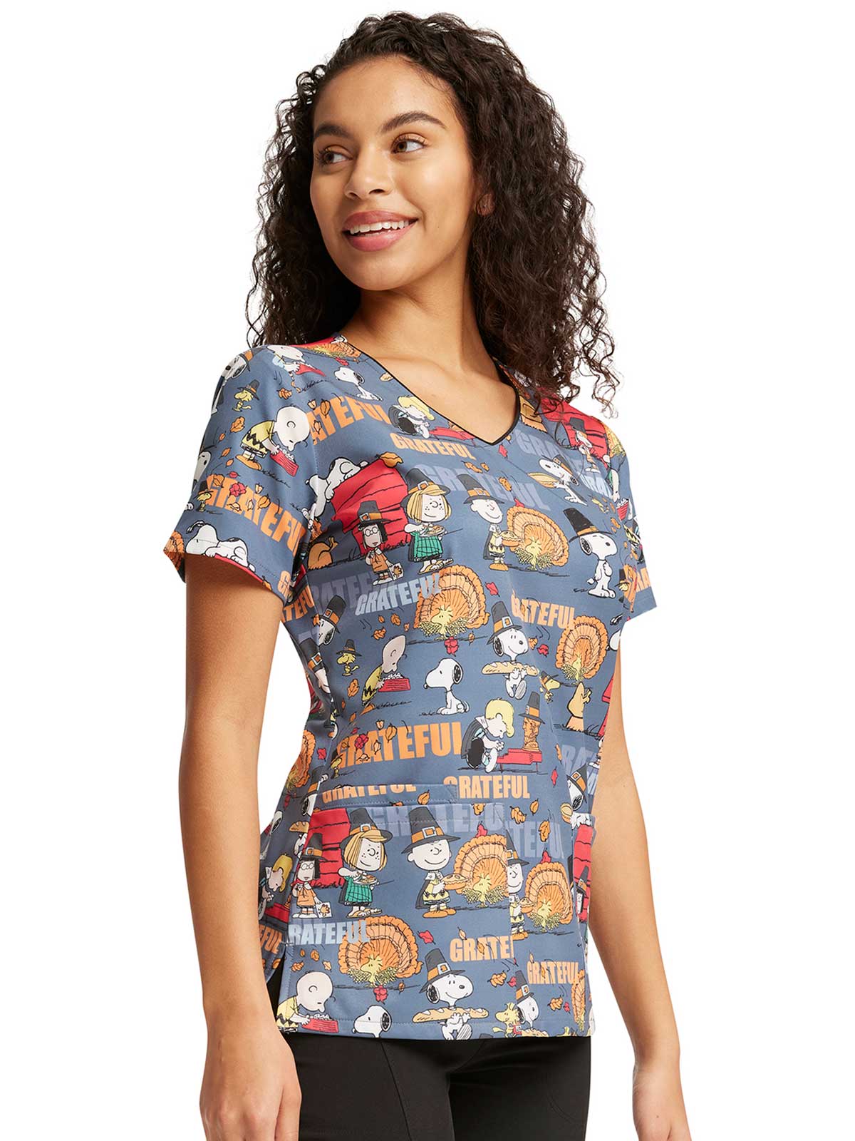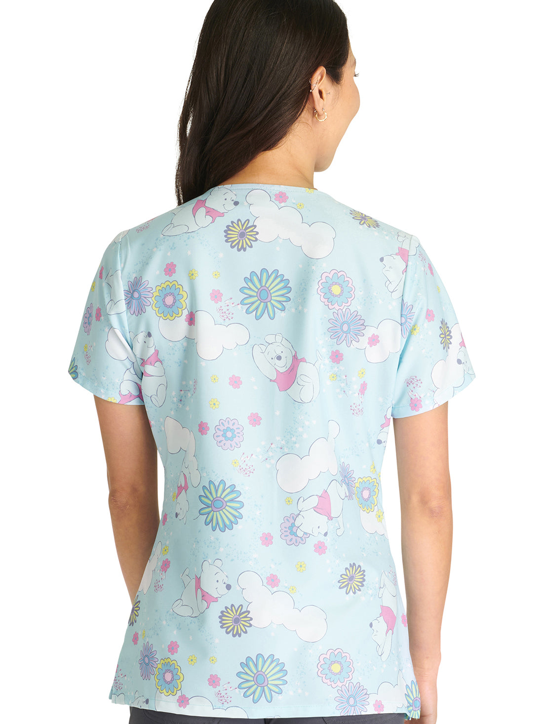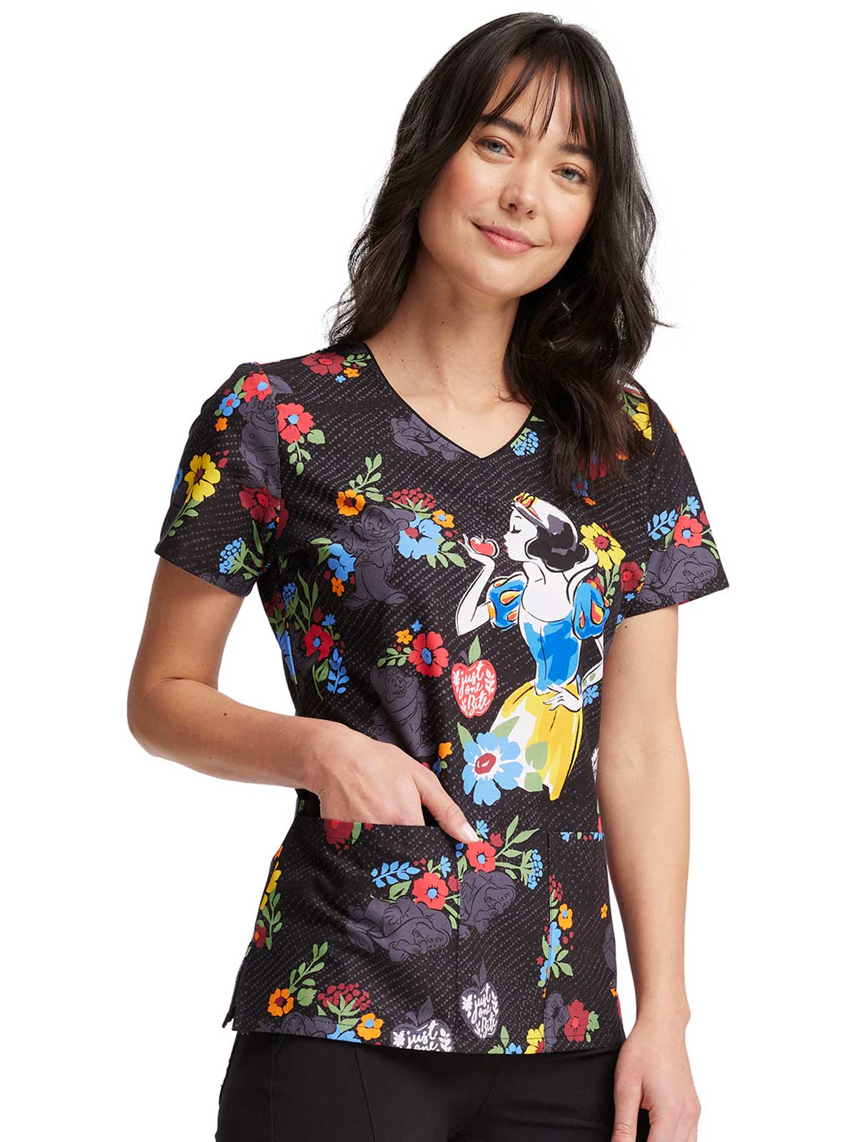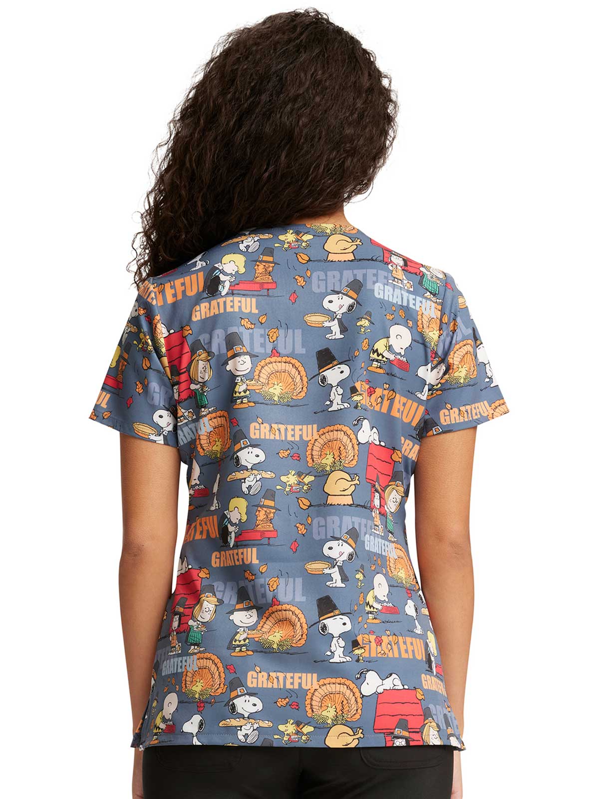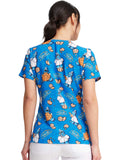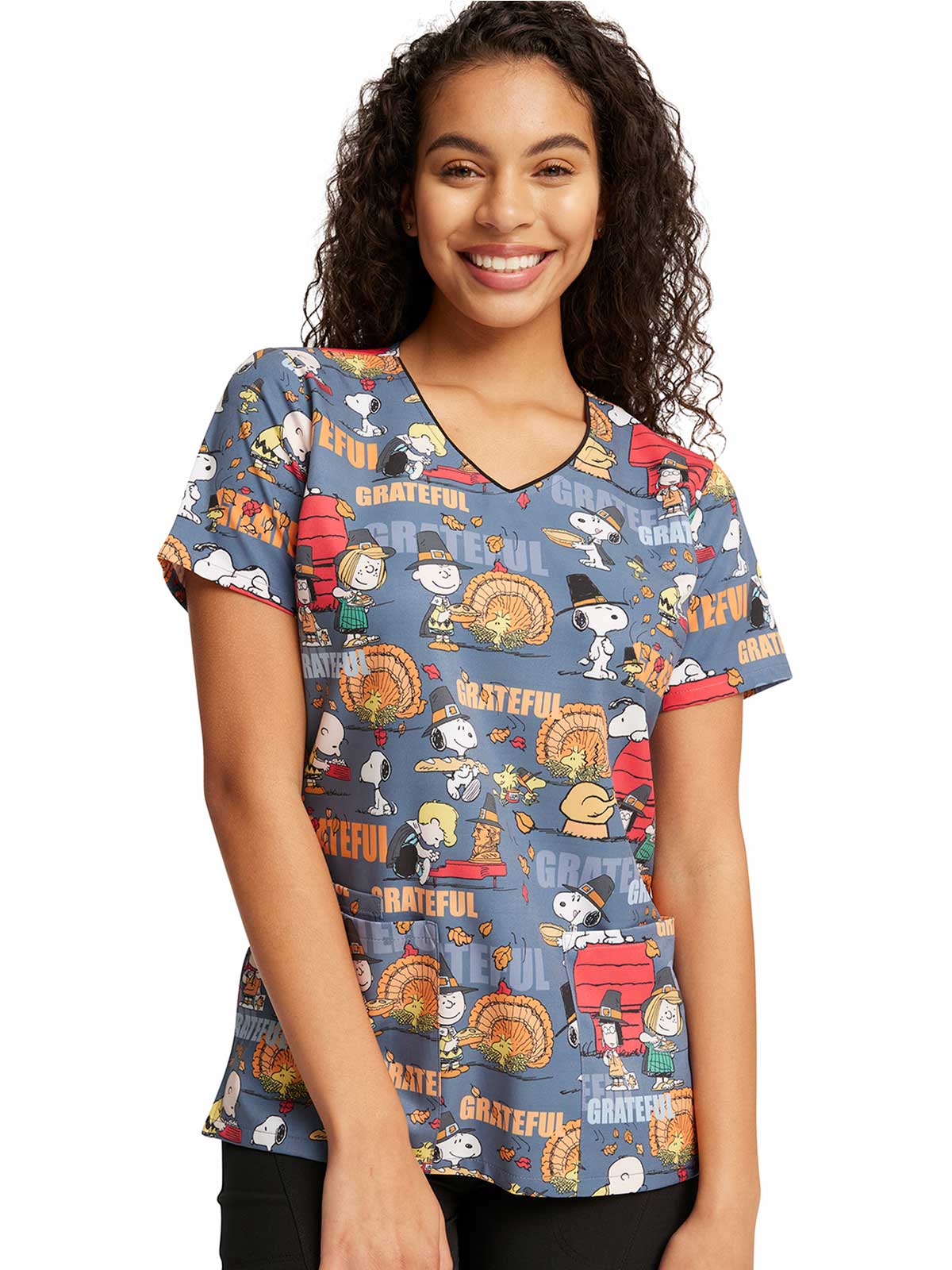 This V-neck printed top boasts front neck piping, bust darts, two front patch pockets, and an additional interior pocket on the wearer's right. Additionally, it includes side vents for enhanced comfort and mobility. Center back length: 26".