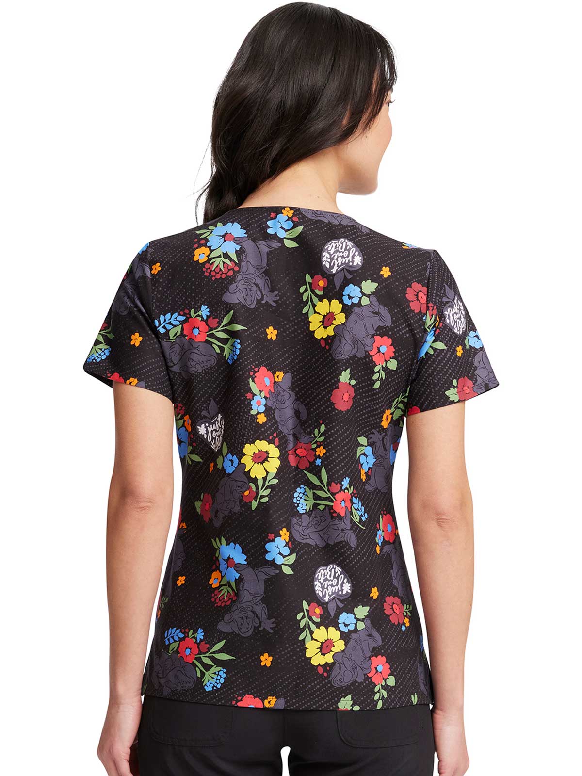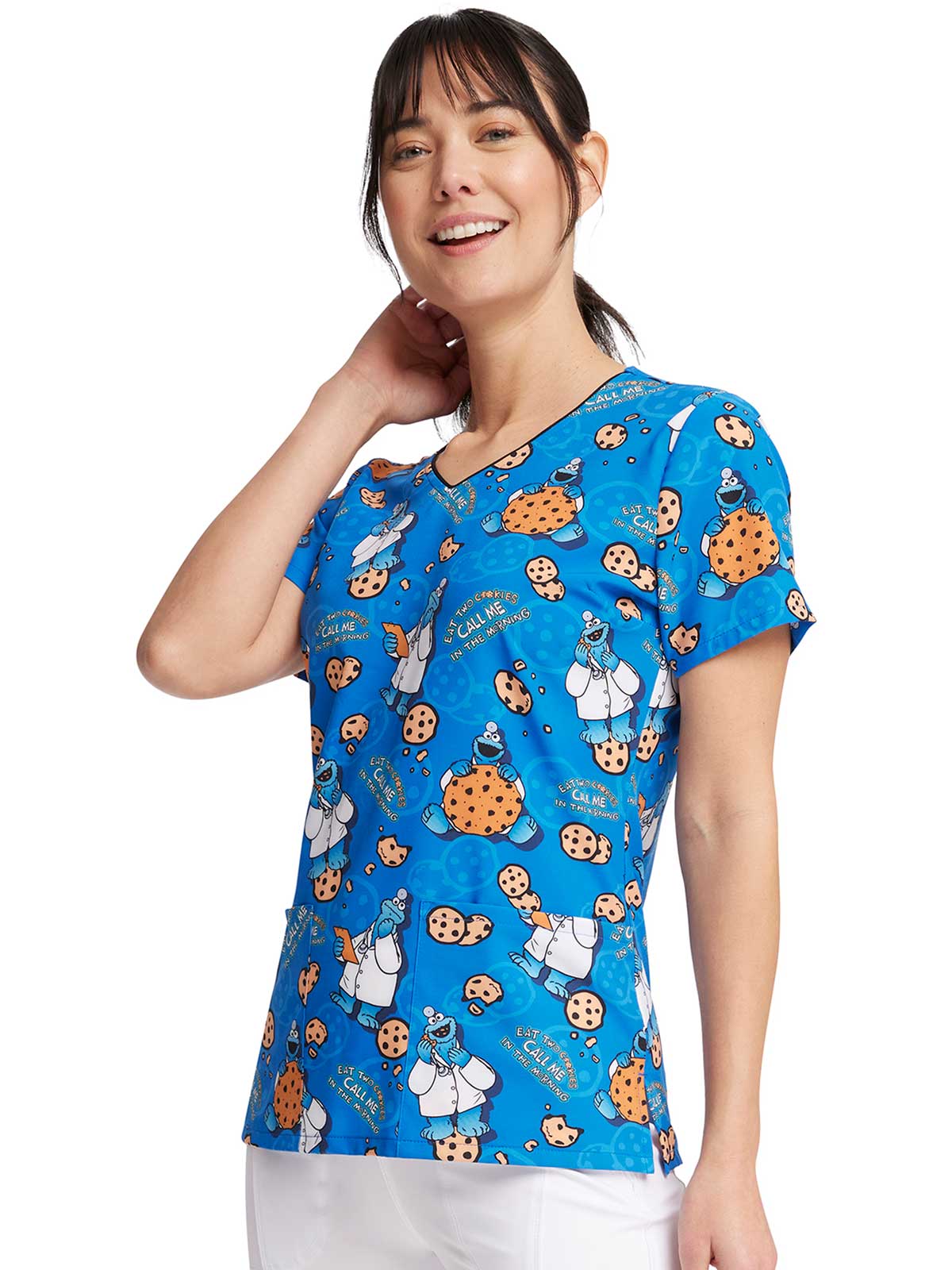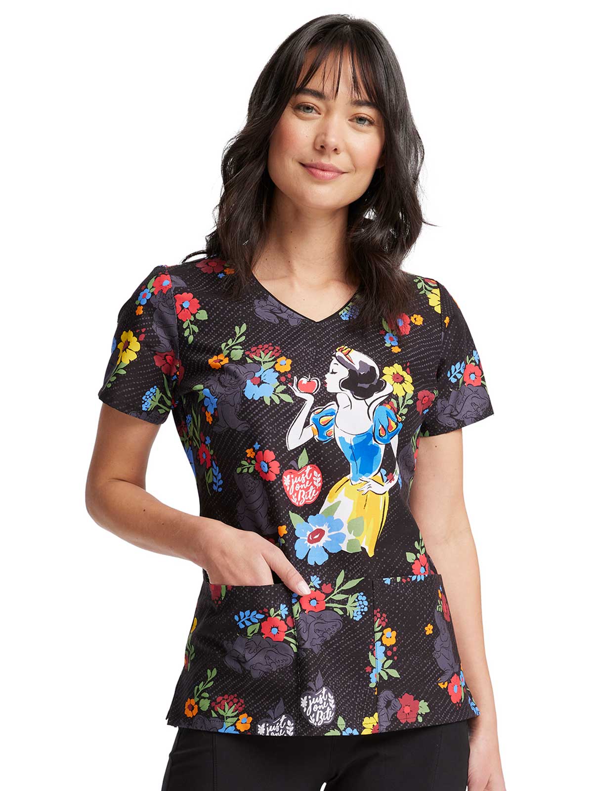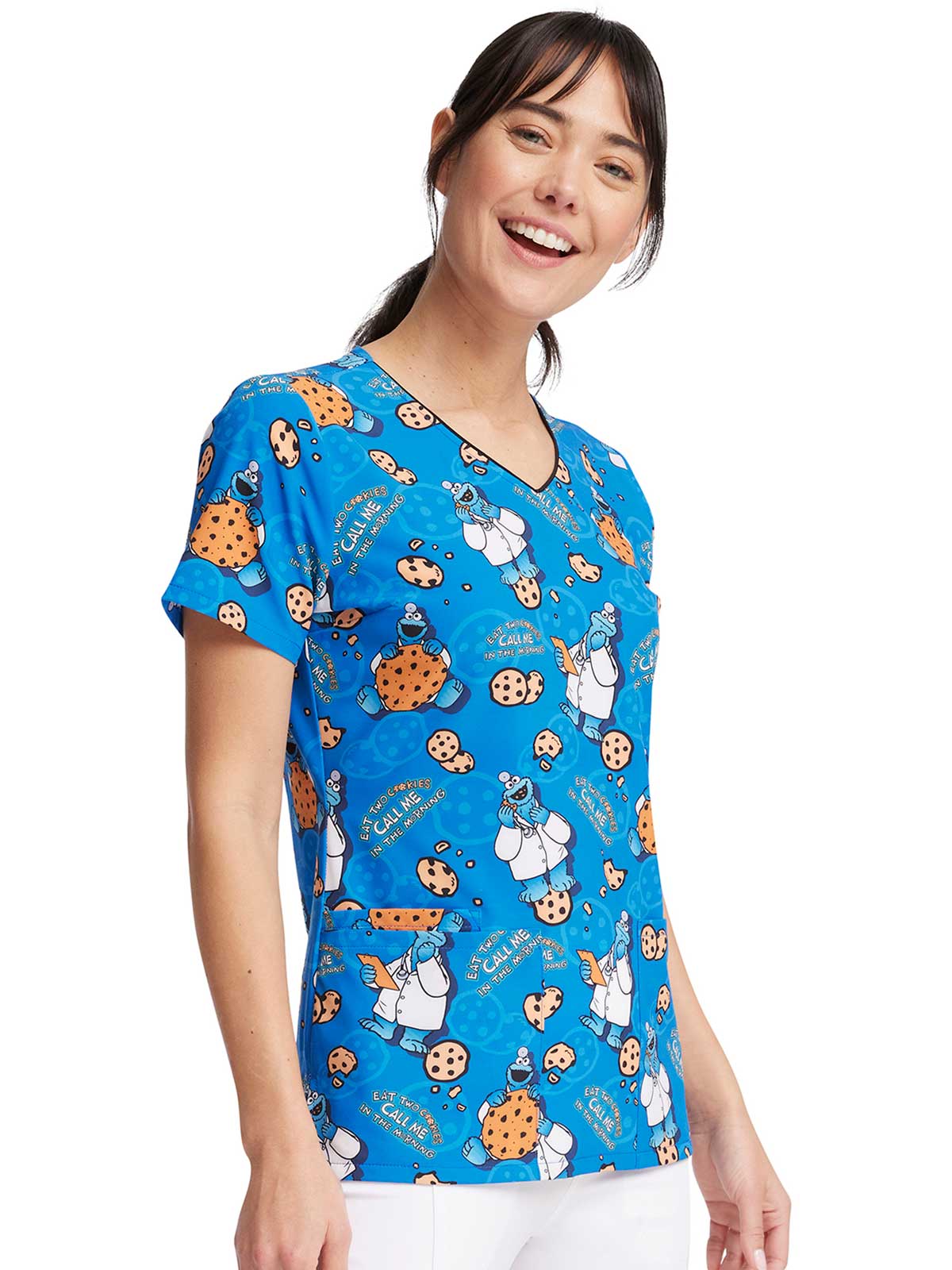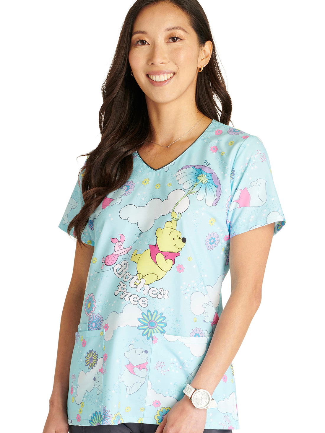 This V-neck printed top boasts front neck piping, bust darts, two front patch pockets, and an additional interior pocket on the wearer's right. Additionally, it includes side vents for enhanced comfort and mobility. Center back length: 26".