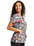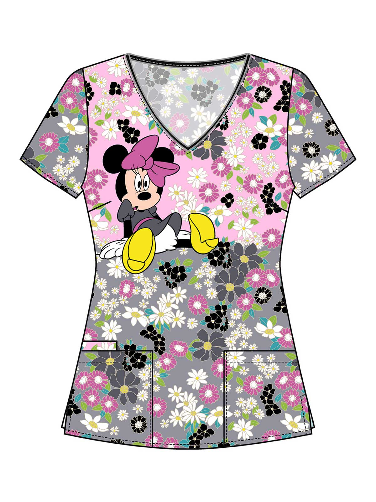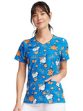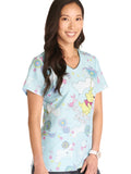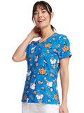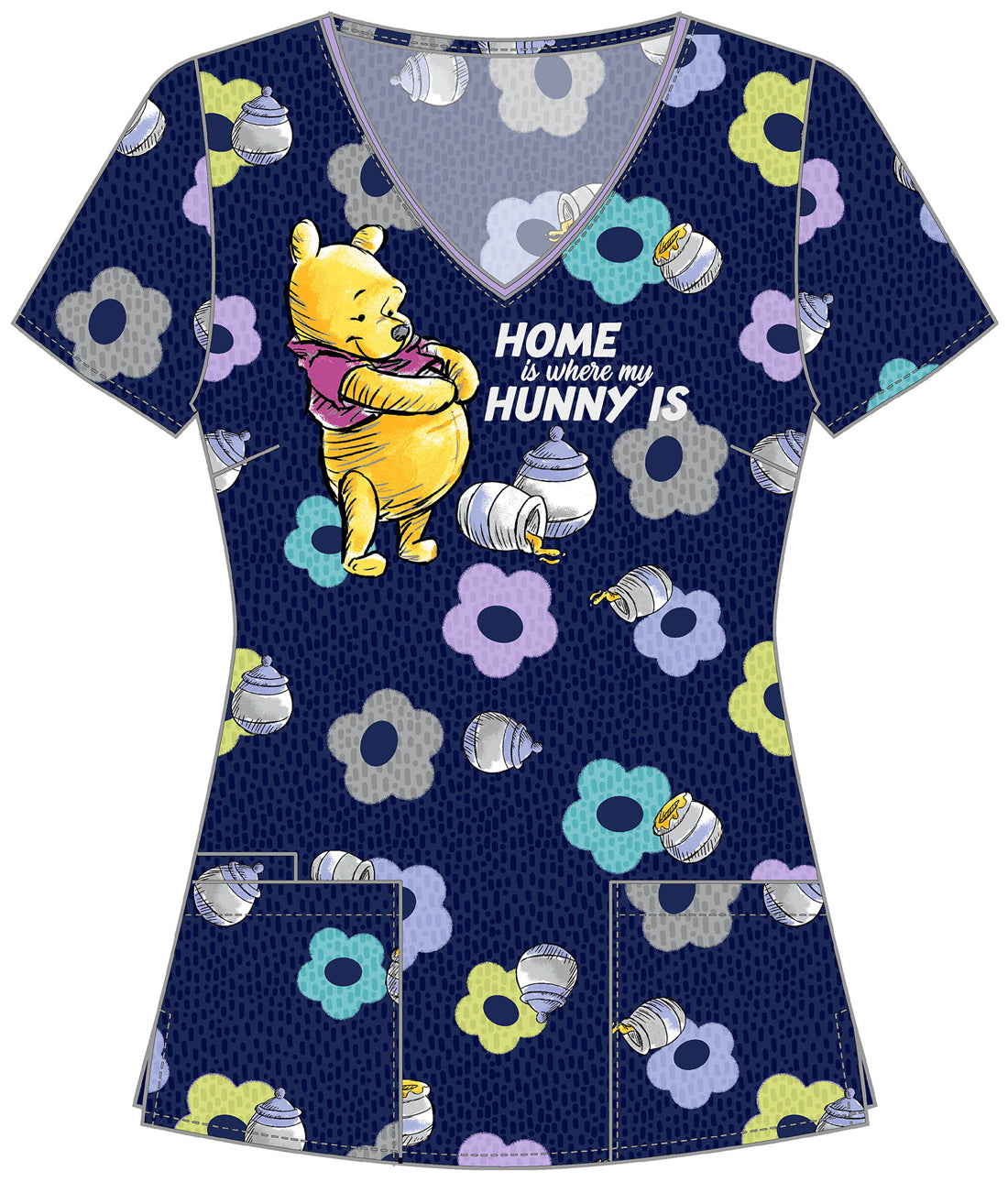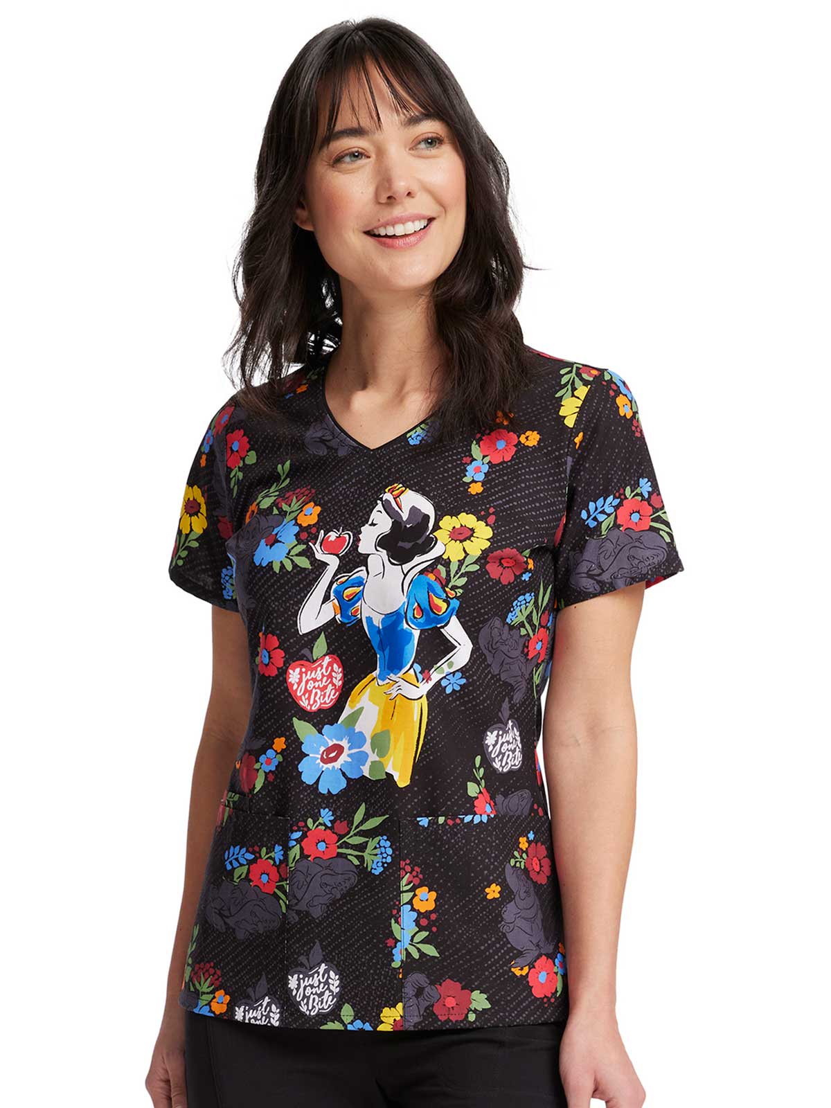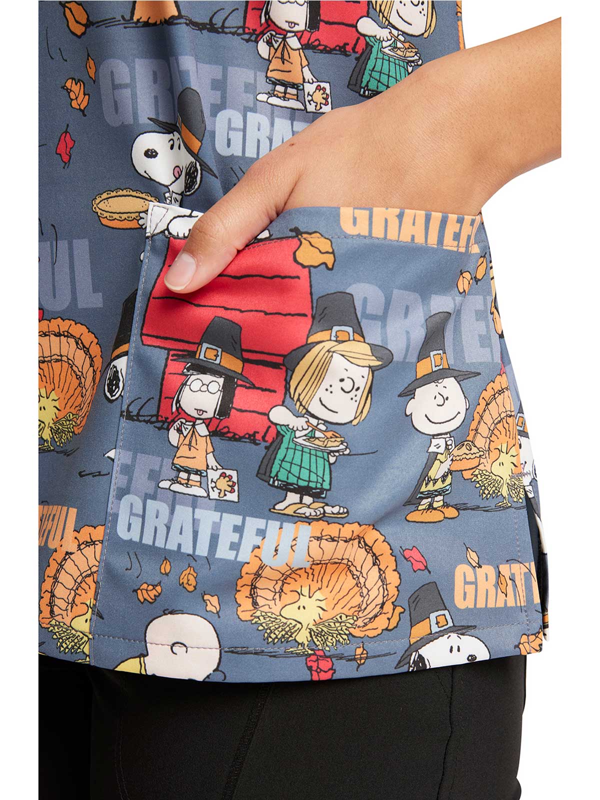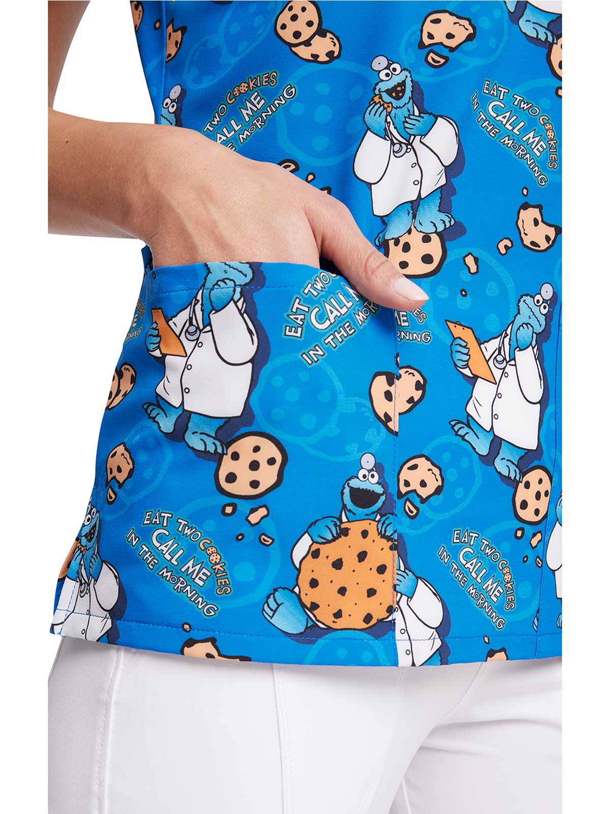 This V-neck printed top boasts front neck piping, bust darts, two front patch pockets, and an additional interior pocket on the wearer's right. Additionally, it includes side vents for enhanced comfort and mobility. Center back length: 26".