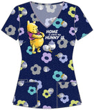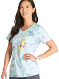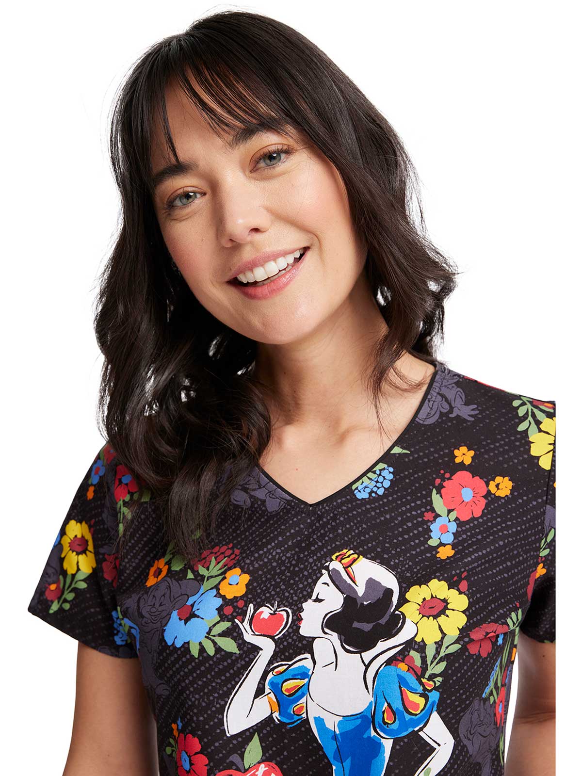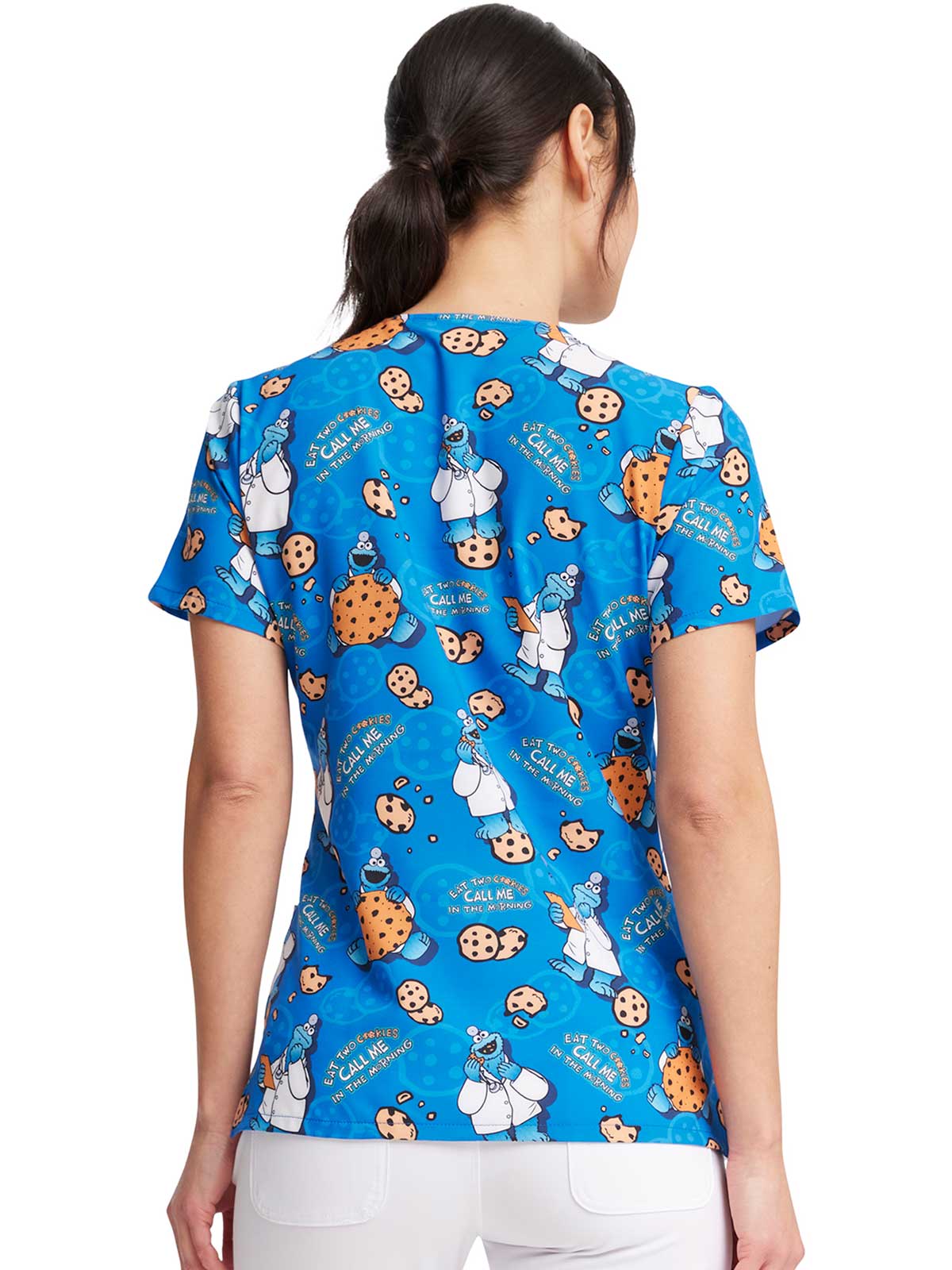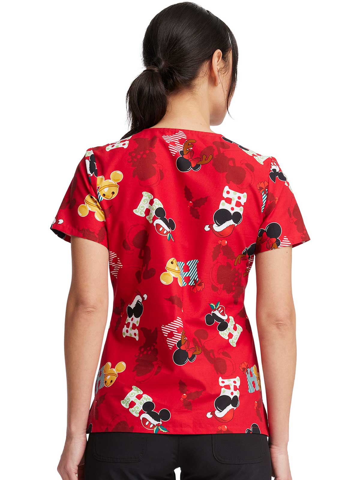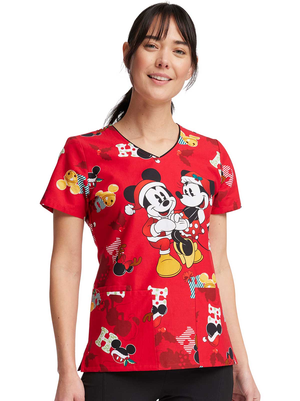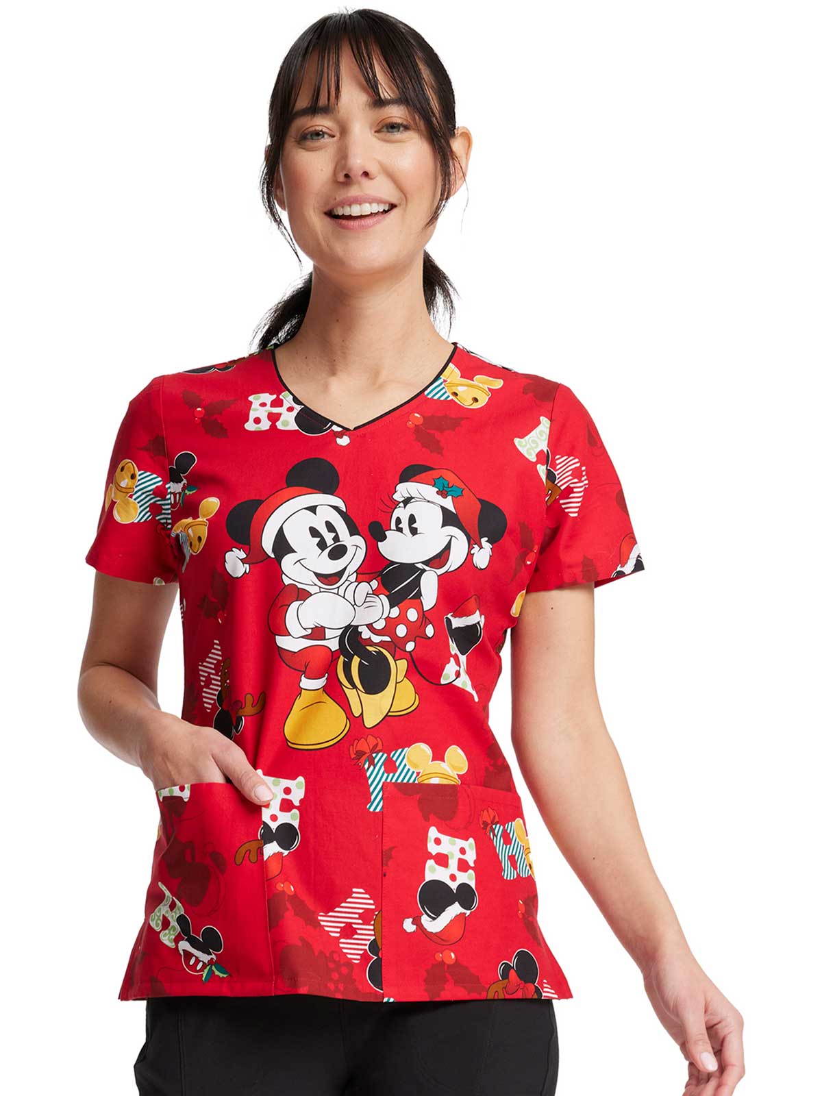 This V-neck printed top boasts front neck piping, bust darts, two front patch pockets, and an additional interior pocket on the wearer's right. Additionally, it includes side vents for enhanced comfort and mobility. Center back length: 26".