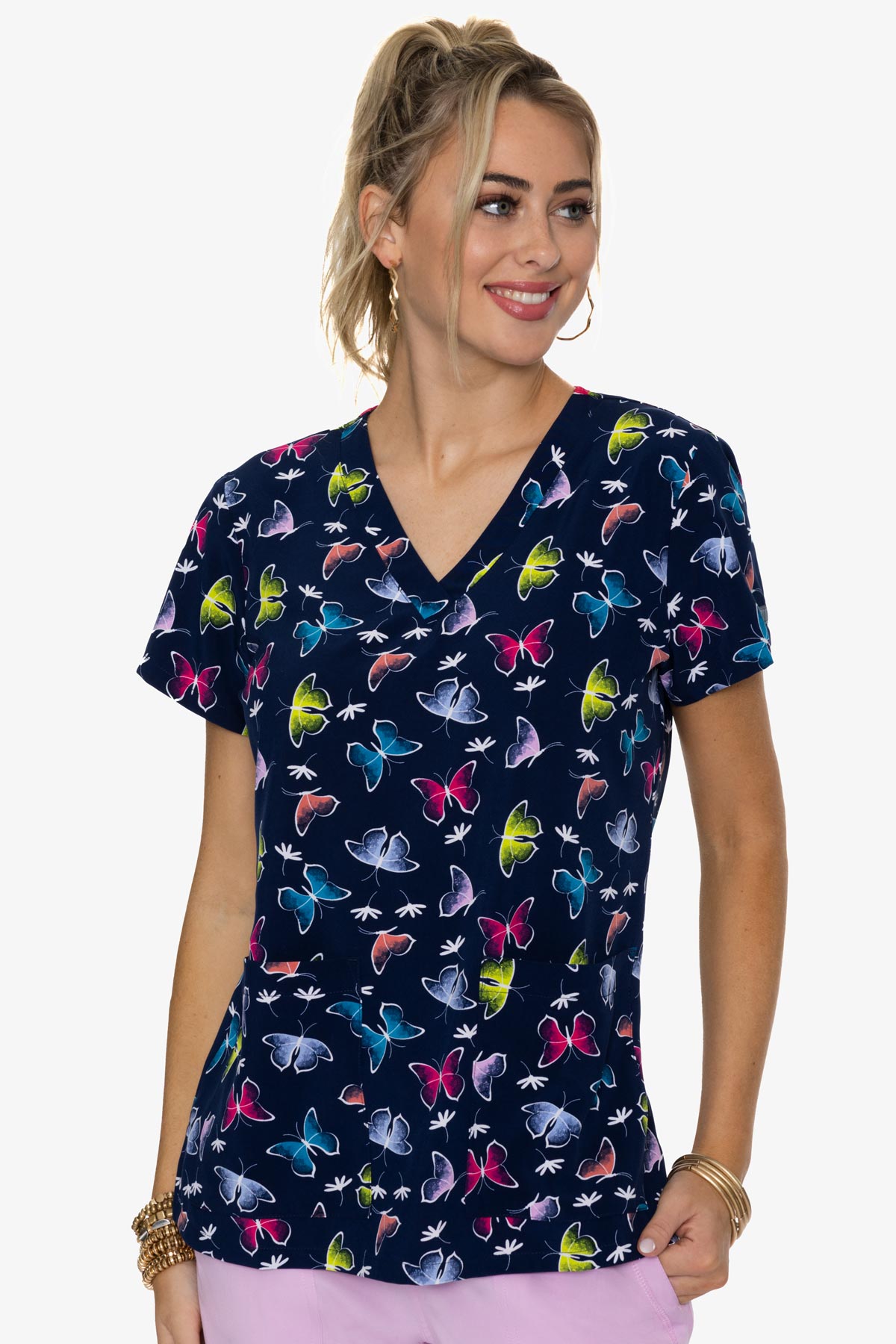 V-neck all-over print top with 2 large patch pockets and a contrast back neck band.| V-neckline| 2 spacious patch pockets| Contrast back neck band| All-over print top| Length: 26 in.